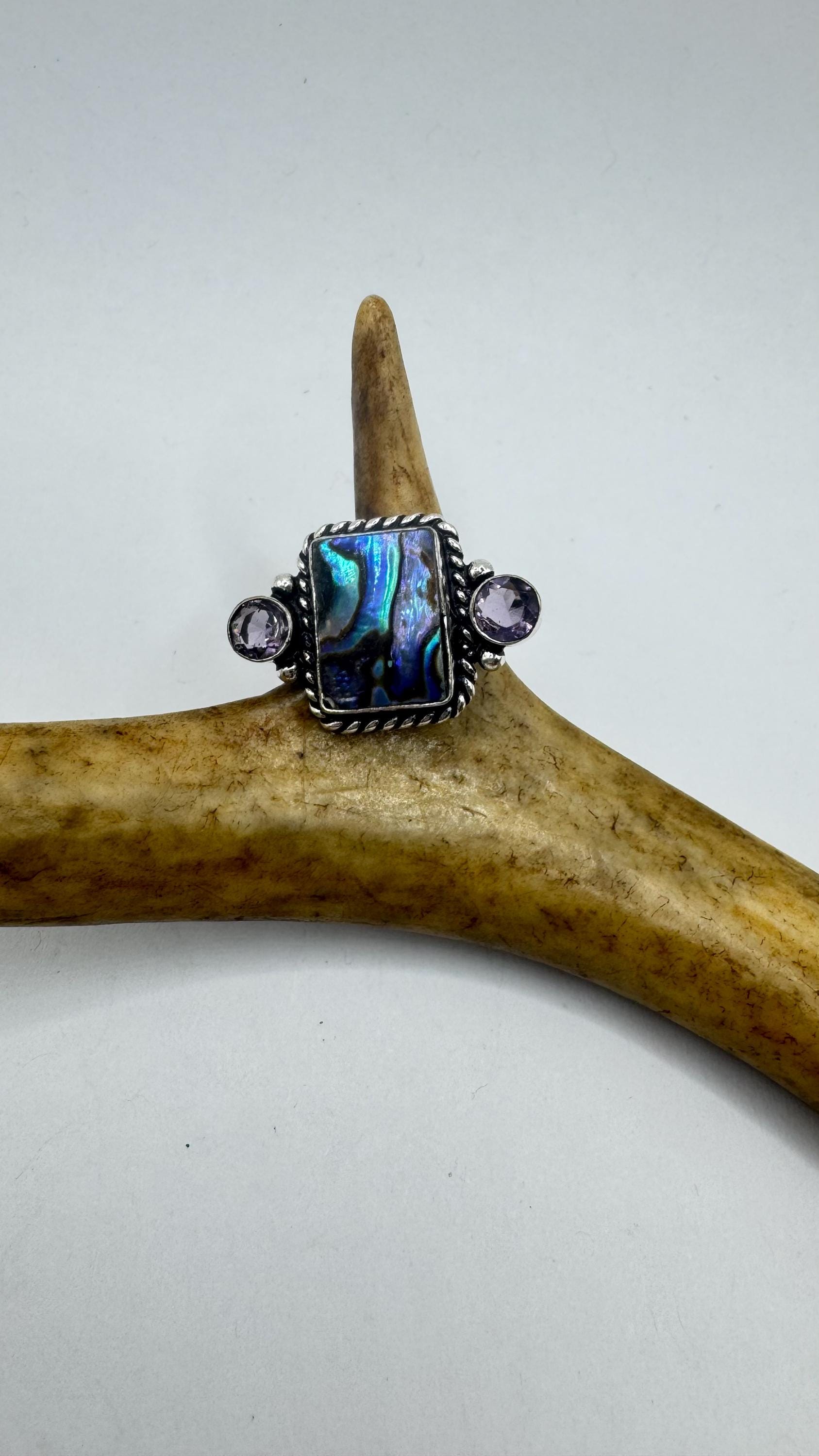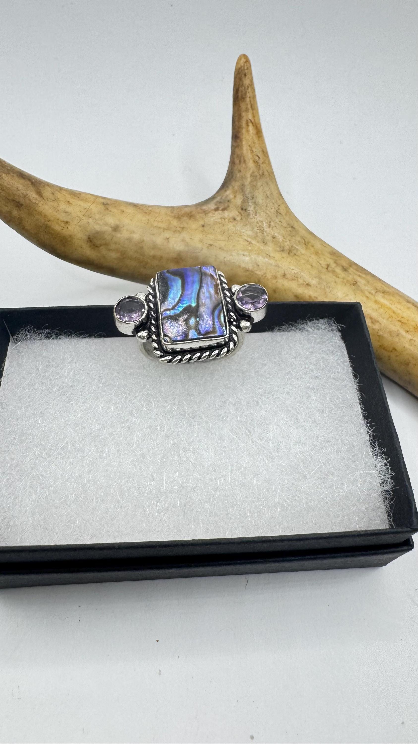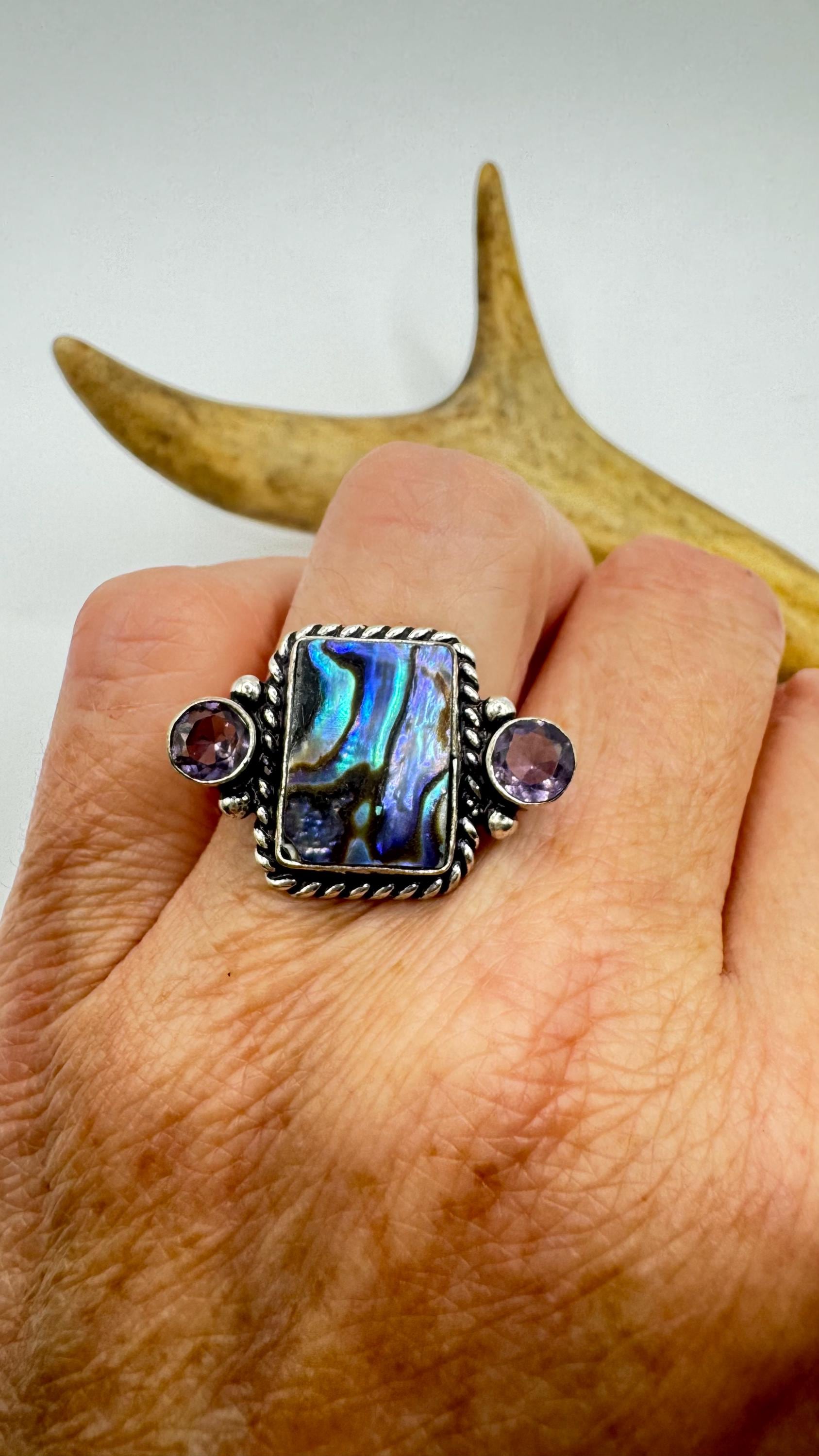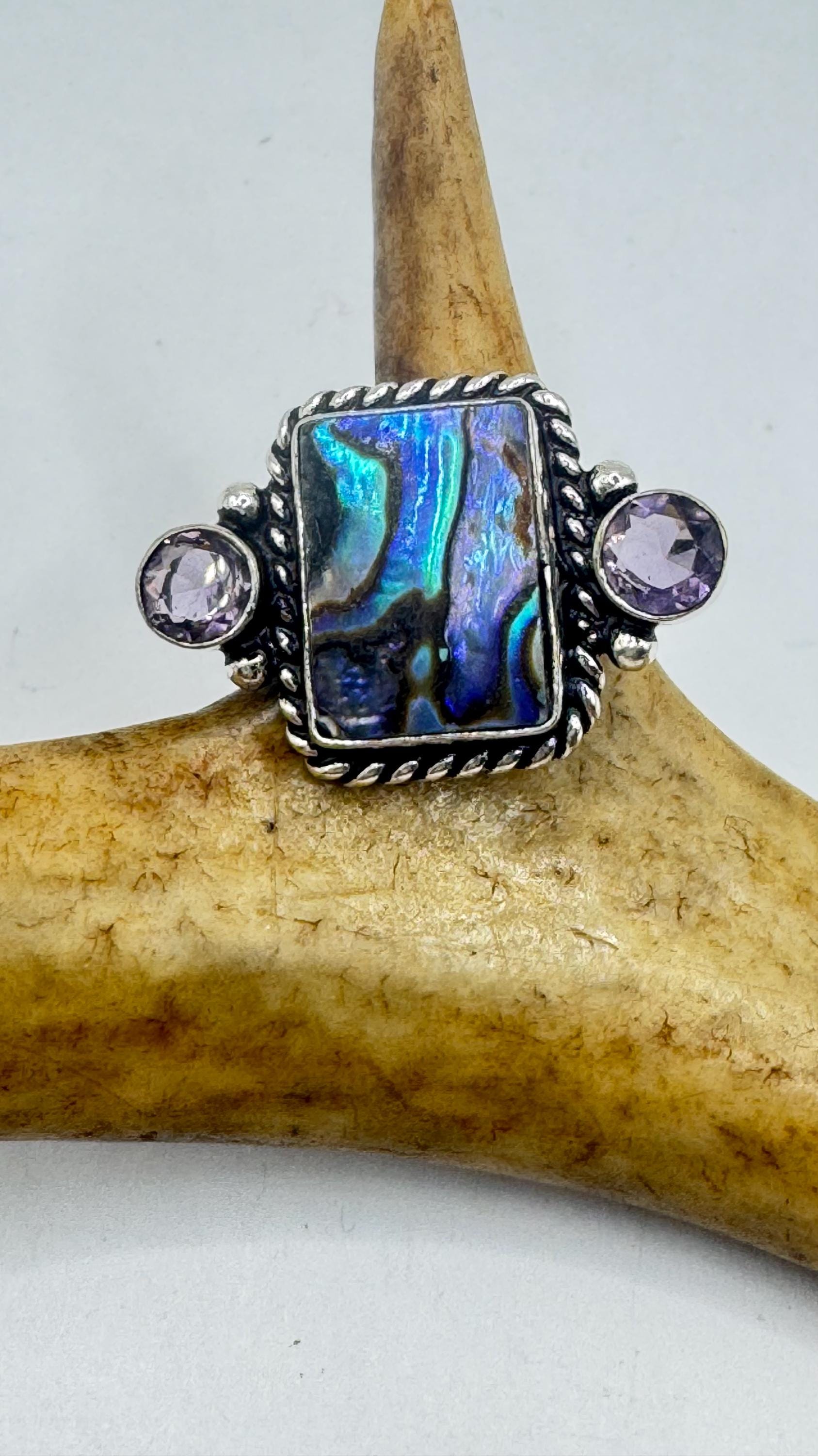 Vintage Rainbow, abalone, shell andpurple amethyst statement ring white bronze setting NOT 925 Sterling Silver This is one of my... Read more