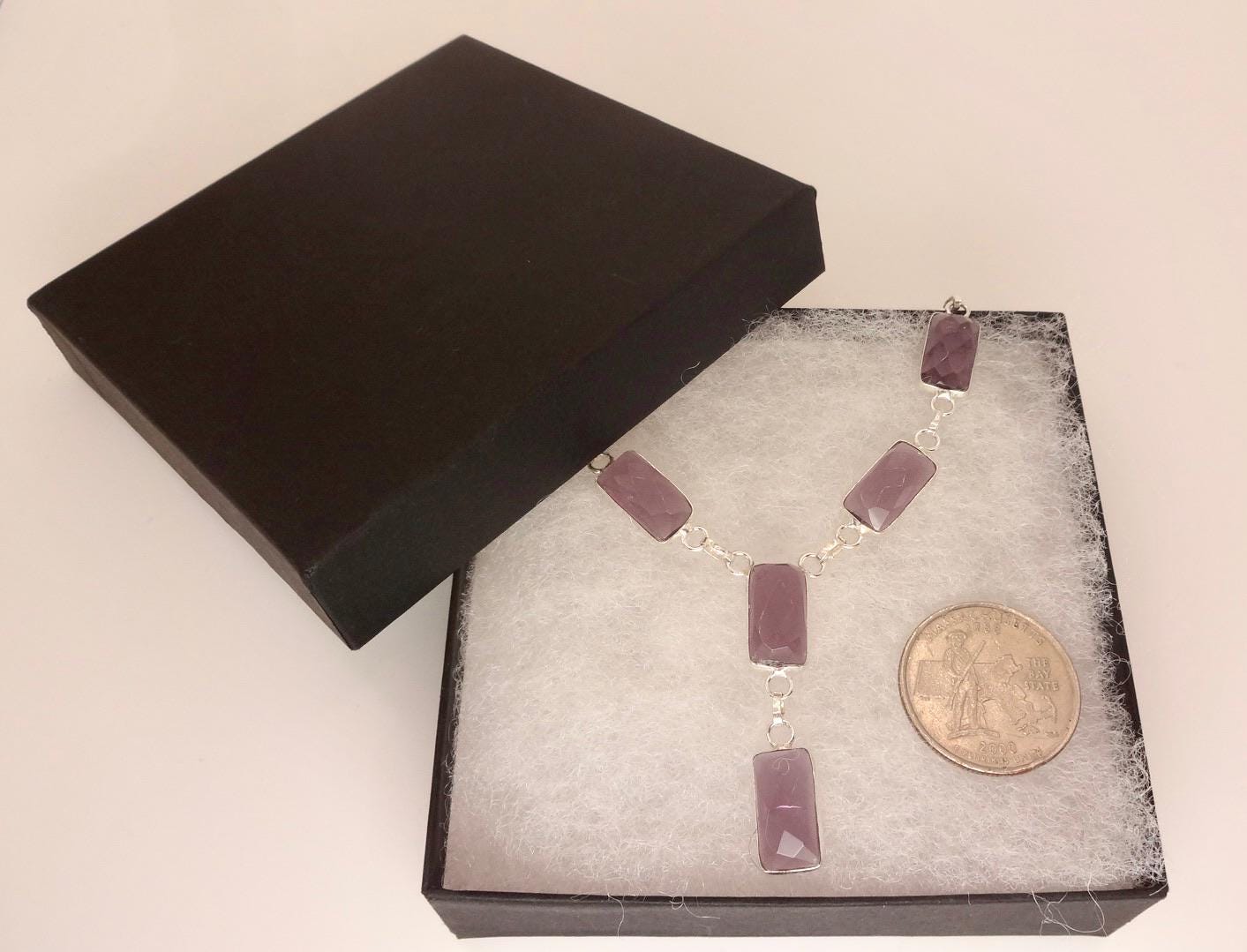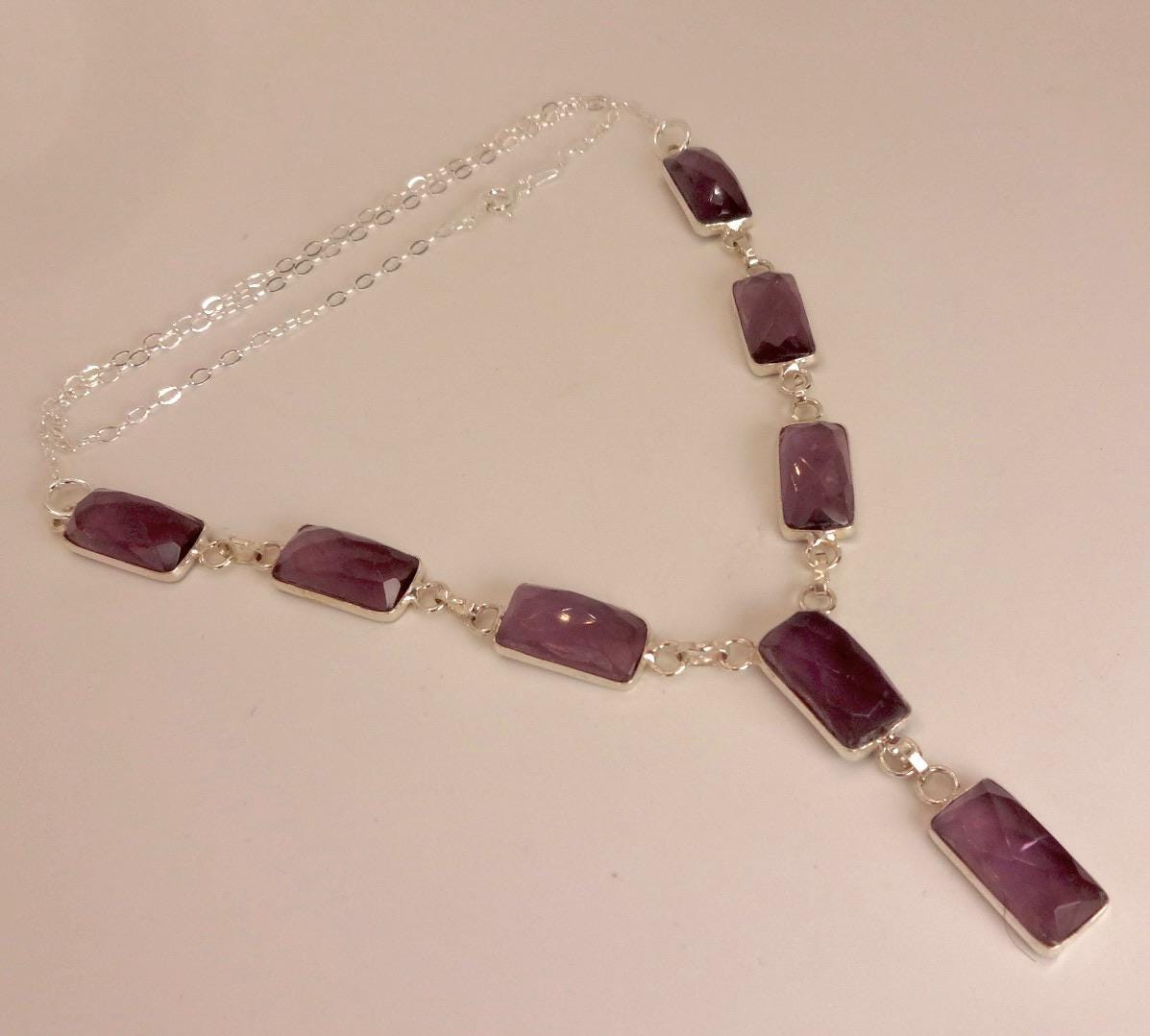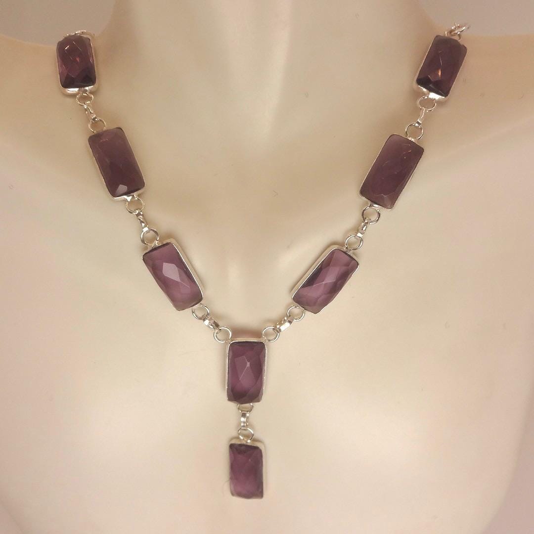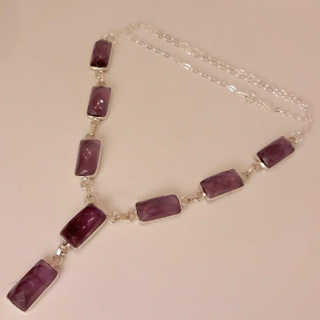 Vintage purple amethyst gem Y shape hangs from a chunky open chain