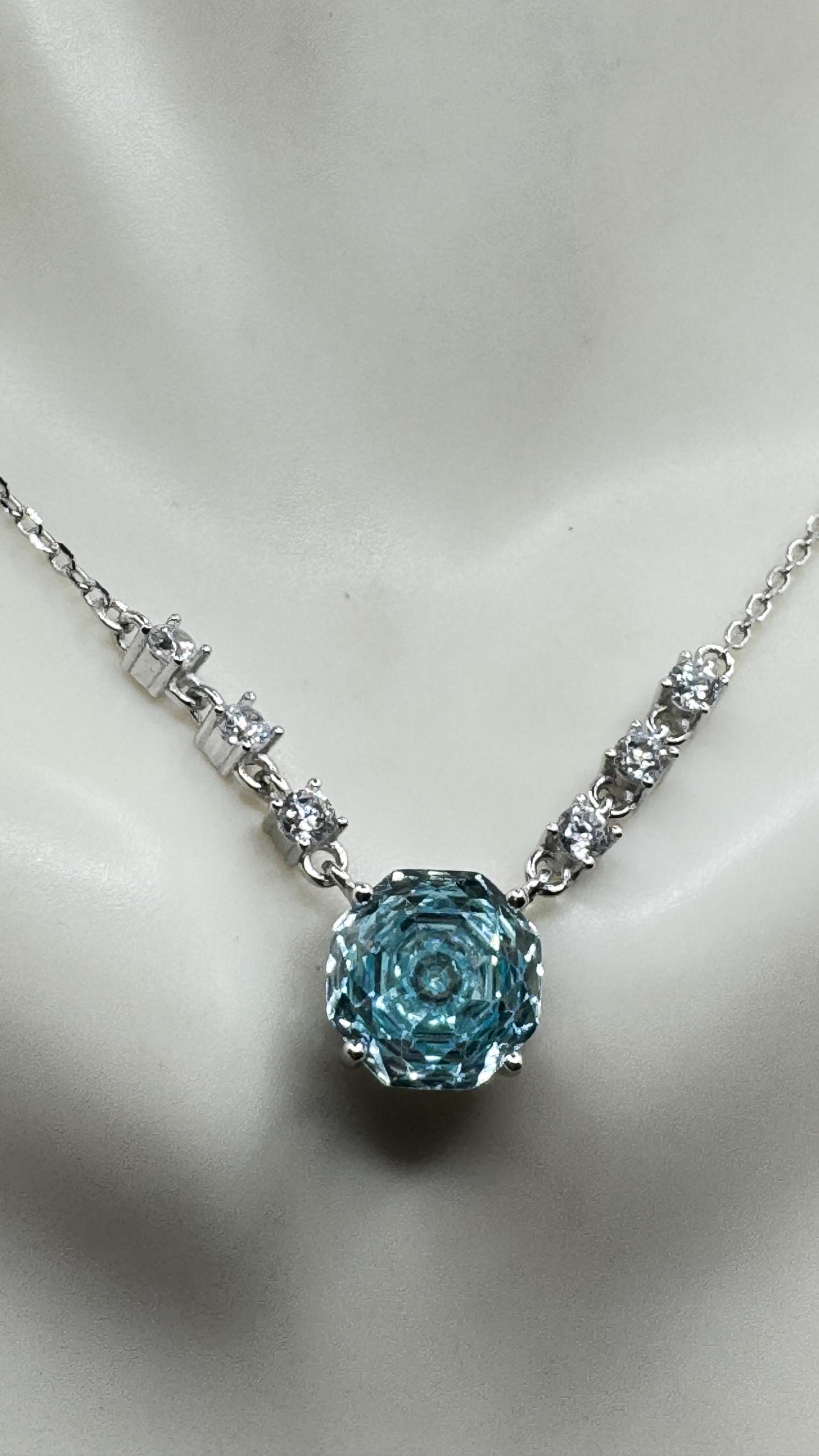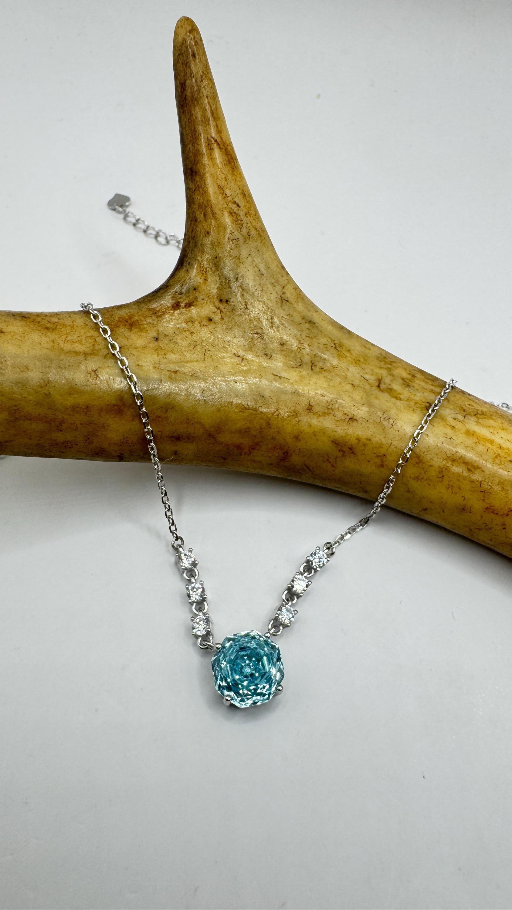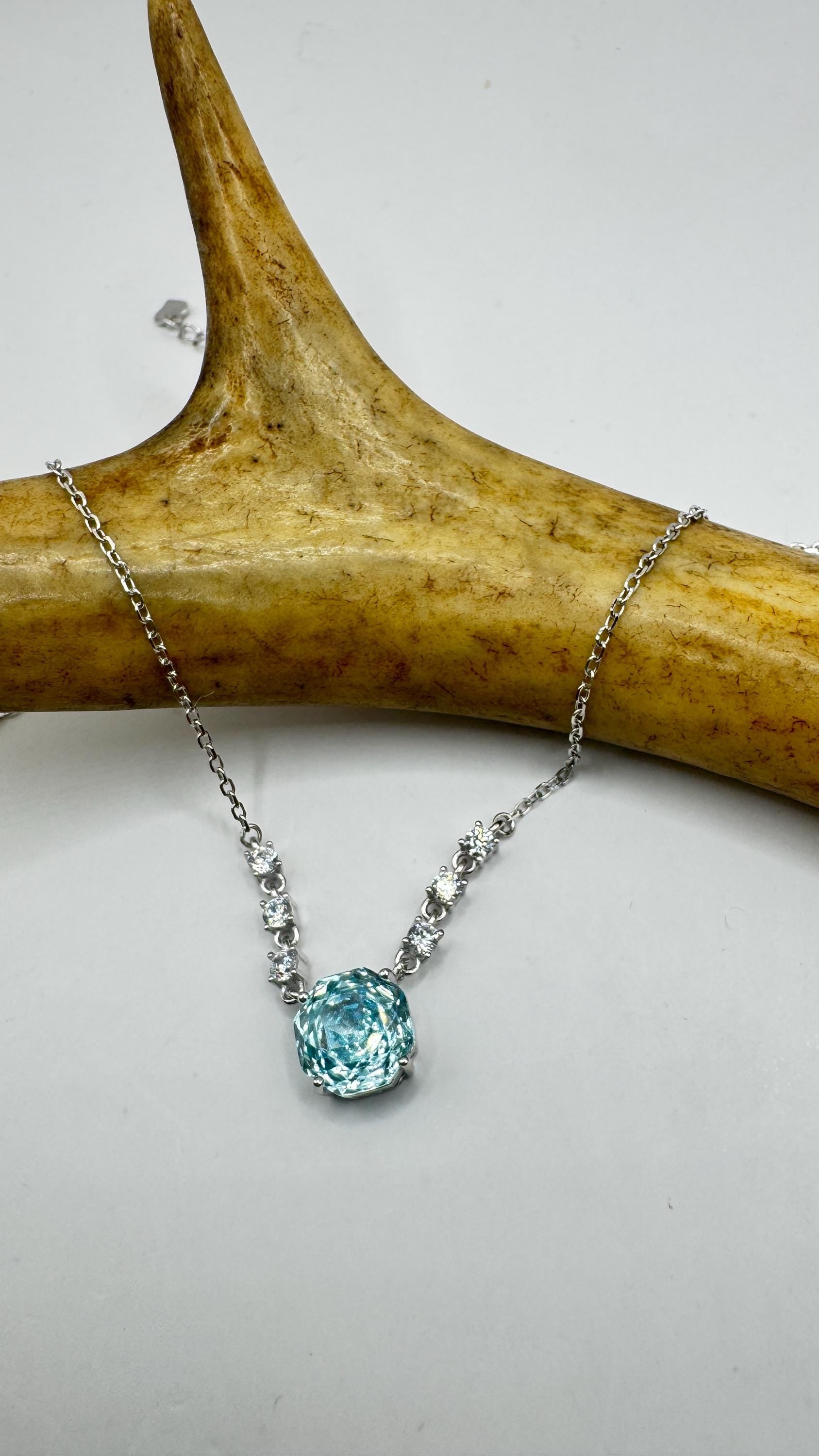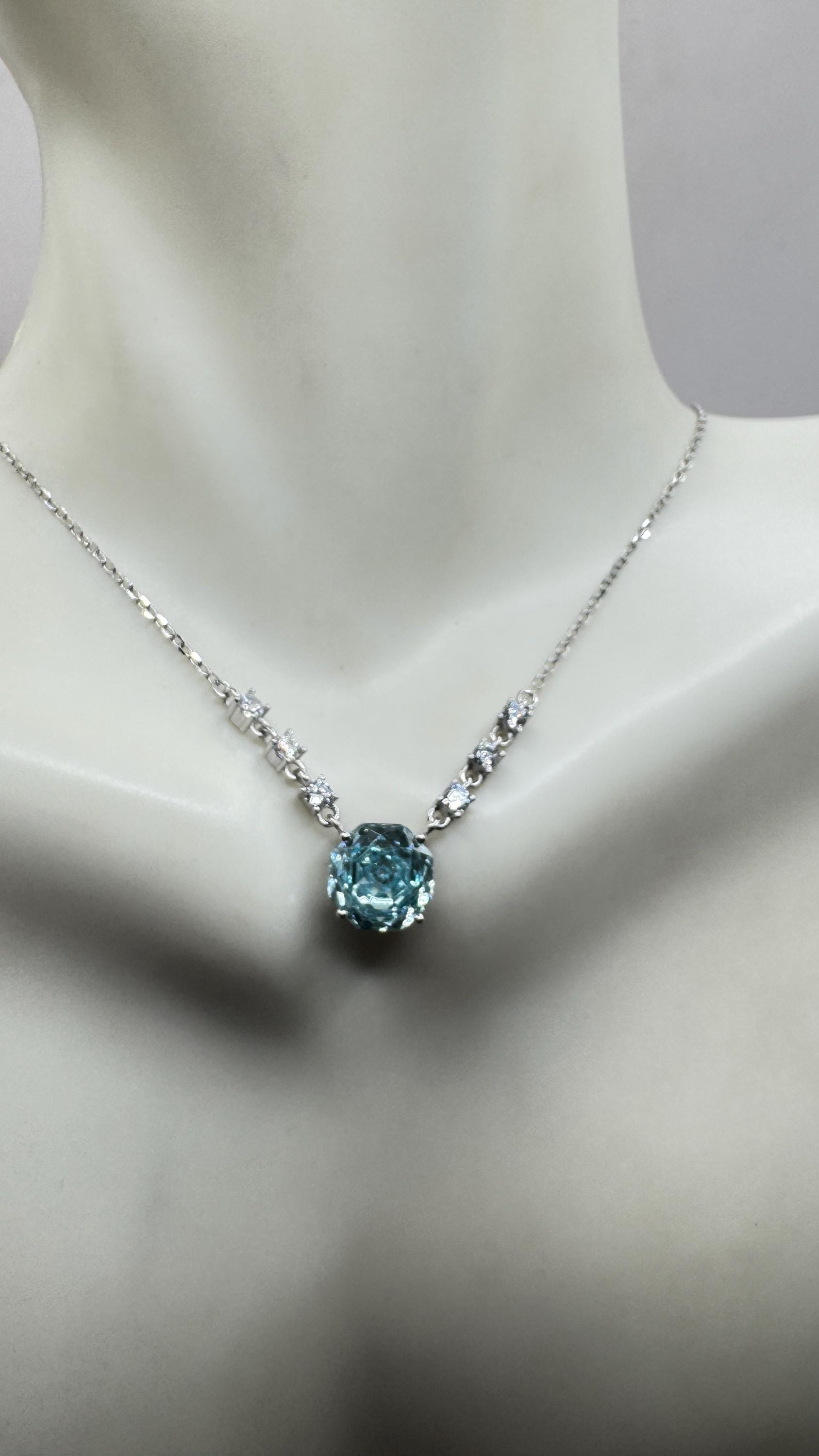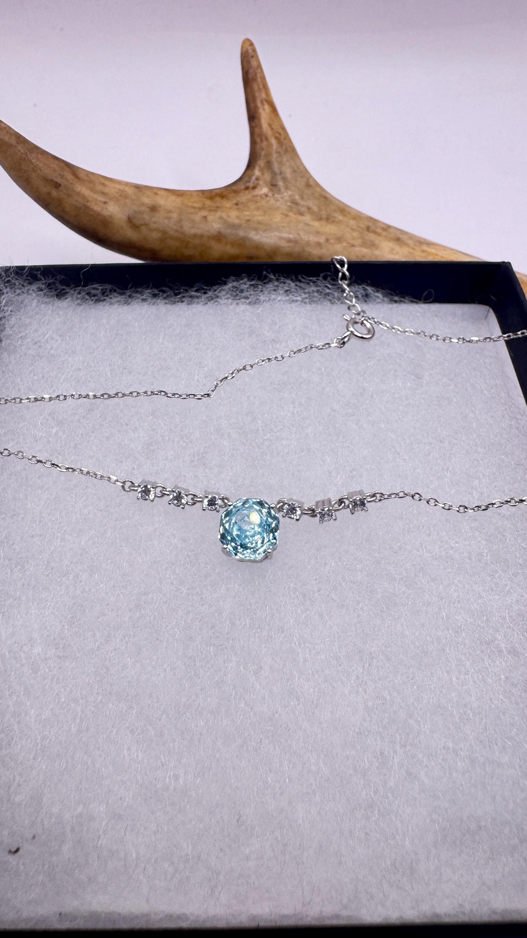 Vintage 925 Sterling Silver Necklace featuring blue topaz Cubic Zirconia framed with clear crystal CZ. Very unusual flower, cut stone... Read more
