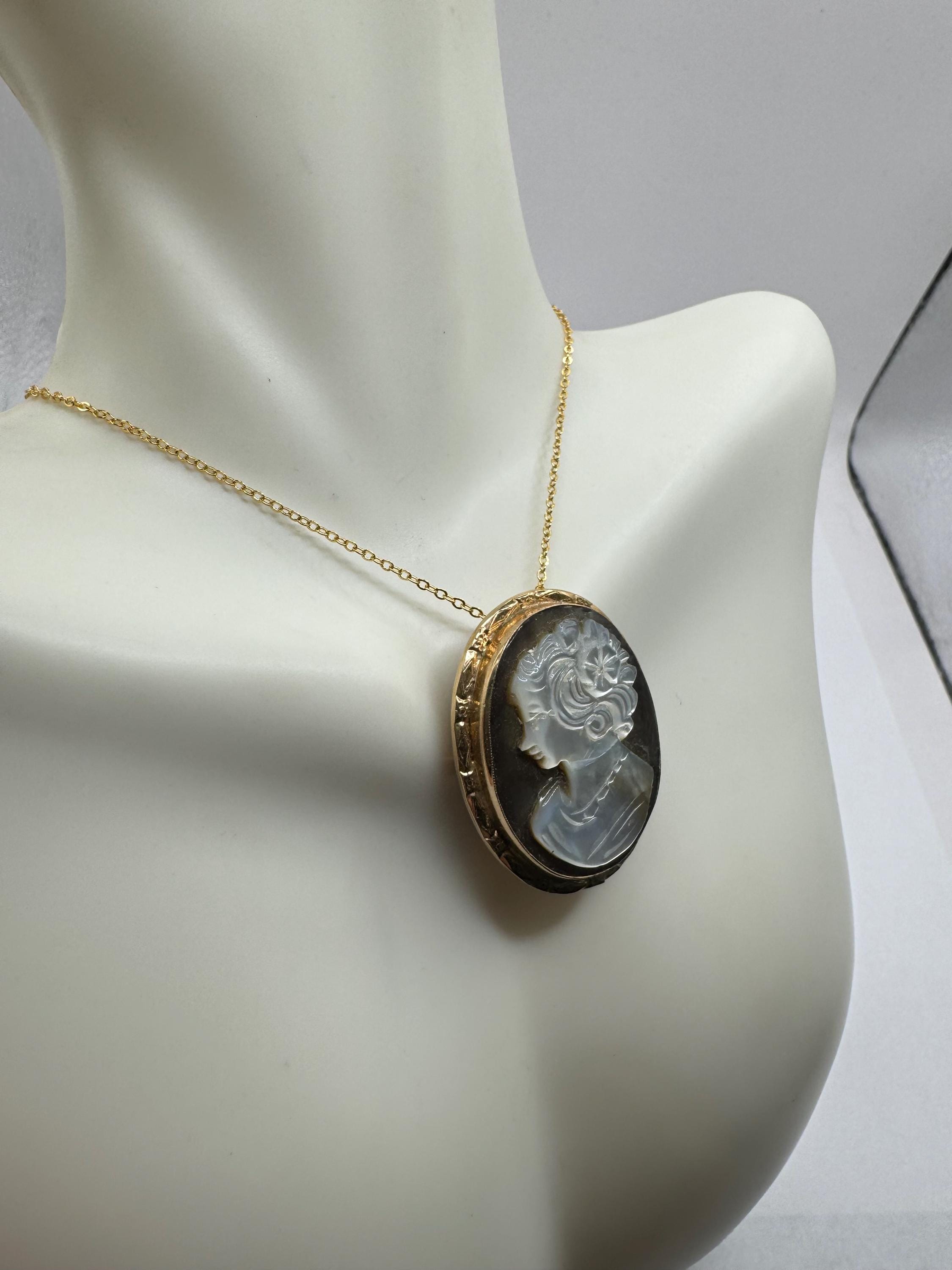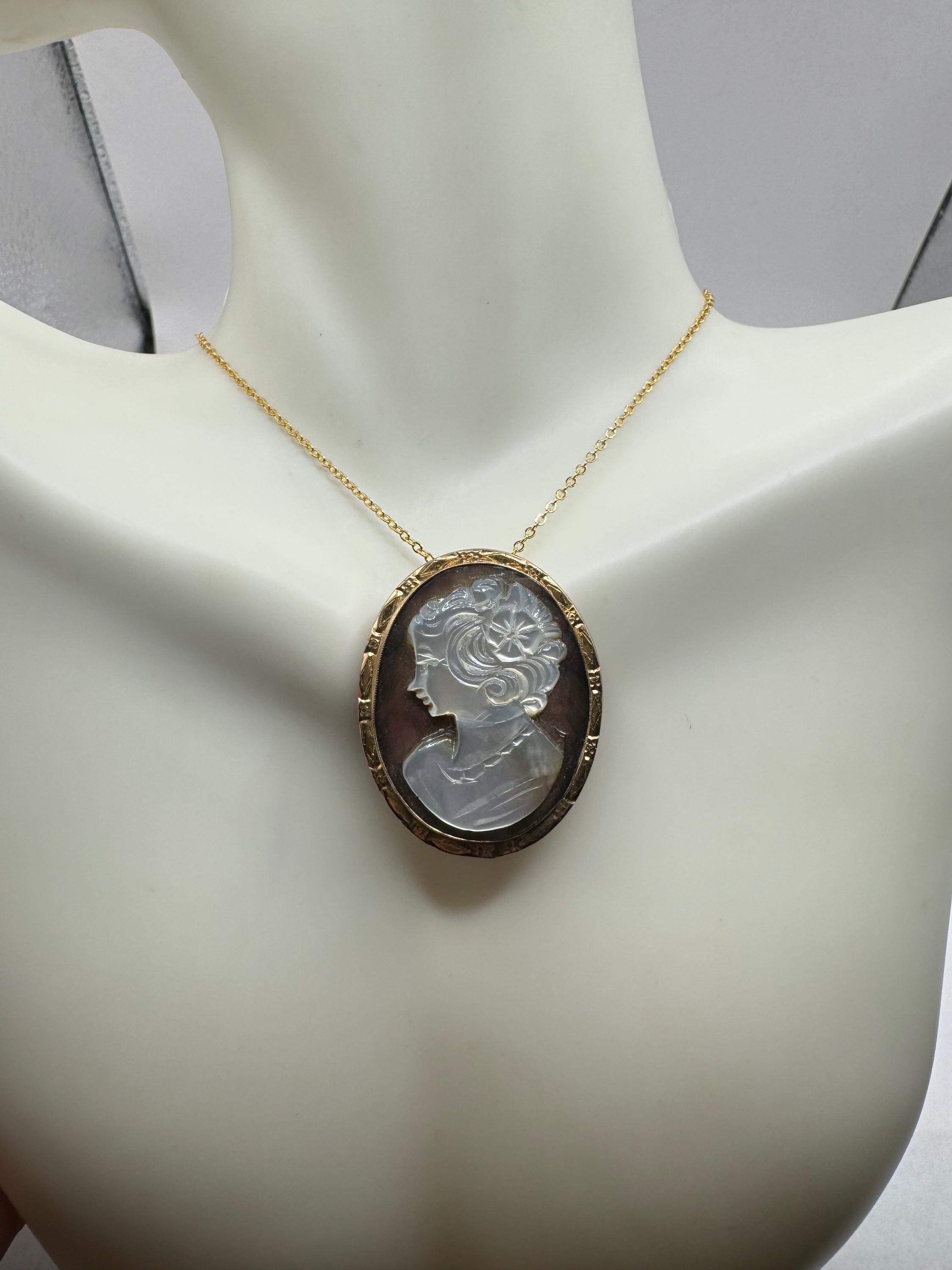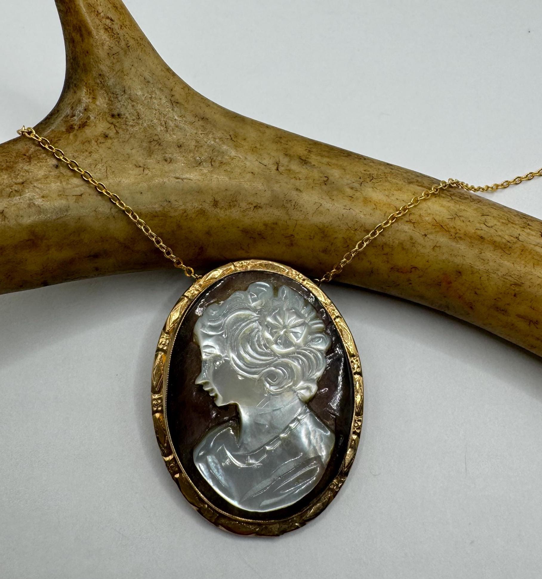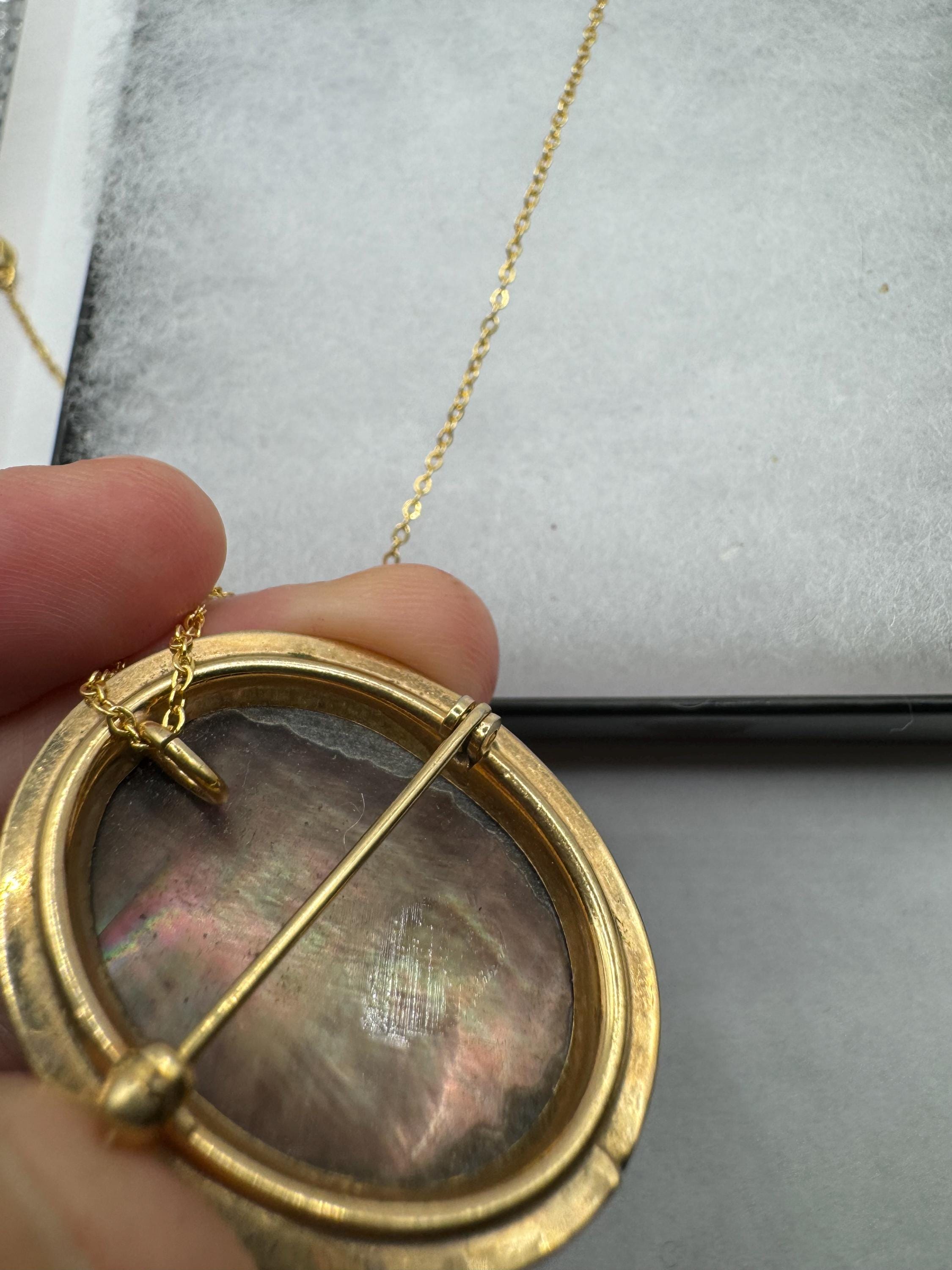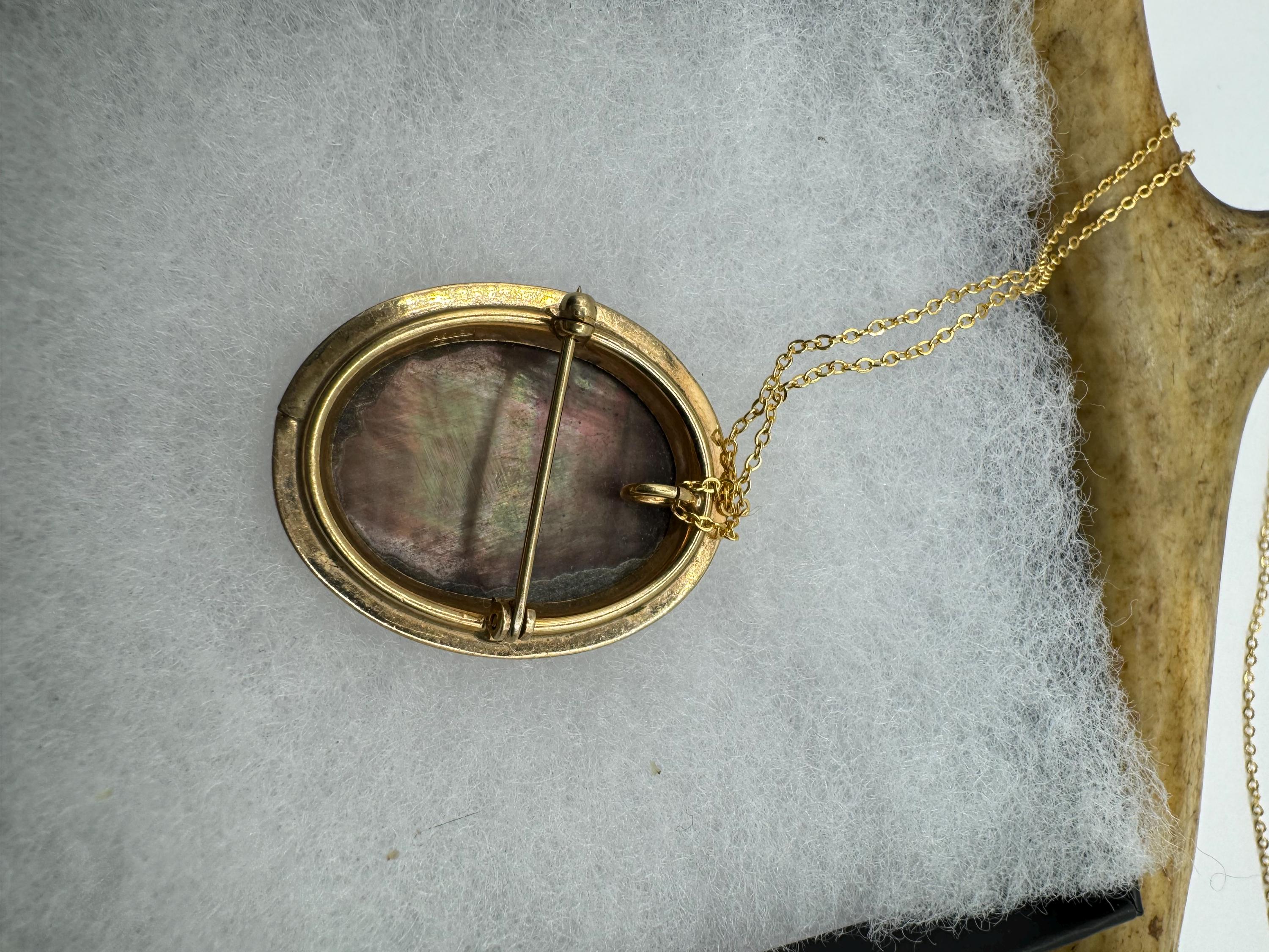 Vintage Cameo Gold Pendant Necklace Tiny 12k GF Chain Abalone Carved Pin Brooch