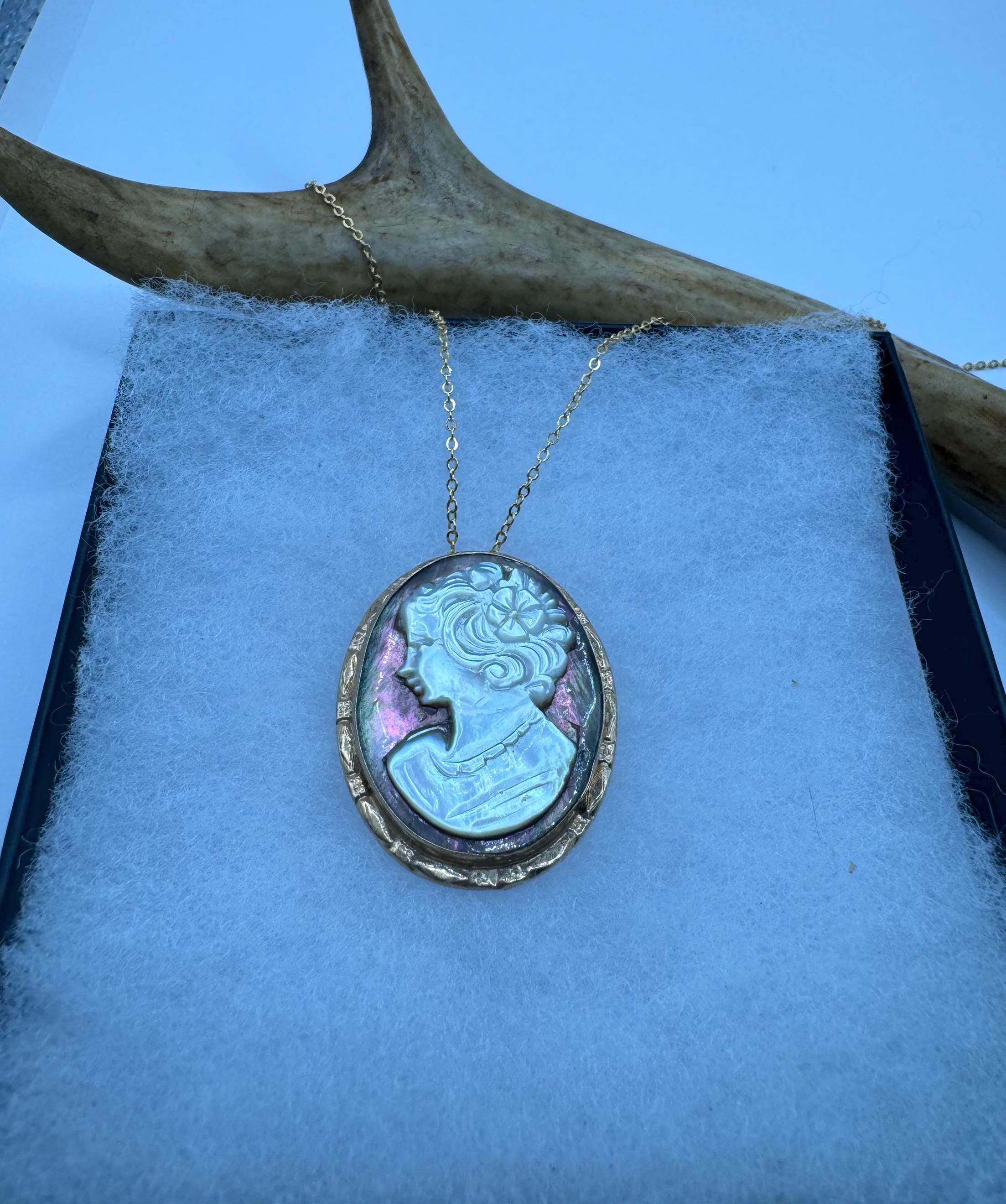 Our Vintage Gold Pendant / pin brooch. Necklace features a 12 k gold filled hand carved cameo abalone shell charm.... Read more