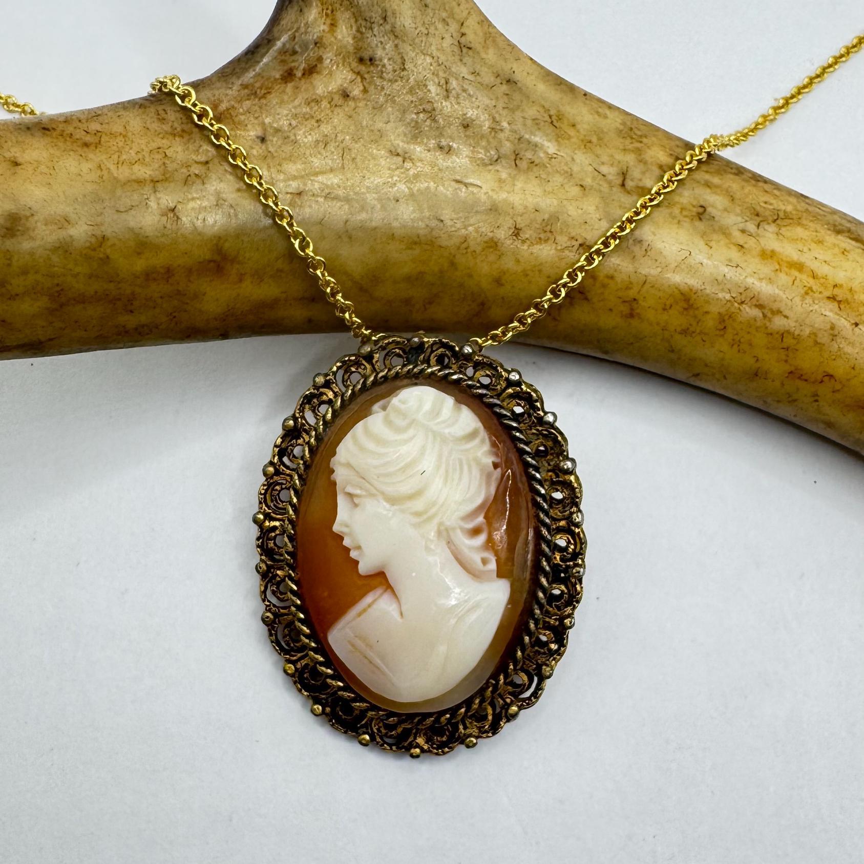 Our Vintage Gold Pendant / pin brooch. Necklace features a 12 k gold filled hand carved cameo shell charm. Measures... Read more