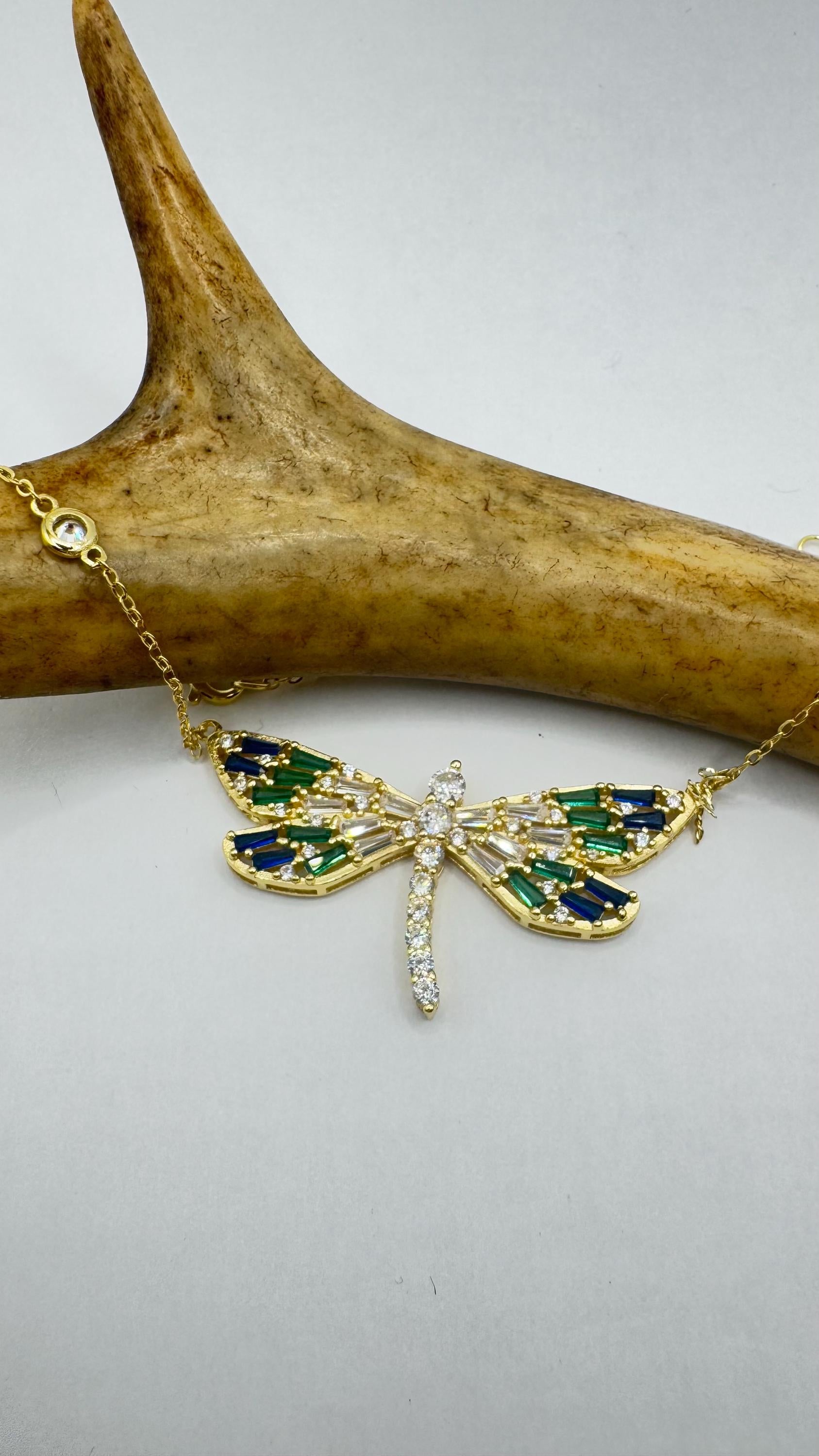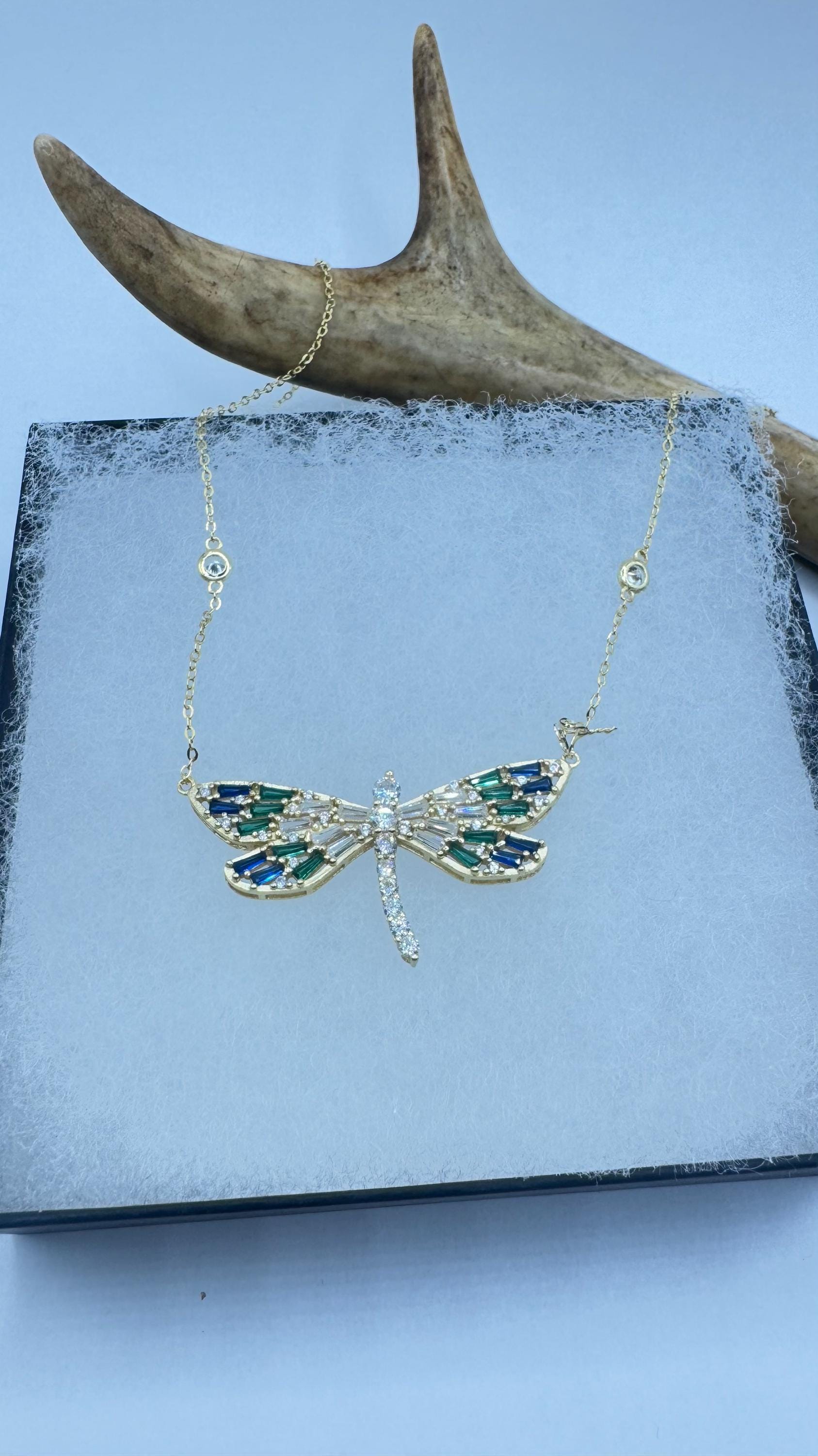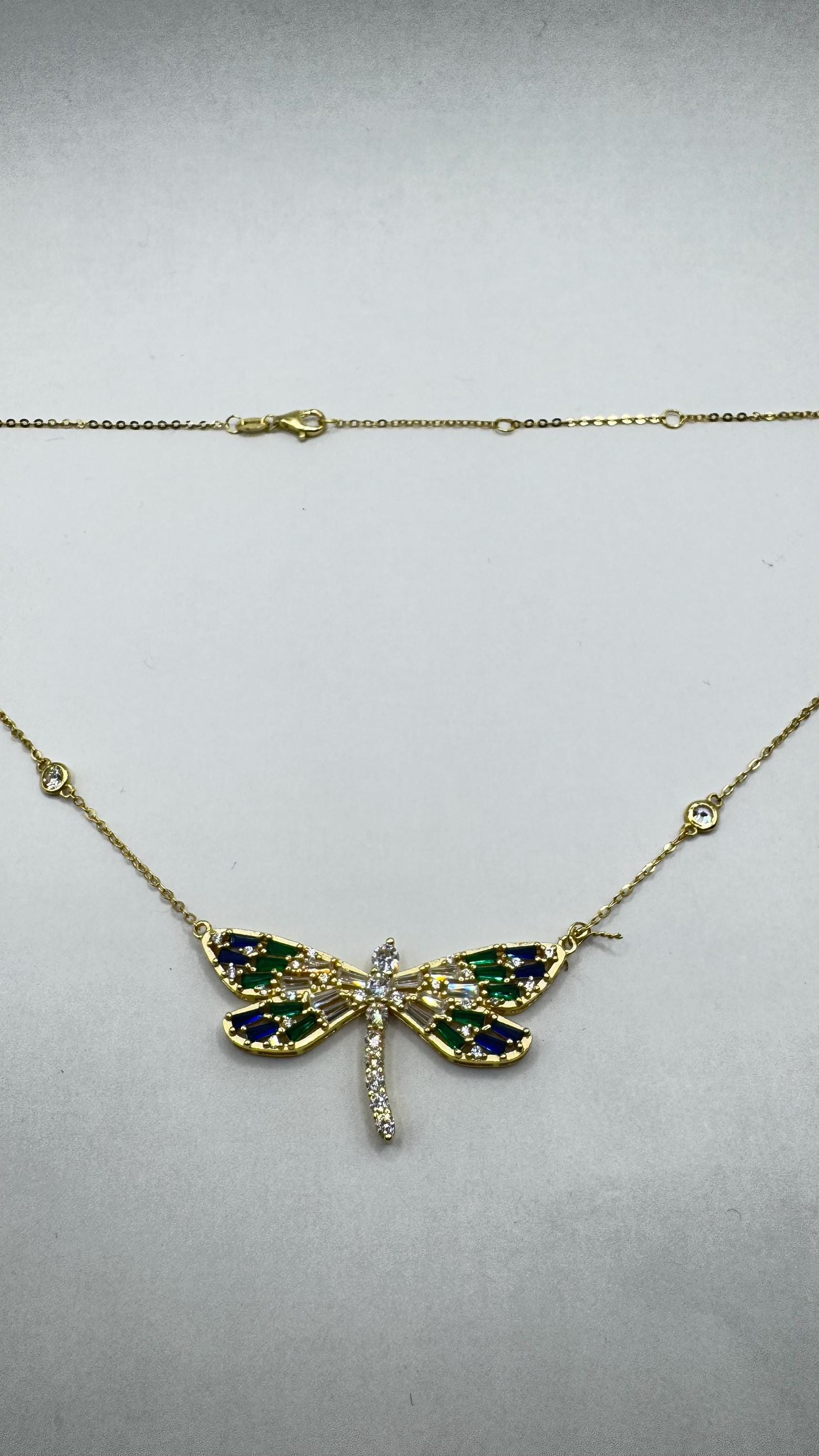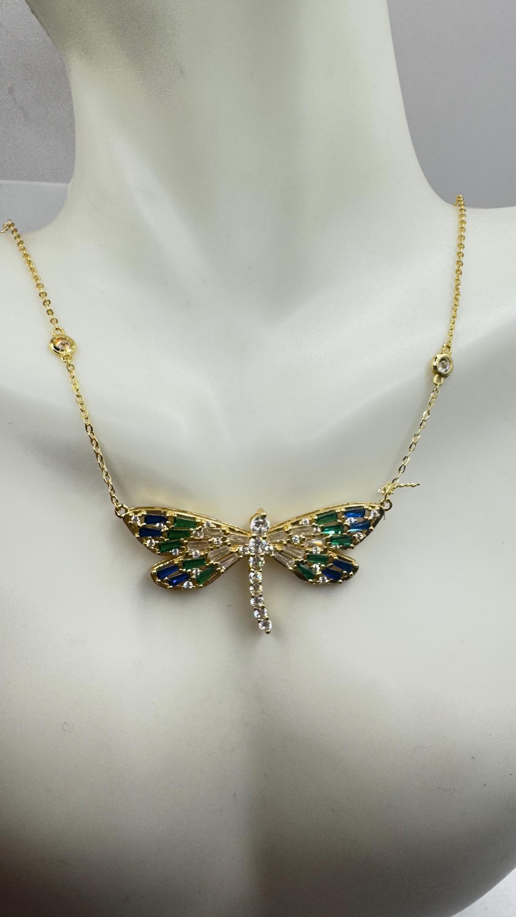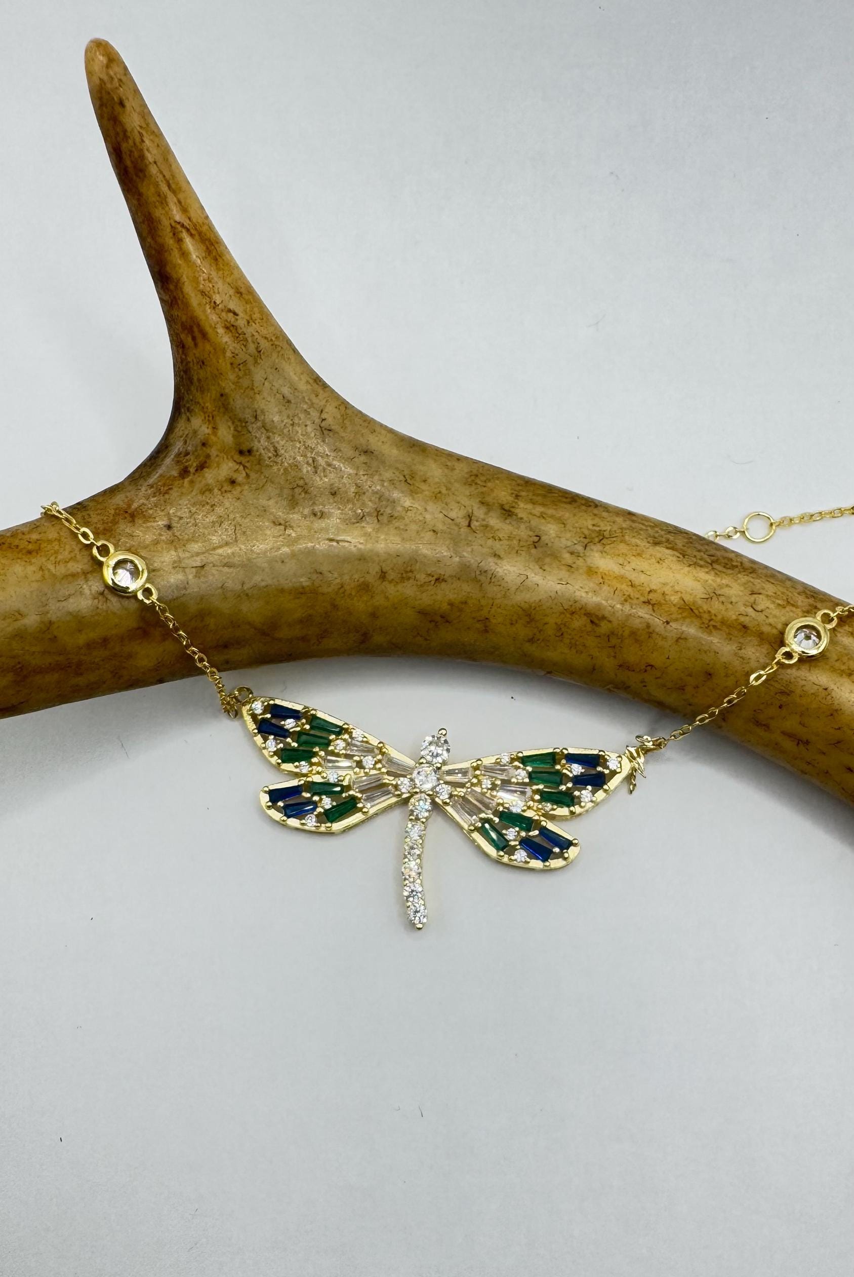 Vintage Charm Necklace | Blue Green Gemstone Dragonfly Pendant Necklace - Golden 925 Sterling Silver Matching Adjustable Chain