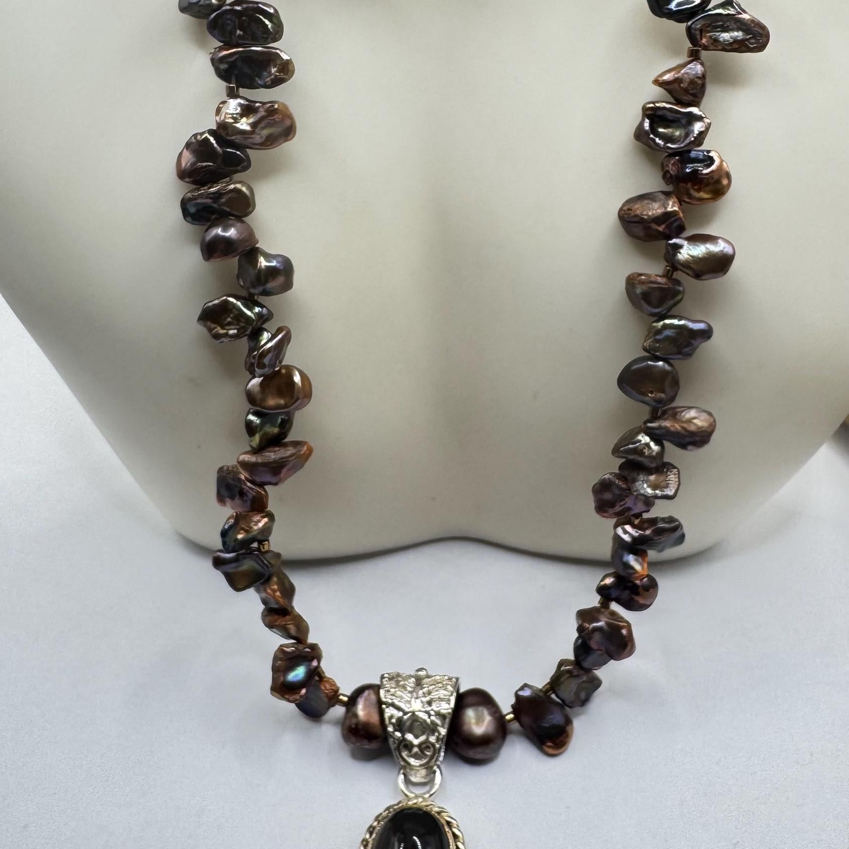 Vintage tiny brown chip freshwater pearl delicate beaded necklace. 18 inches plus extension and pendant The 925 sterling silver pendant... Read more