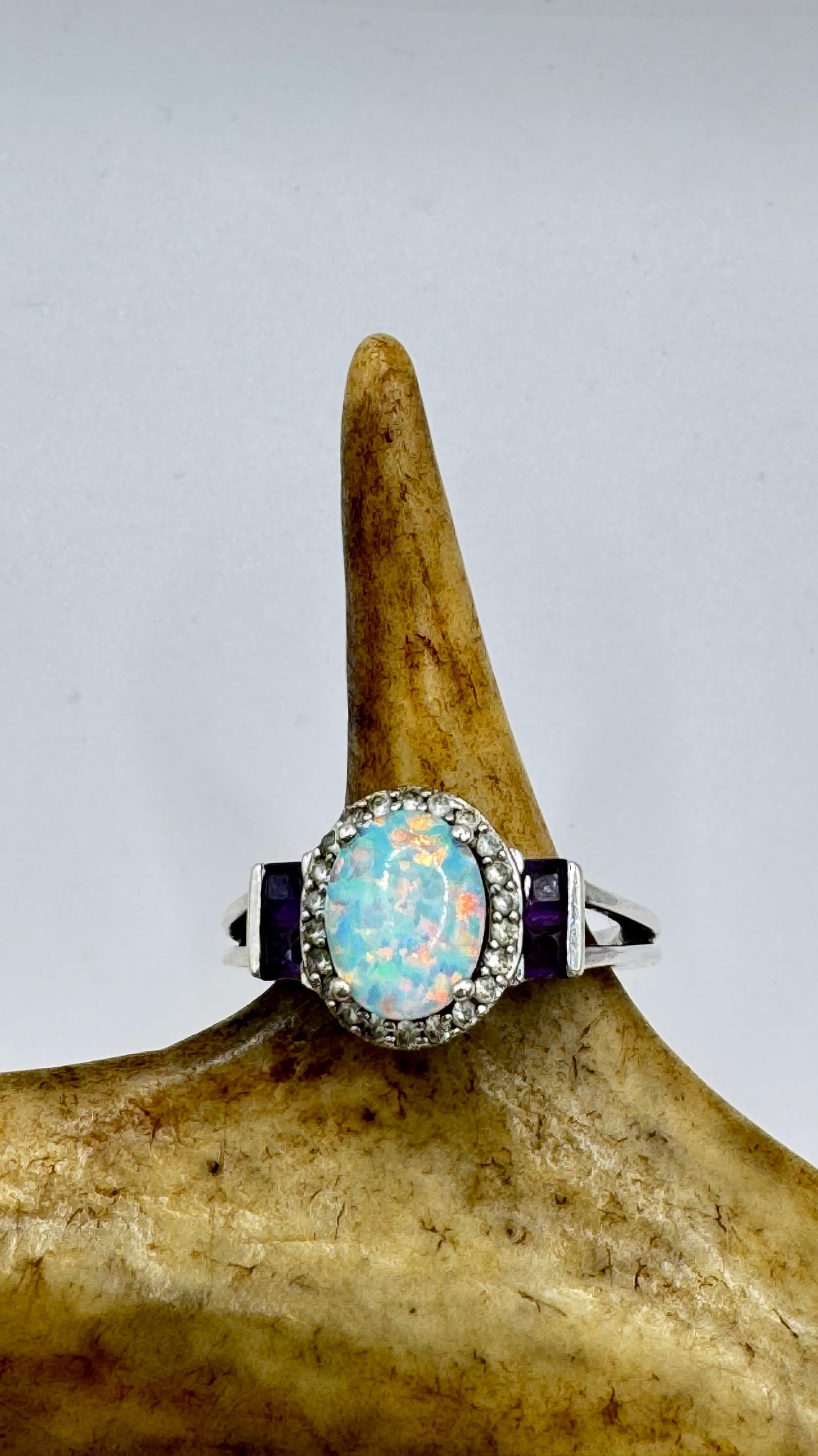Vintage Fire Opal, Diamond Purple Amethyst Ring 925 Sterling Silver