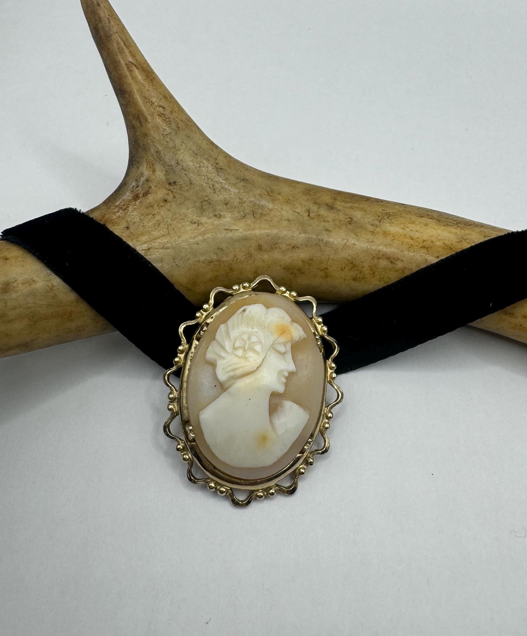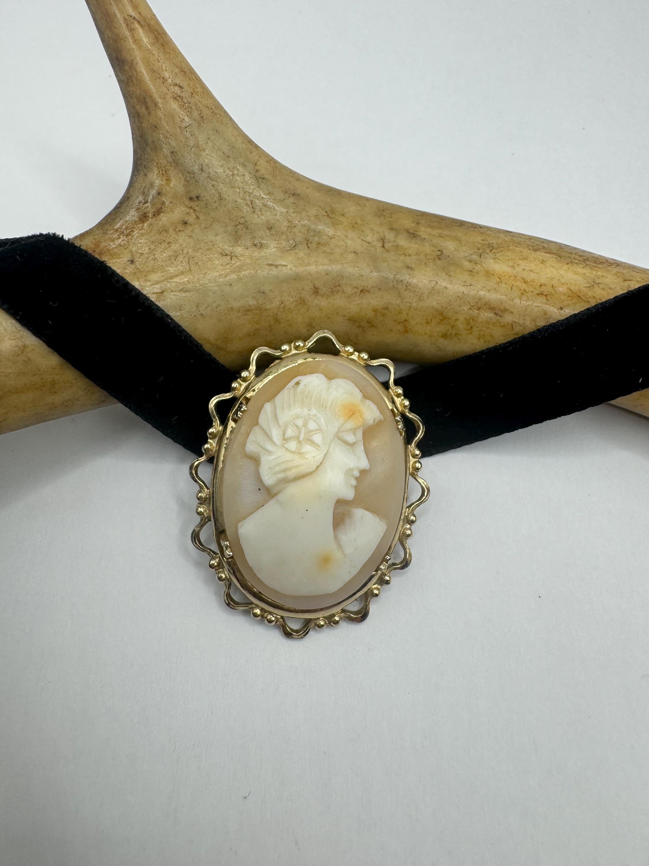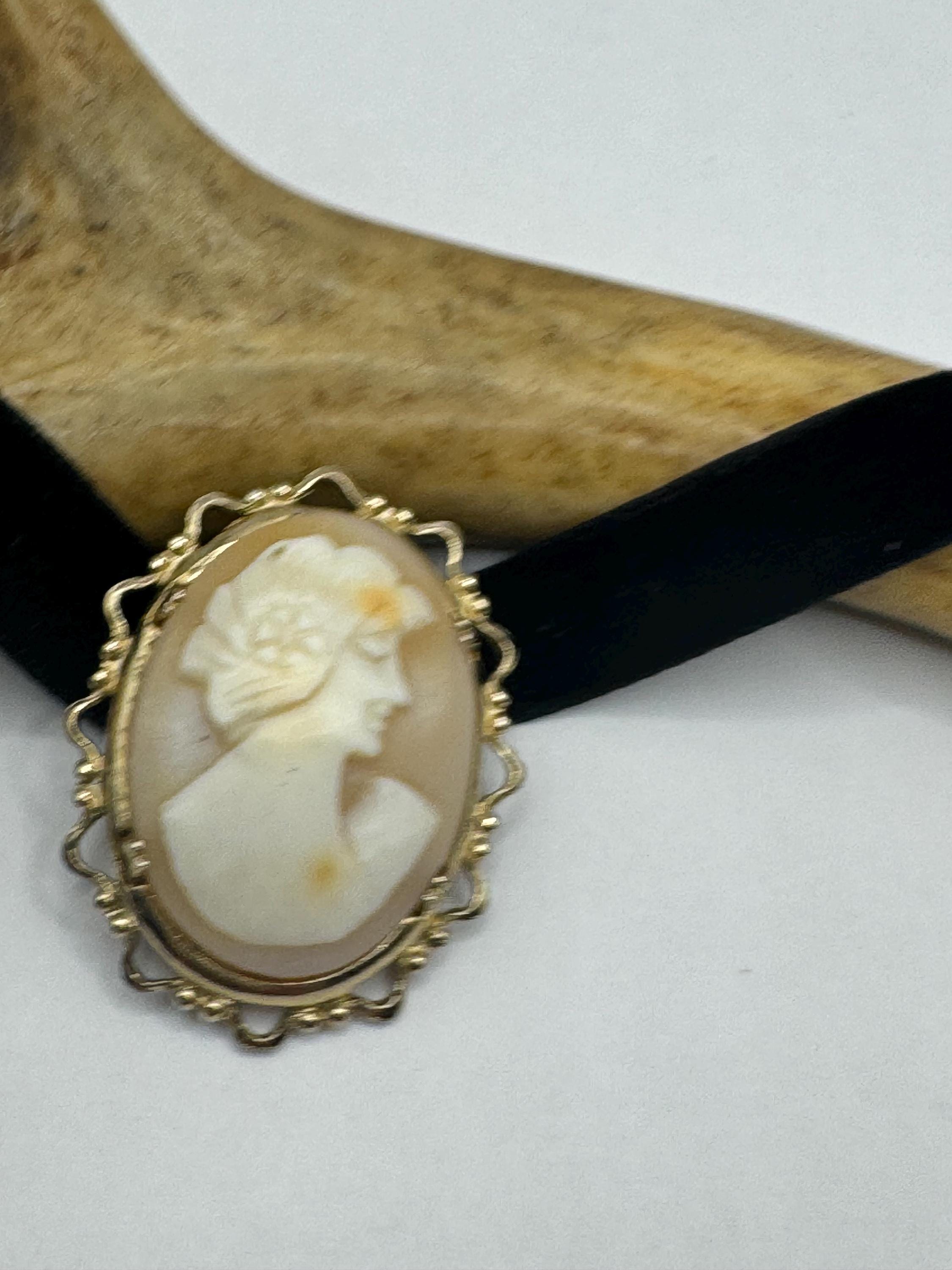 Vintage Cameo Brooch – Gold Filled Jewelry With Black Velvet Choker Ribbon