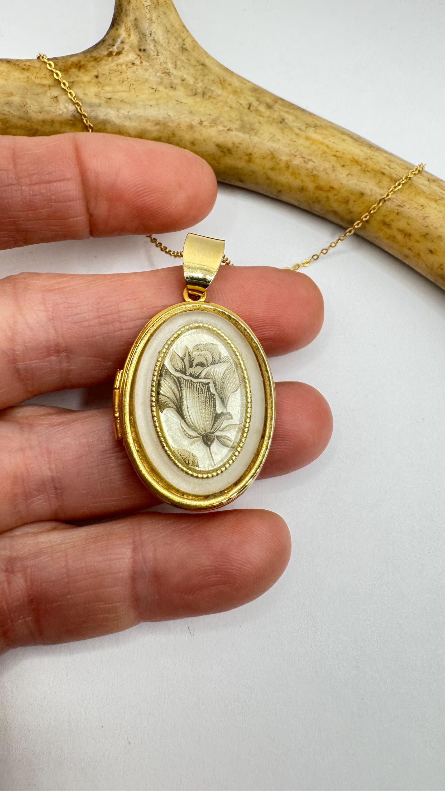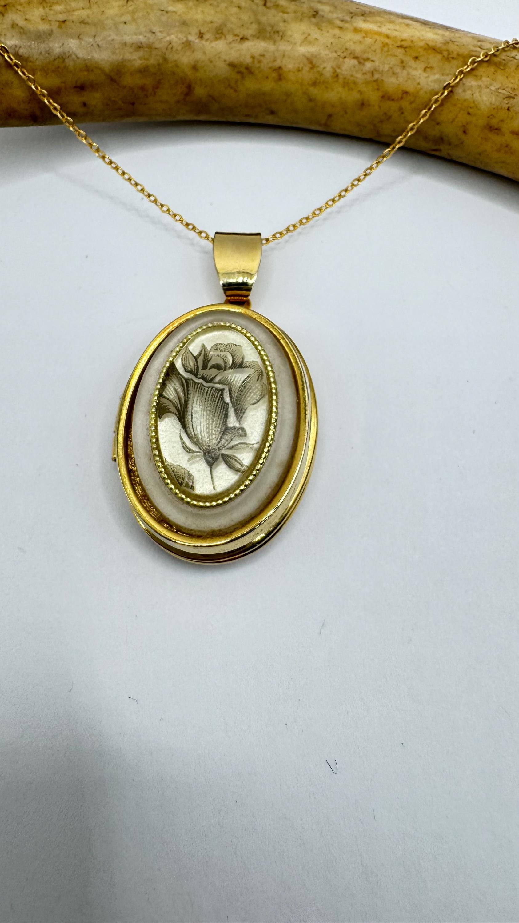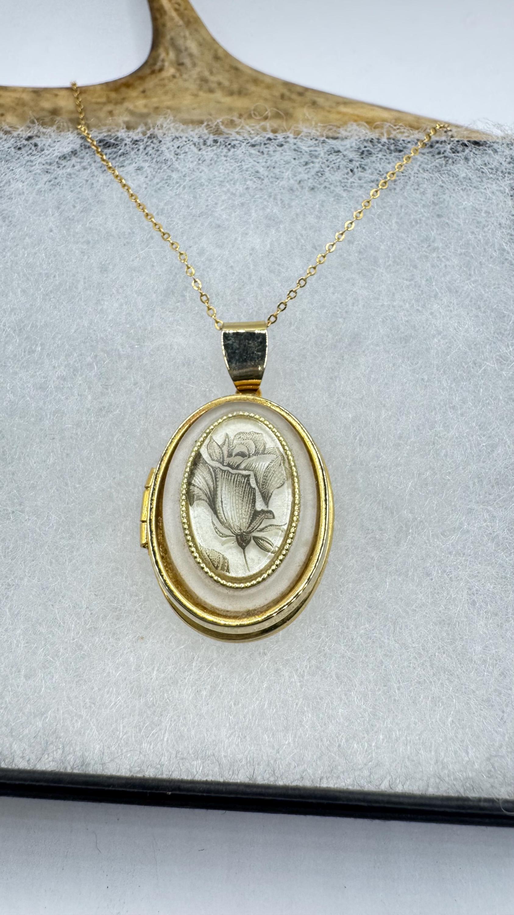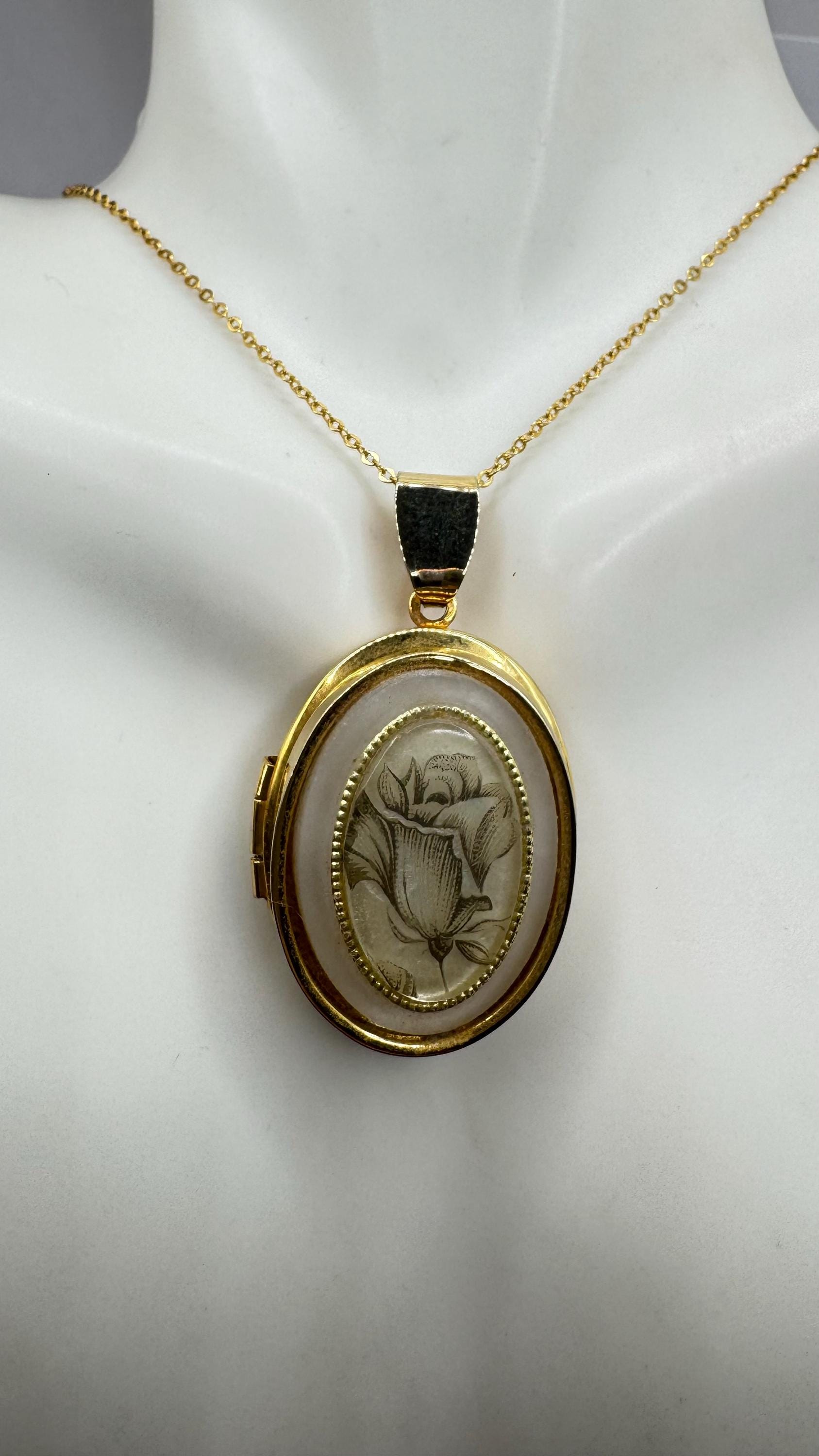 Vintage tiny mini locket 9k Gold filled Engraved and set with mother of Pearl resin With etched rose This tiny... Read more
