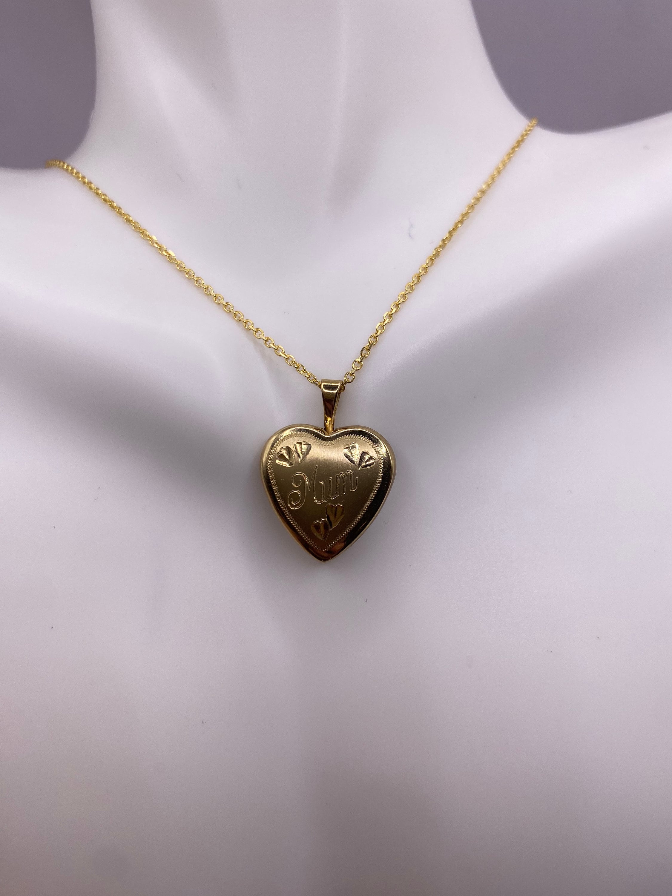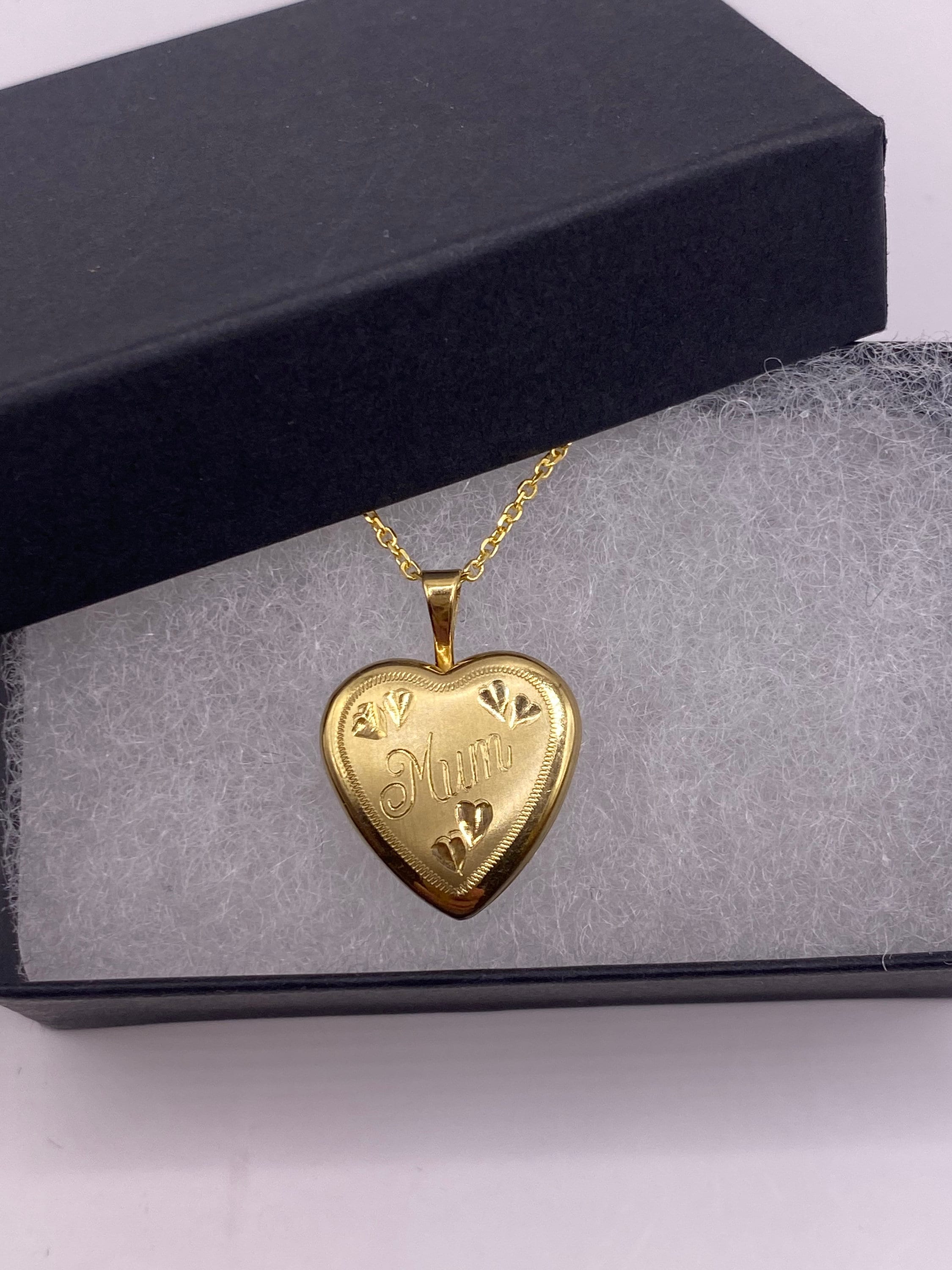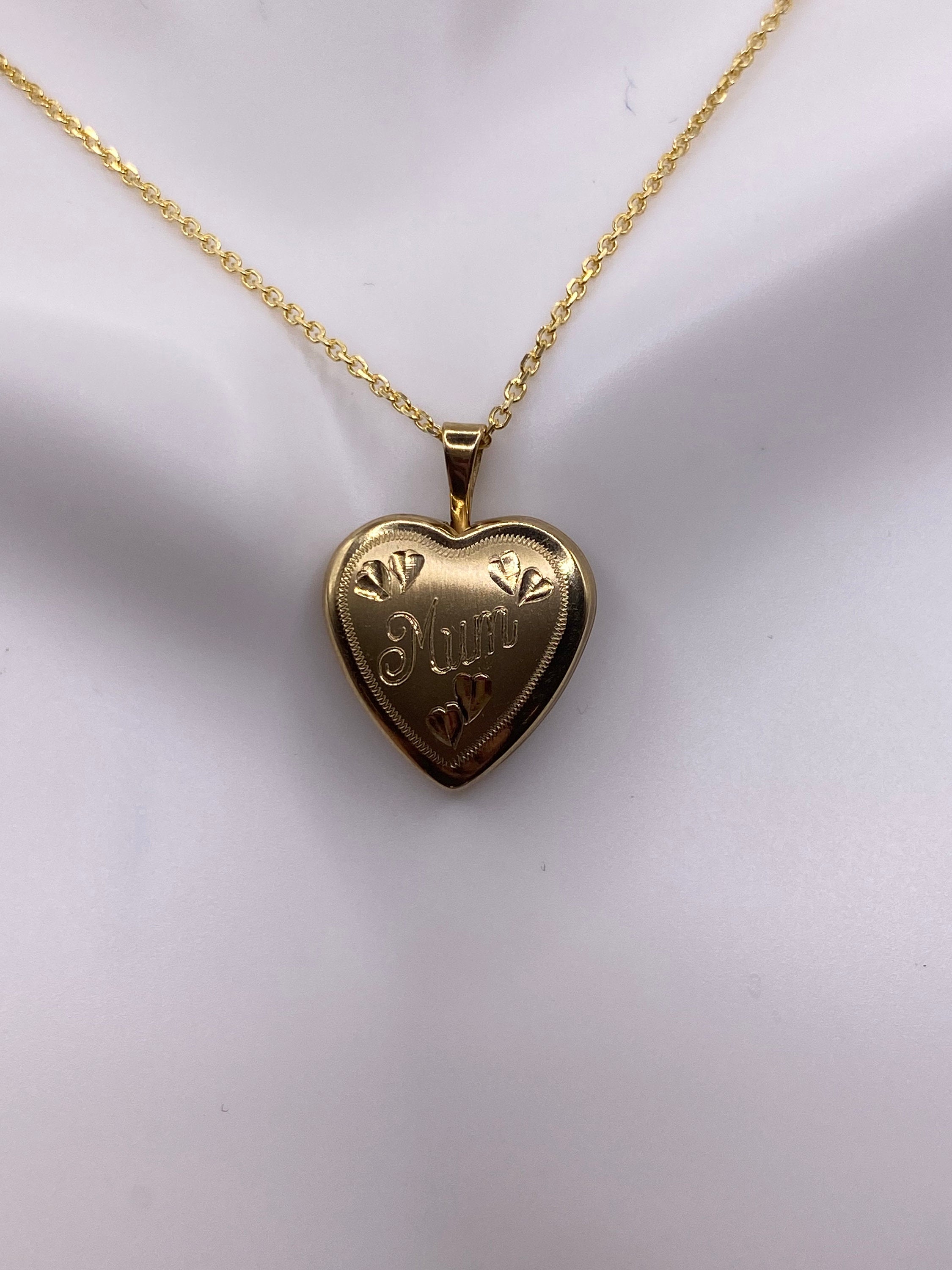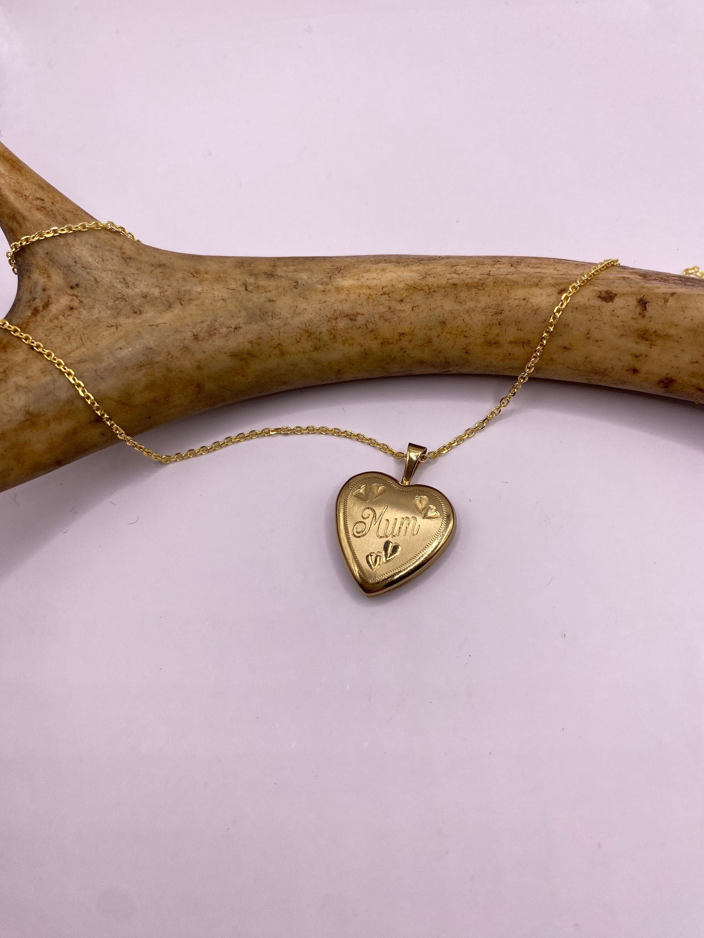 Vintage Gold Locket | Tiny 9k Gold Filled Heart Pendant Photo Memory Charm Engraved Mum | Golden 925 Sterling Silver Chain Necklace