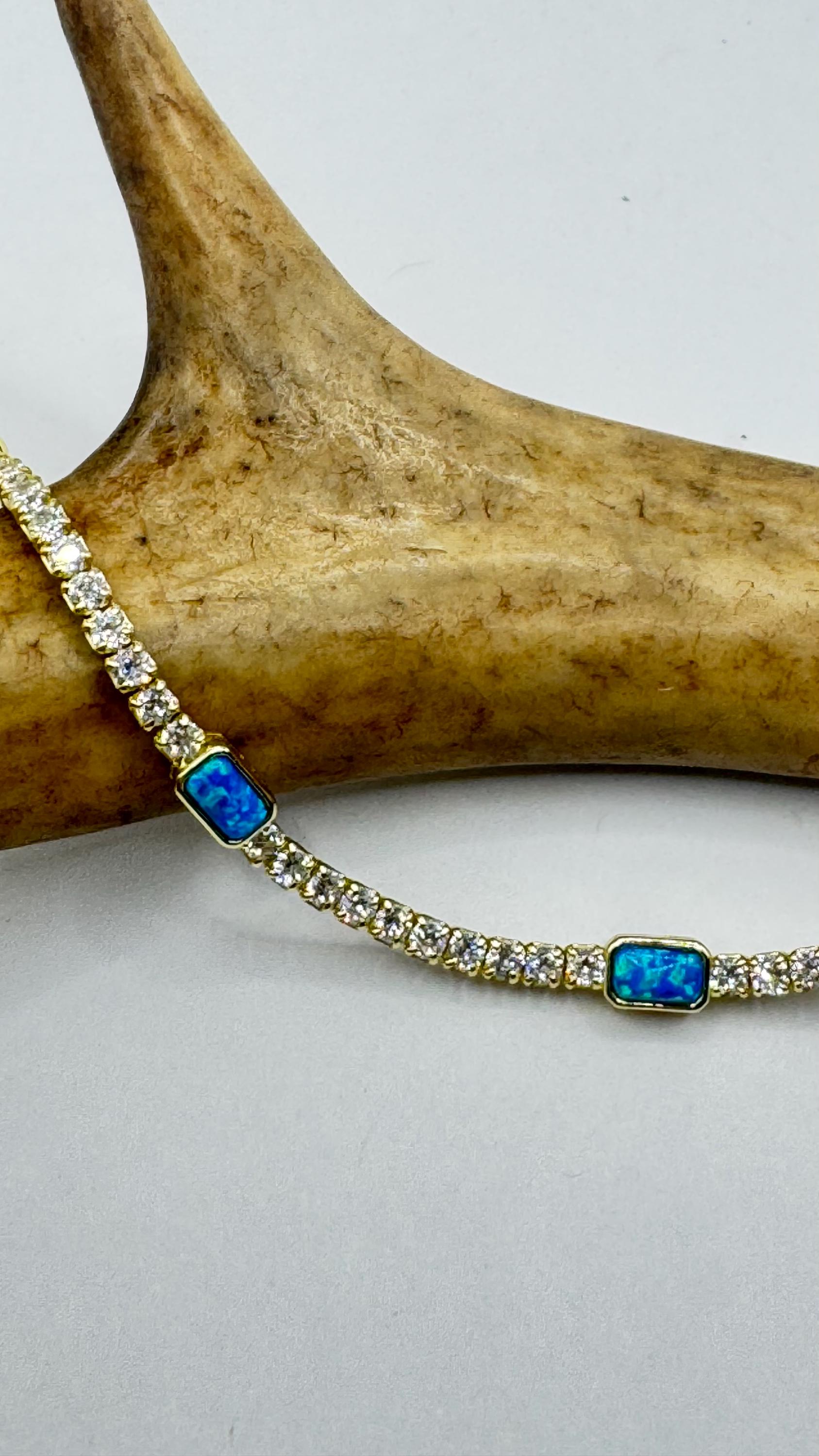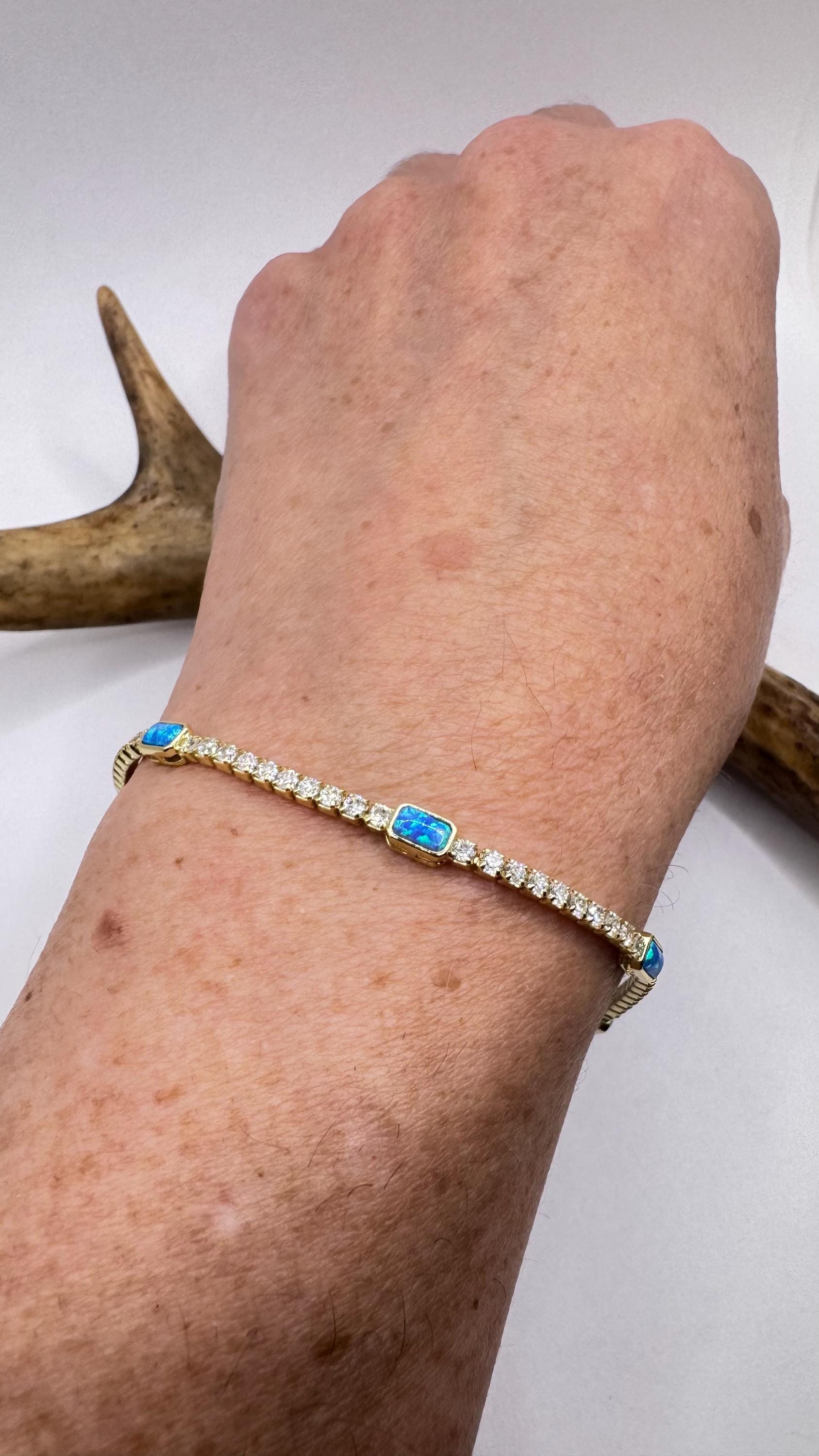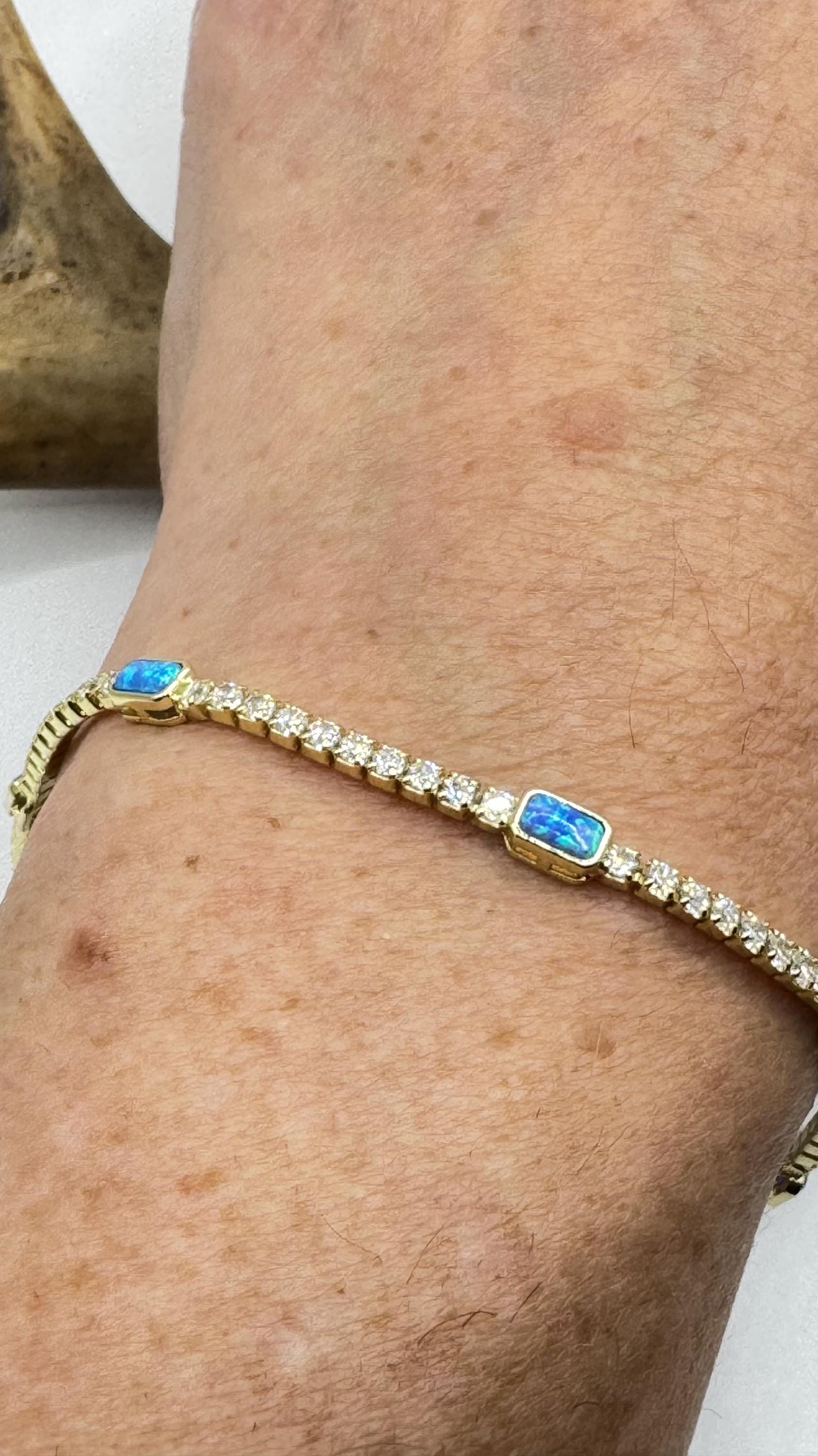 Vintage Gold Tennis Bracelet features stunning Blue Fire Opal gemstones Cubic Zirconia crystal diamonds set in a glamorous 4 Prong... Read more