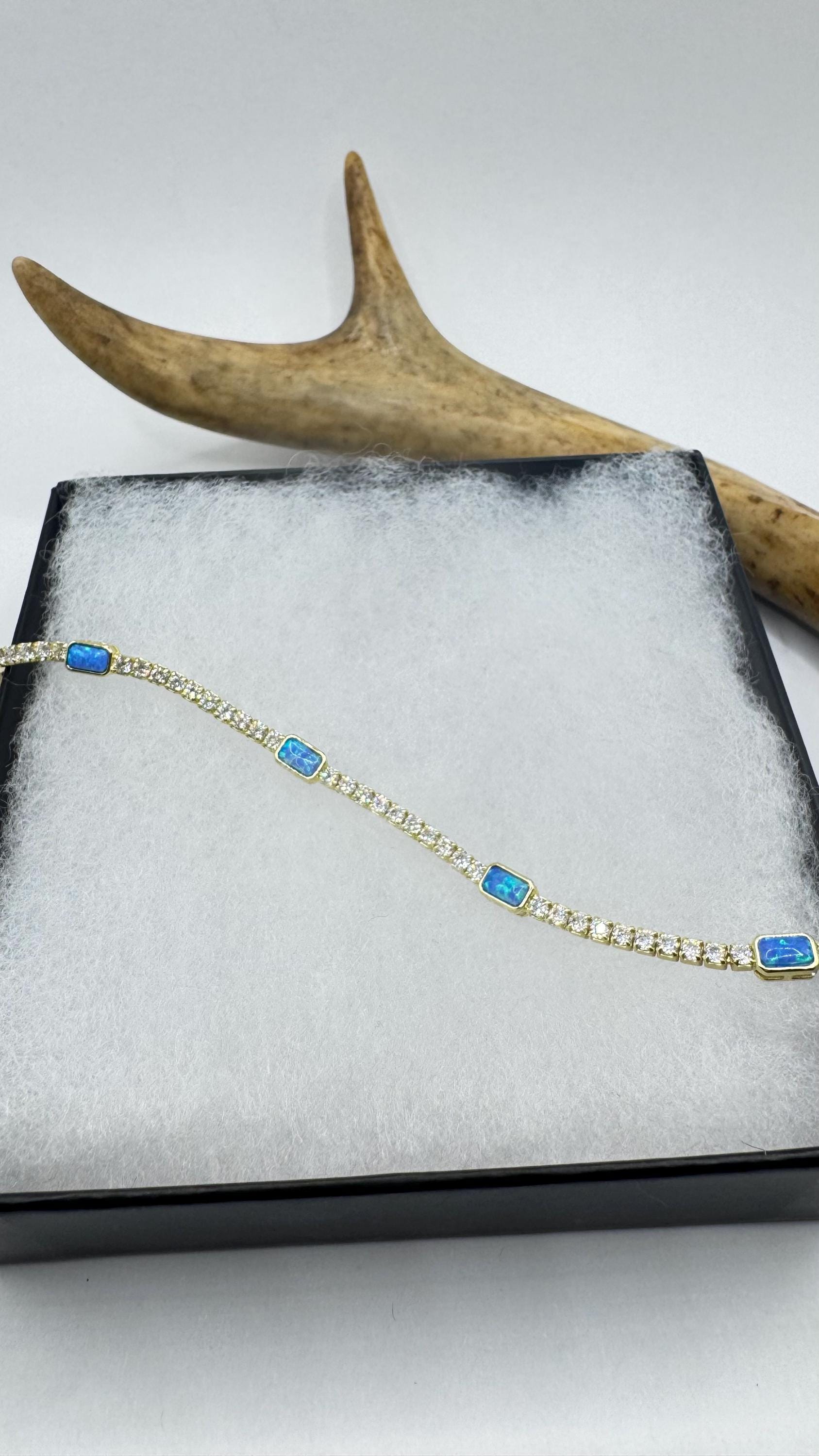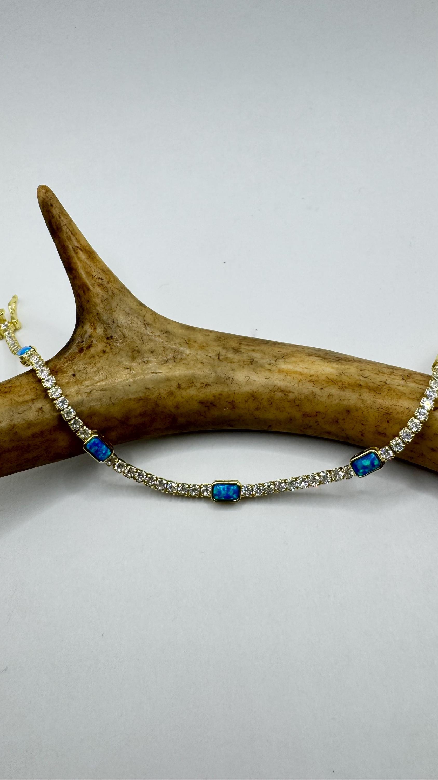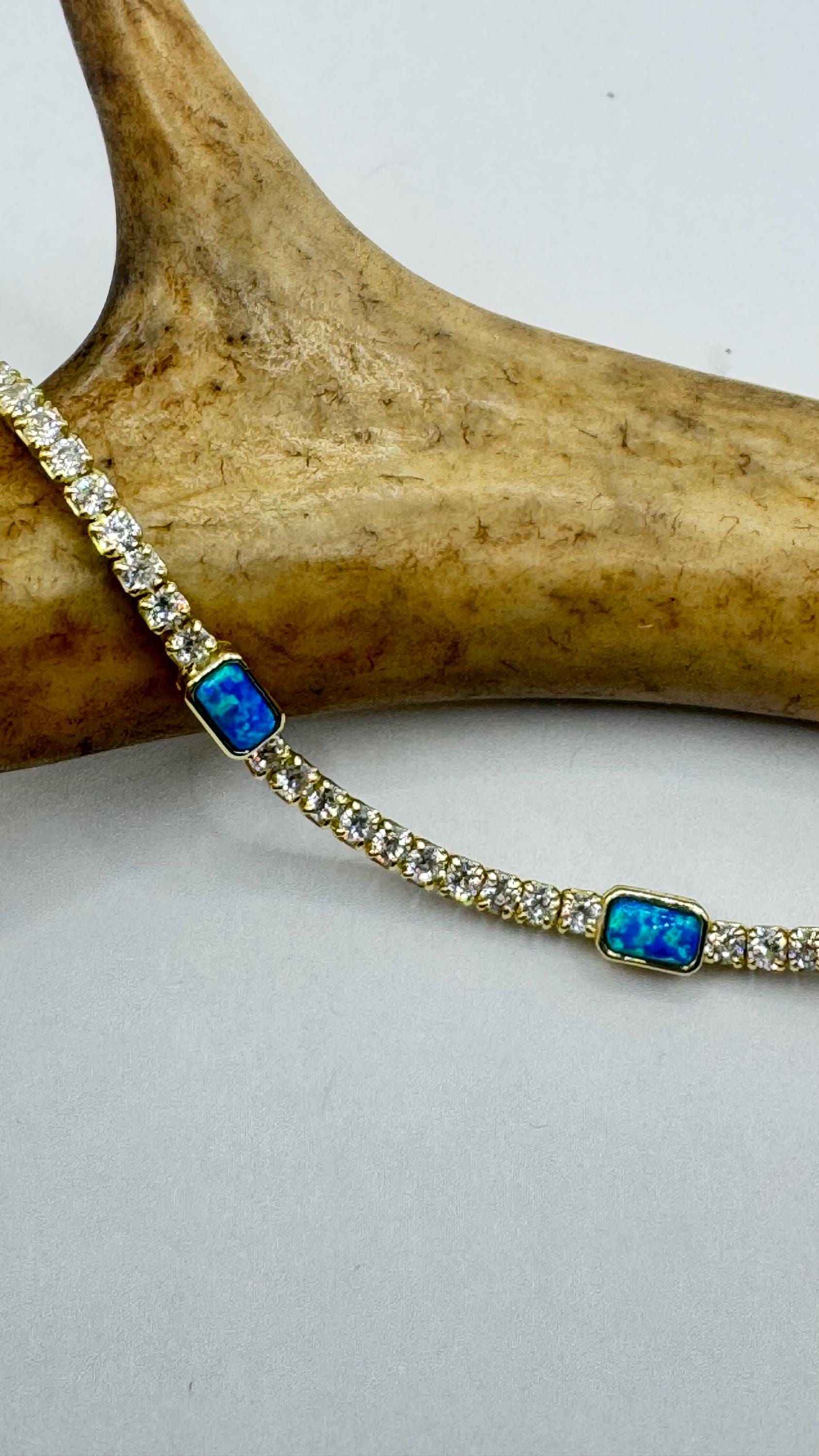 Vintage Gold Tennis Bracelet features stunning Blue Fire Opal gemstones Cubic Zirconia crystal diamonds set in a glamorous 4 Prong... Read more