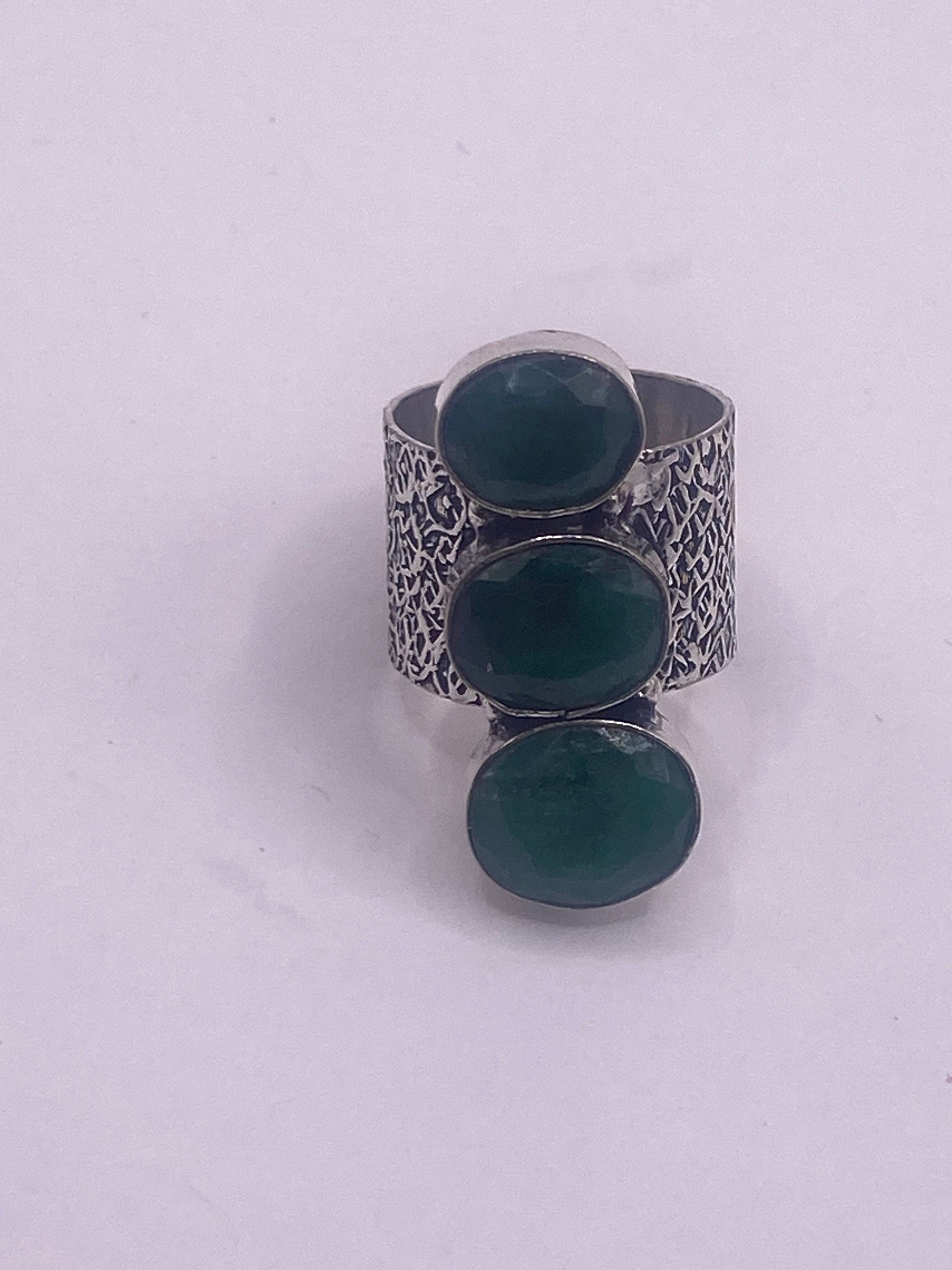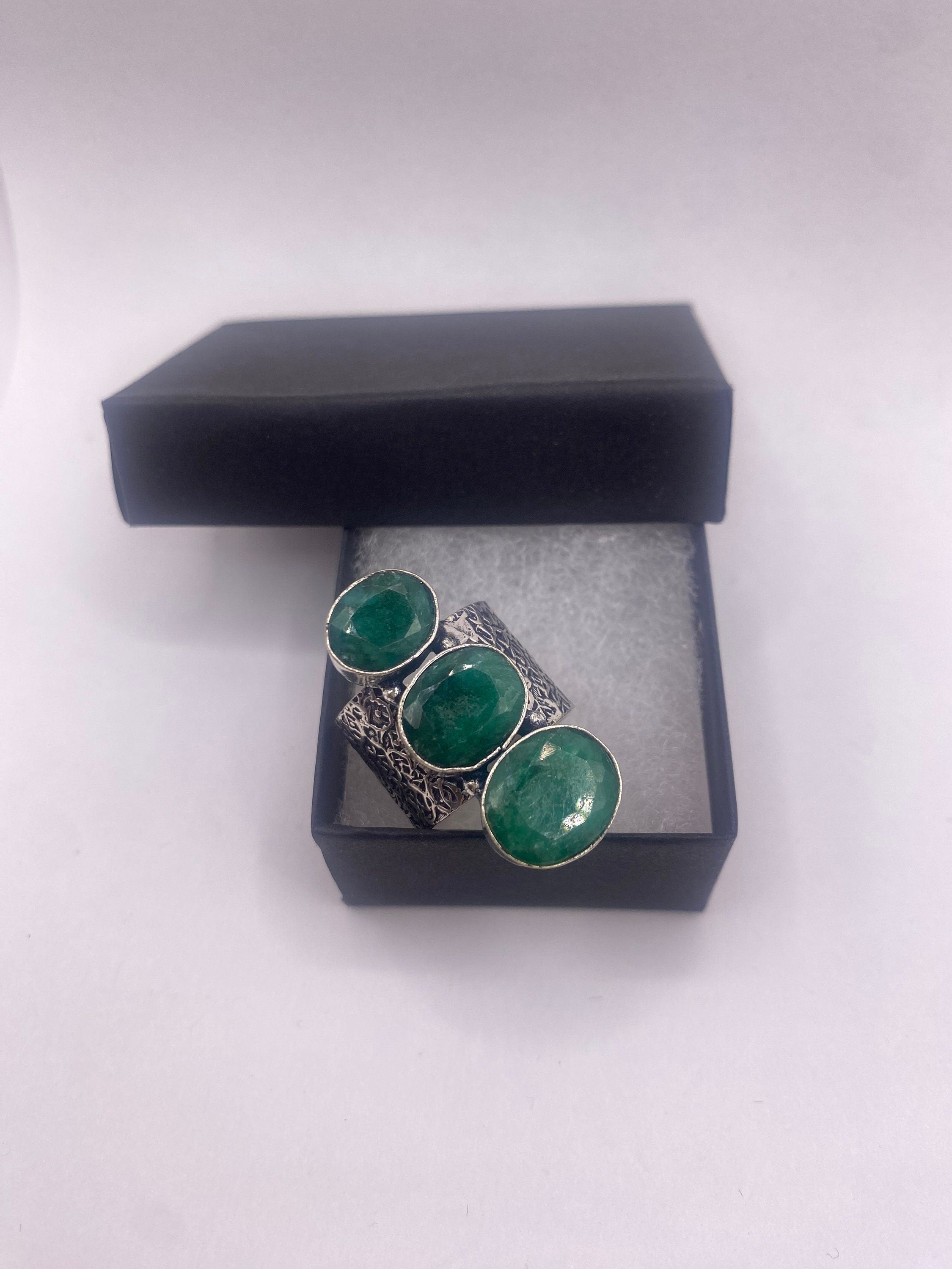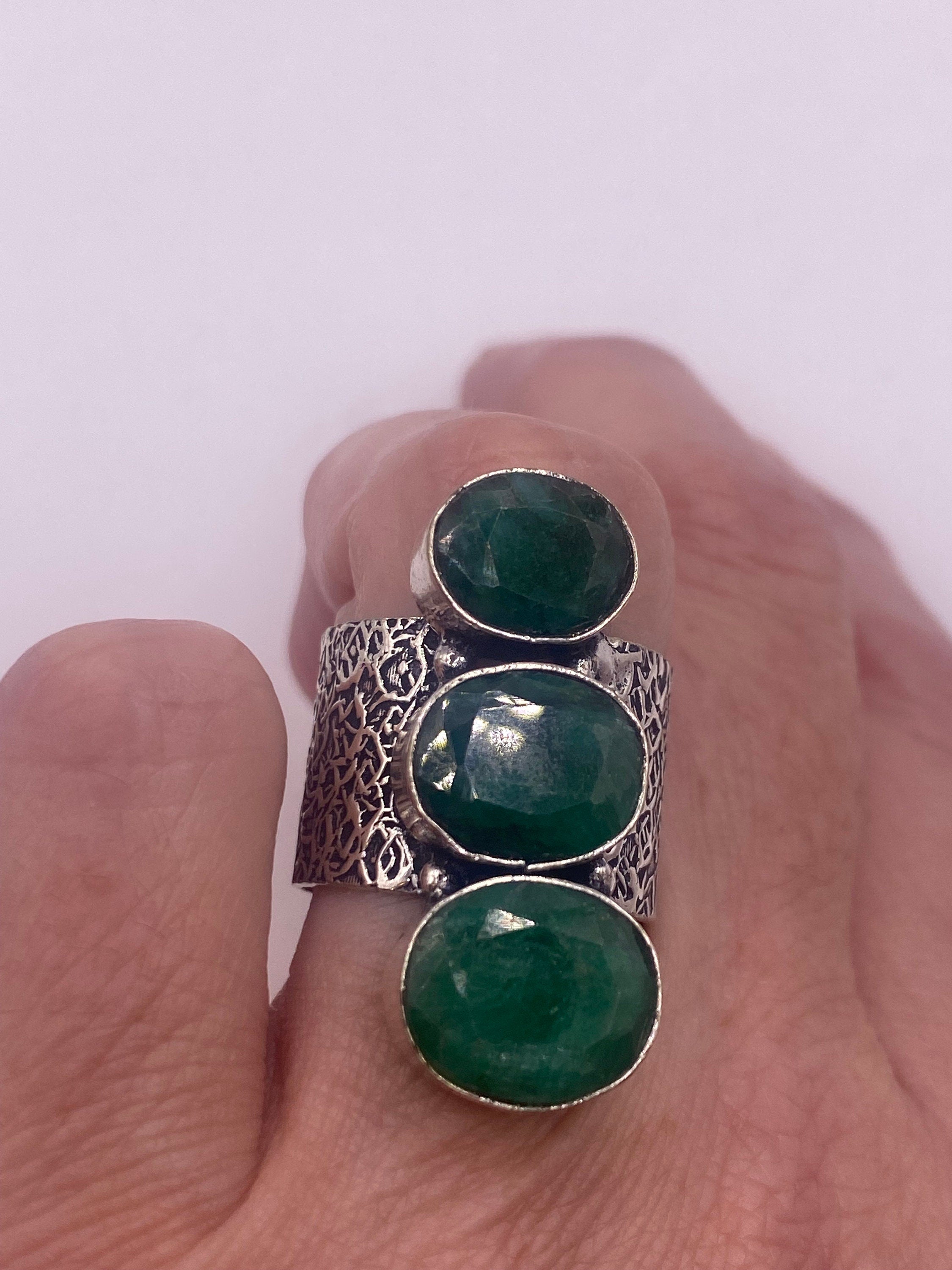 Vintage Green Emerald Boho Cocktail Ring Silver Band, Antique Style Design