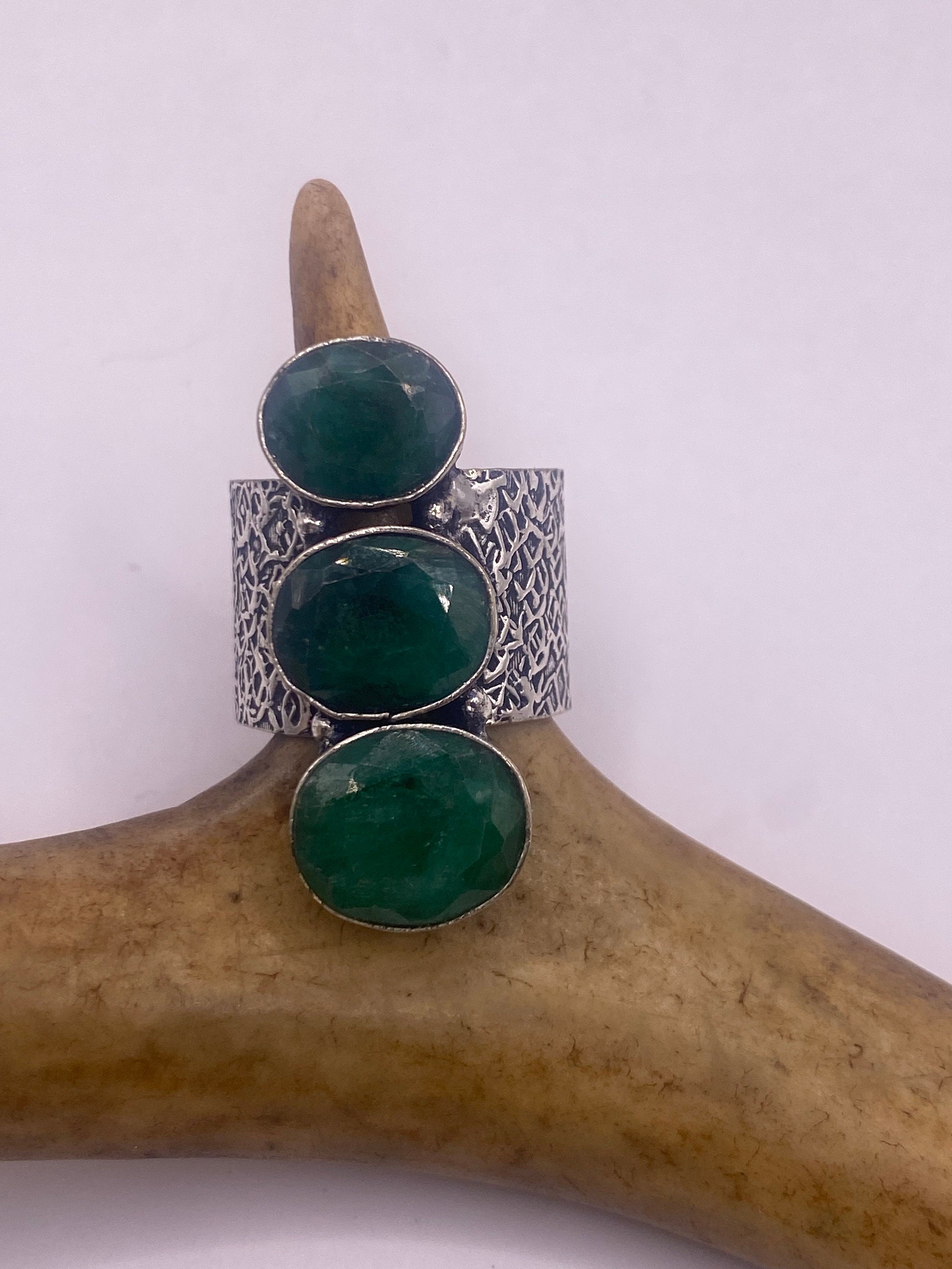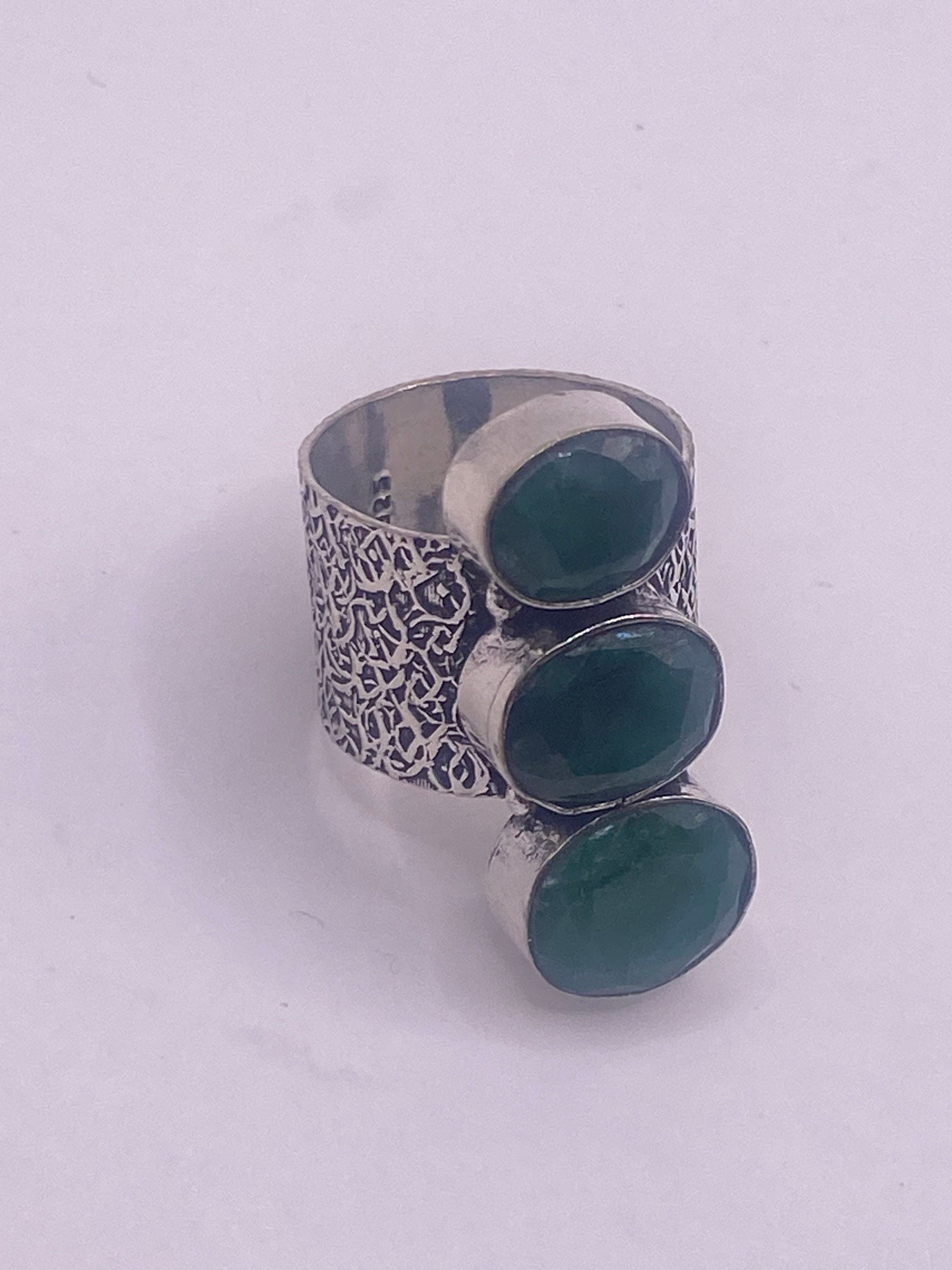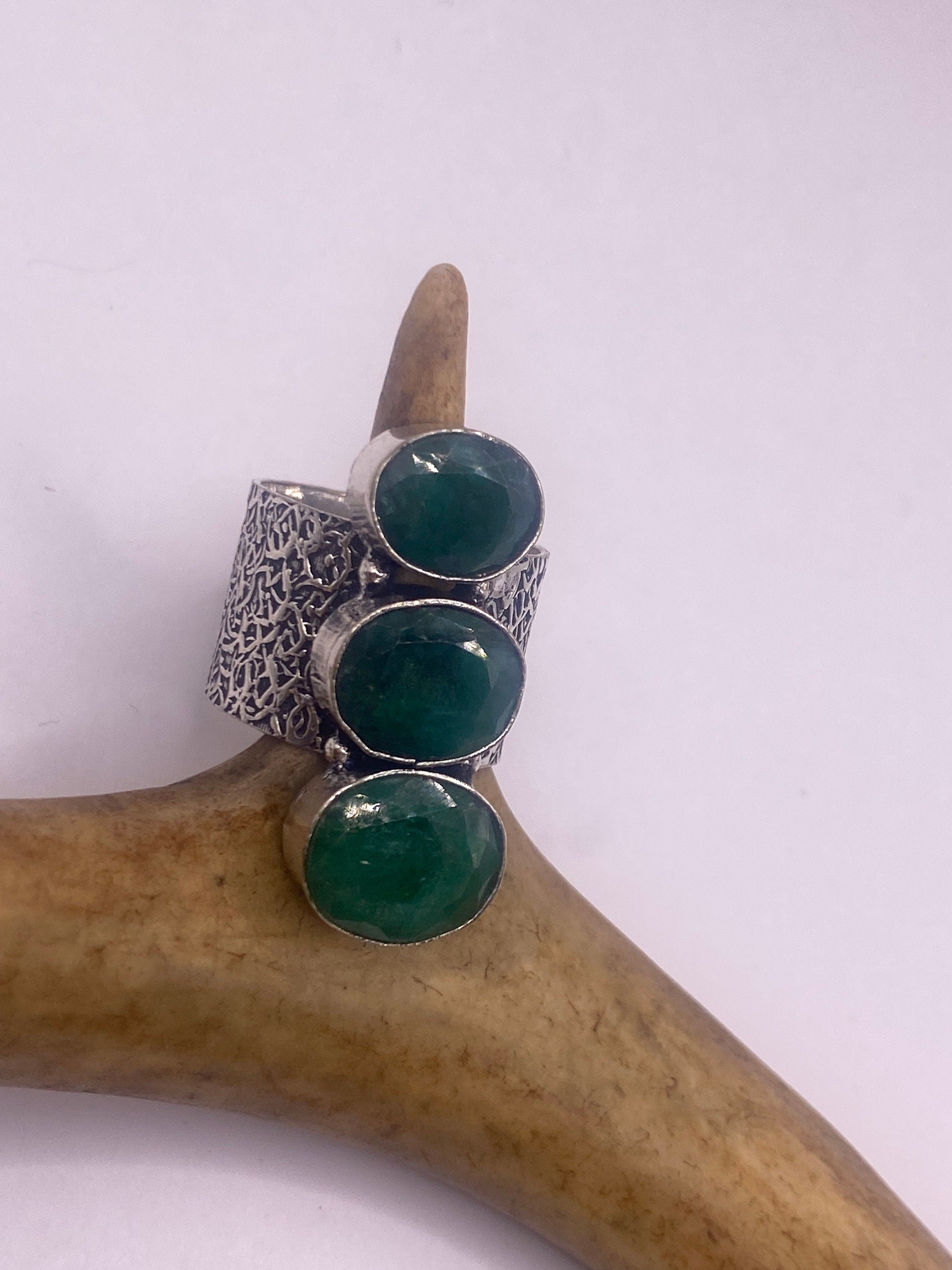 Vintage Green Emerald Boho Cocktail Ring Silver Band, Antique Style Design