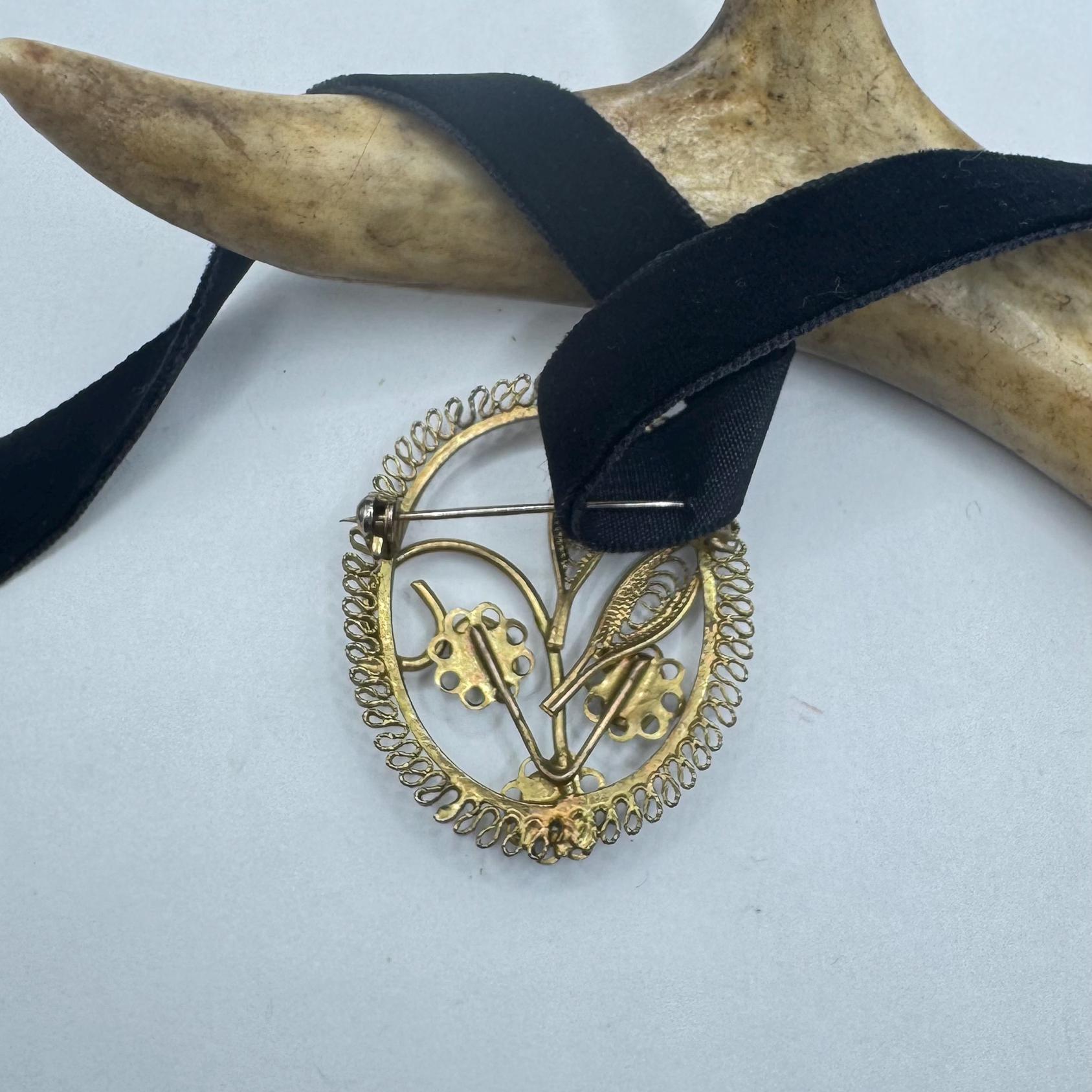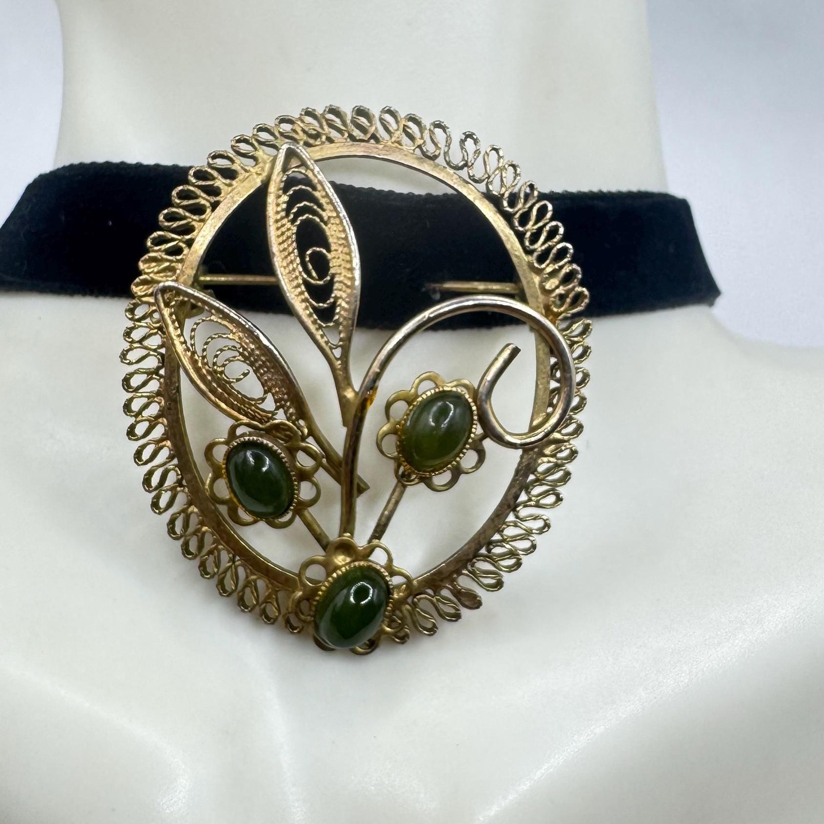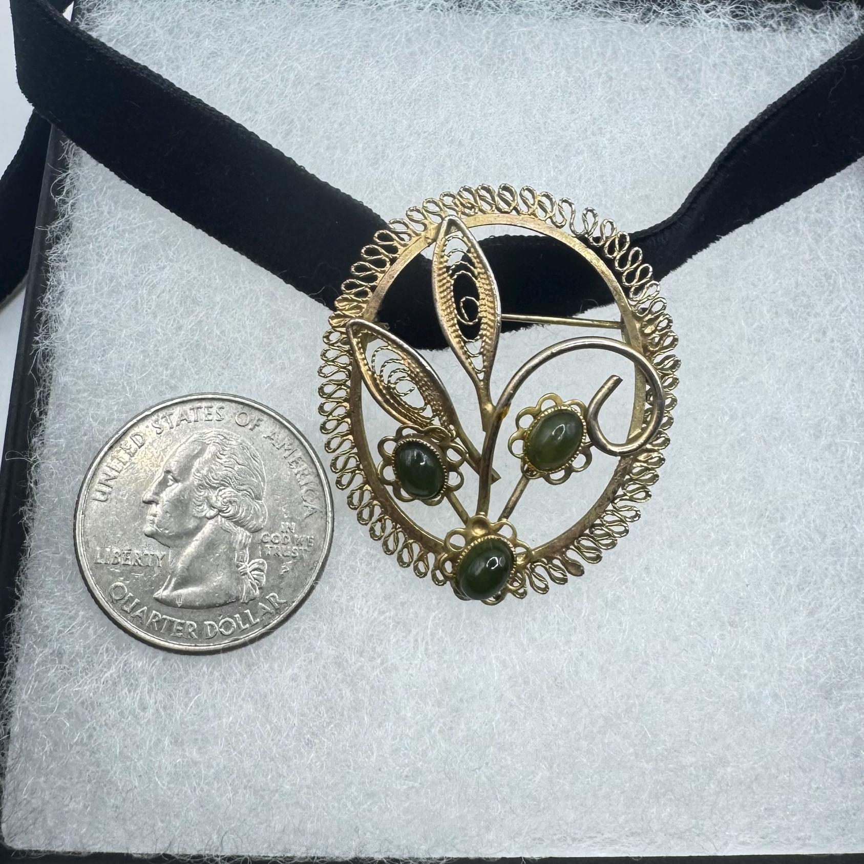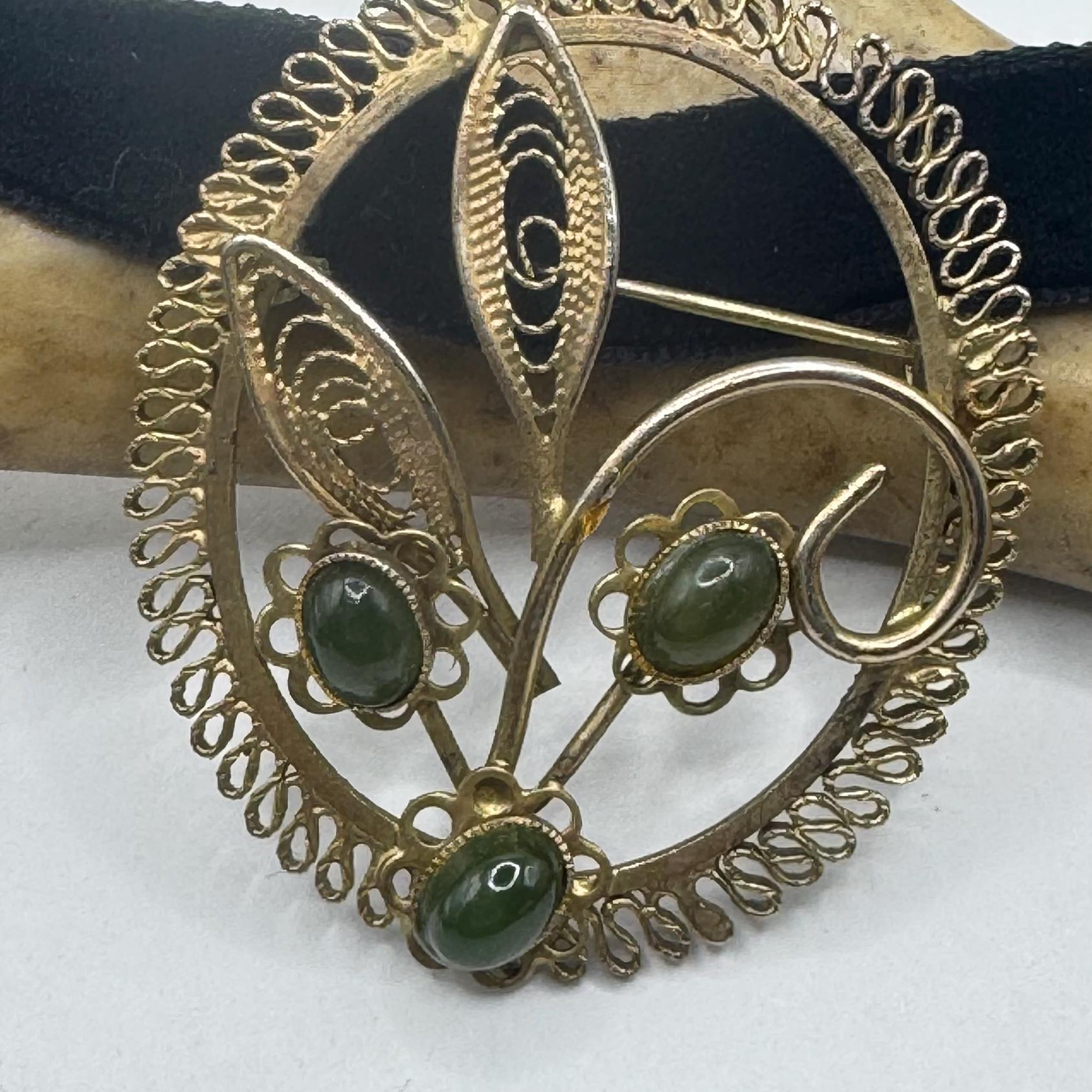 Vintage Green Jade Brooch Pin: 12K Gold Filled Velvet Choker