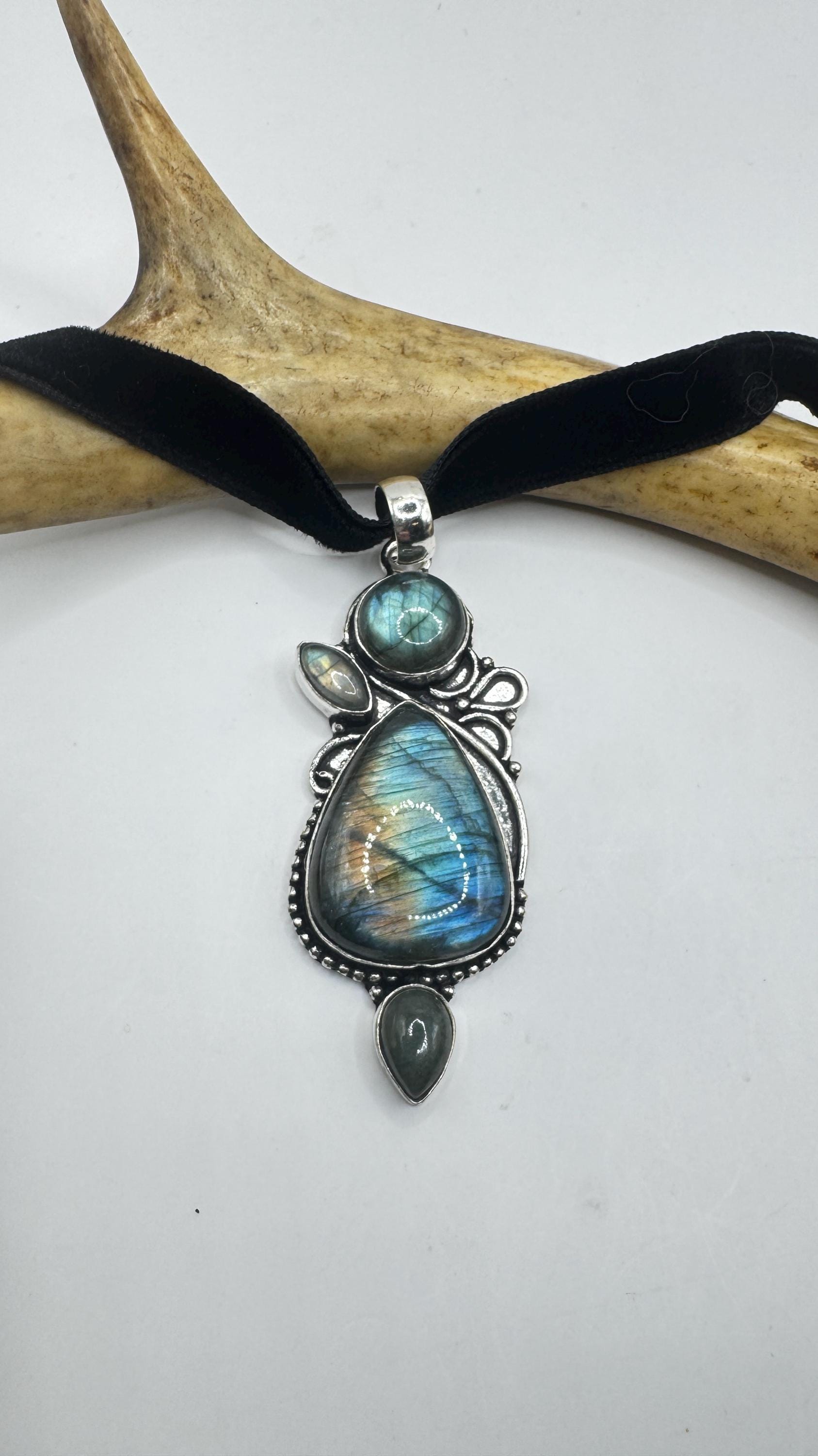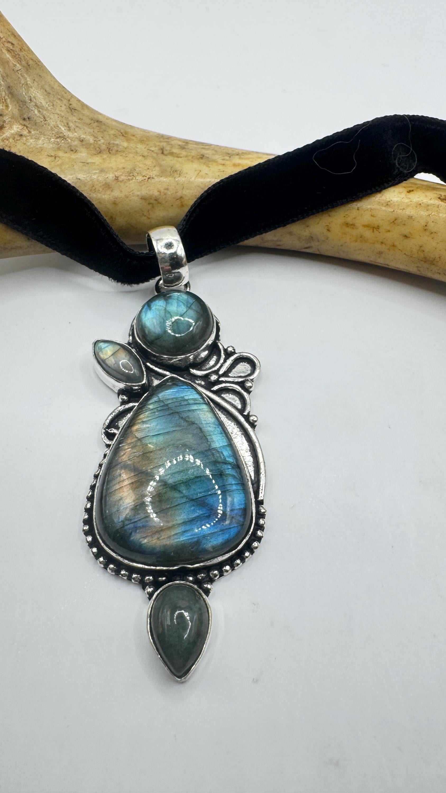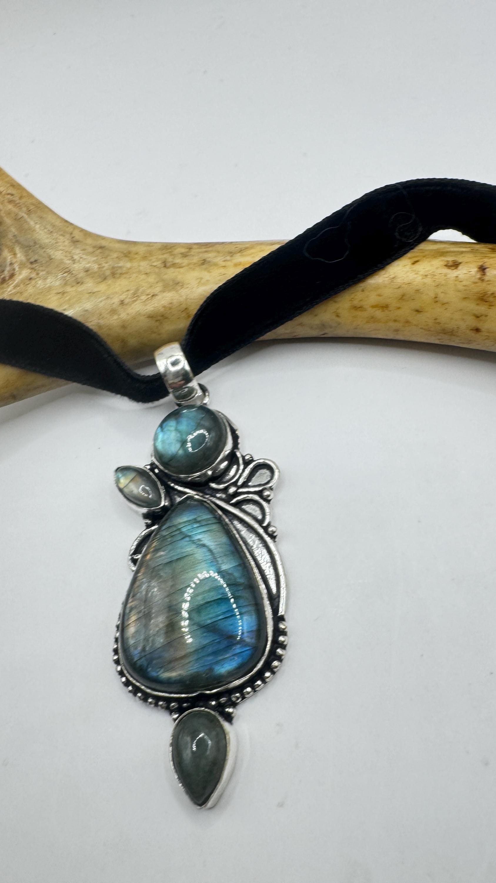 Vintage Green Labradorite Necklace - Bronze and Silver Finish - Velvet Ribbon Choker