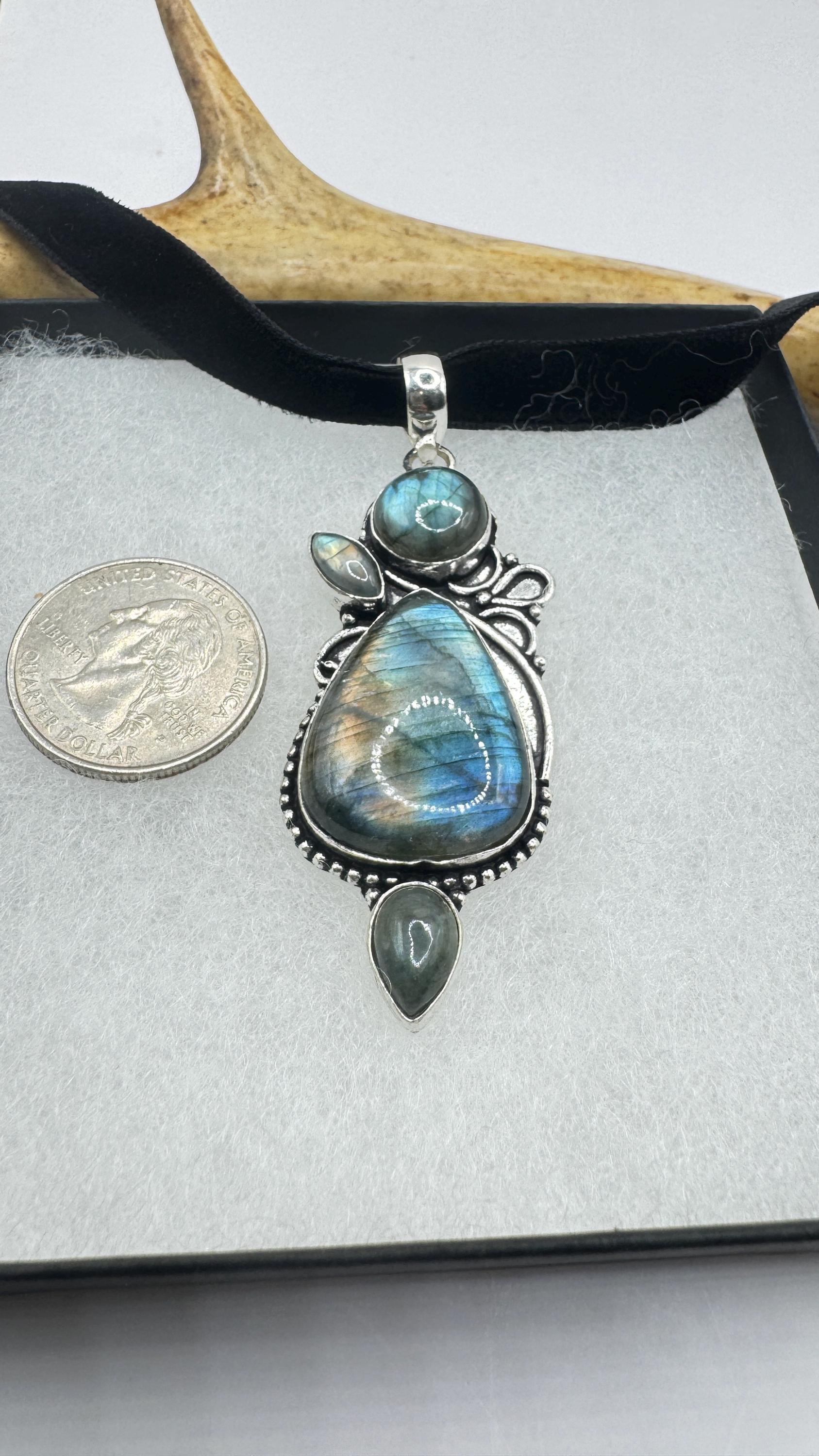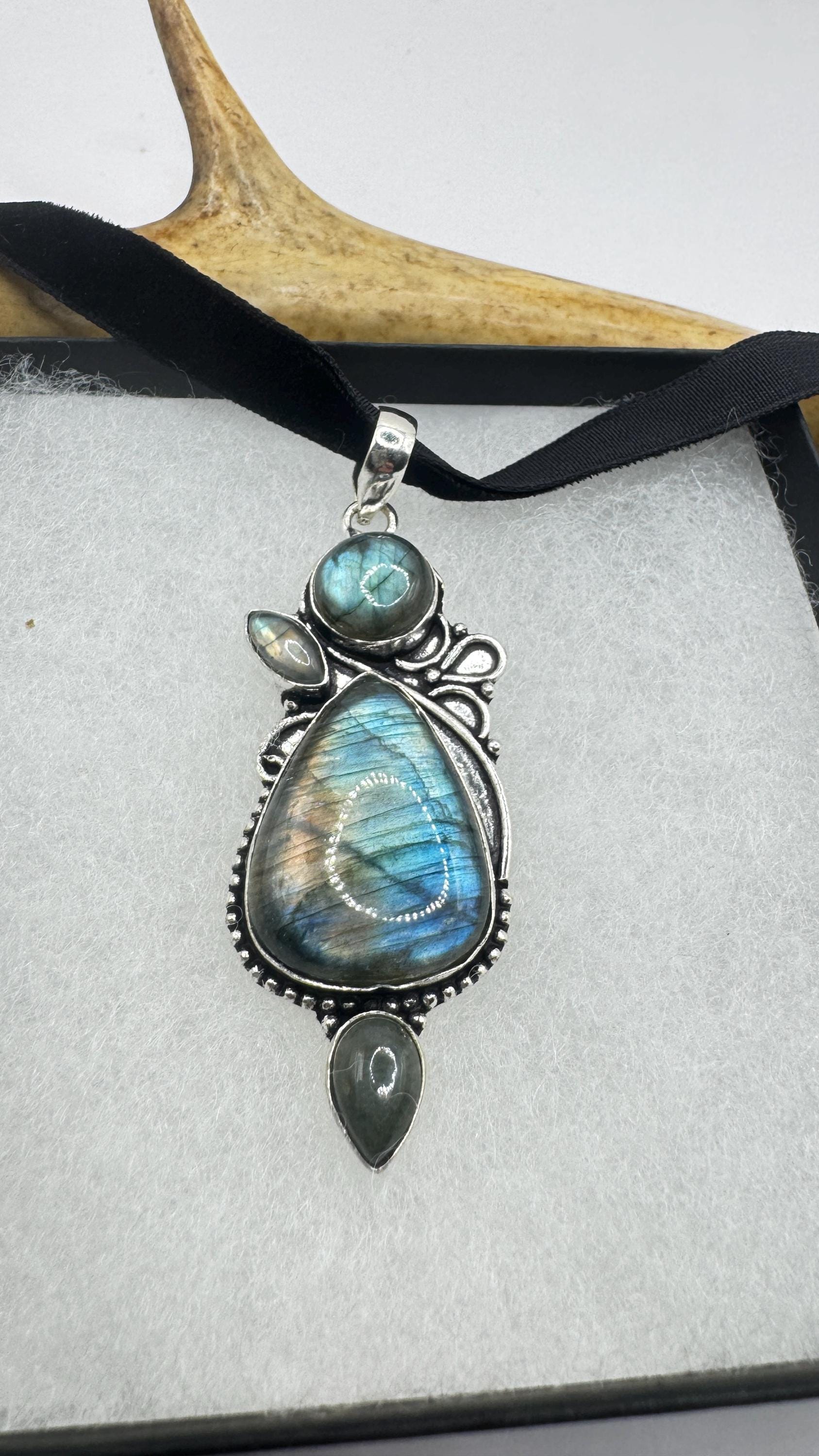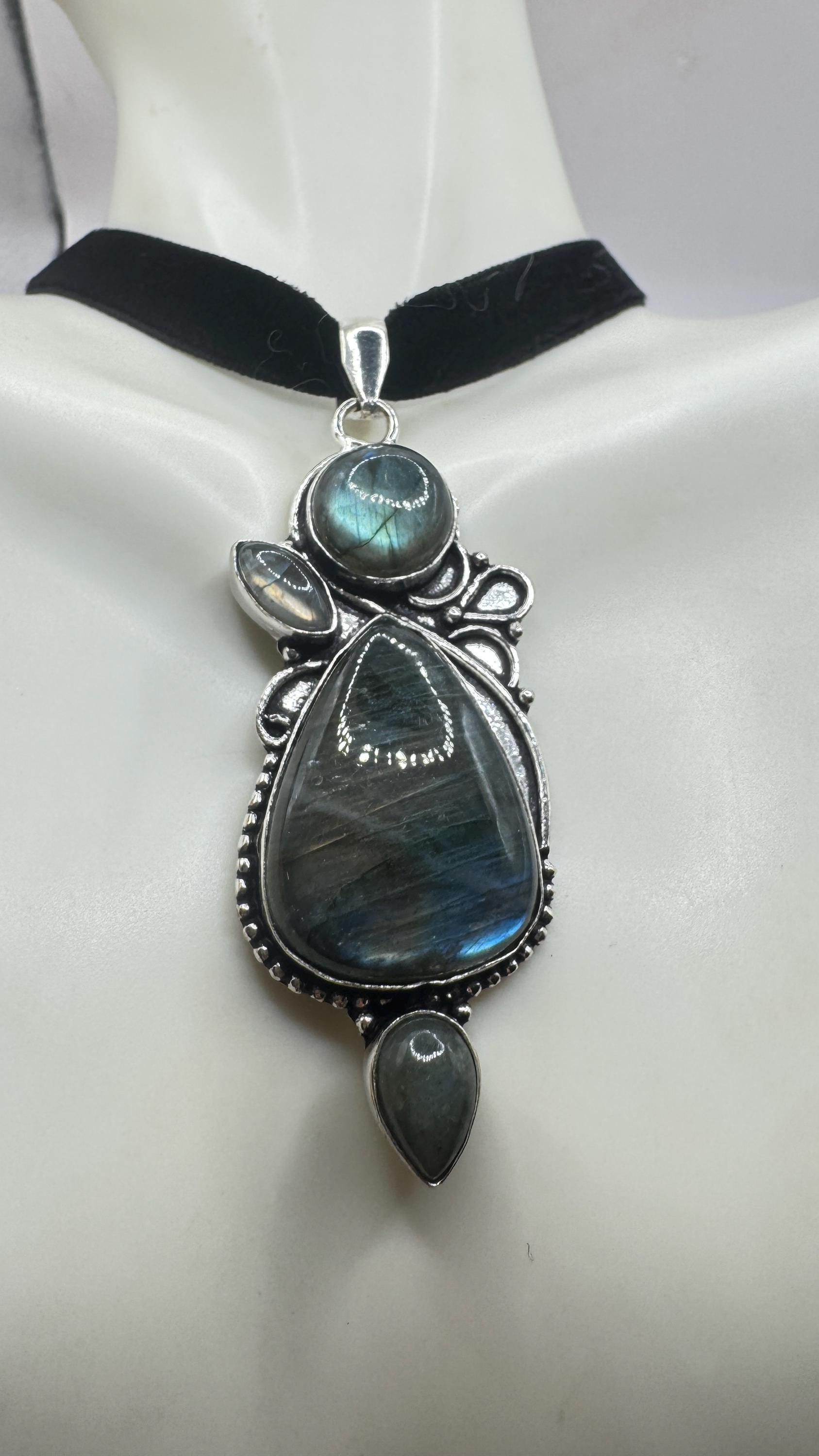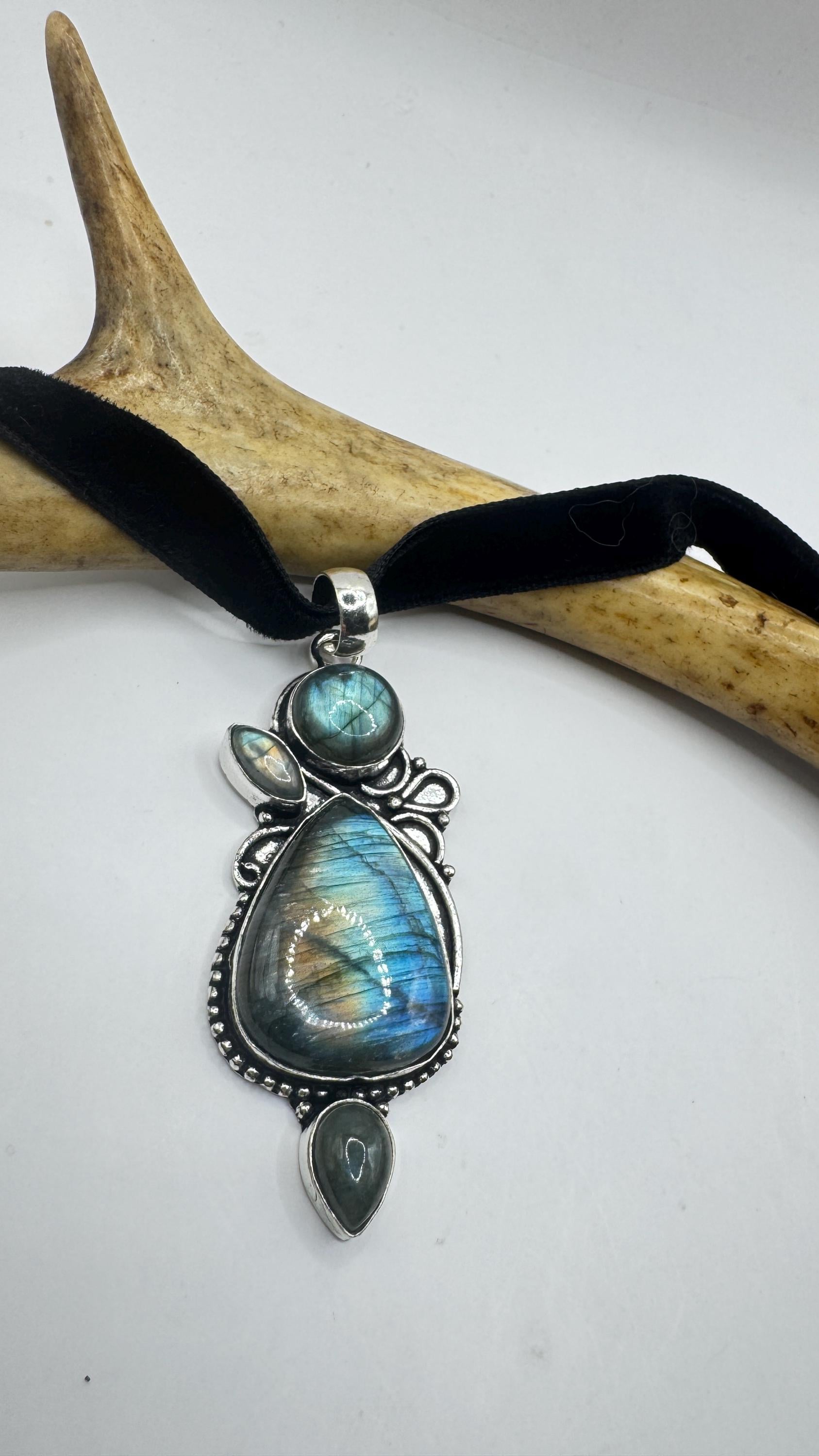 Vintage Green Labradorite Necklace - Bronze and Silver Finish - Velvet Ribbon Choker