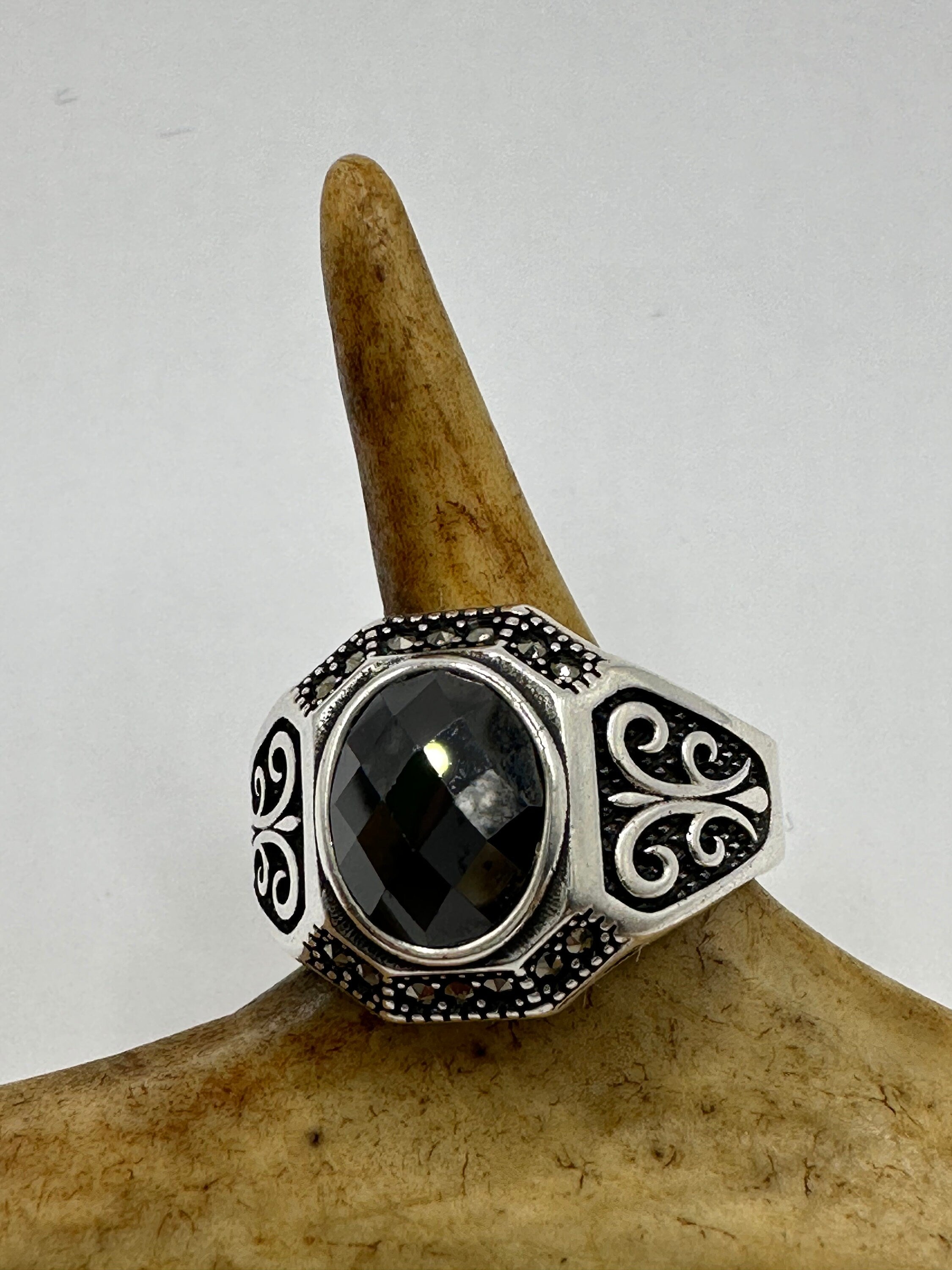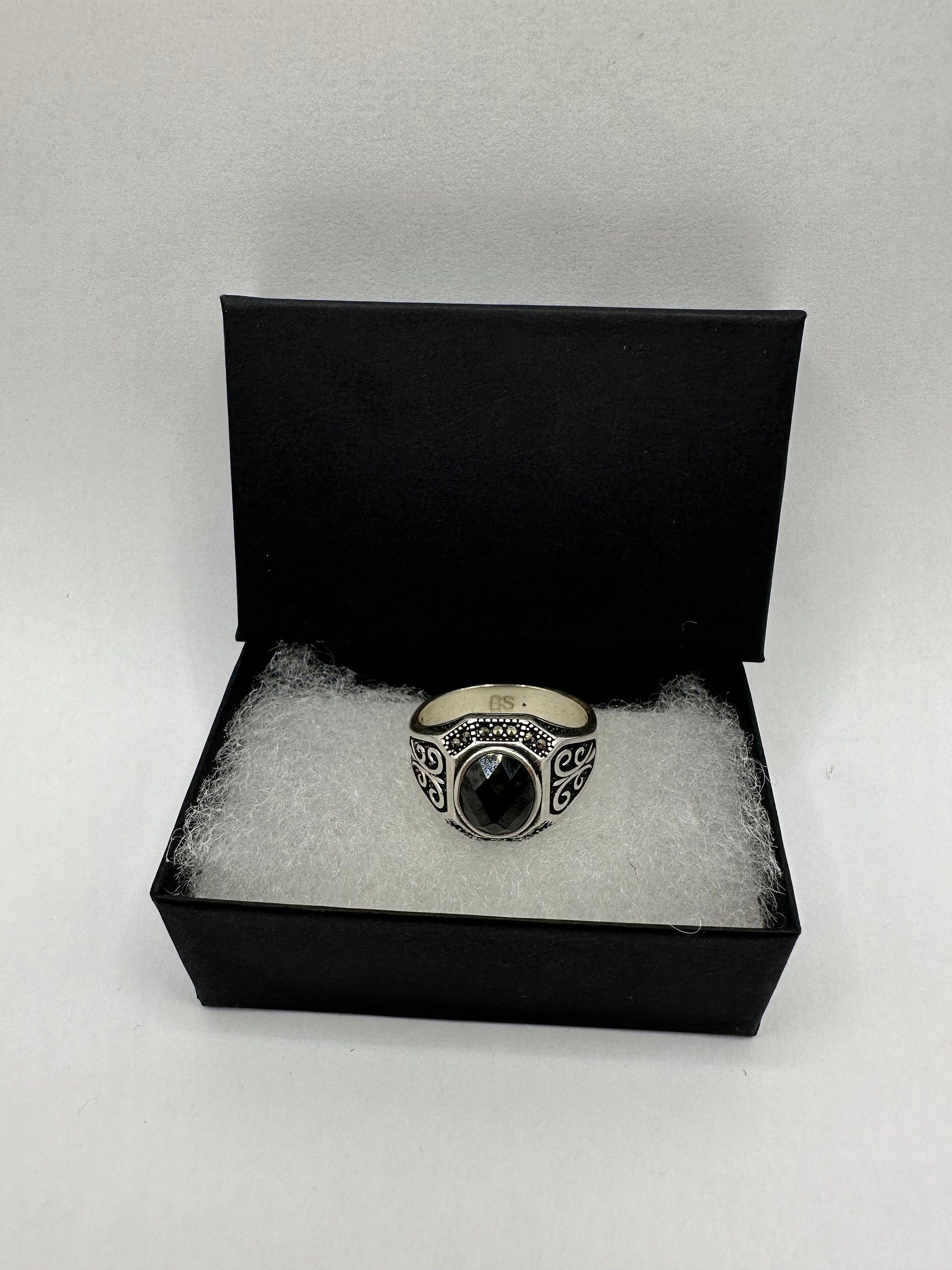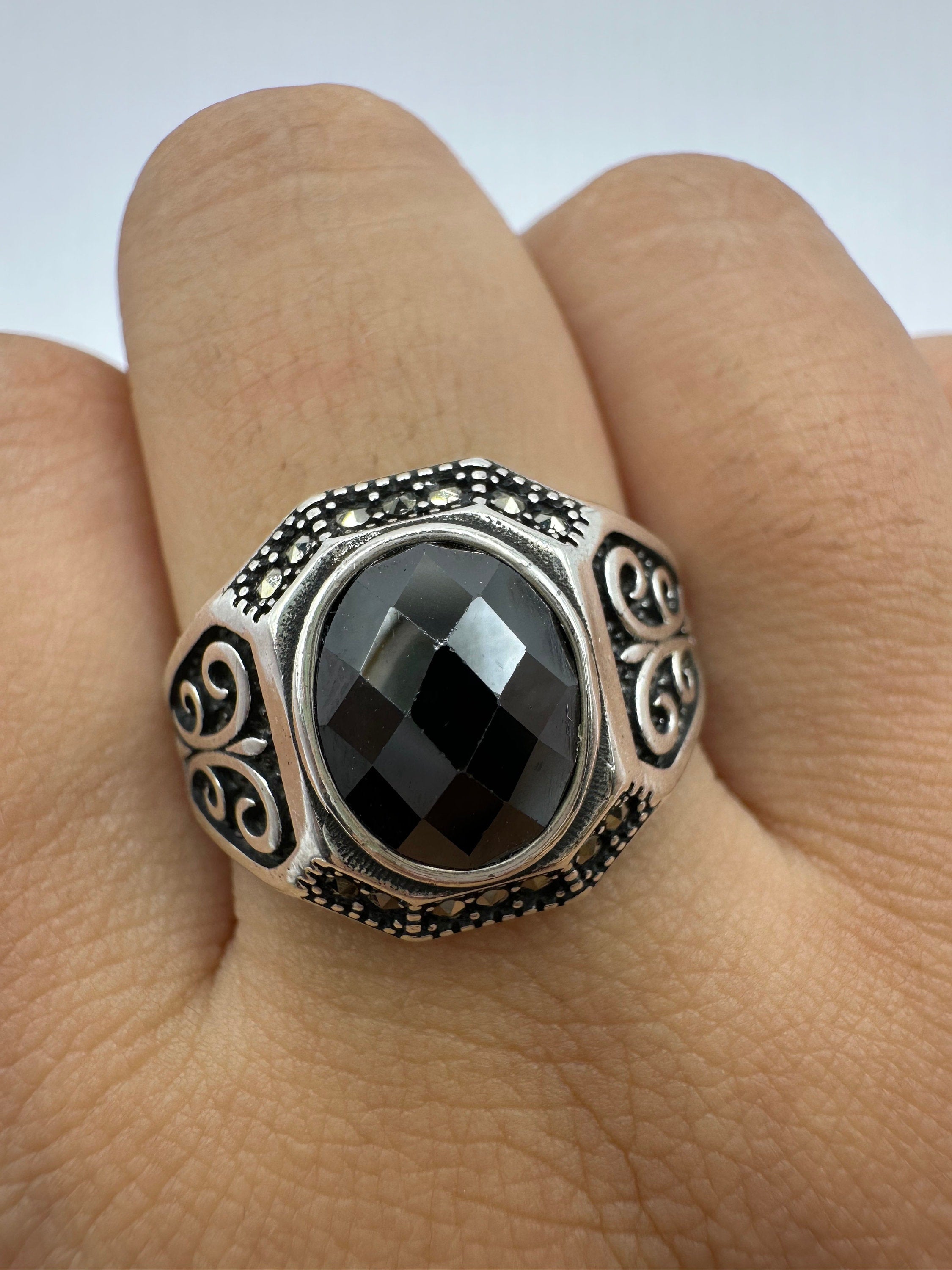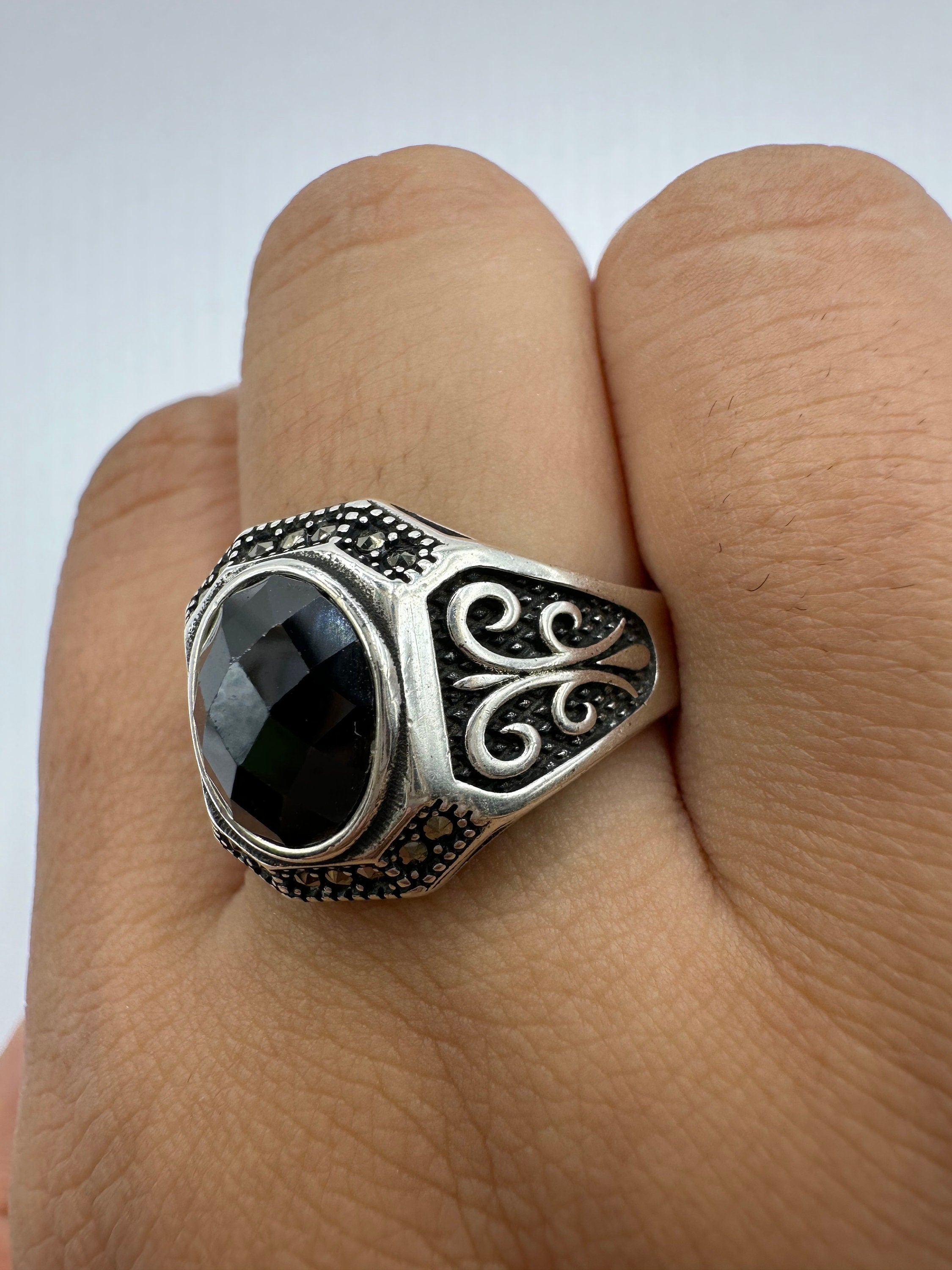 Vintage Hematite Crystal Men's Ring Band 925 Sterling Silver