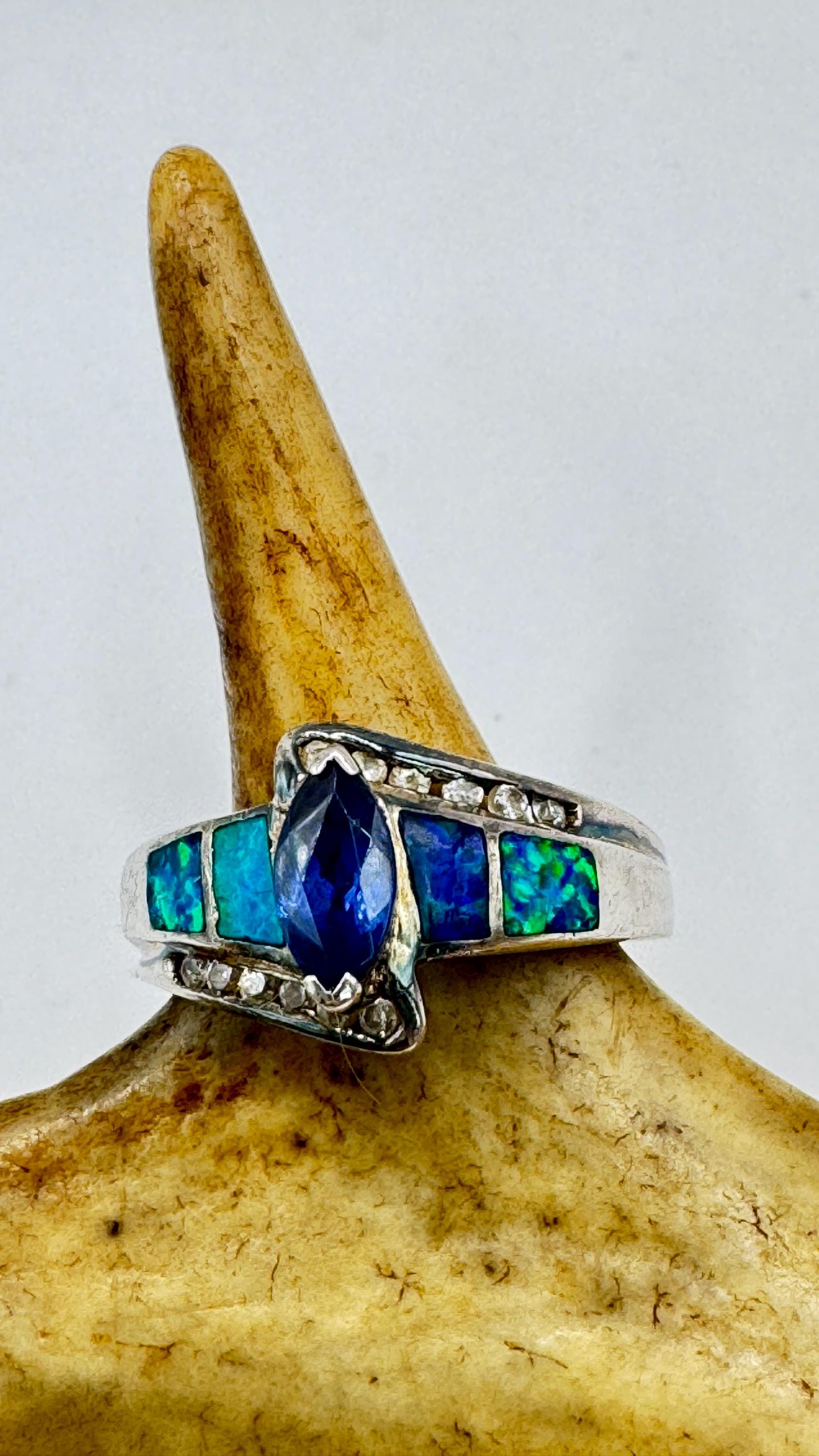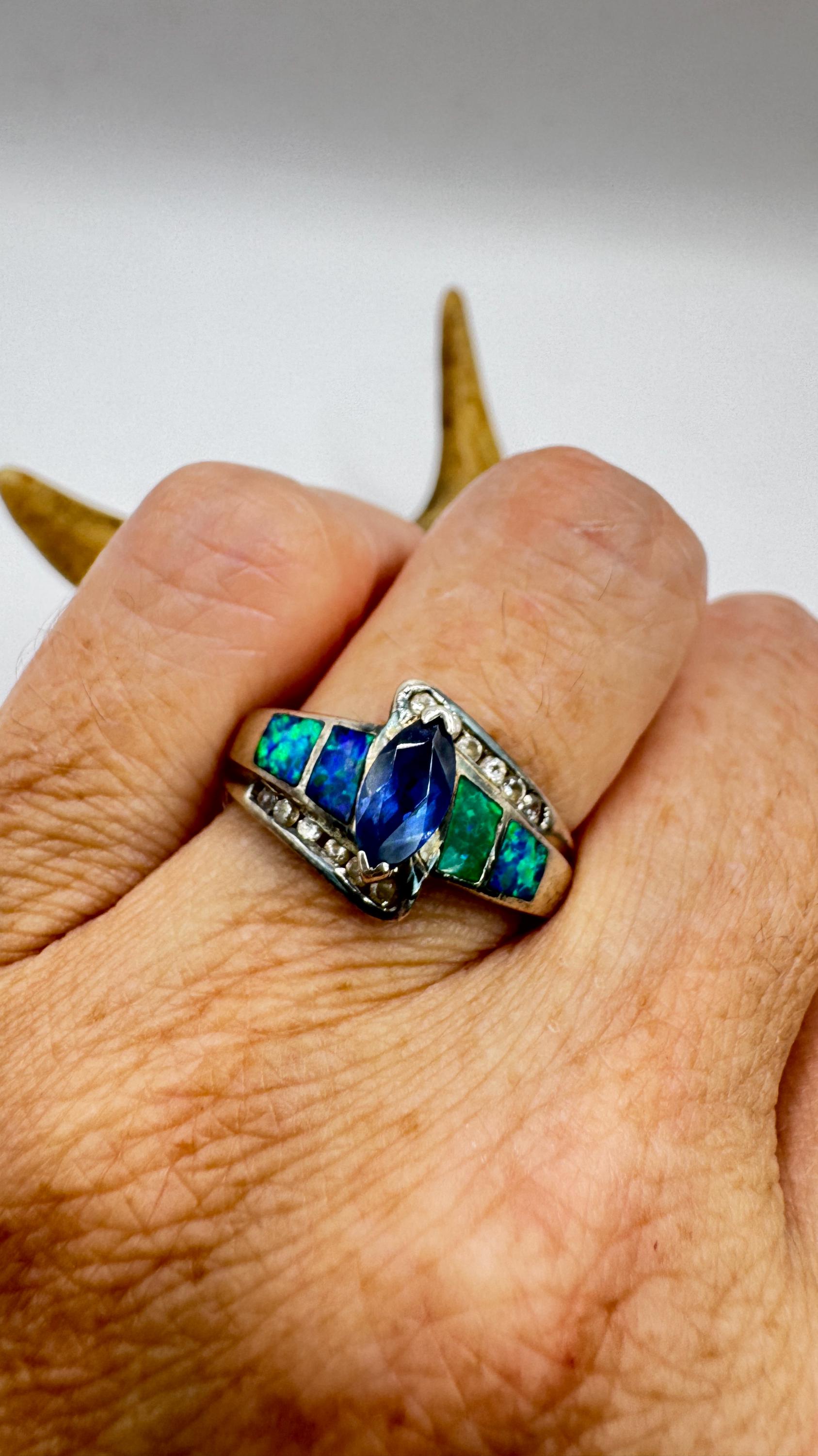 Vintage Opal Ring – Blue Fire Opal Iolite Cocktail Ring | Sterling Silver Band
