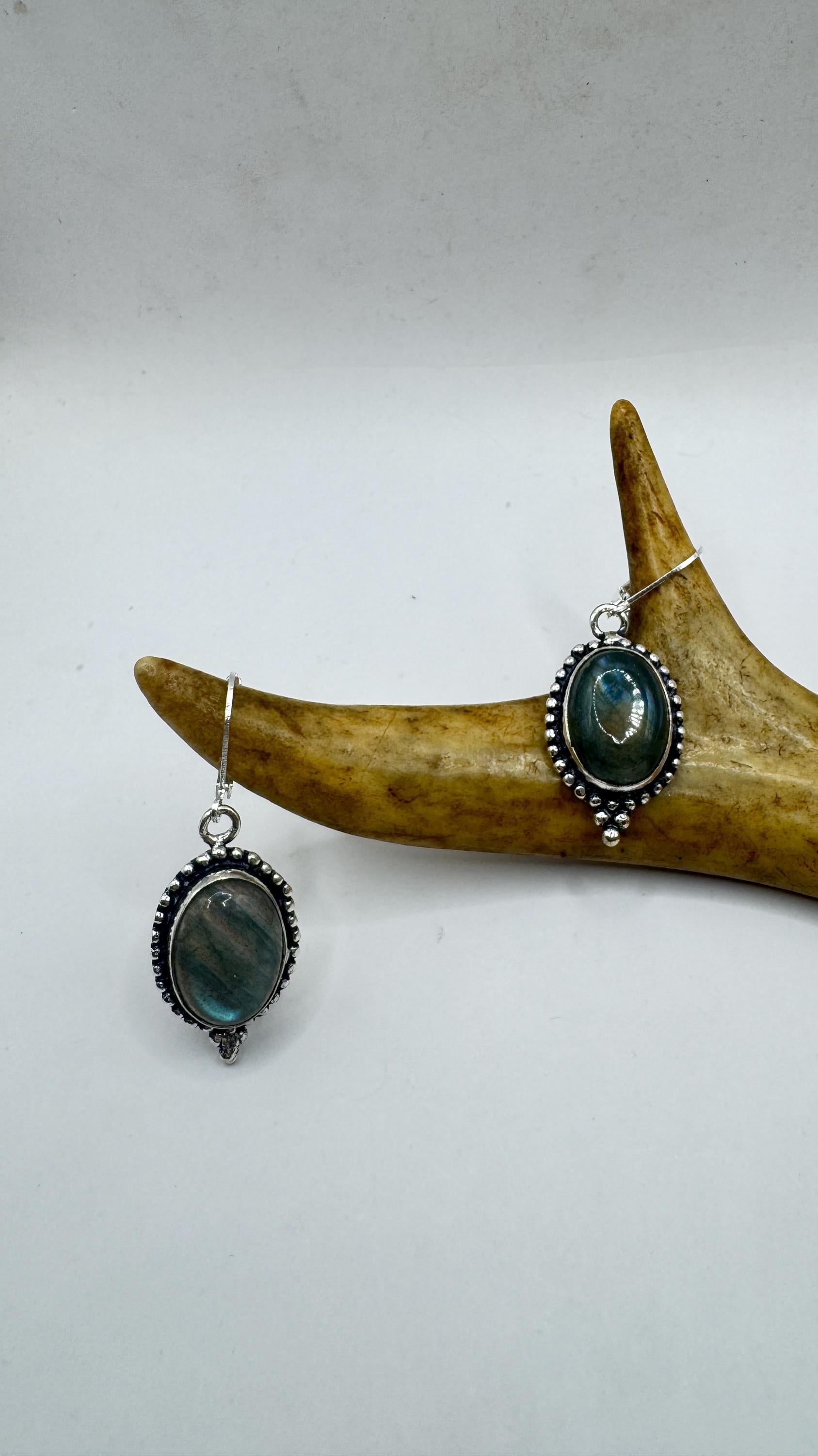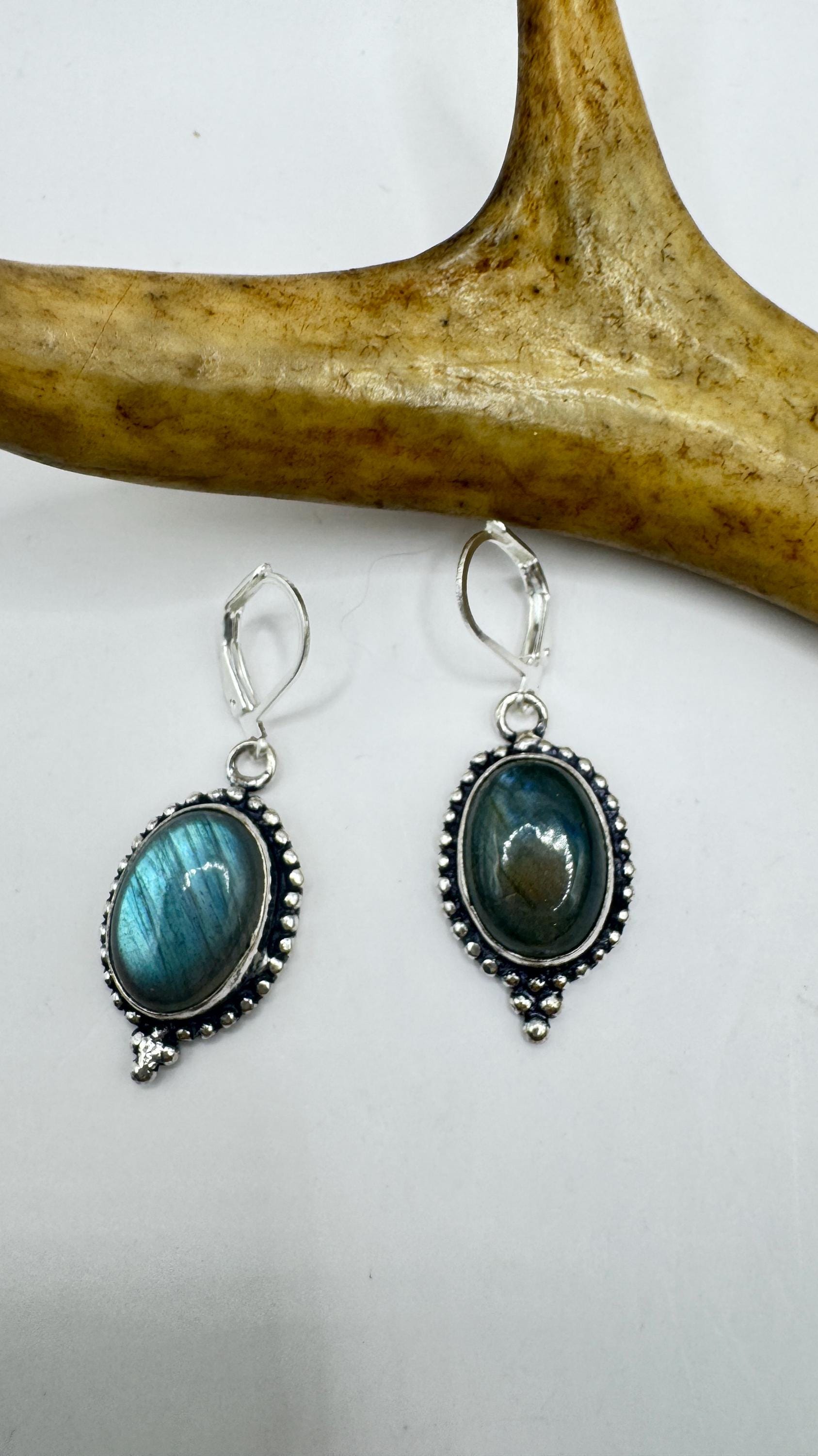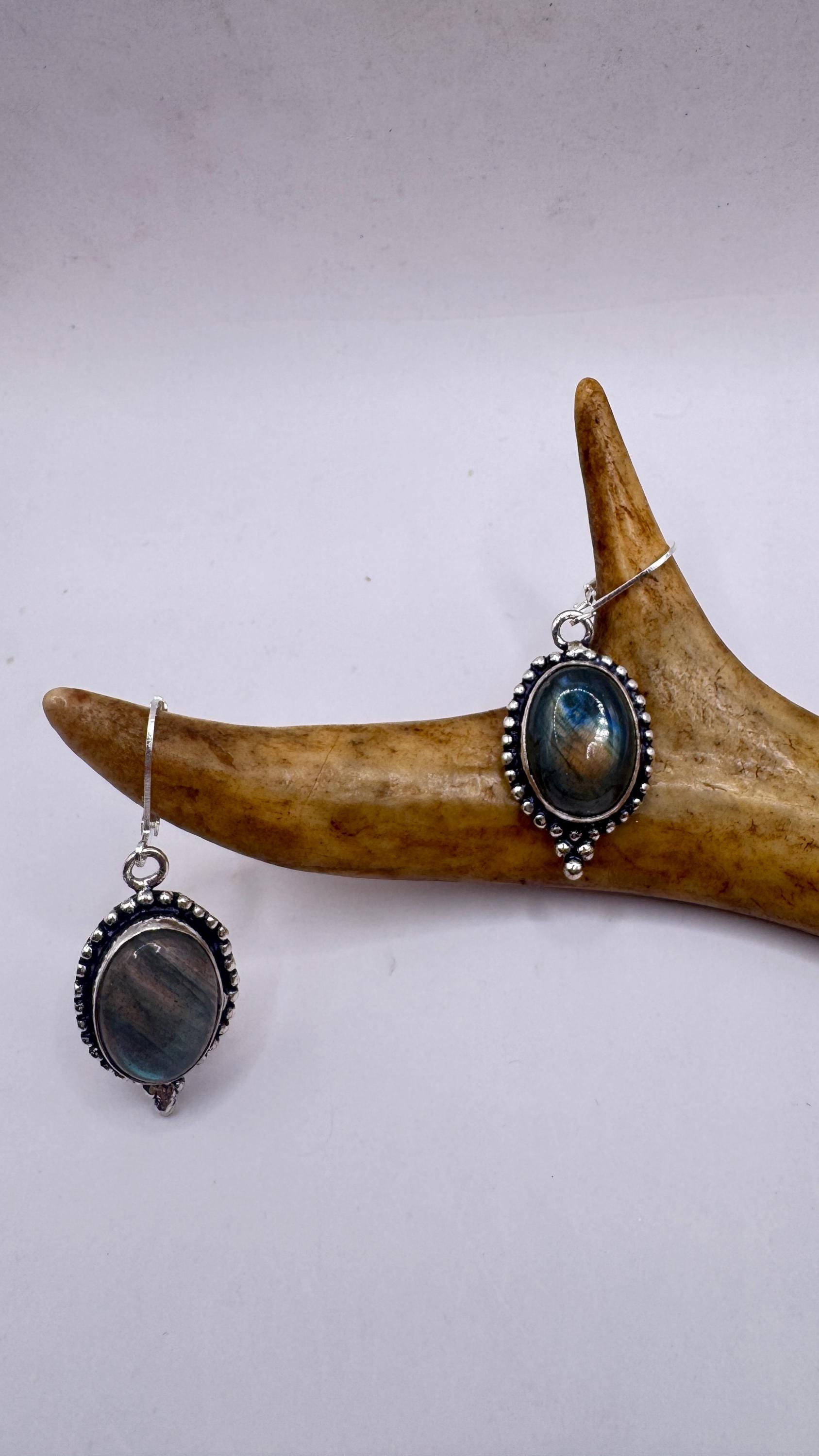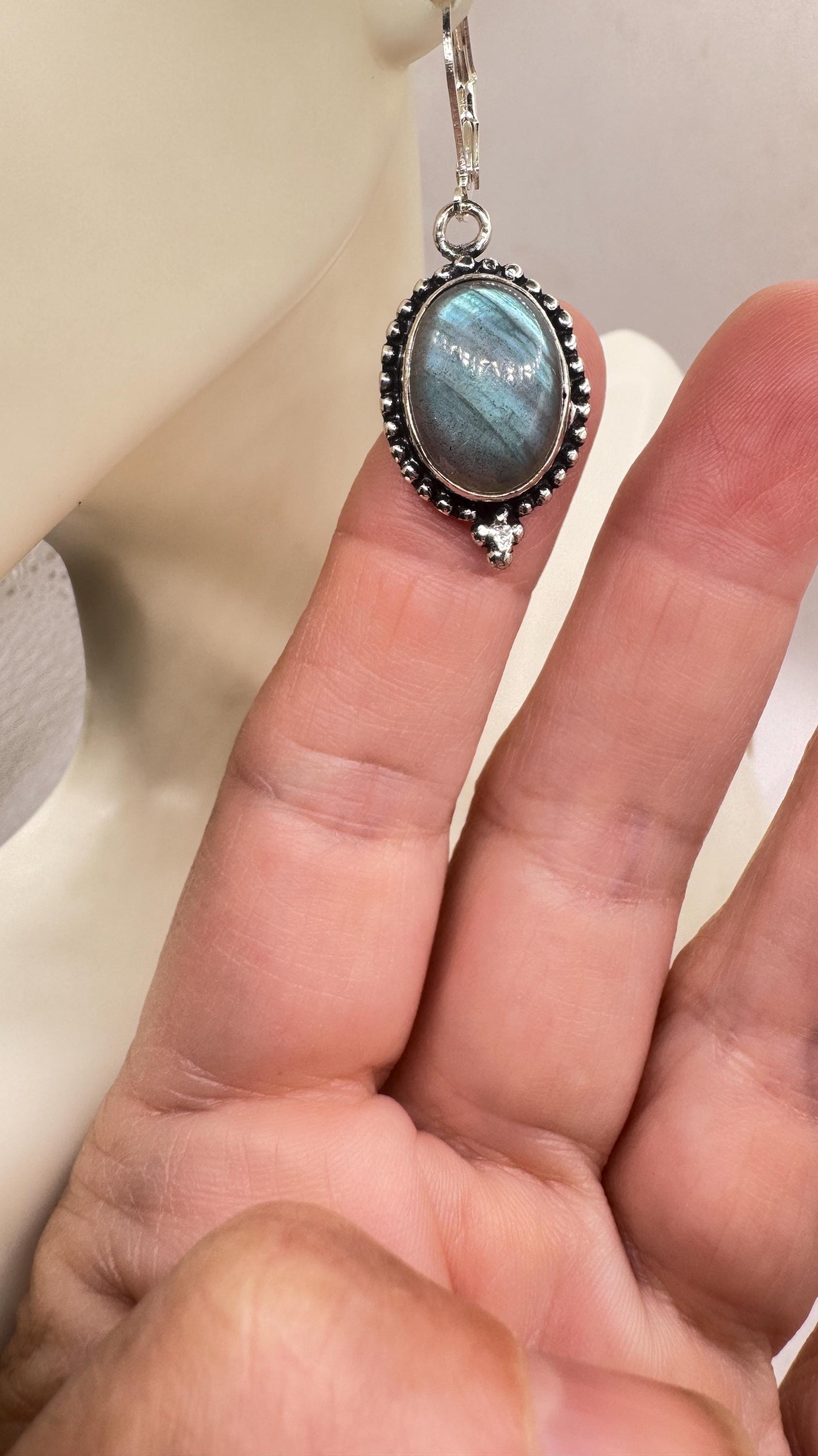 Our Vintage Pendant dangle earrings features labradorite large gemstones pendants framed with a silver bronze setting and an elegant style... Read more