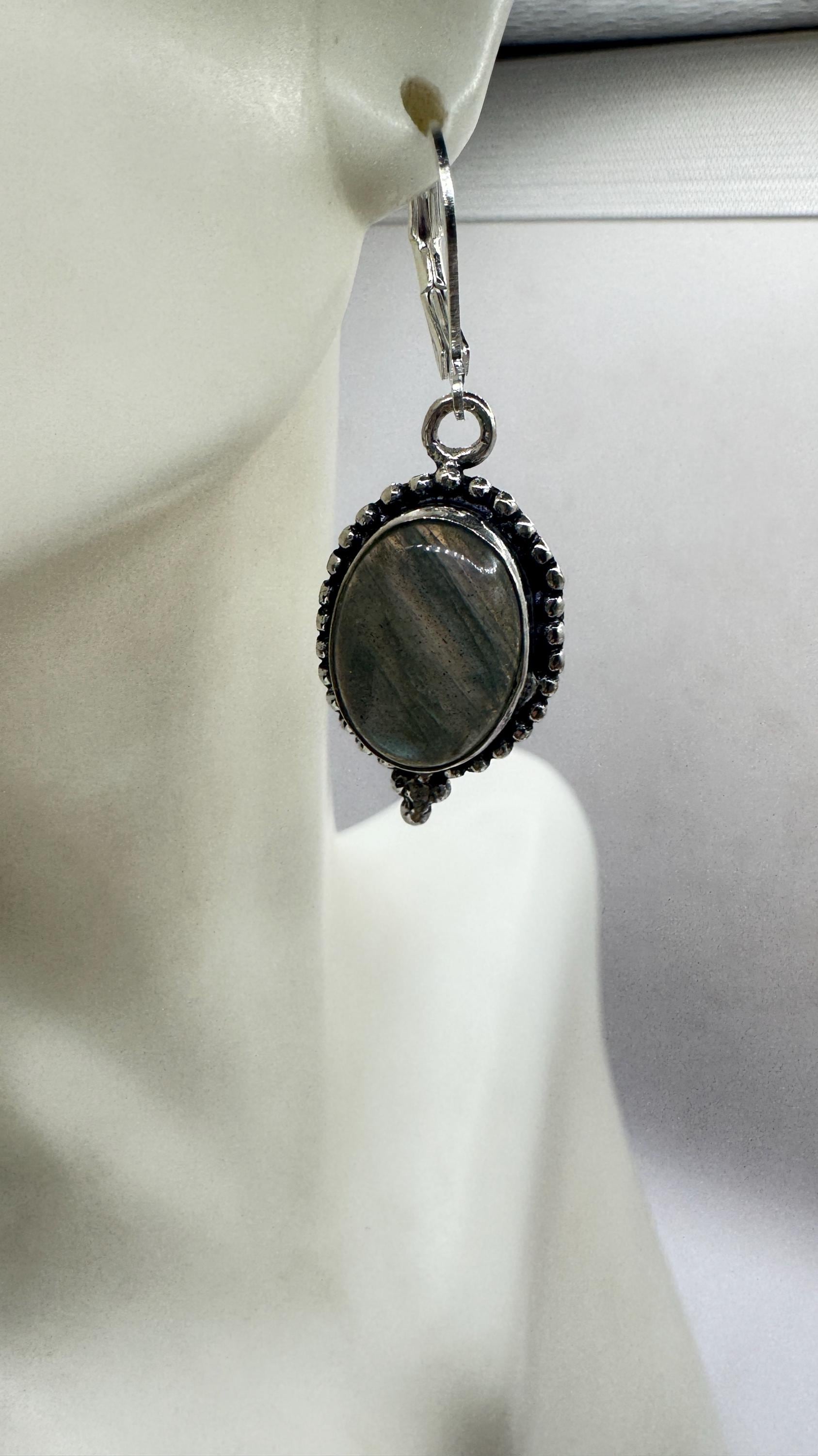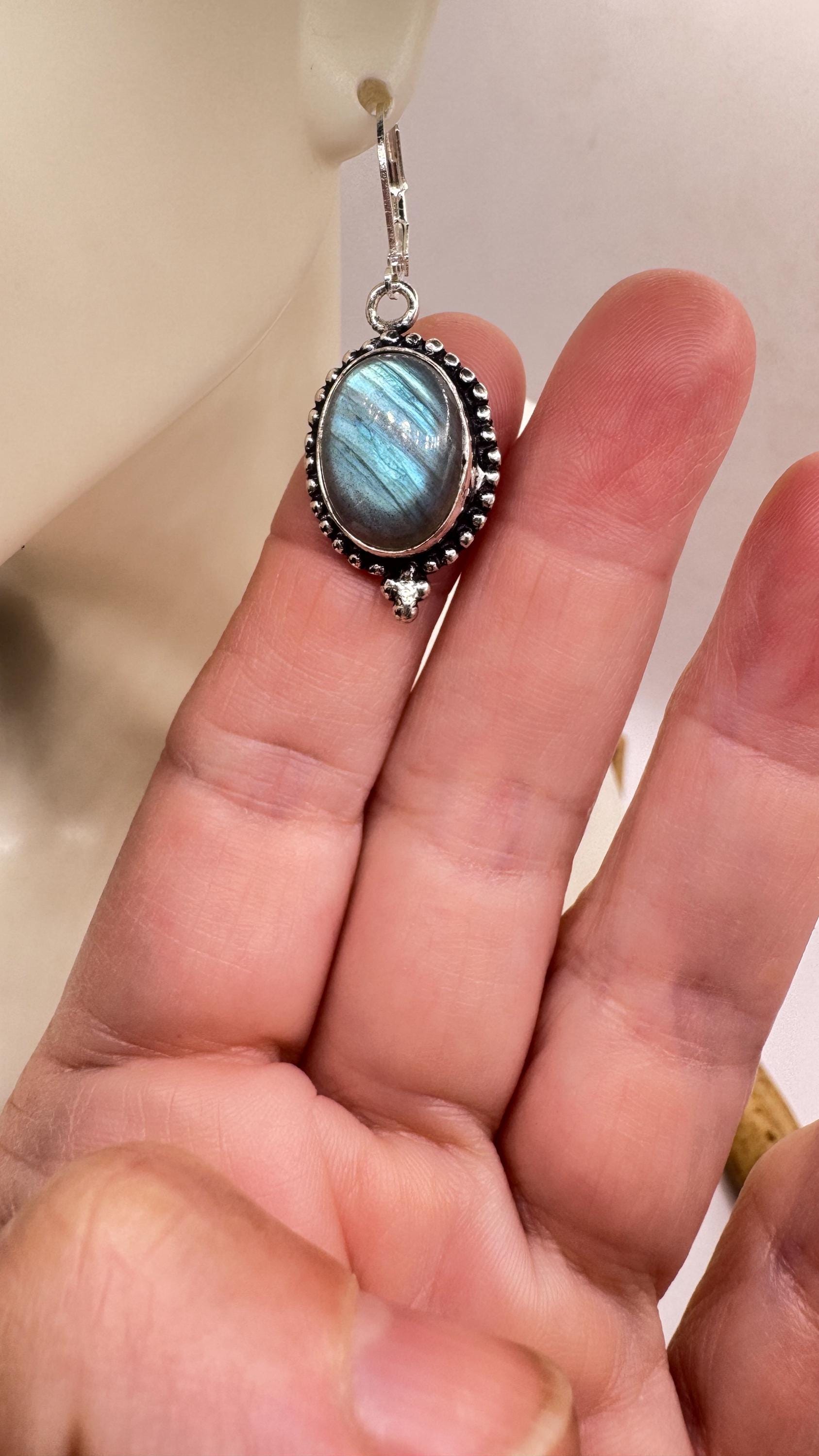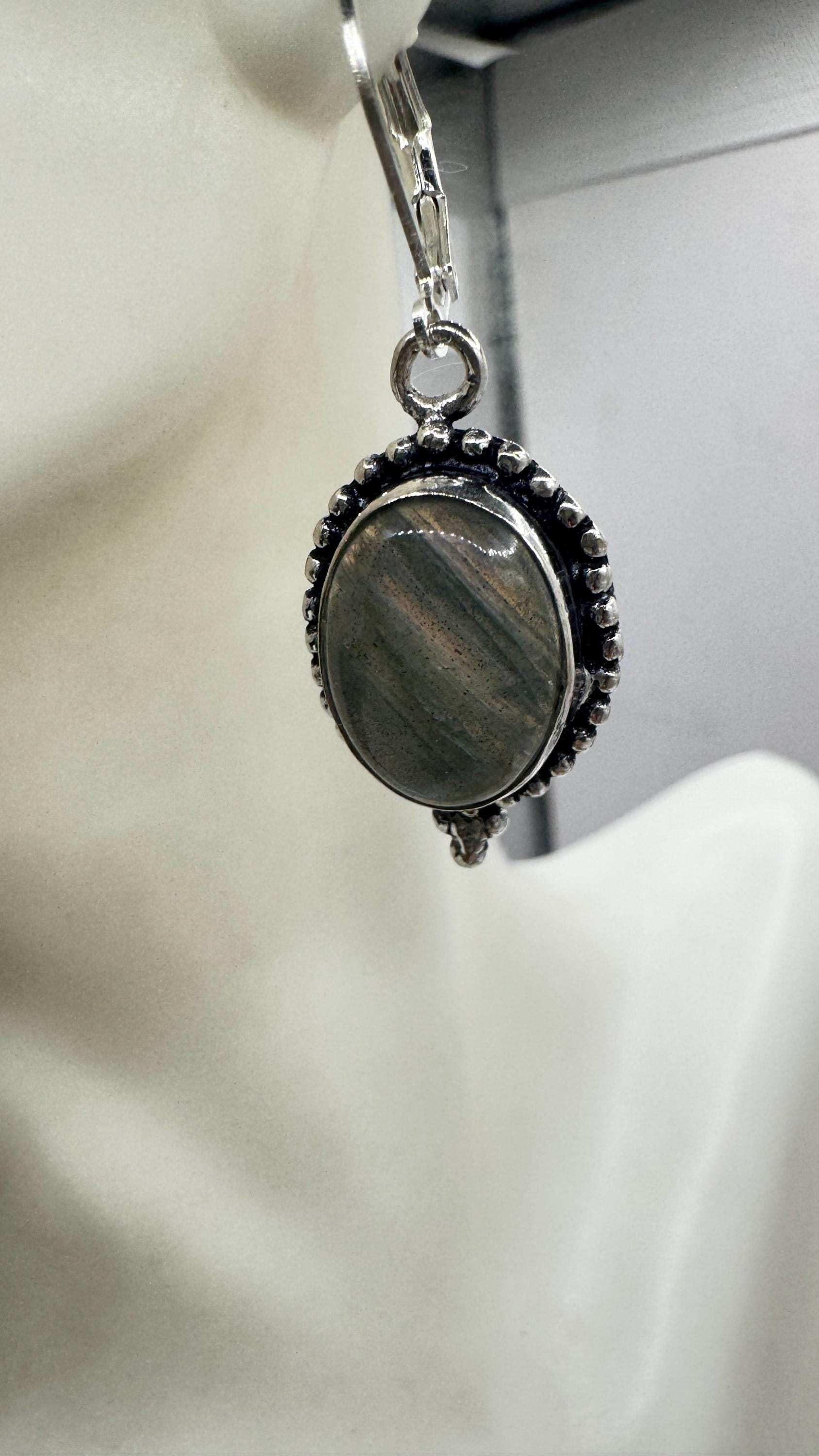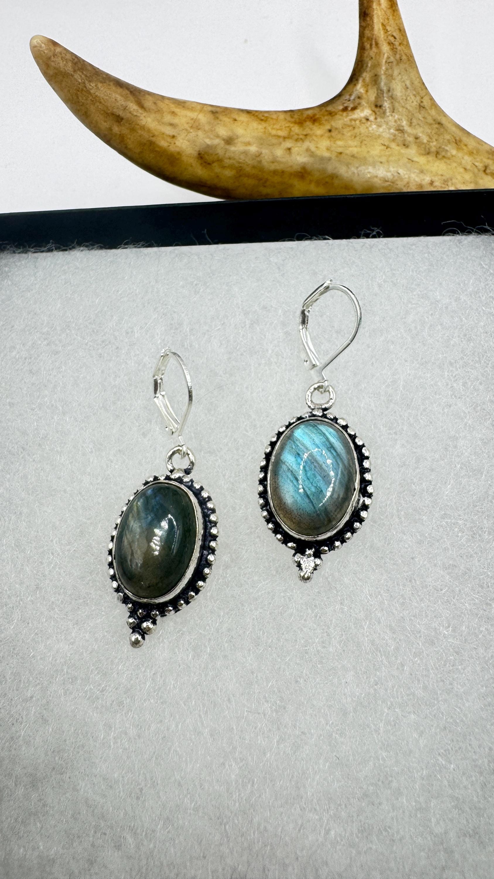 Our Vintage Pendant dangle earrings features labradorite large gemstones pendants framed with a silver bronze setting and an elegant style... Read more