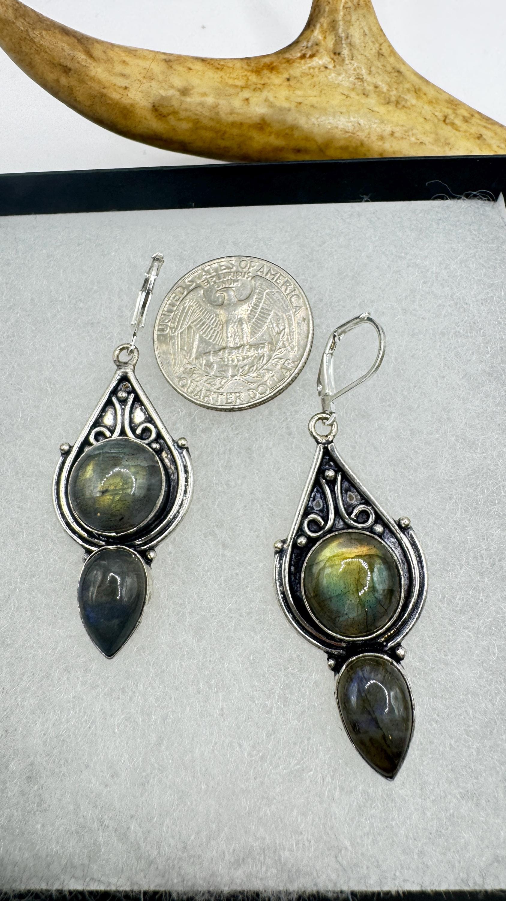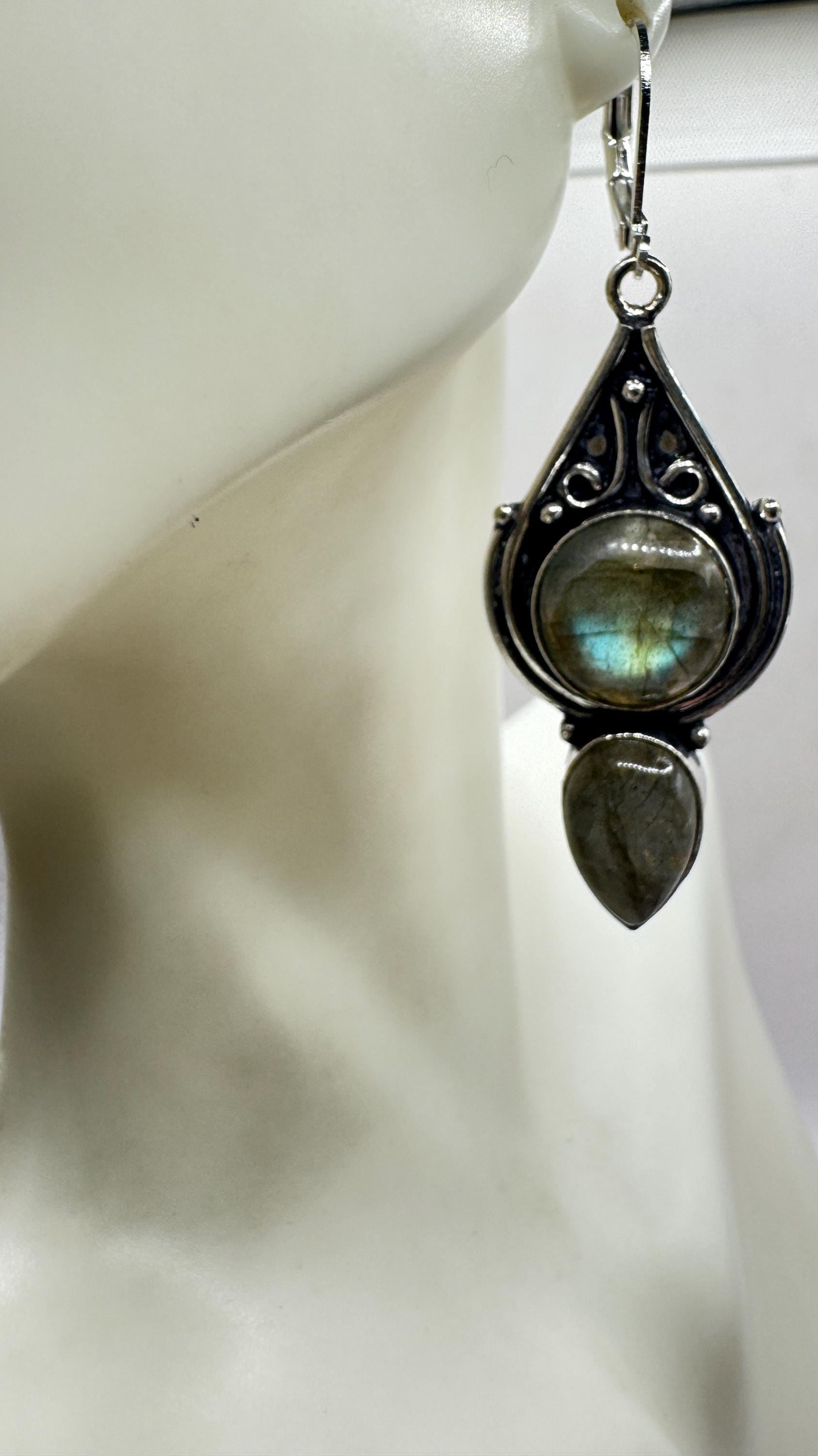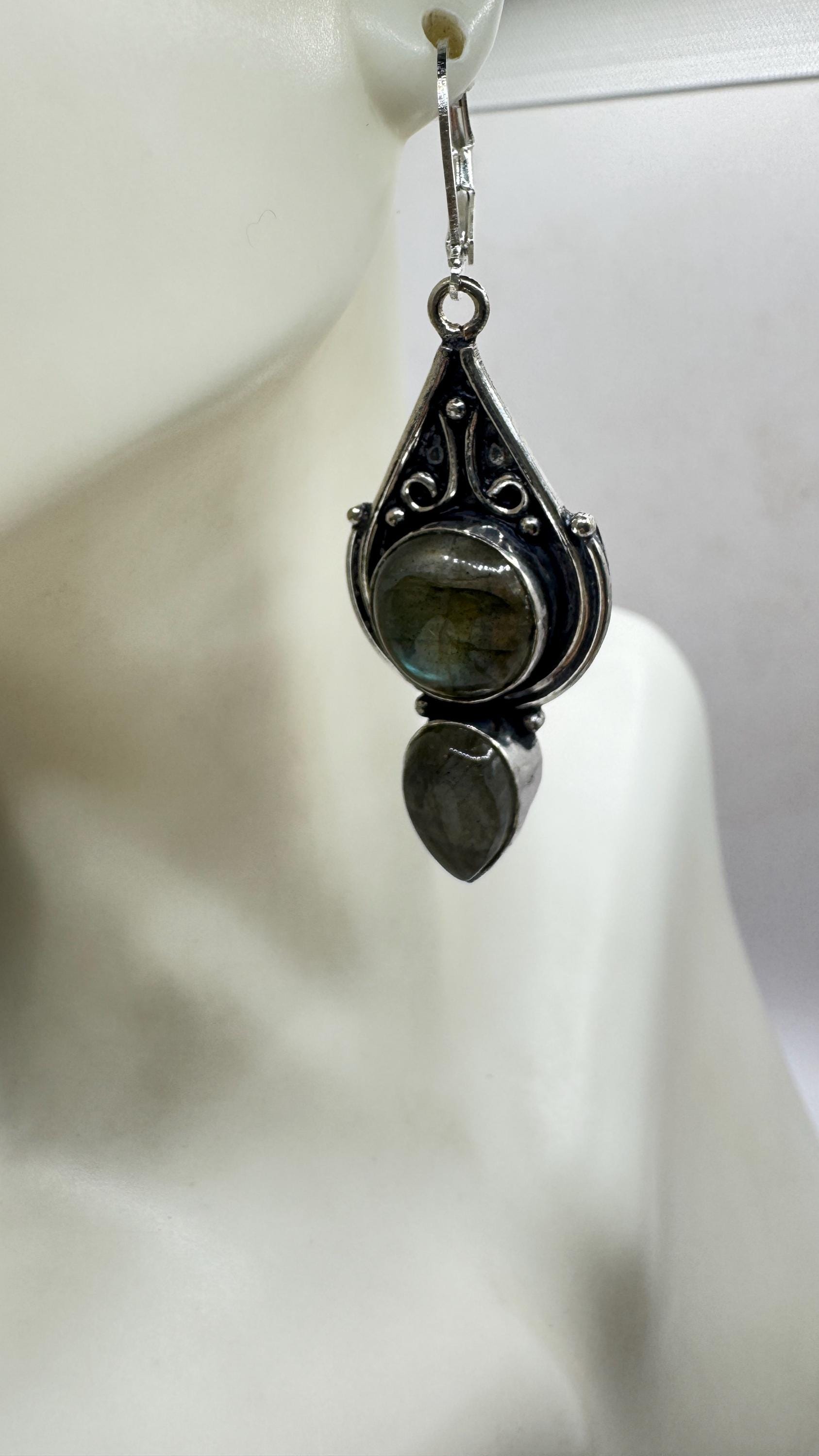 Vintage Labradorite Dangle Earrings Sterling Silver Leverbacks