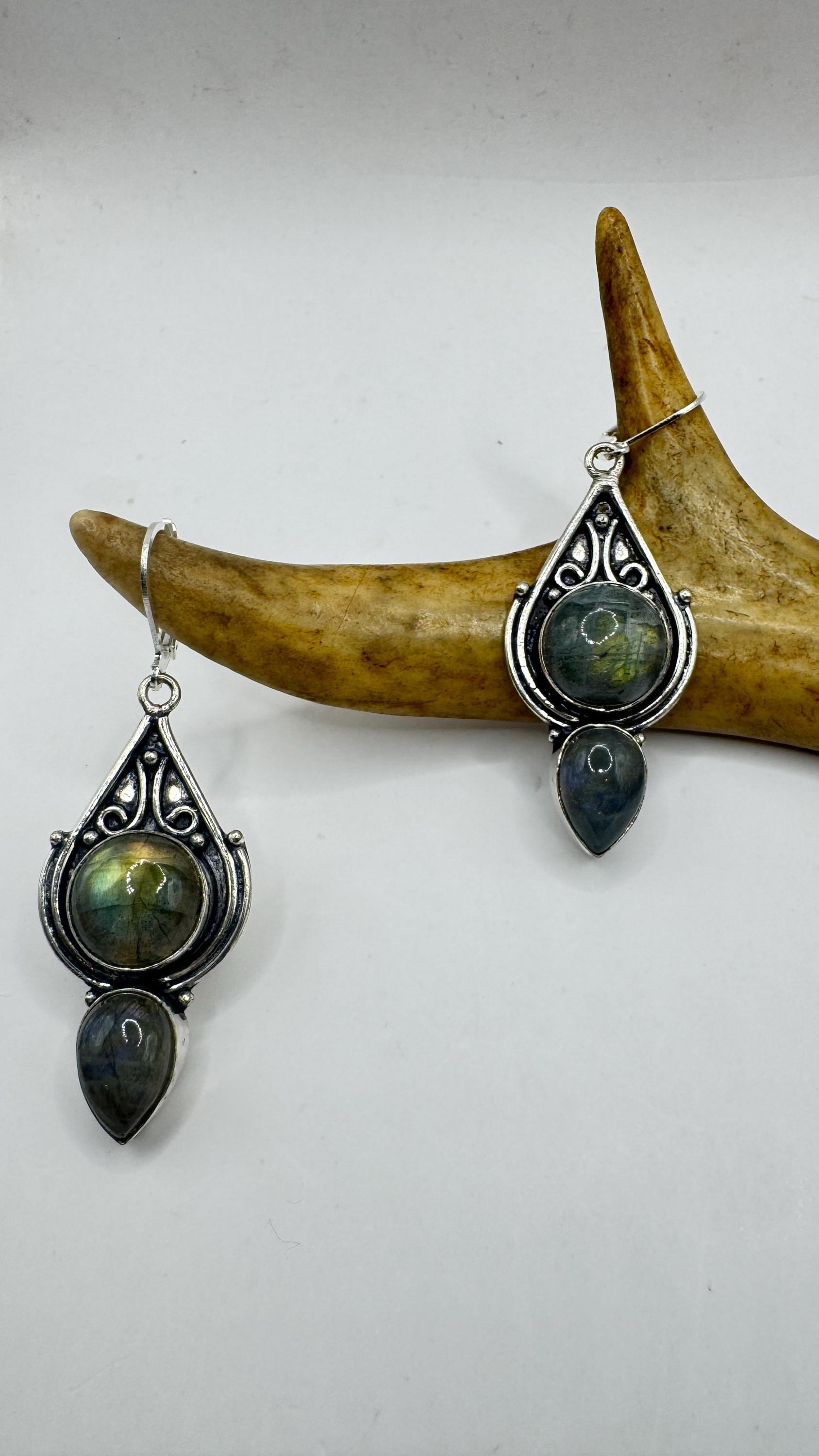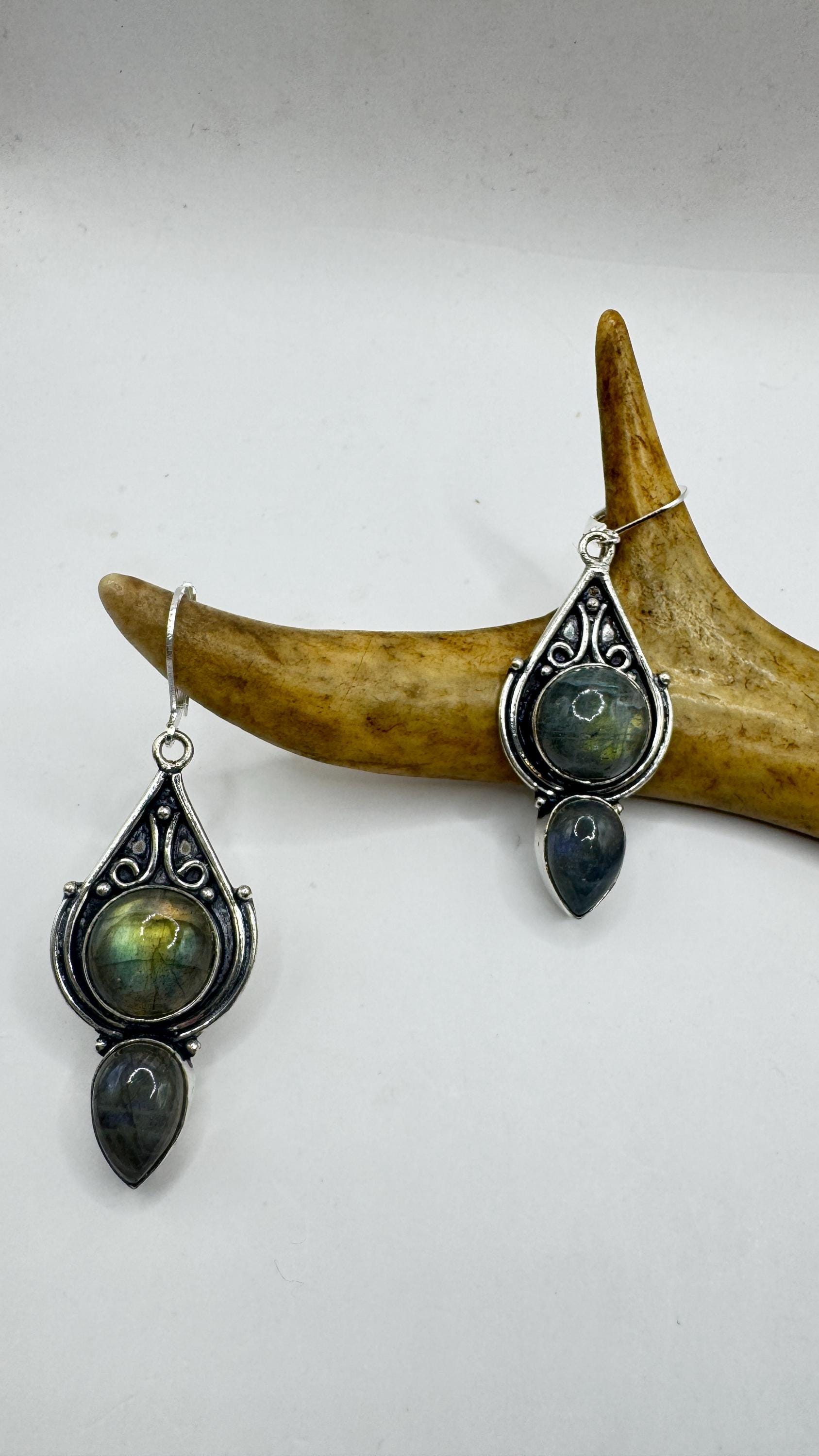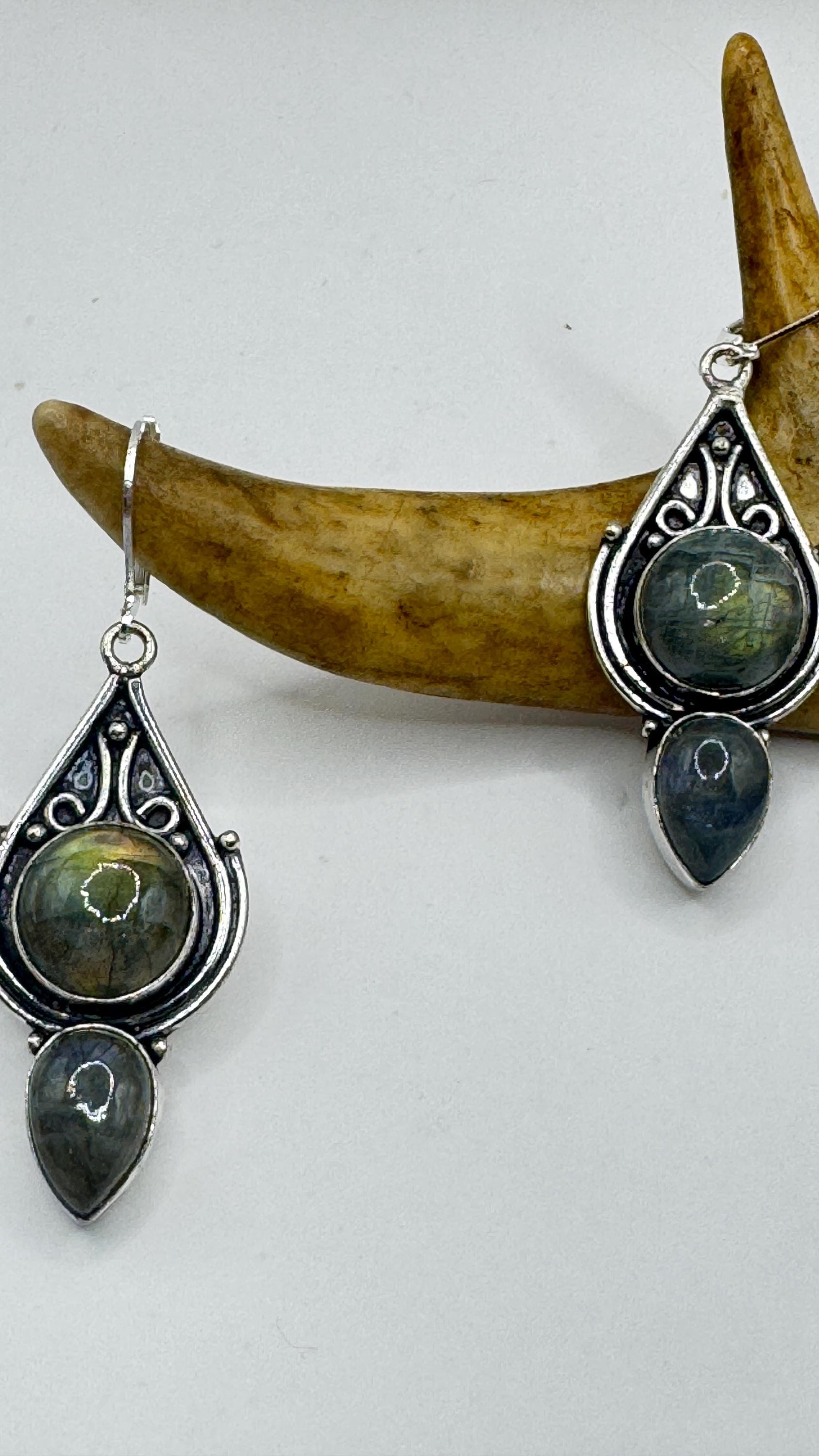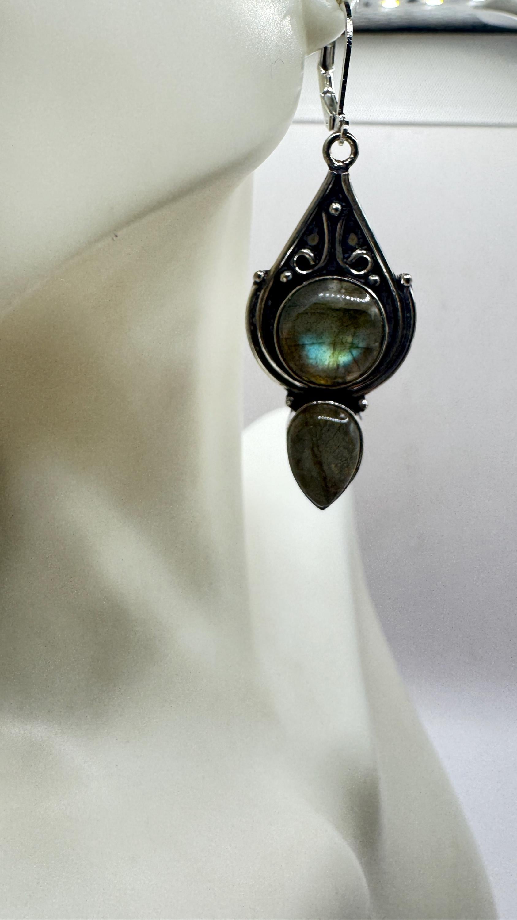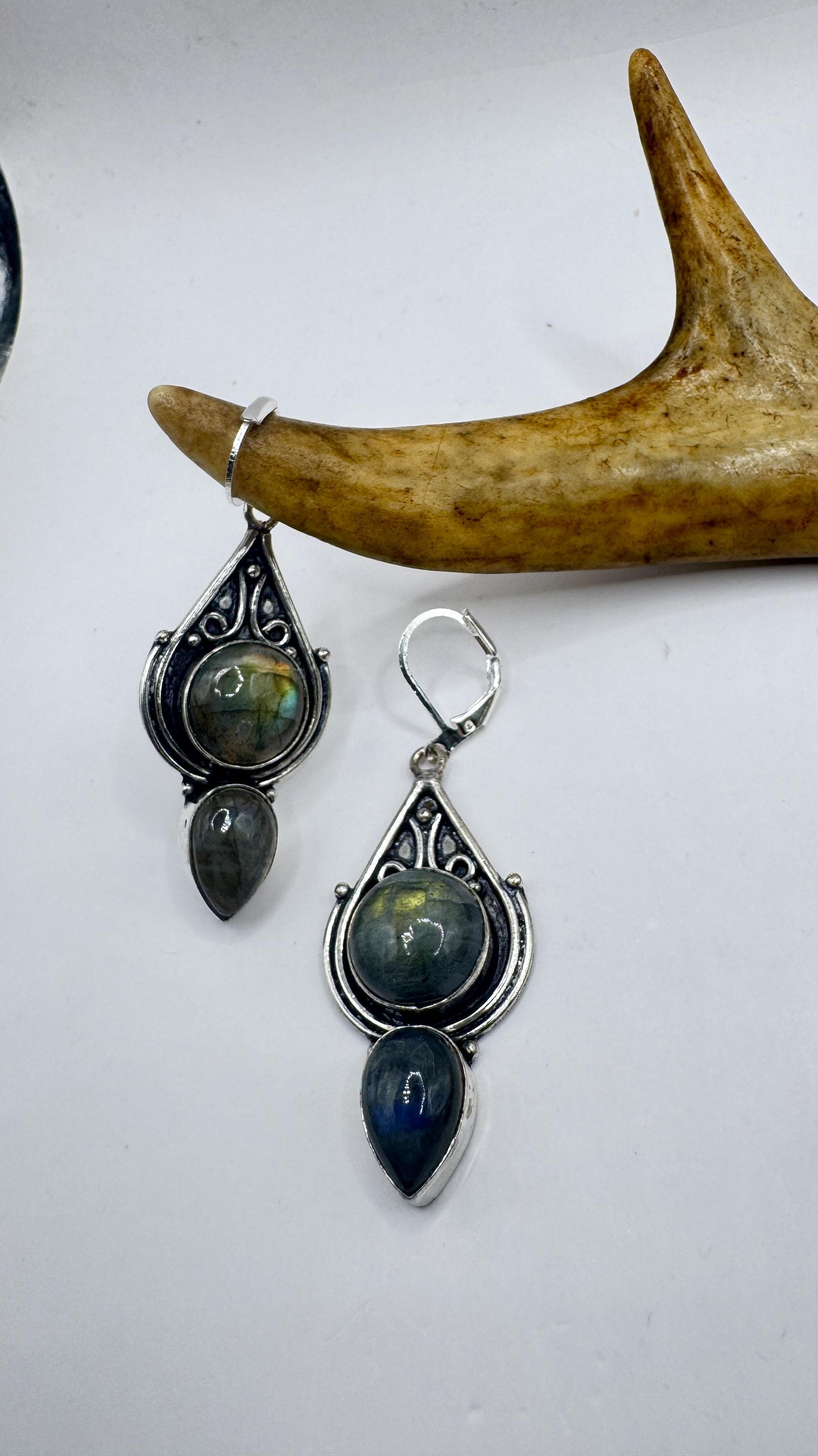 Our Vintage Pendant dangle earrings features labradorite large gemstones pendants framed with a silver bronze setting and an elegant style... Read more