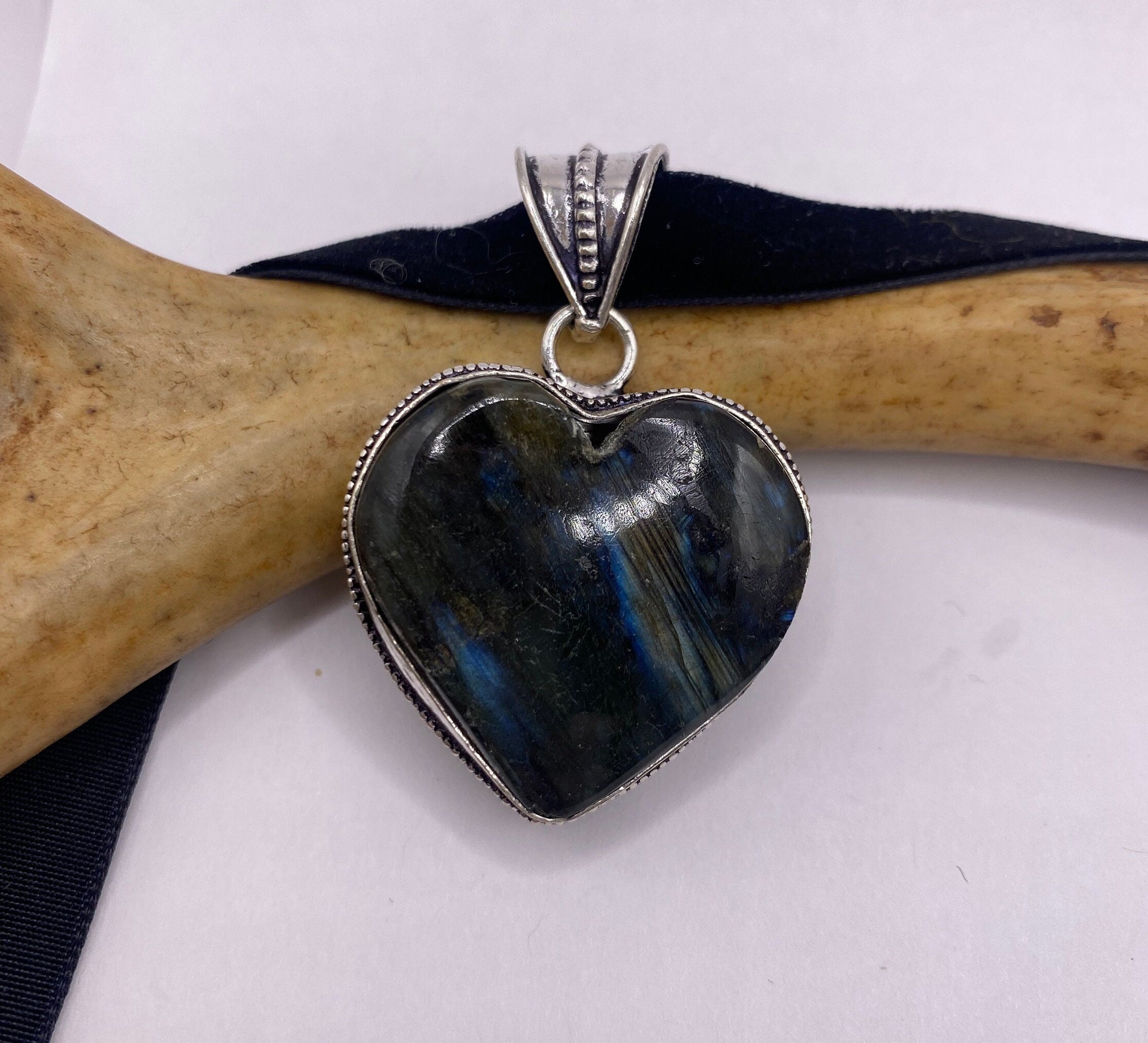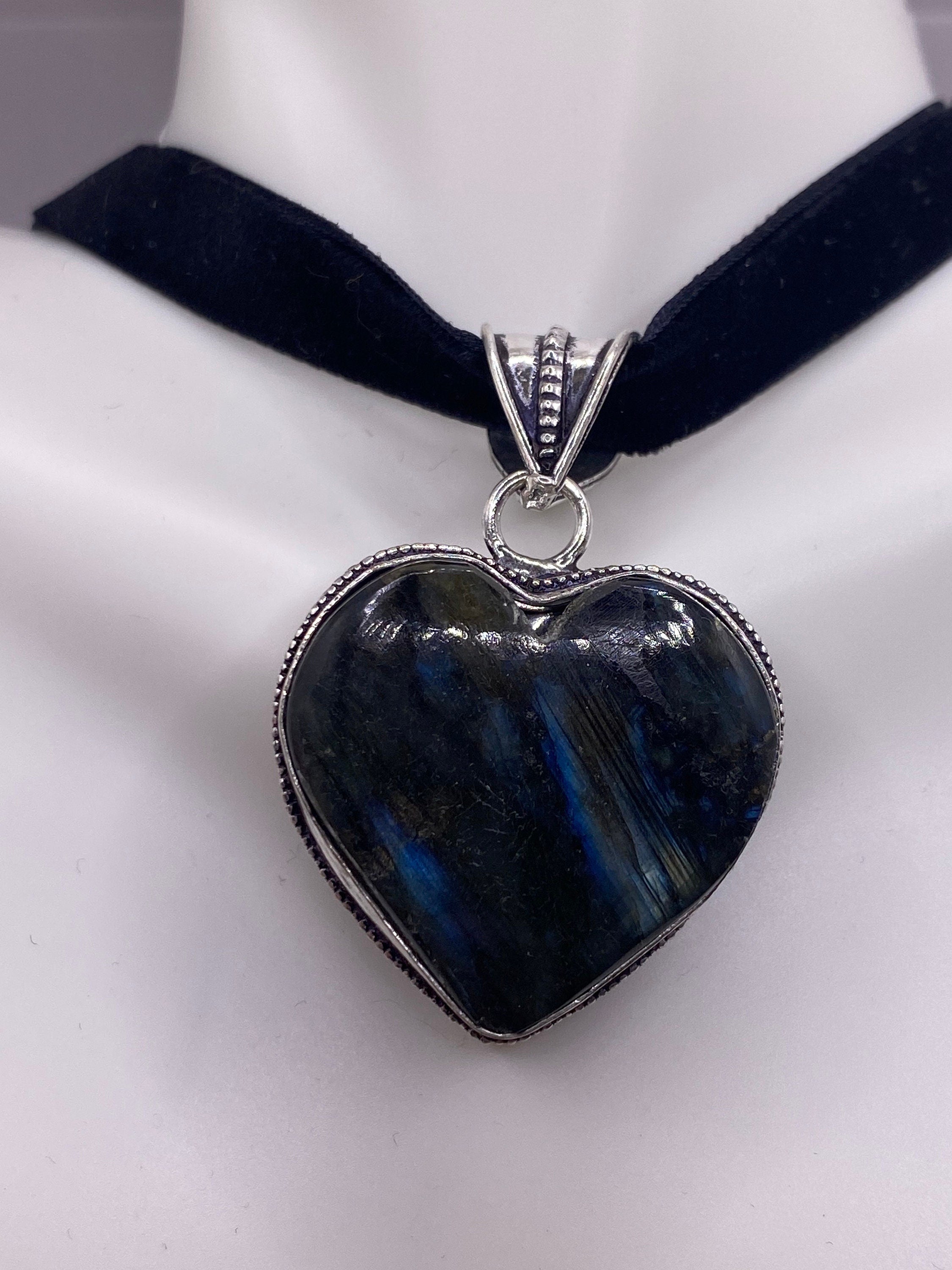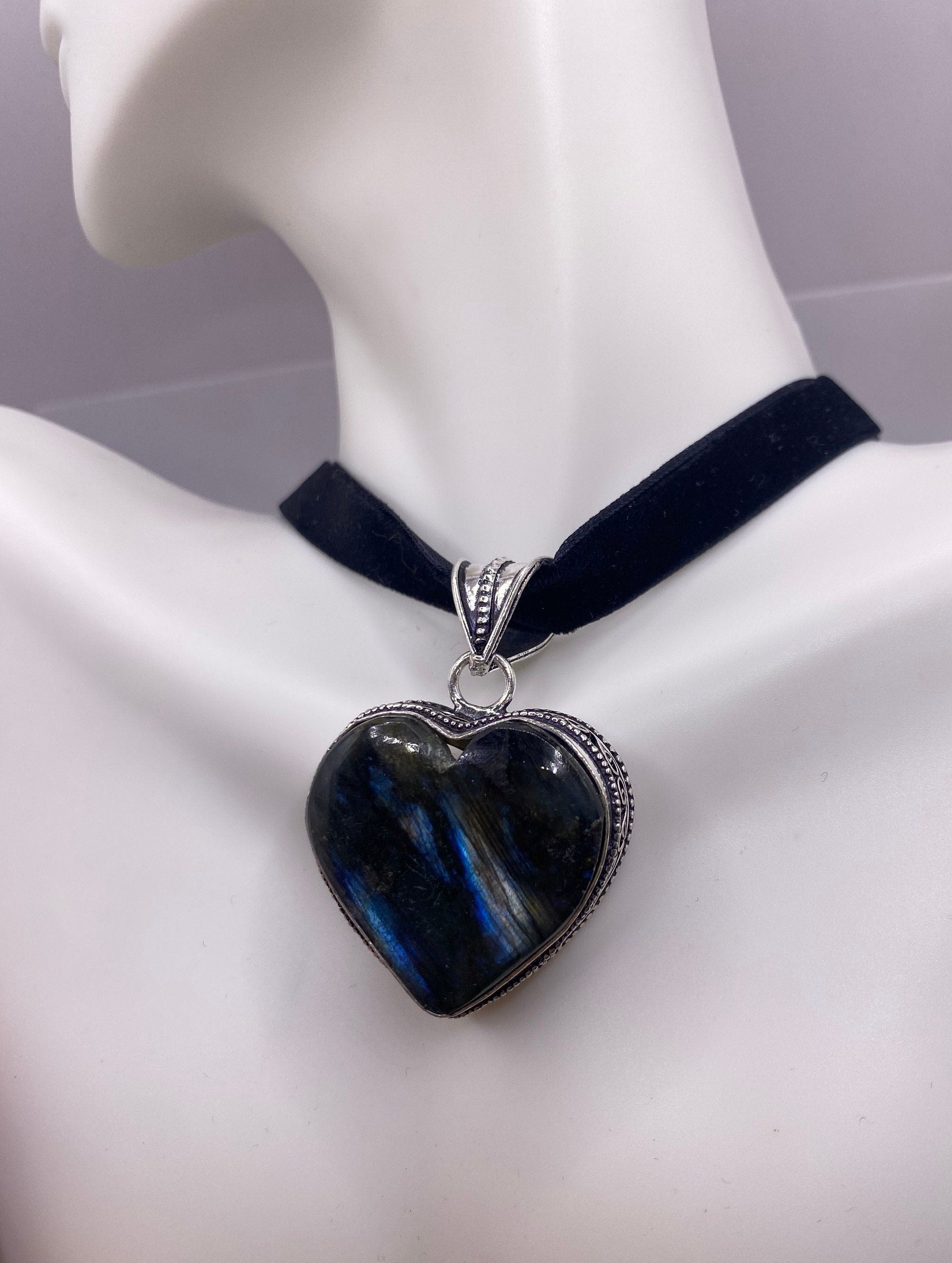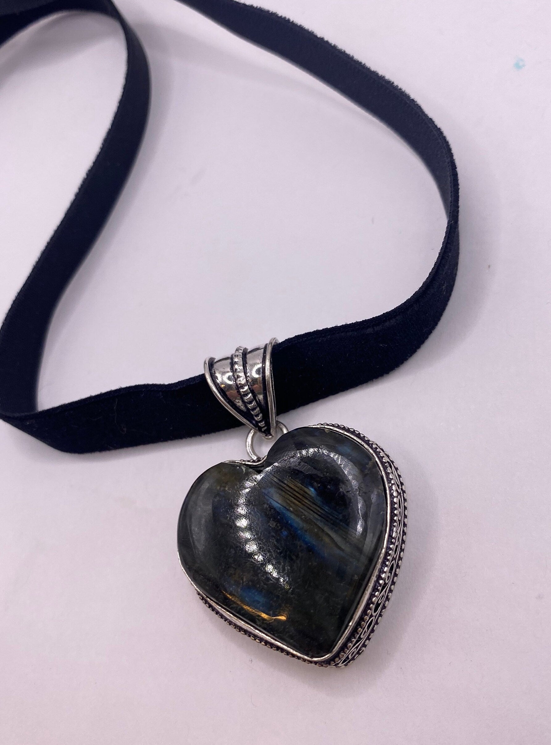 Vintage Labradorite Heart Boho Black Velvet Choker Silver Necklace