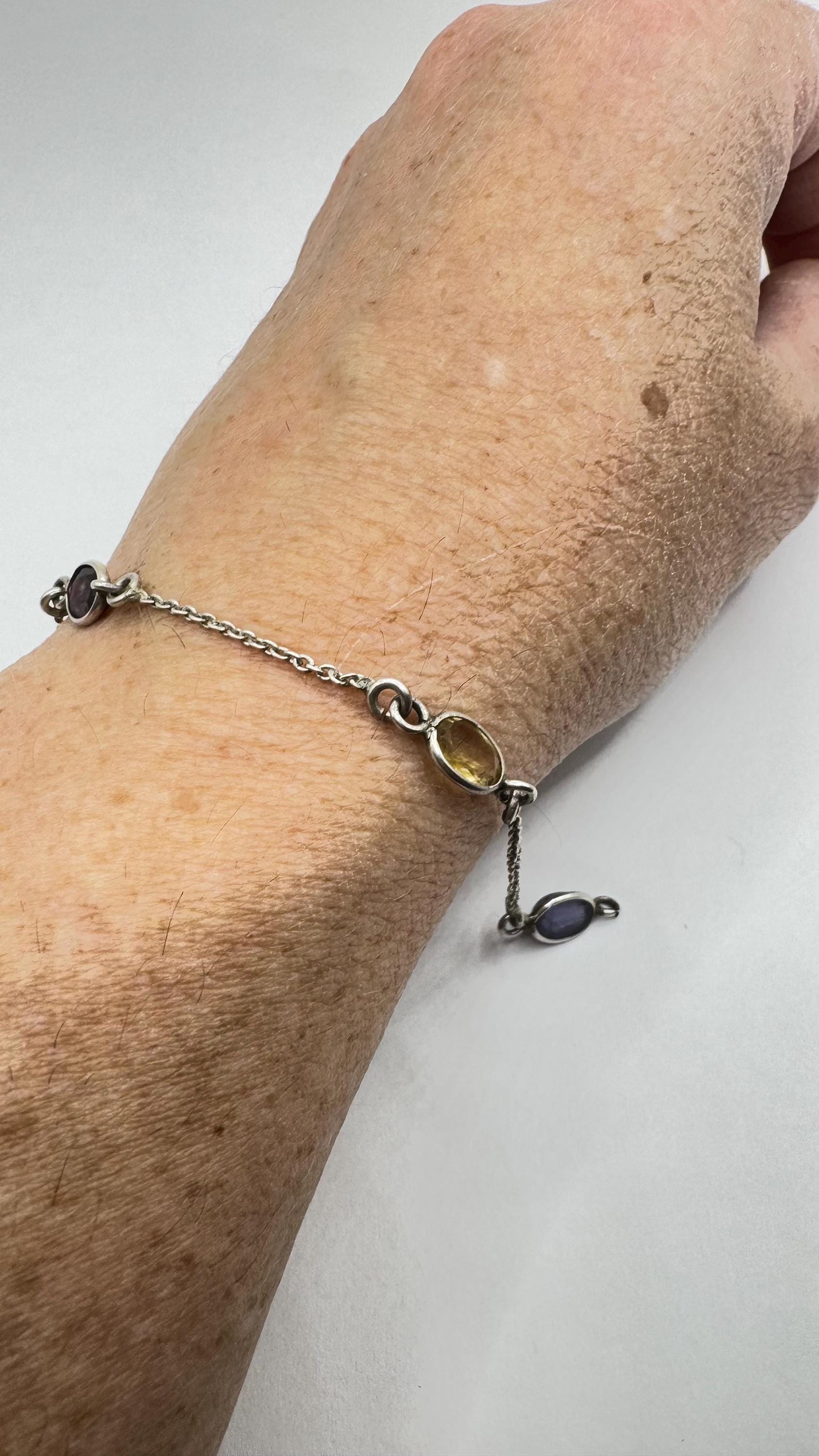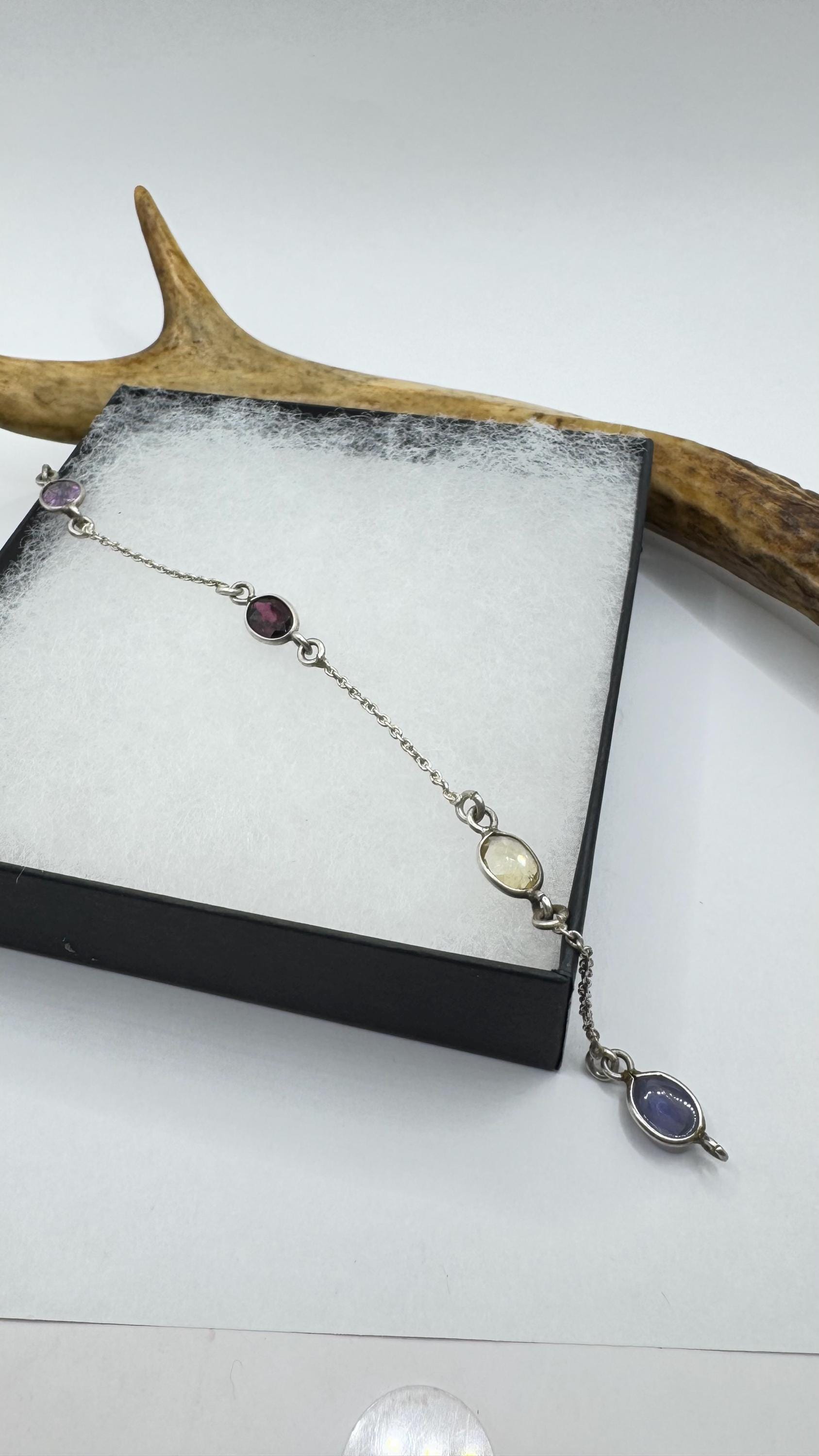 Our Vintage Tennis Bracelet features natural red garnet, turquoise, amethyst, iolite set with a tiny bezel in a dazzling station... Read more