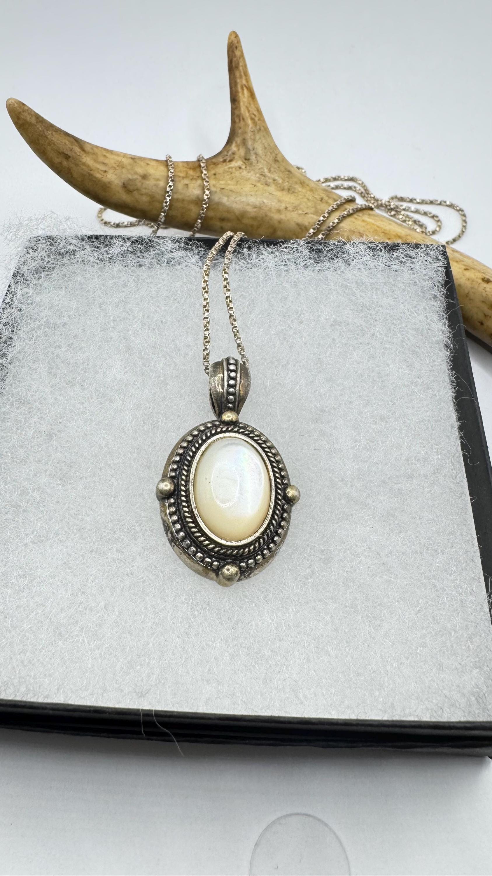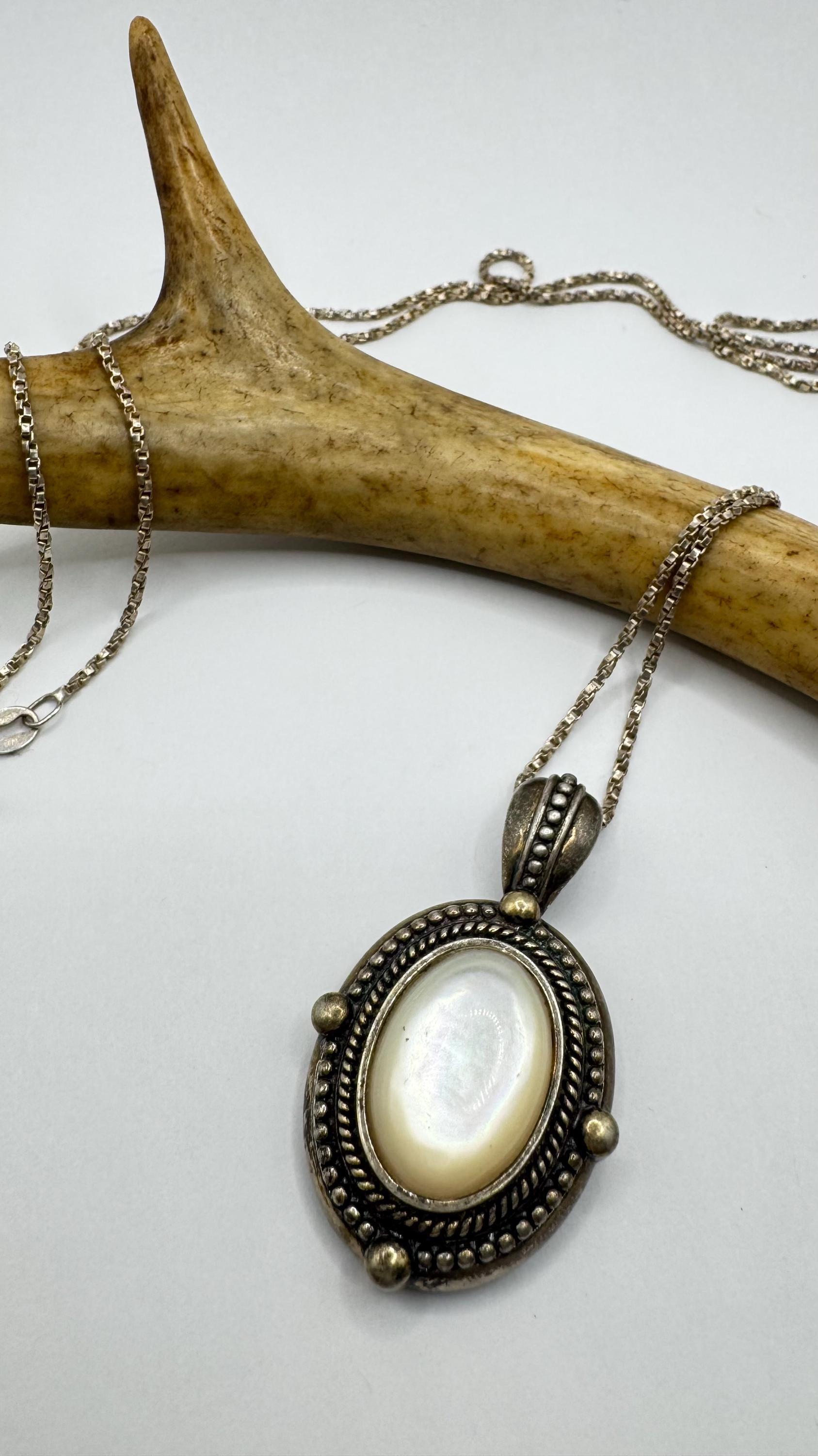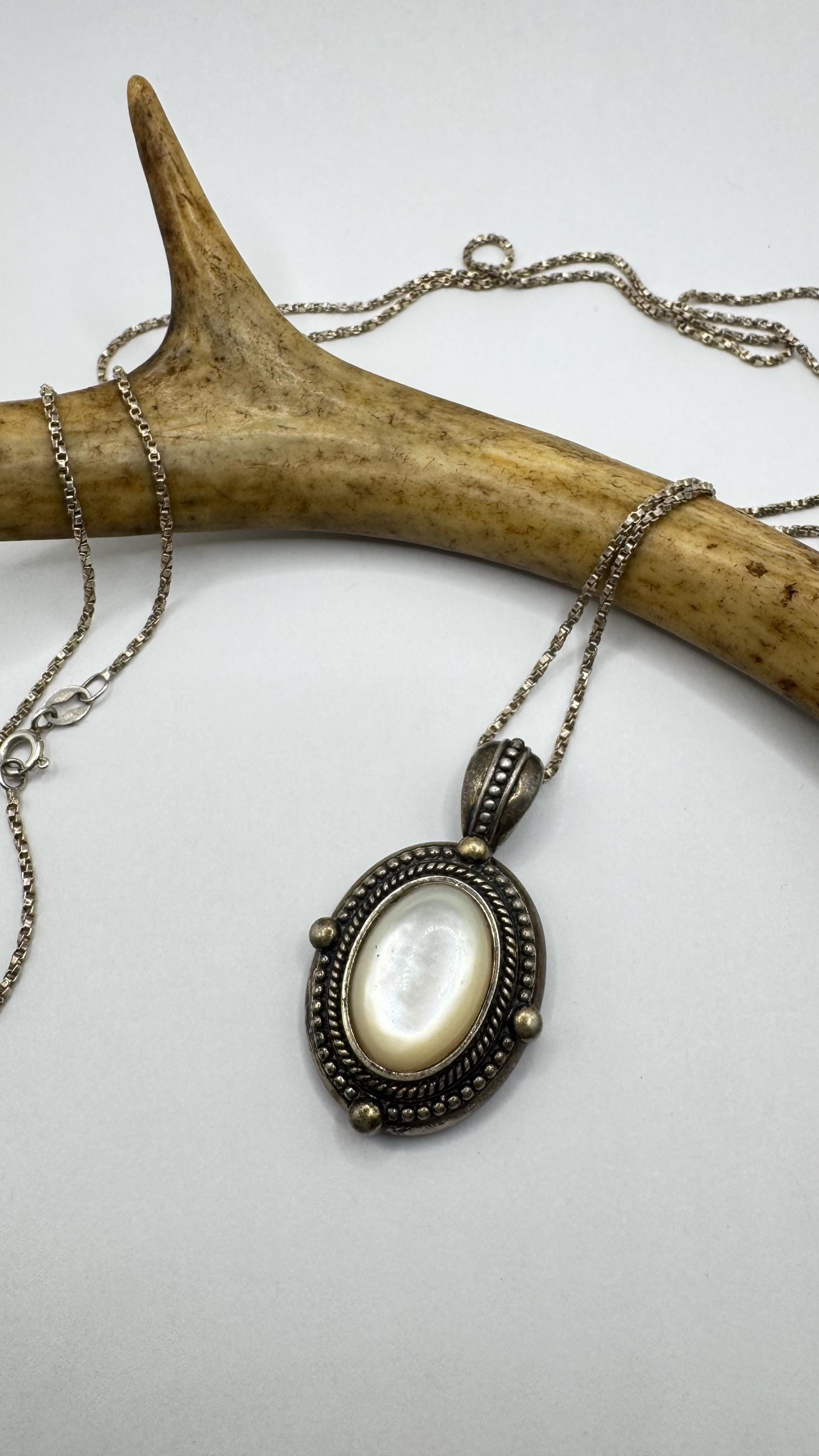 Vintage Silver Pendant Choker Necklace Mother of Pearl gemstone set in 925 Sterling Silver on a 36 inch long sterling... Read more
