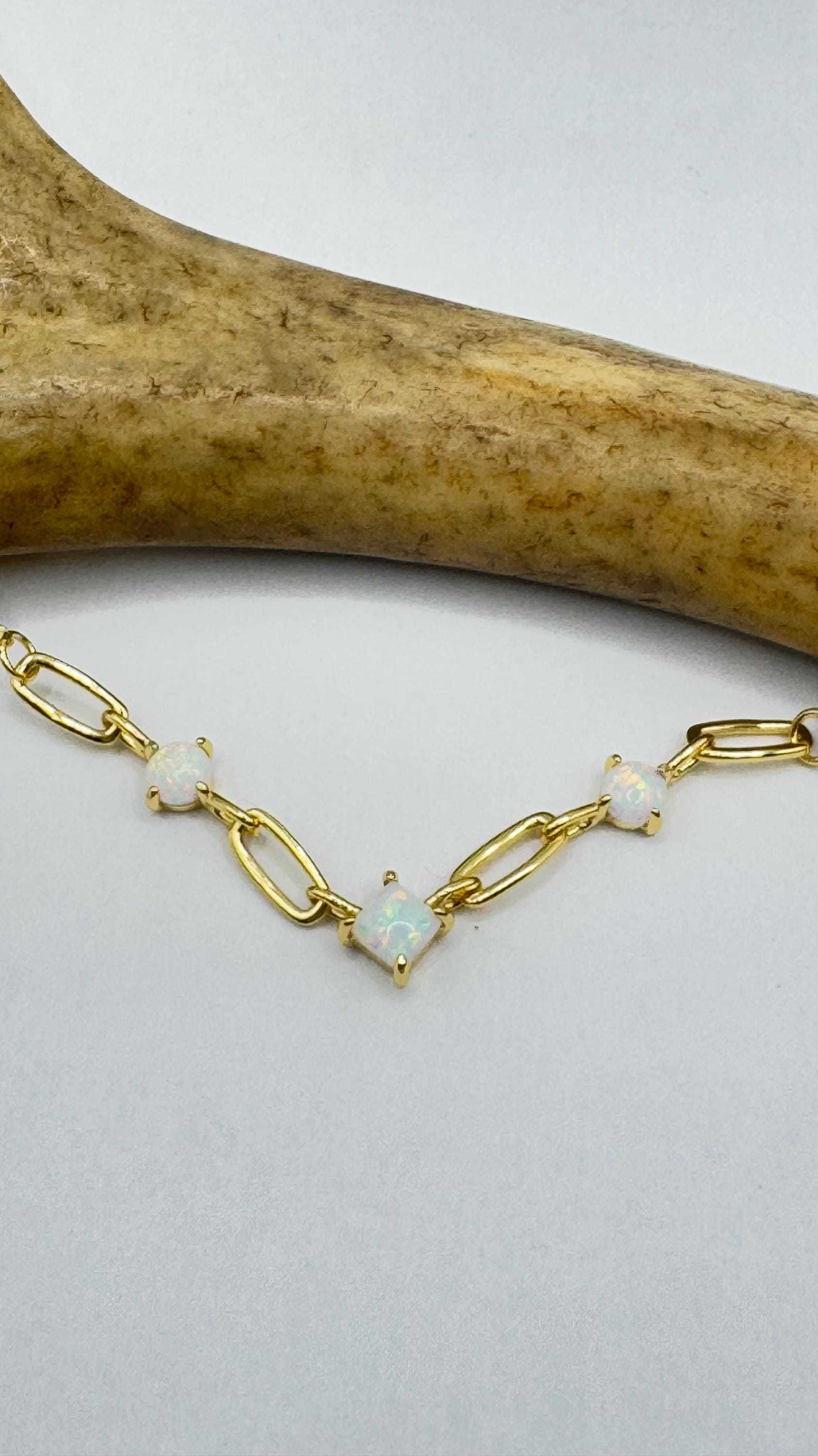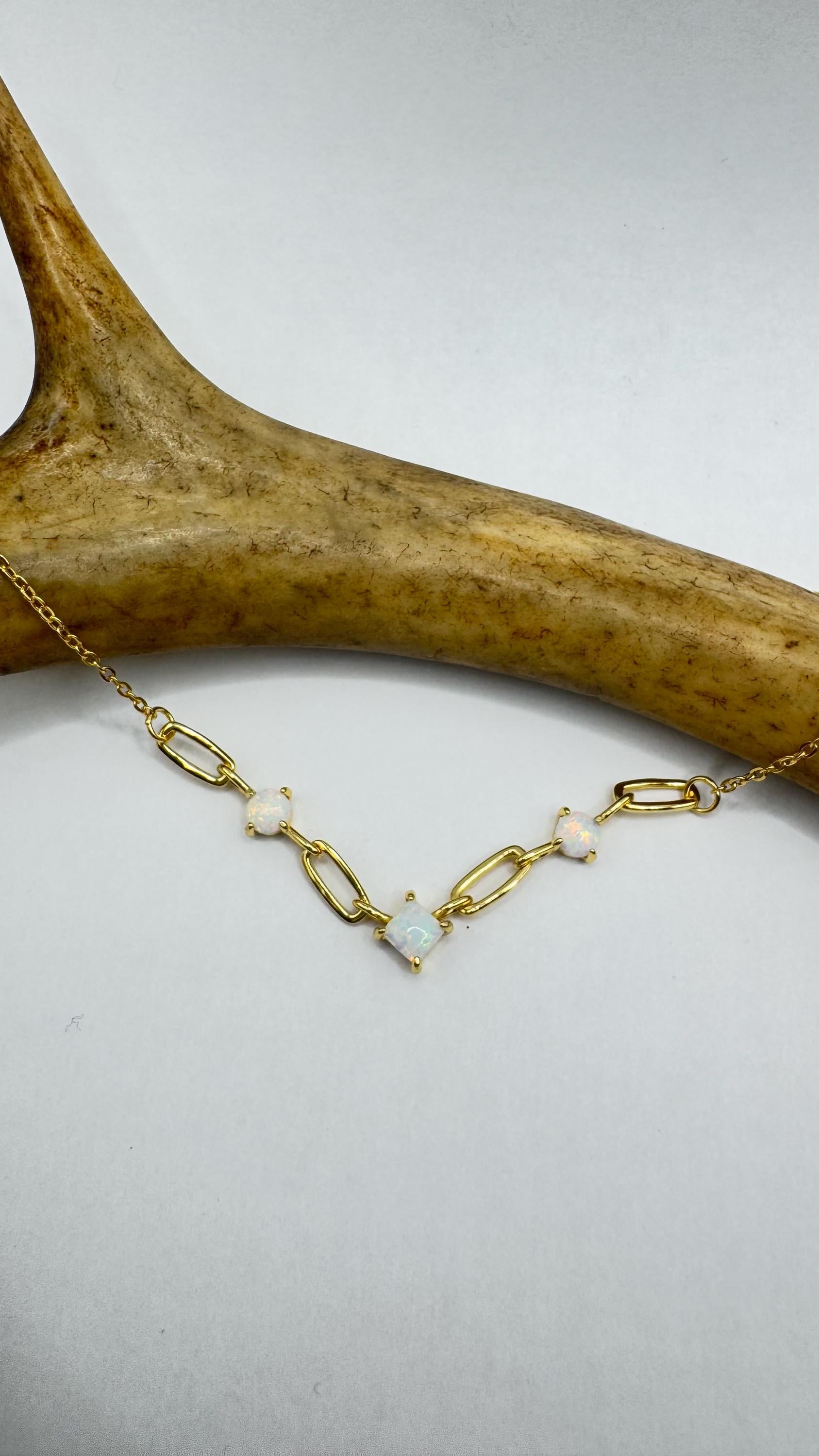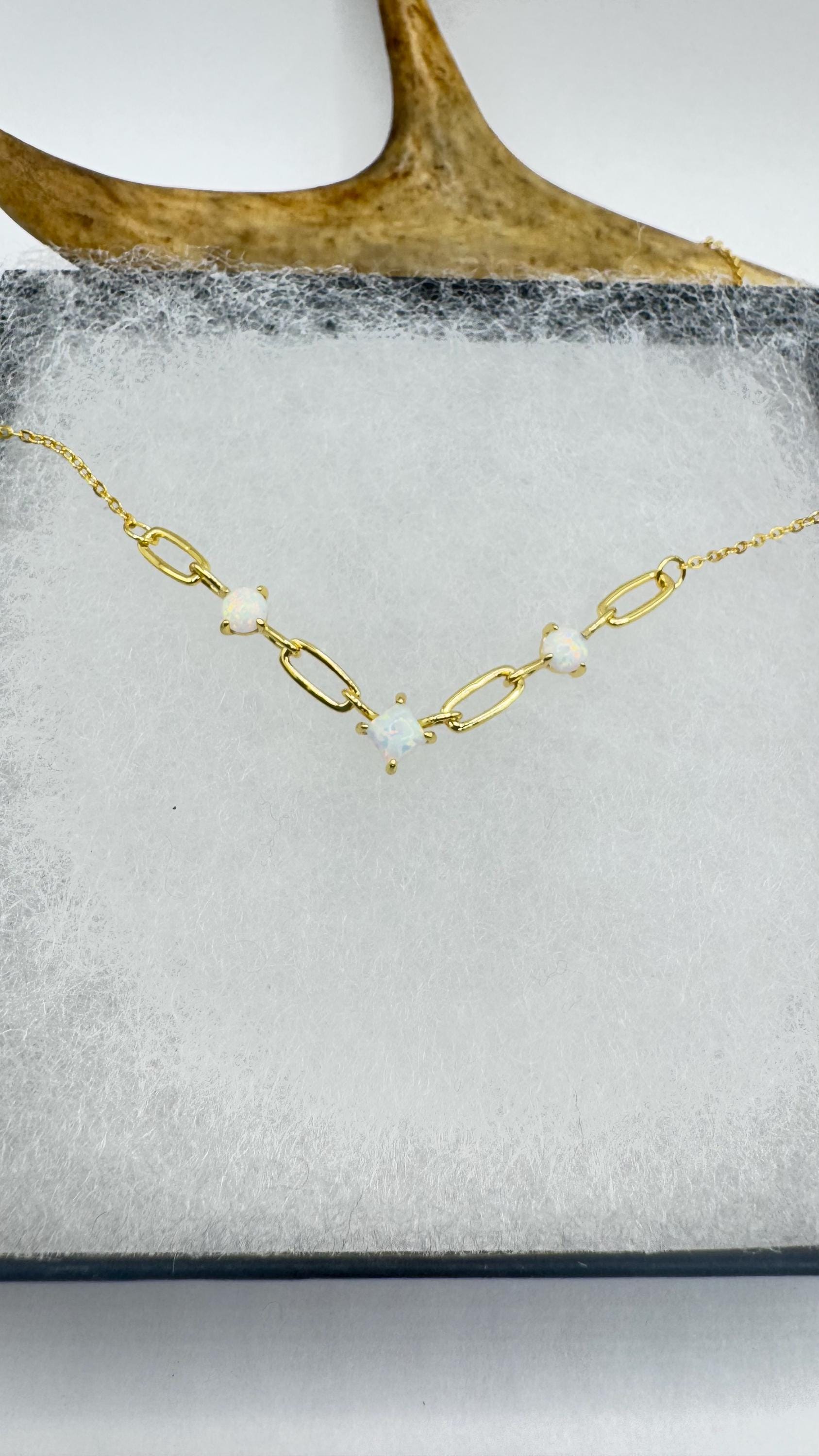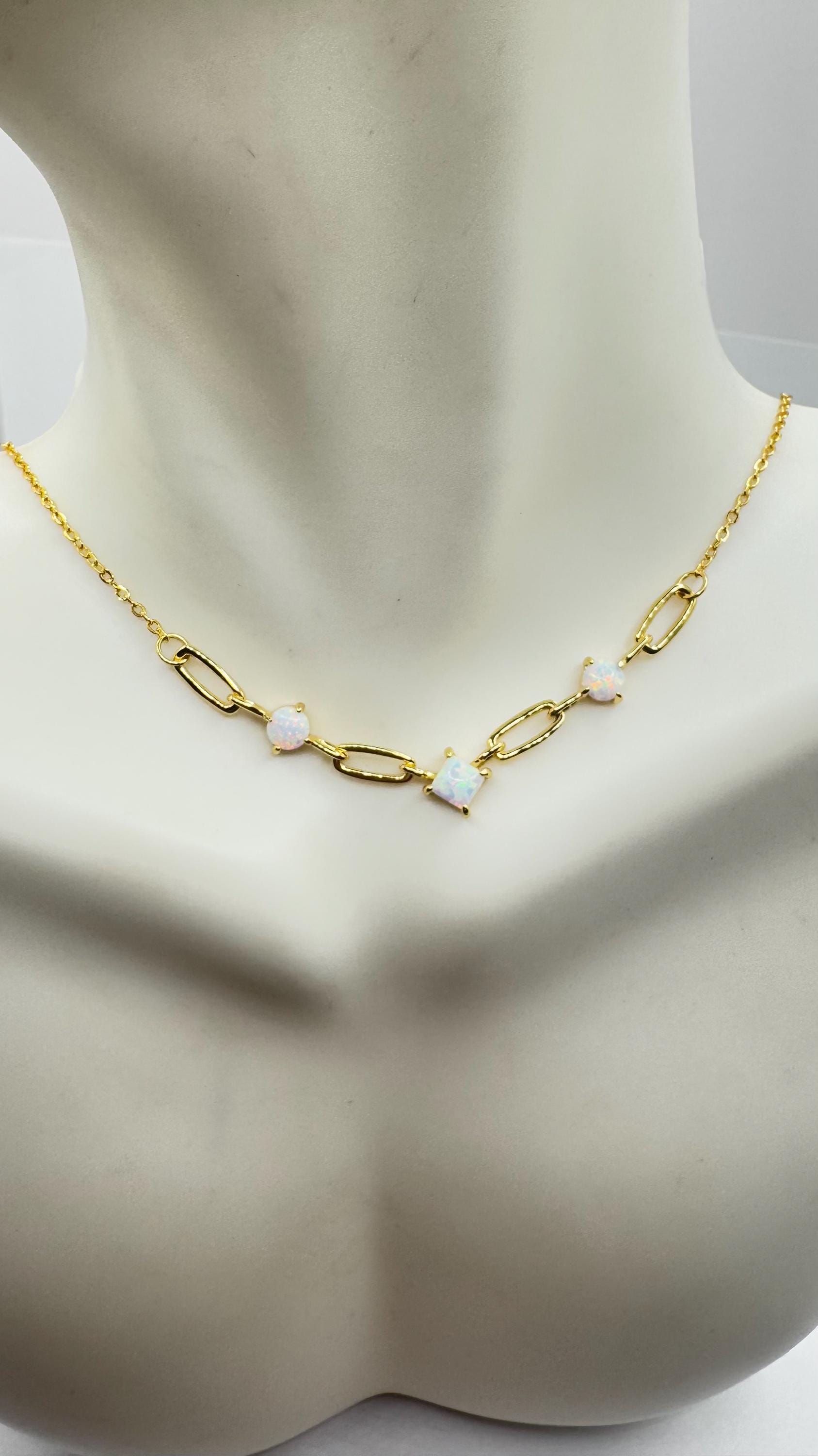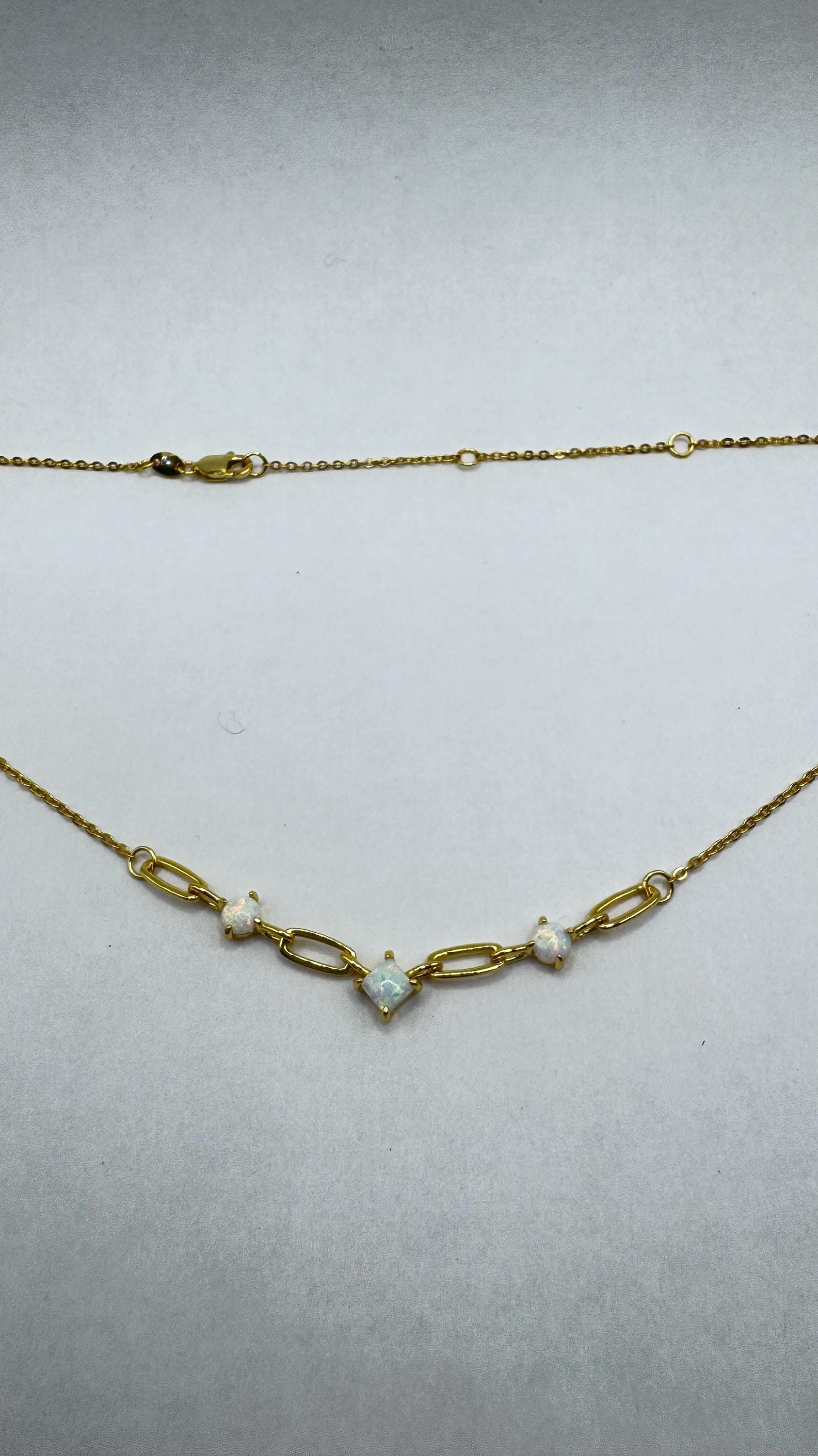 Vintage Opal Necklace | Tiny White Fire Opal Gemstone Crystal Diamond | Golden 925 Sterling Silver Minimalist Charm Pendant Chain Necklace
