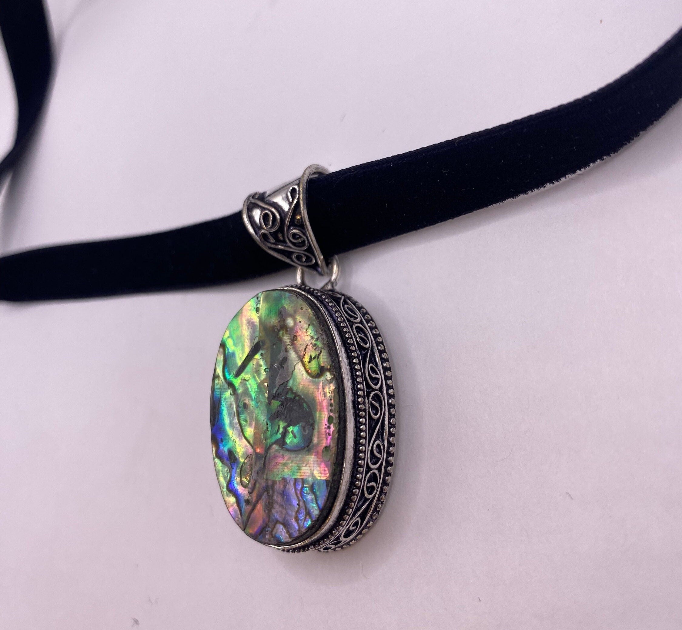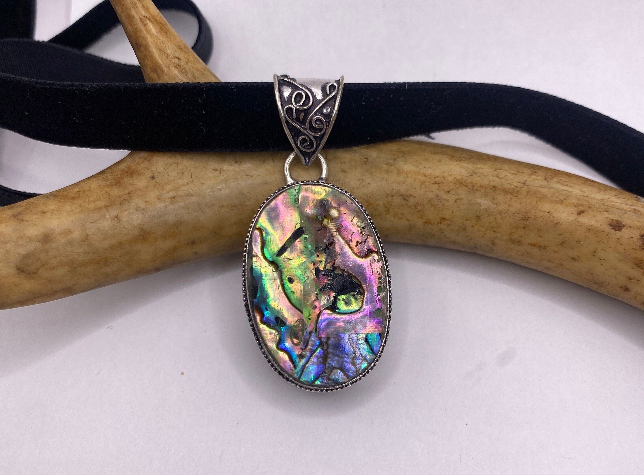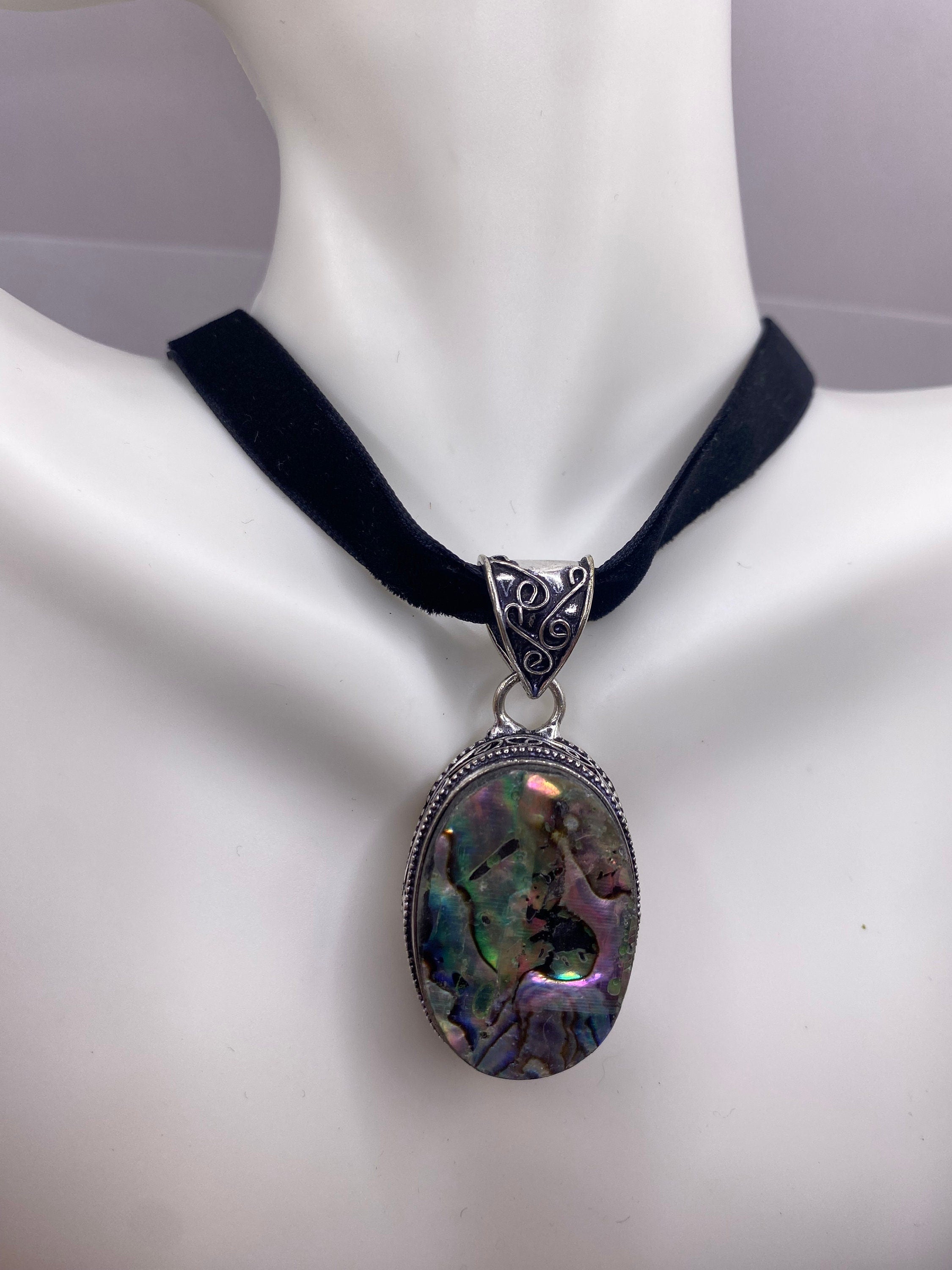 Vintage Pendant | Large Rainbow Abalone Haliotis Iris Shell | Silver Finished Bronze Velvet Choker Necklace | Unique Colorful Statement