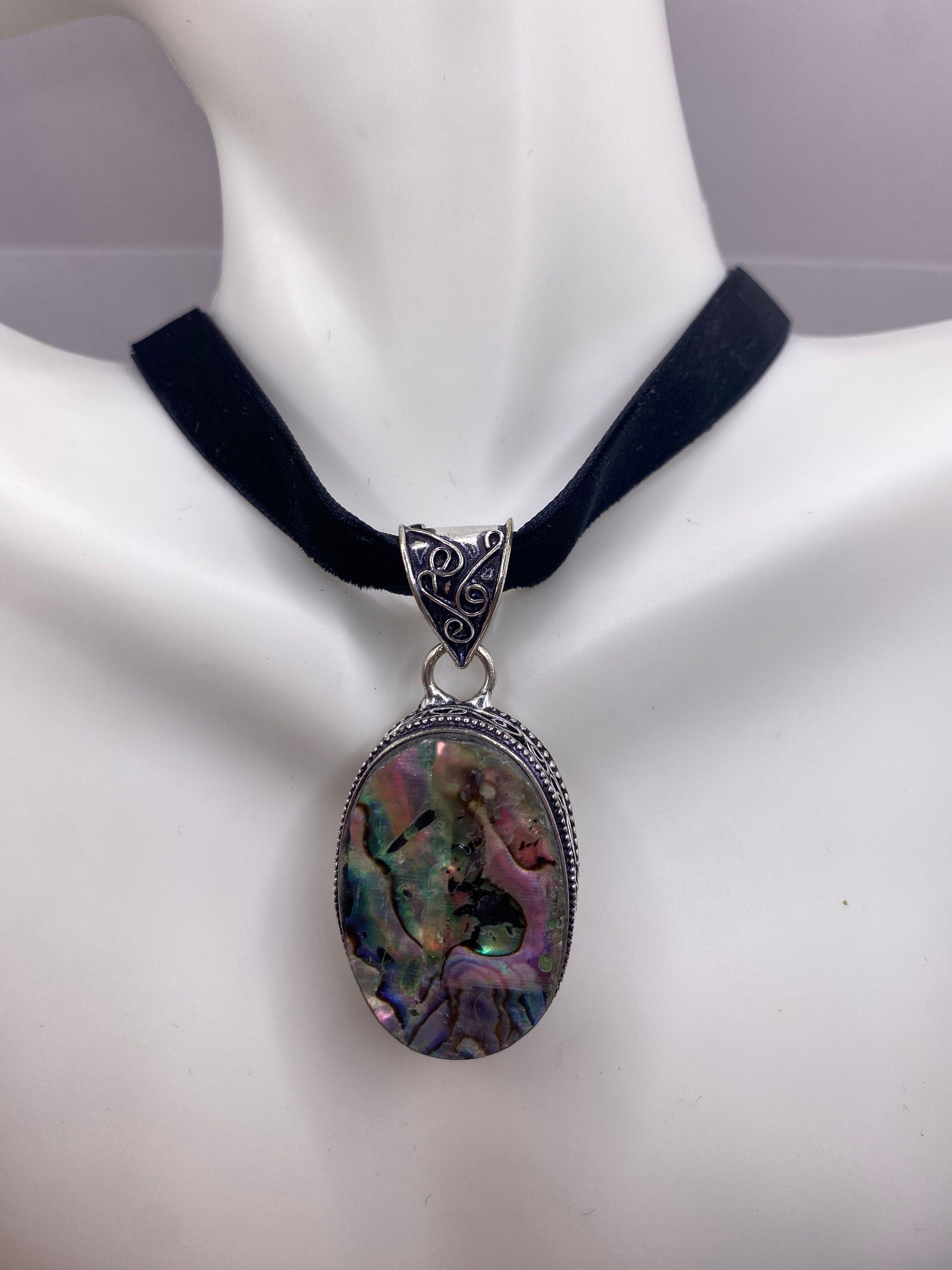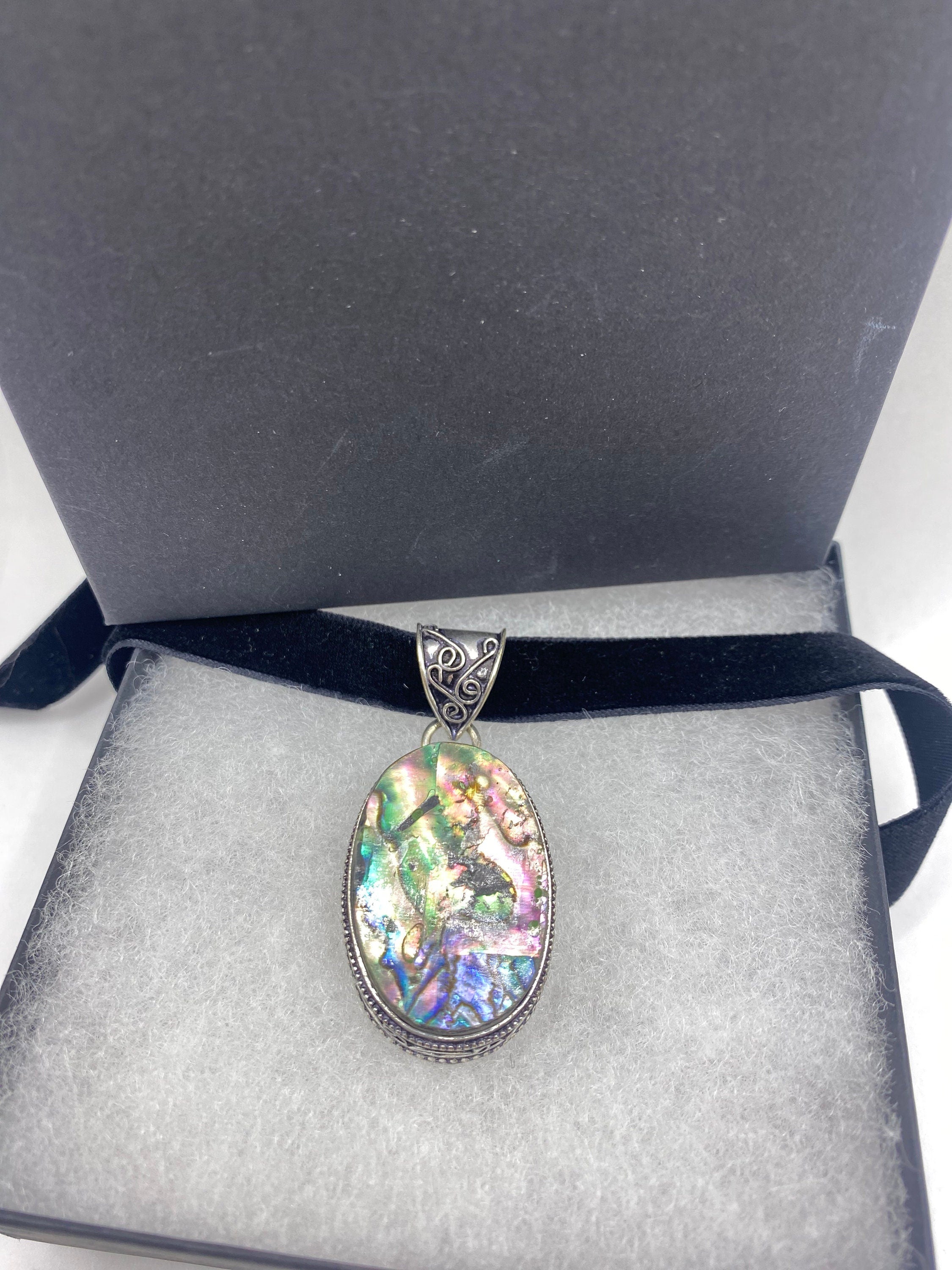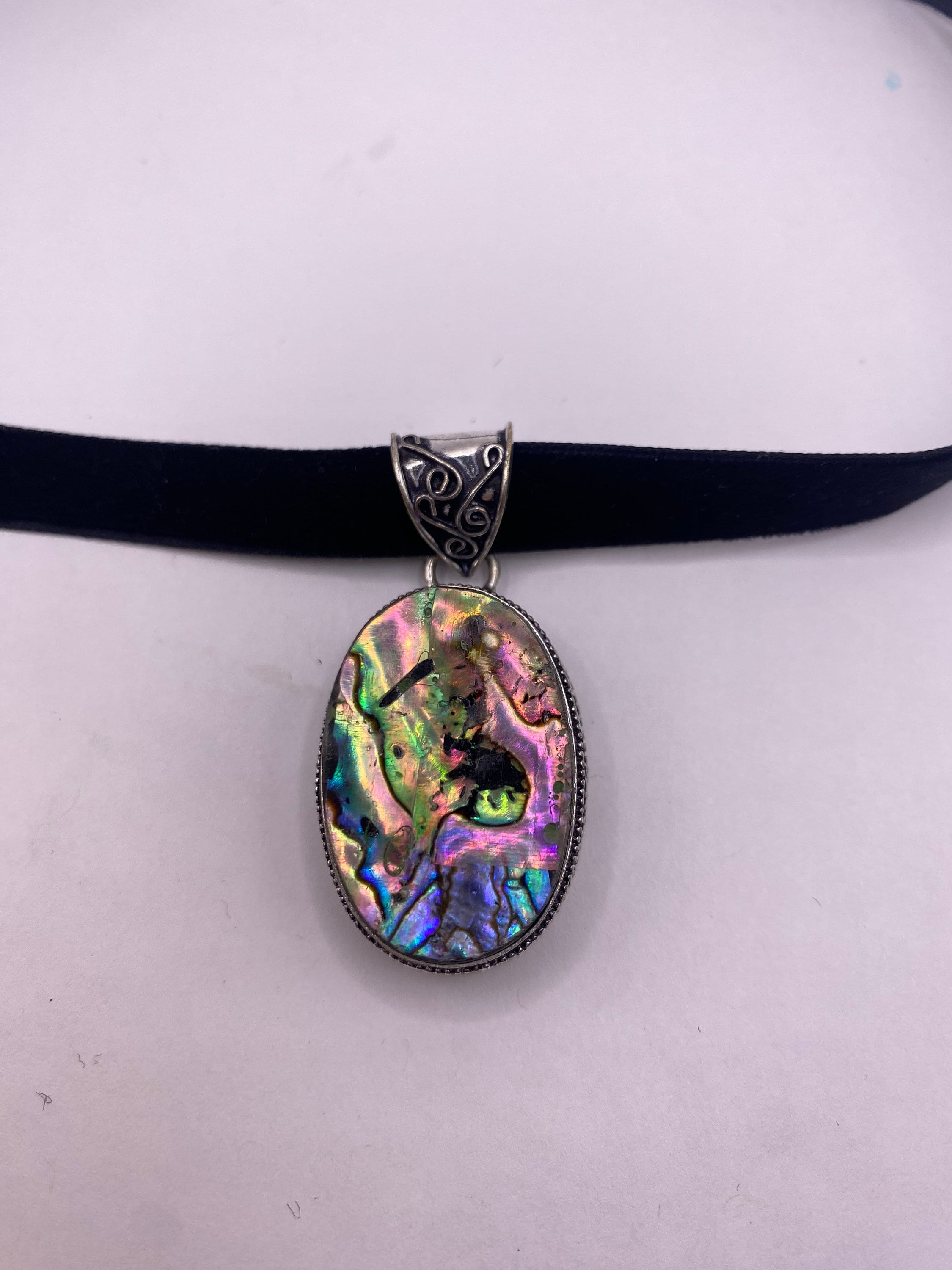 Vintage Pendant | Large Rainbow Abalone Haliotis Iris Shell | Silver Finished Bronze Velvet Choker Necklace | Unique Colorful Statement