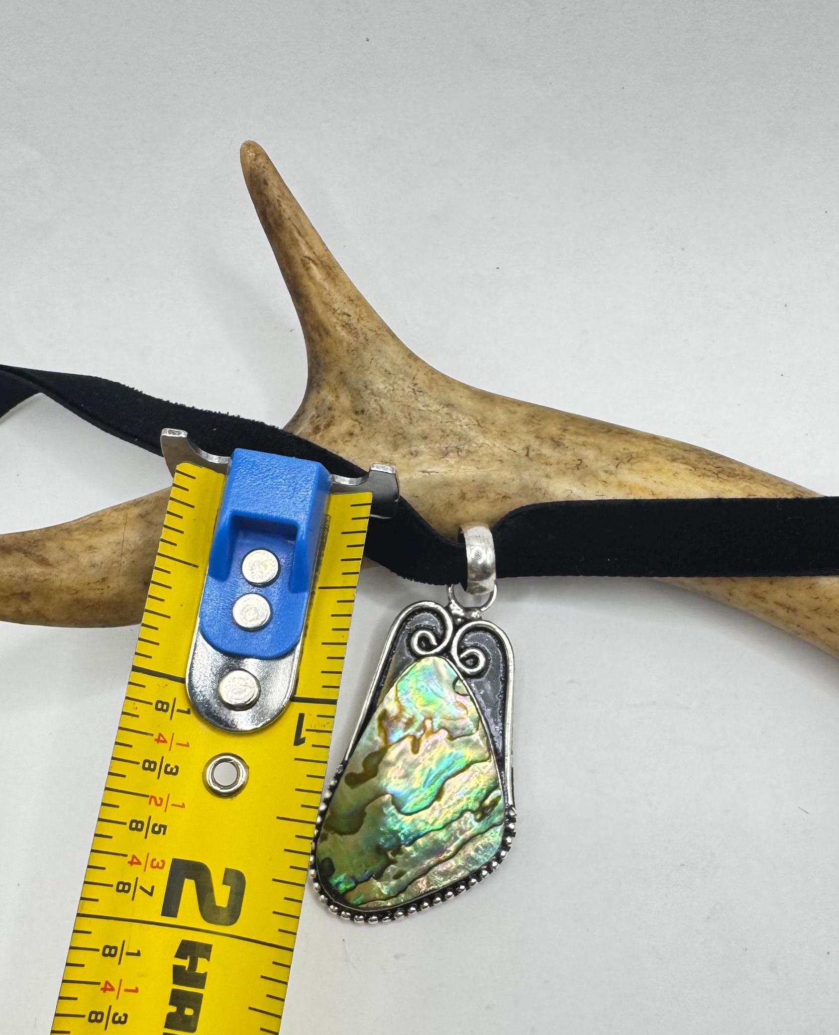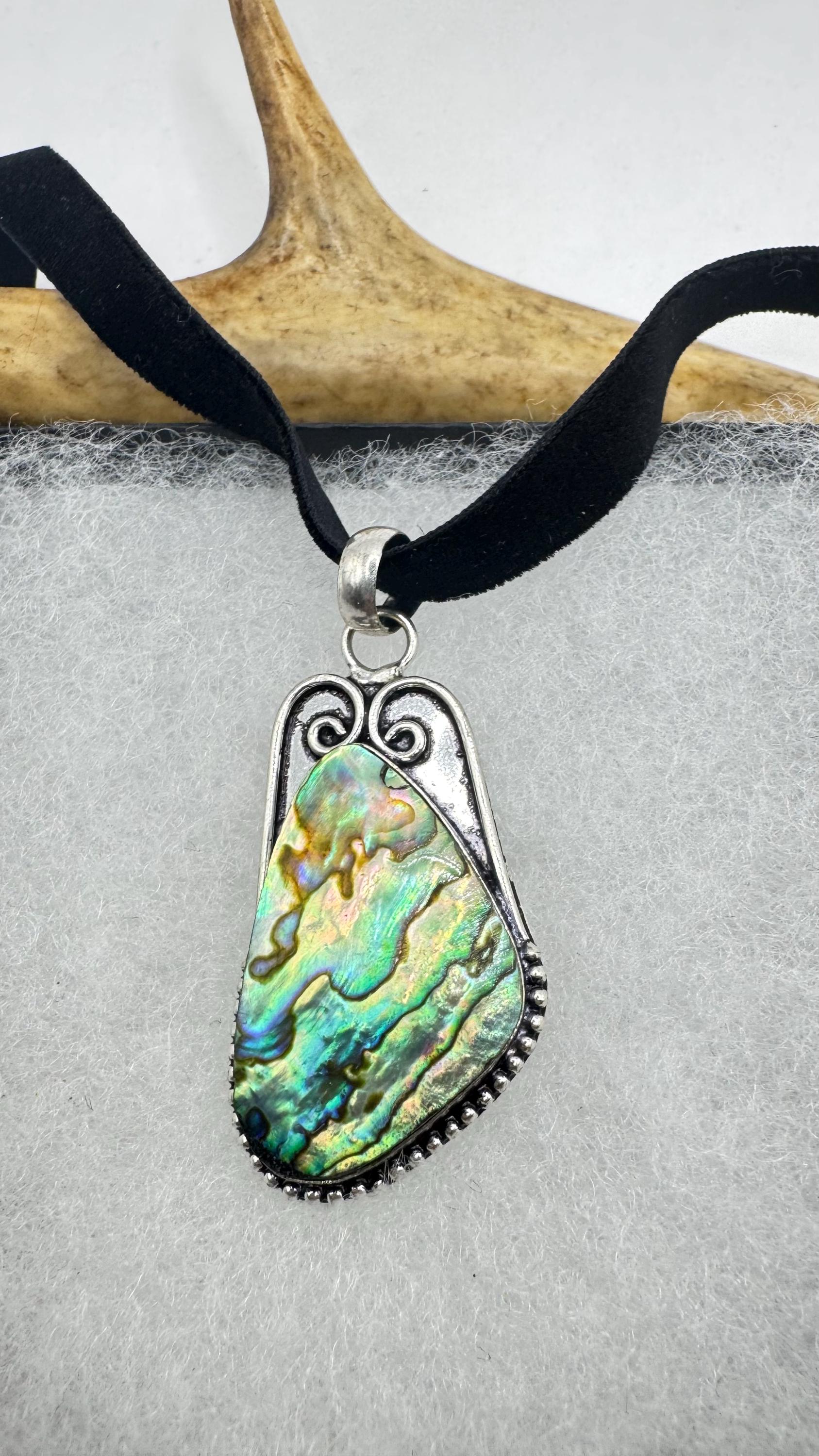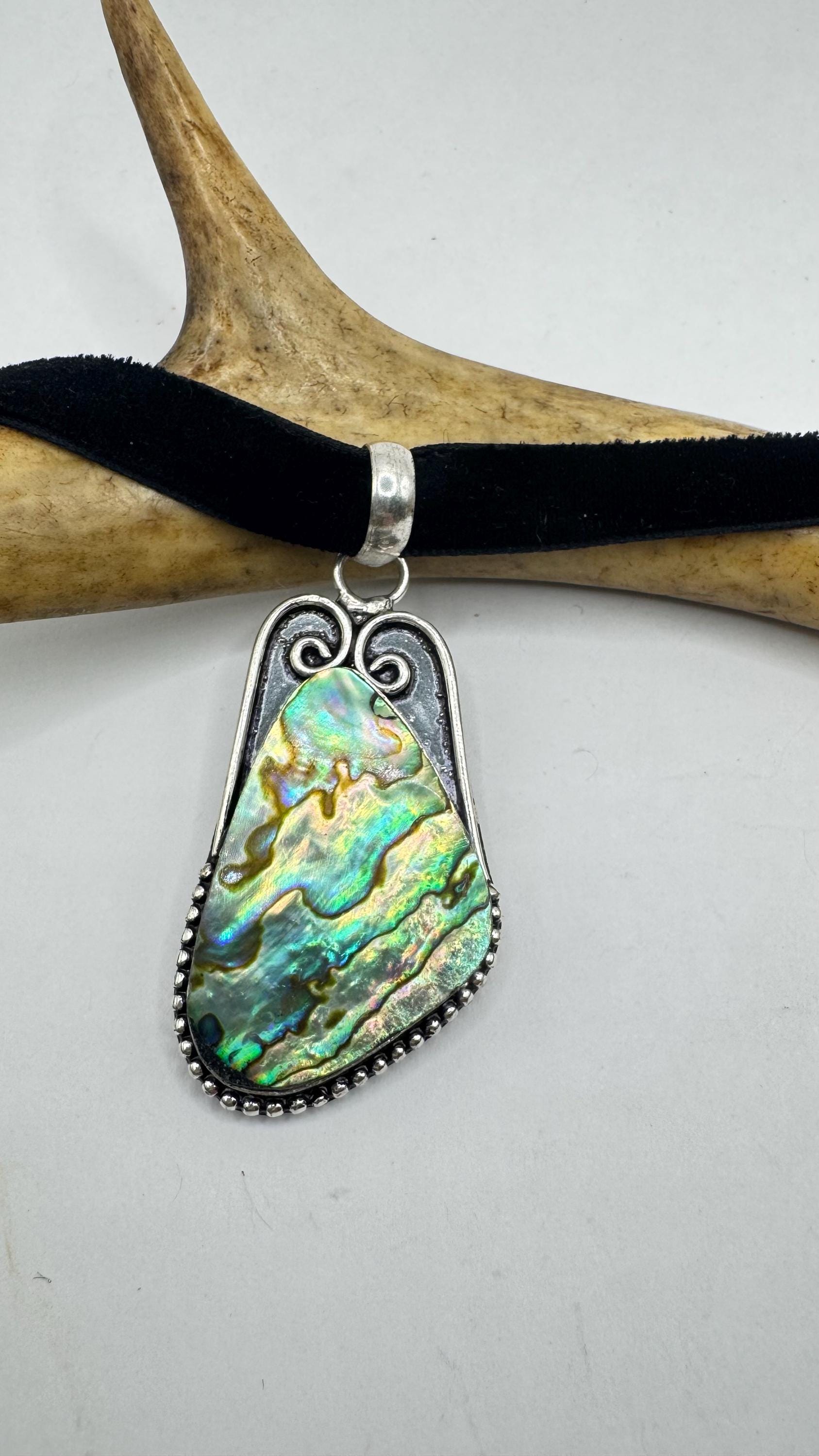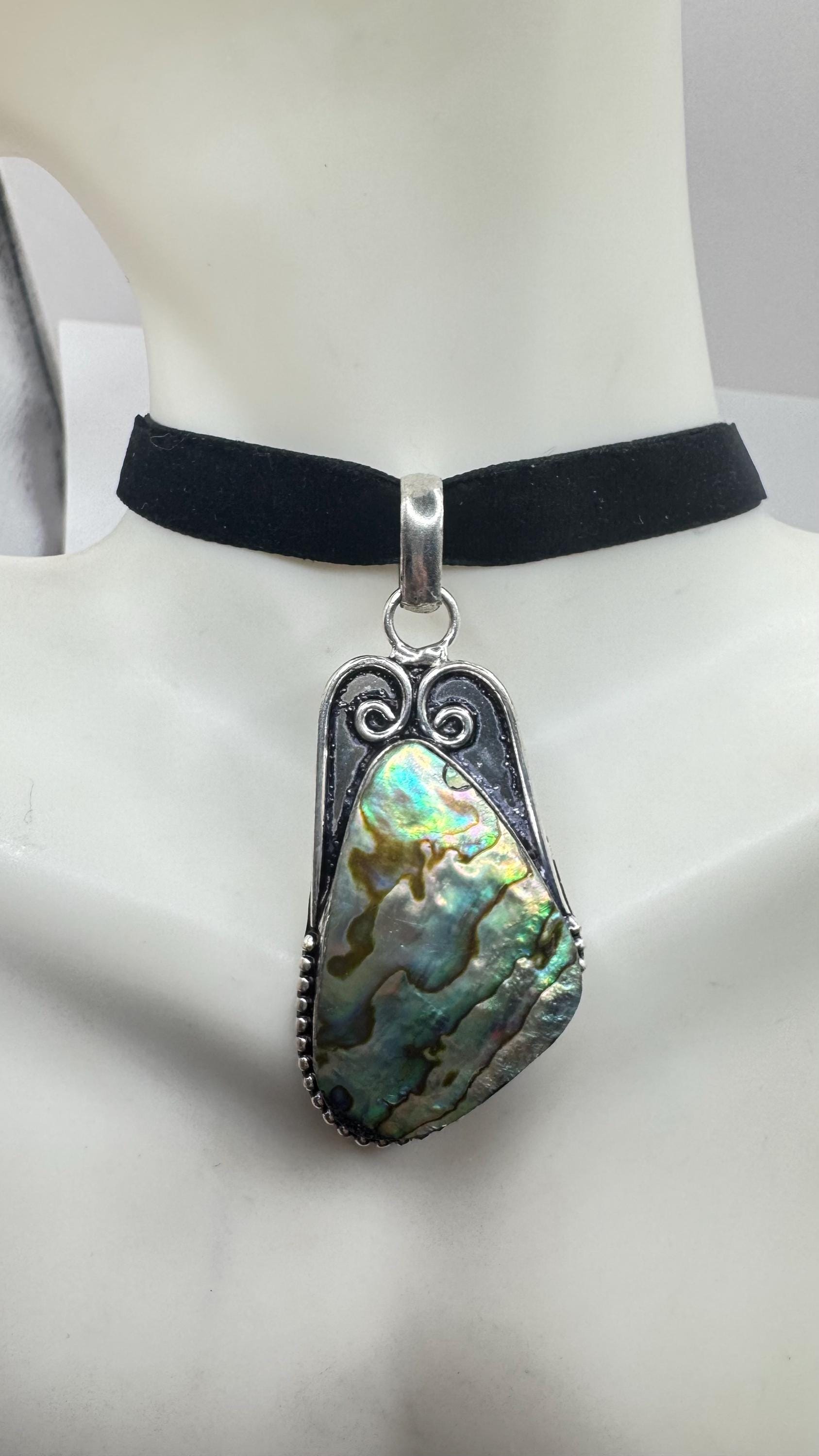 Vintage Pendant | Large Rainbow Abalone Haliotis Iris Shell | Silver Finished Bronze Velvet Choker Necklace | Unique Colorful Statement