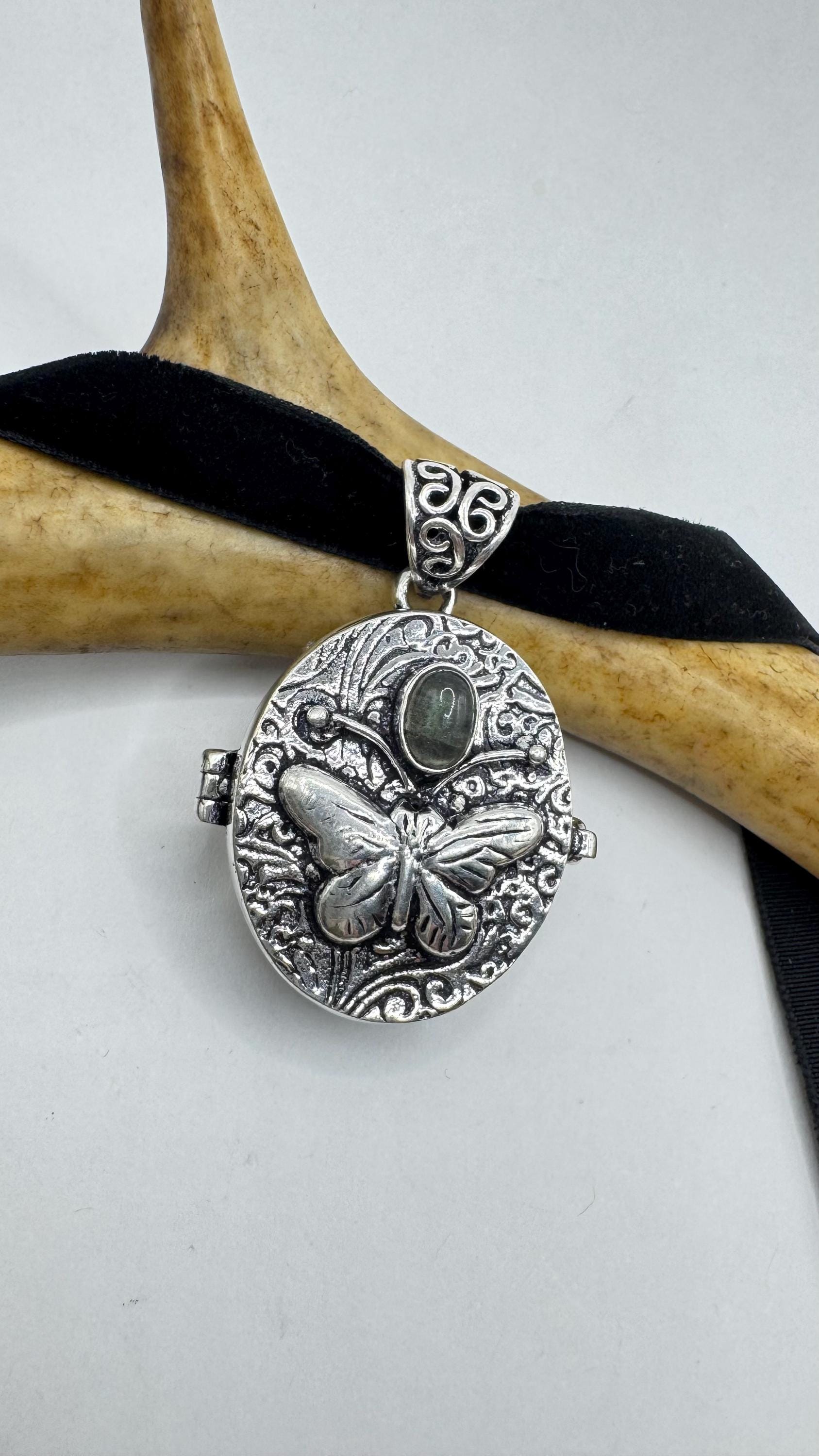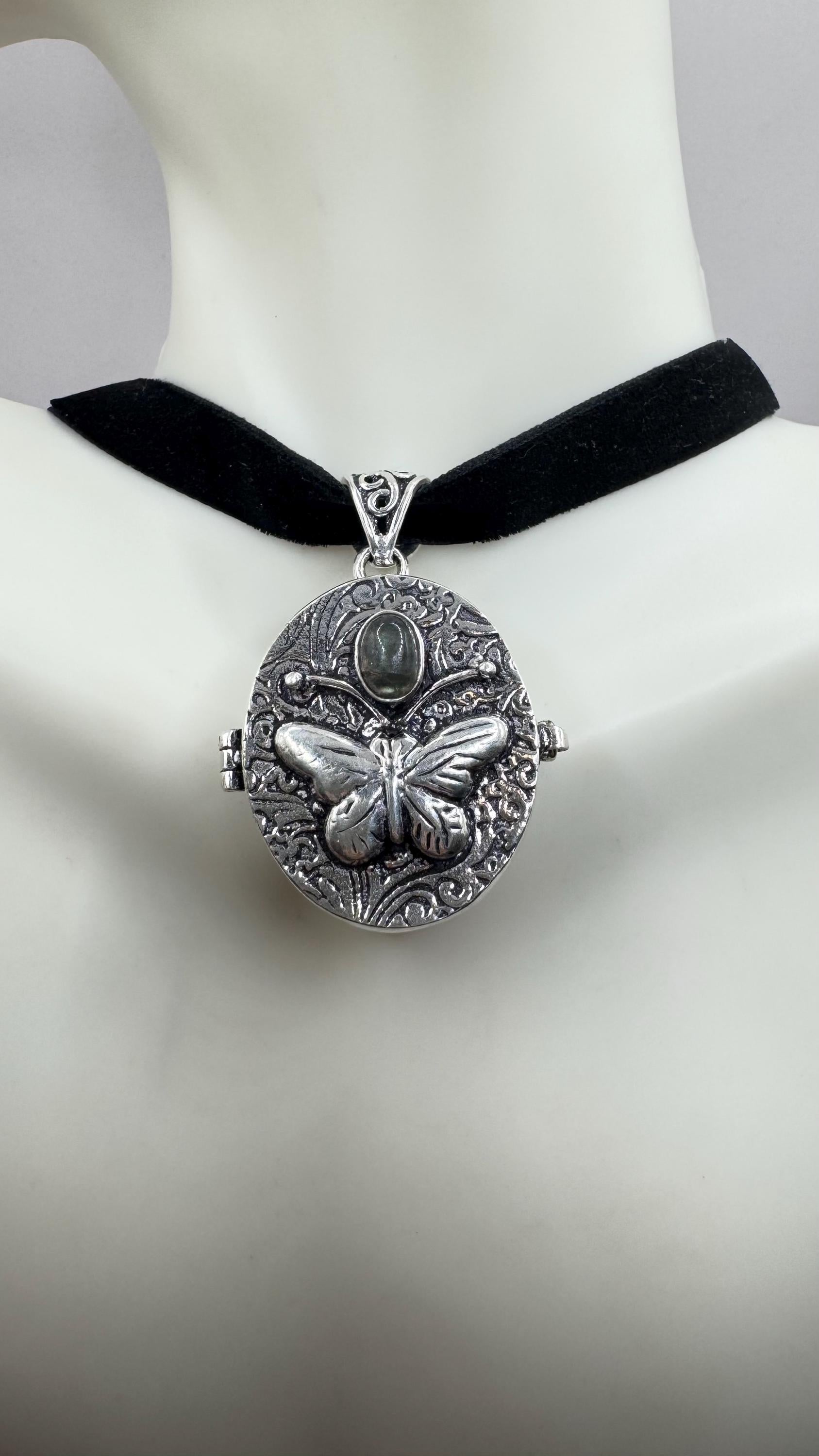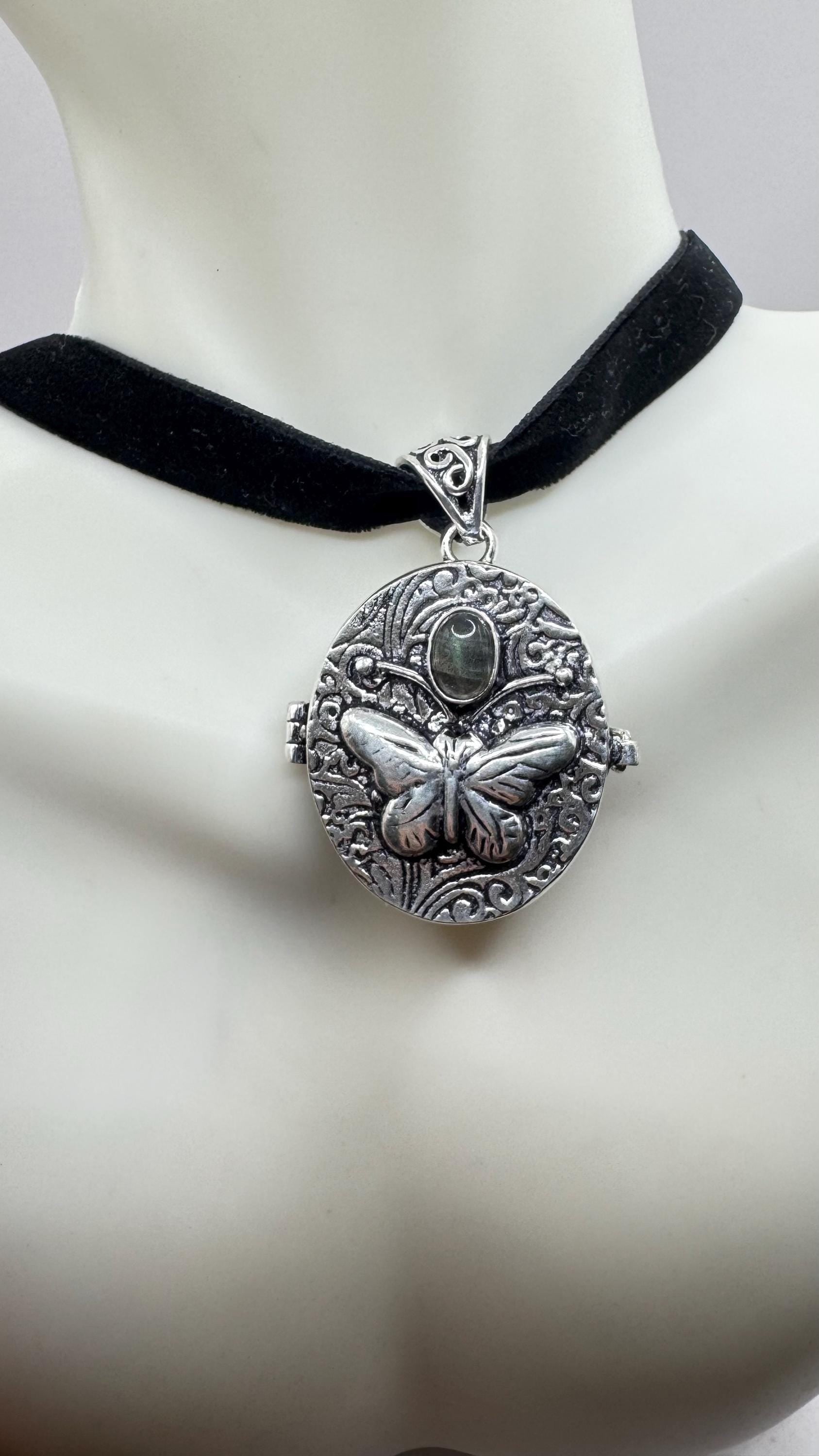 Vintage Photo Locket | Butterfly Pendant Labradorite Gemstone Set in Silver Bronze Poison Pill Box Black Velvet Choker - Unique Jewelry Gift