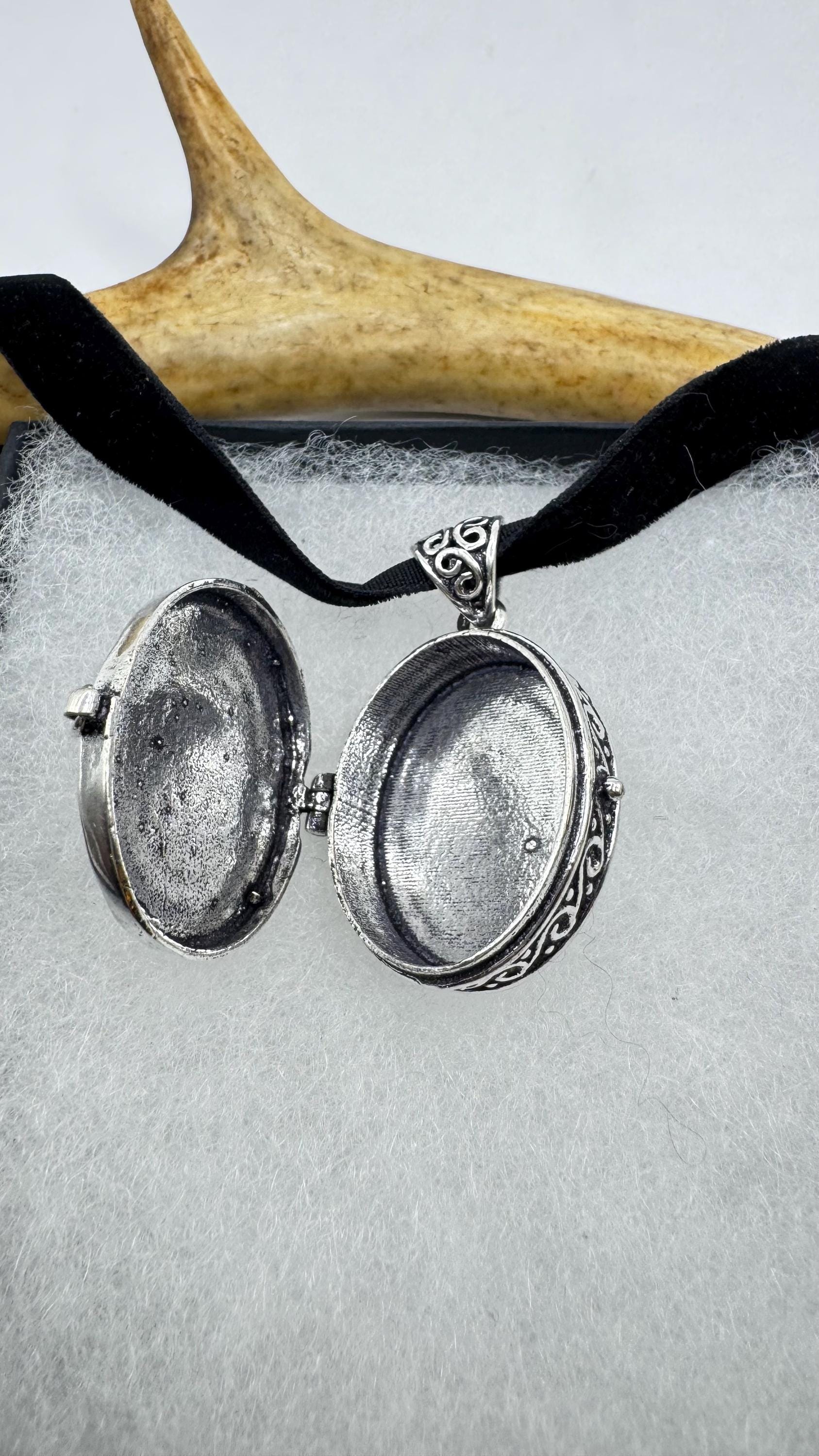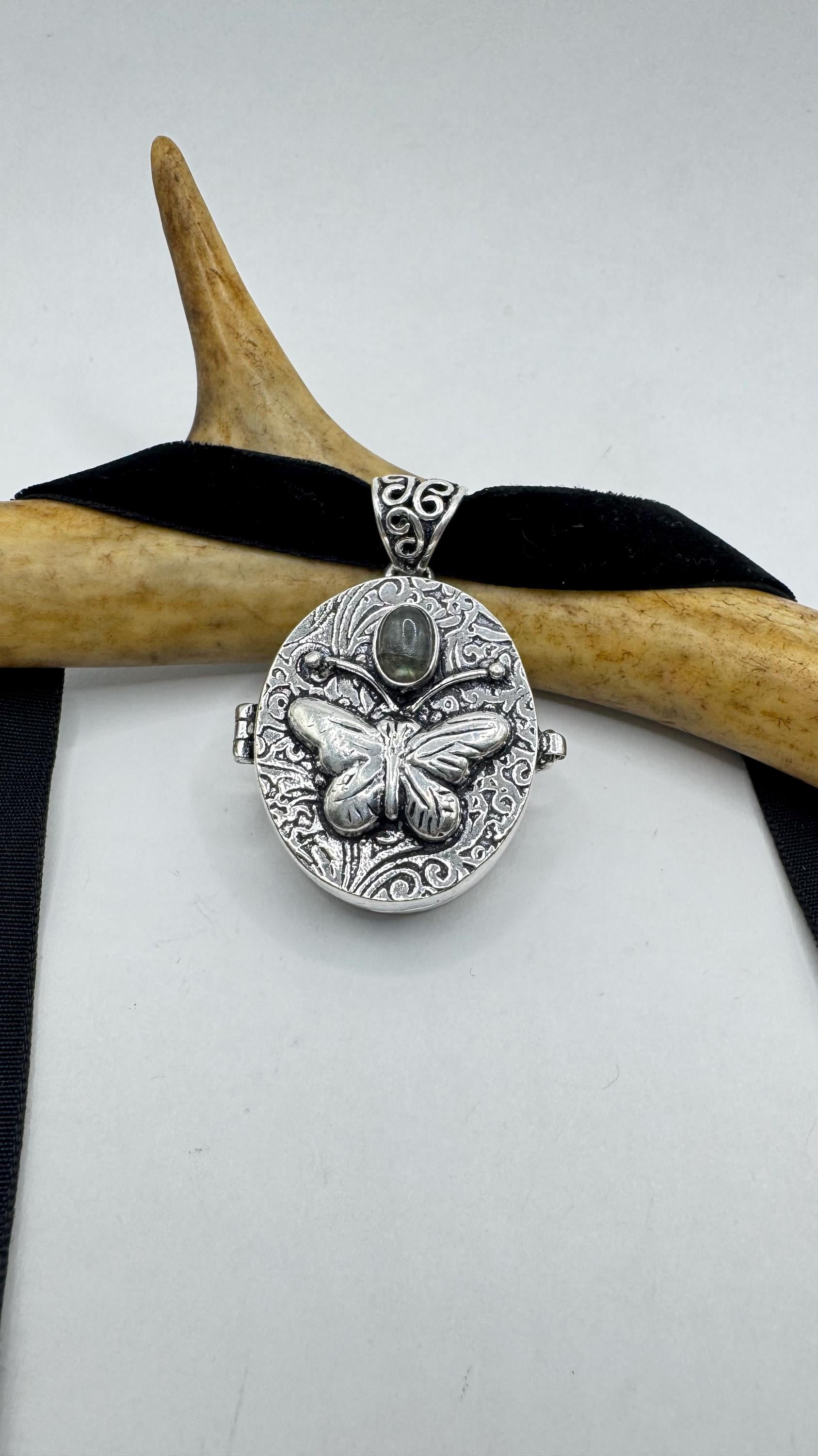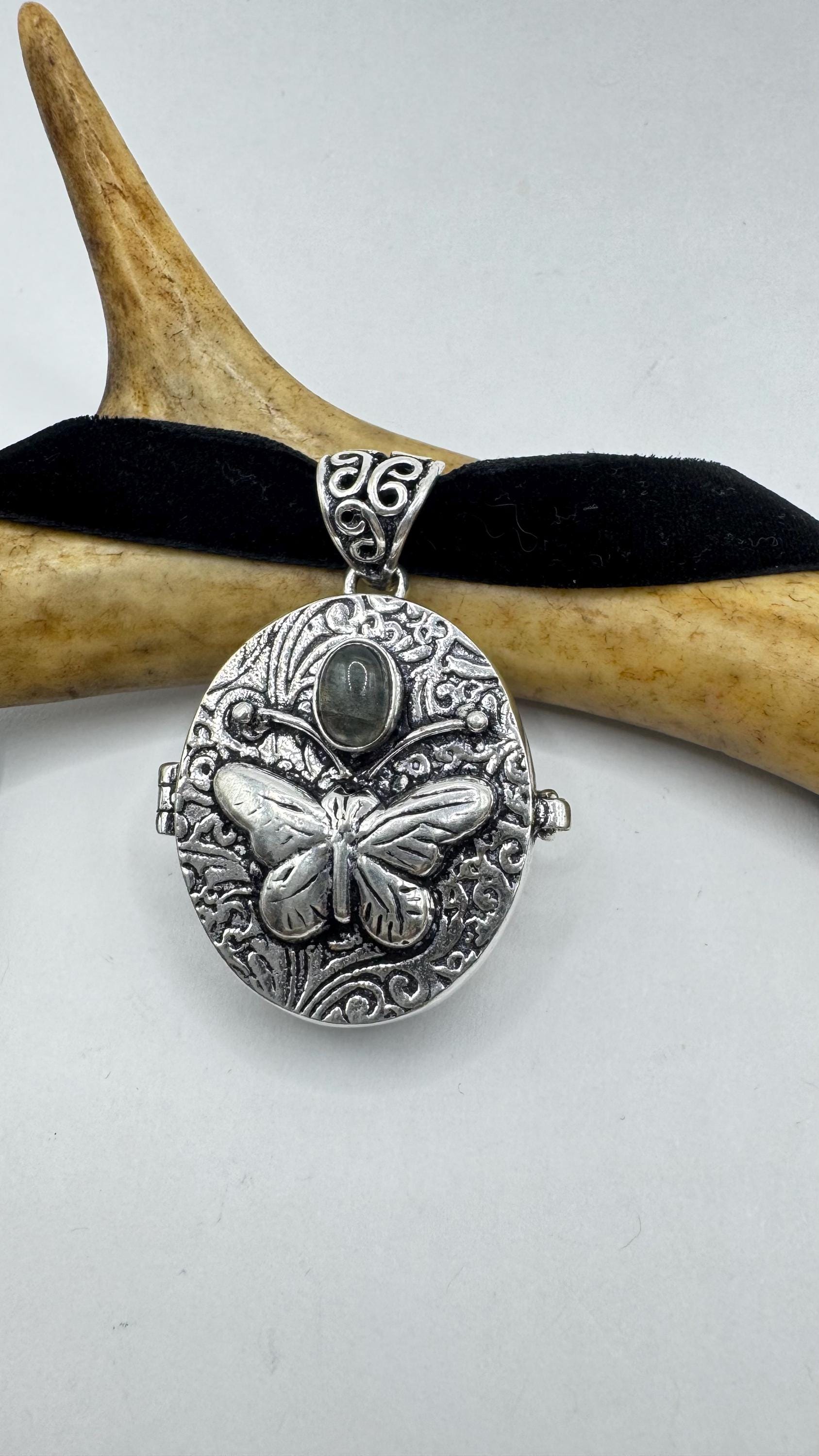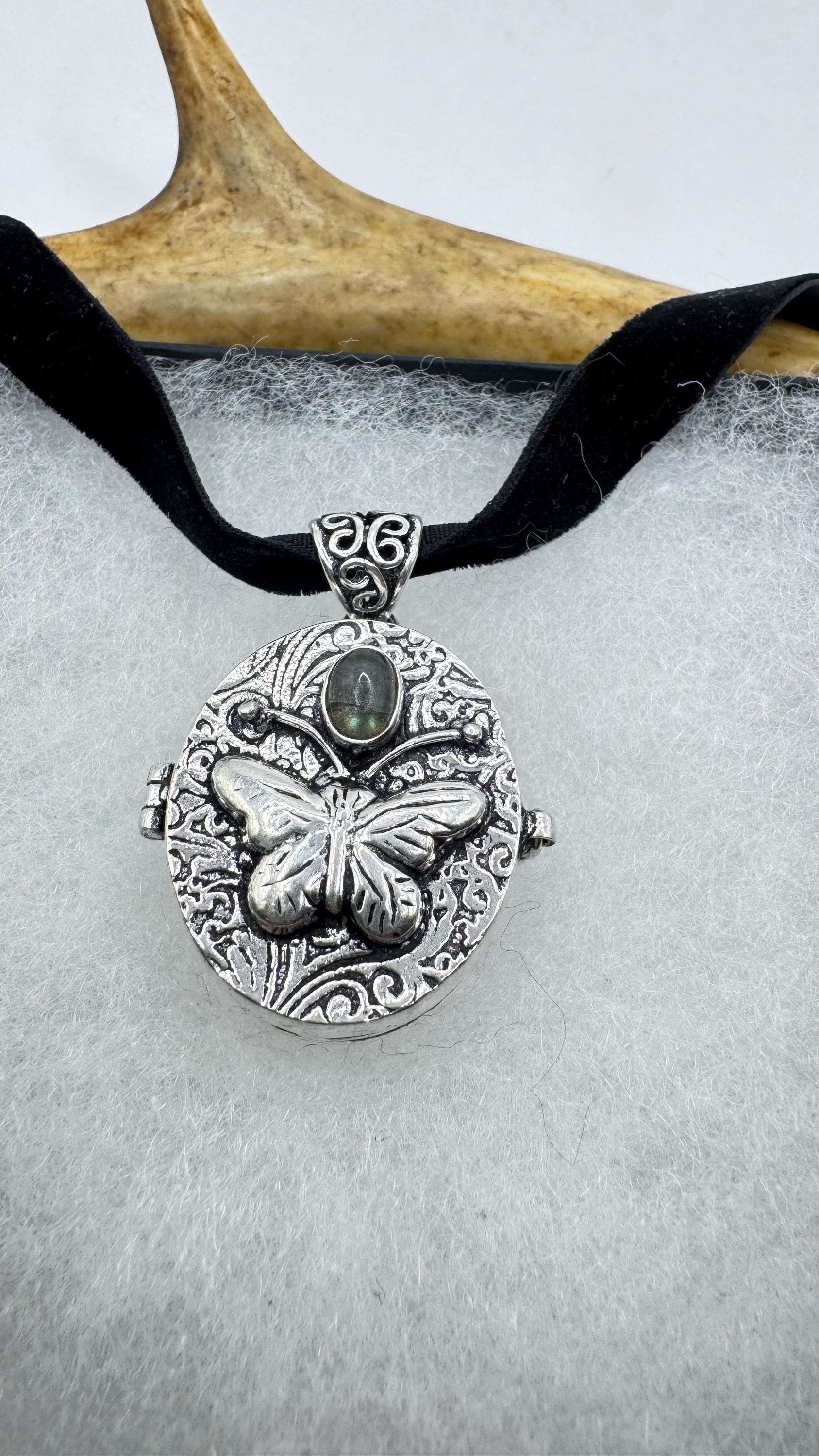 Vintage Photo Locket | Butterfly Pendant Labradorite Gemstone Set in Silver Bronze Poison Pill Box Black Velvet Choker - Unique Jewelry Gift