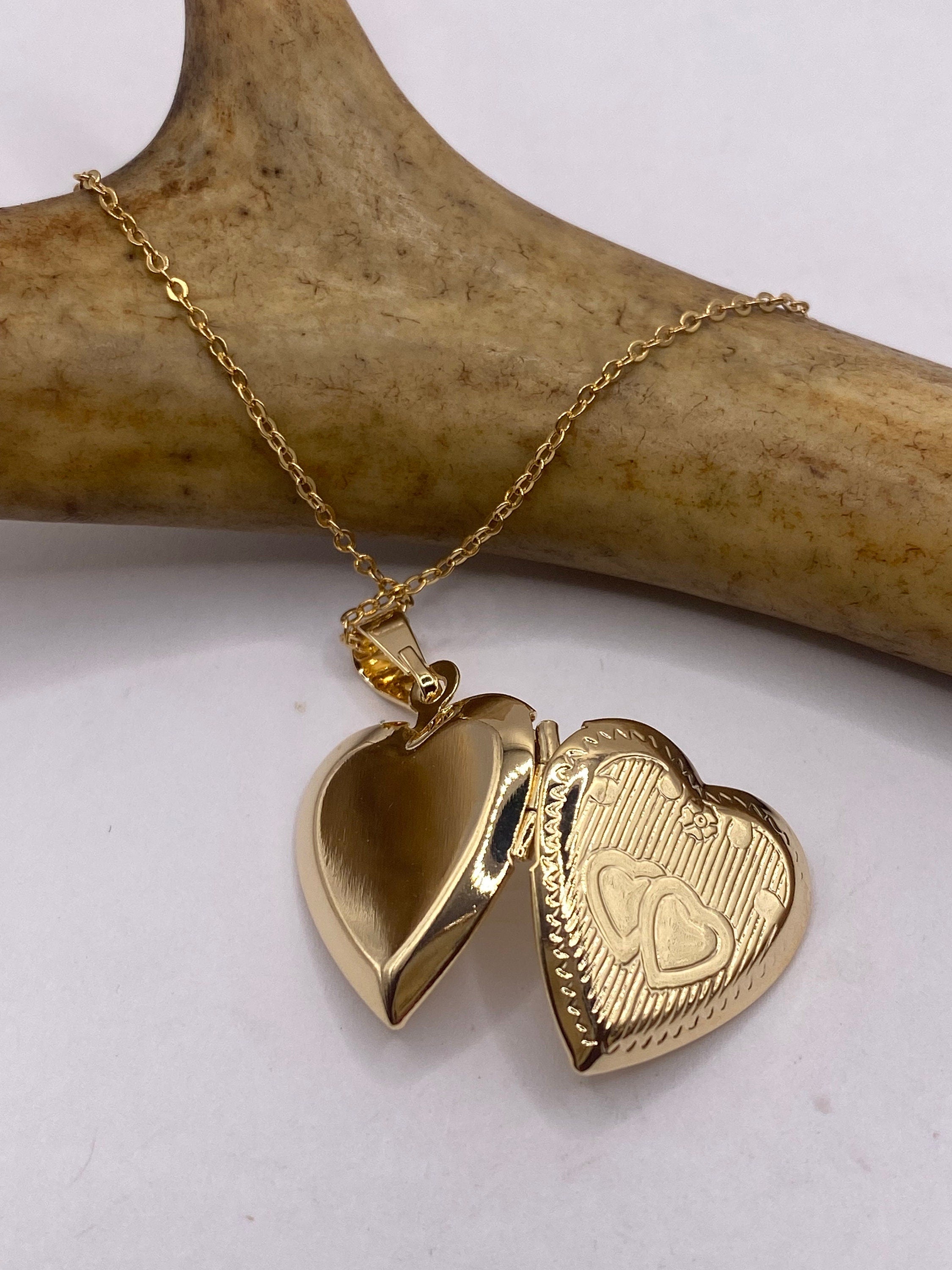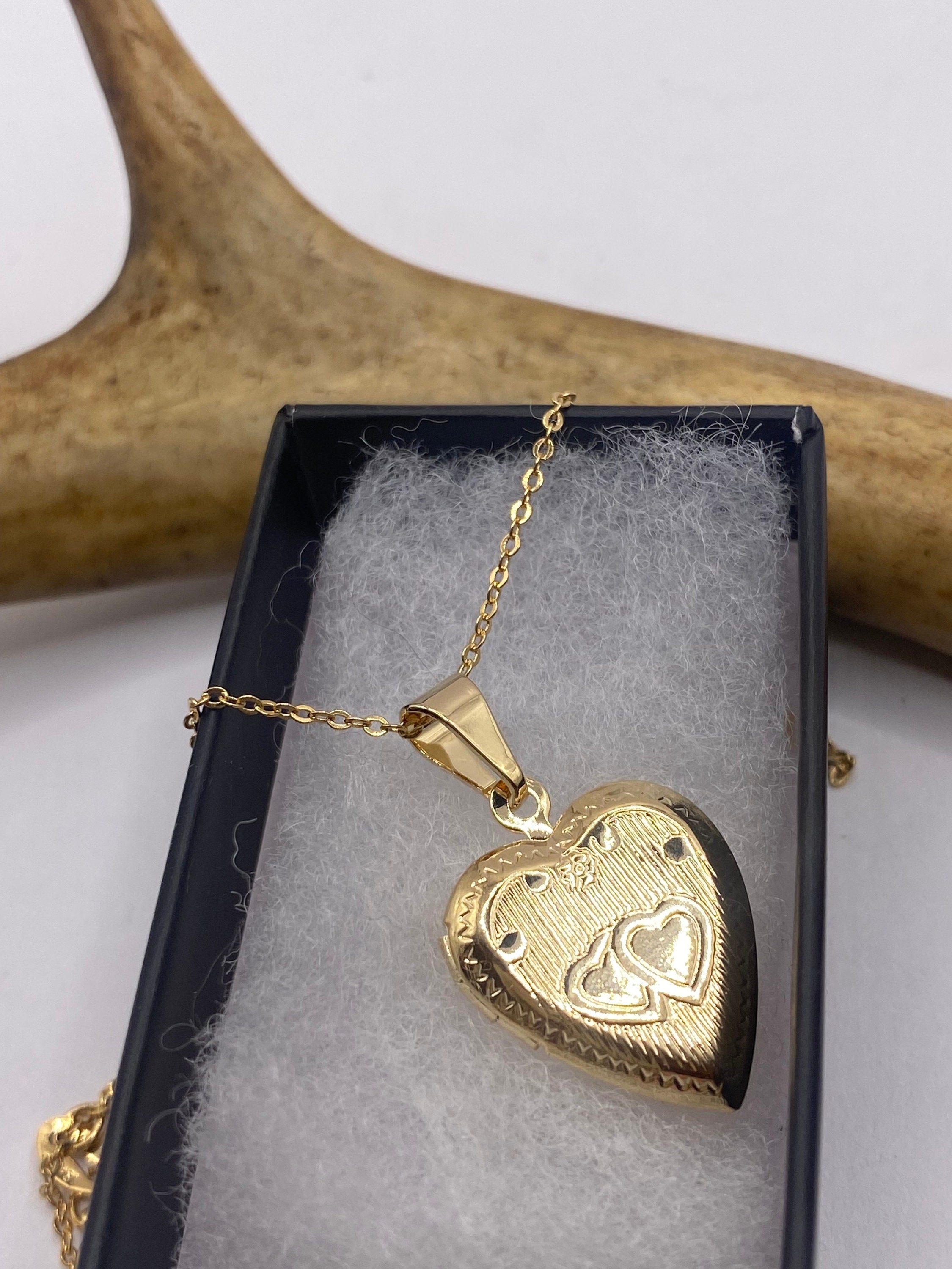 Vintage Photo Locket | Tiny 9k Gold Filled Heart Pendant Photo Memory Charm Engraved Flower | Golden 925 Sterling Silver Chain Necklace