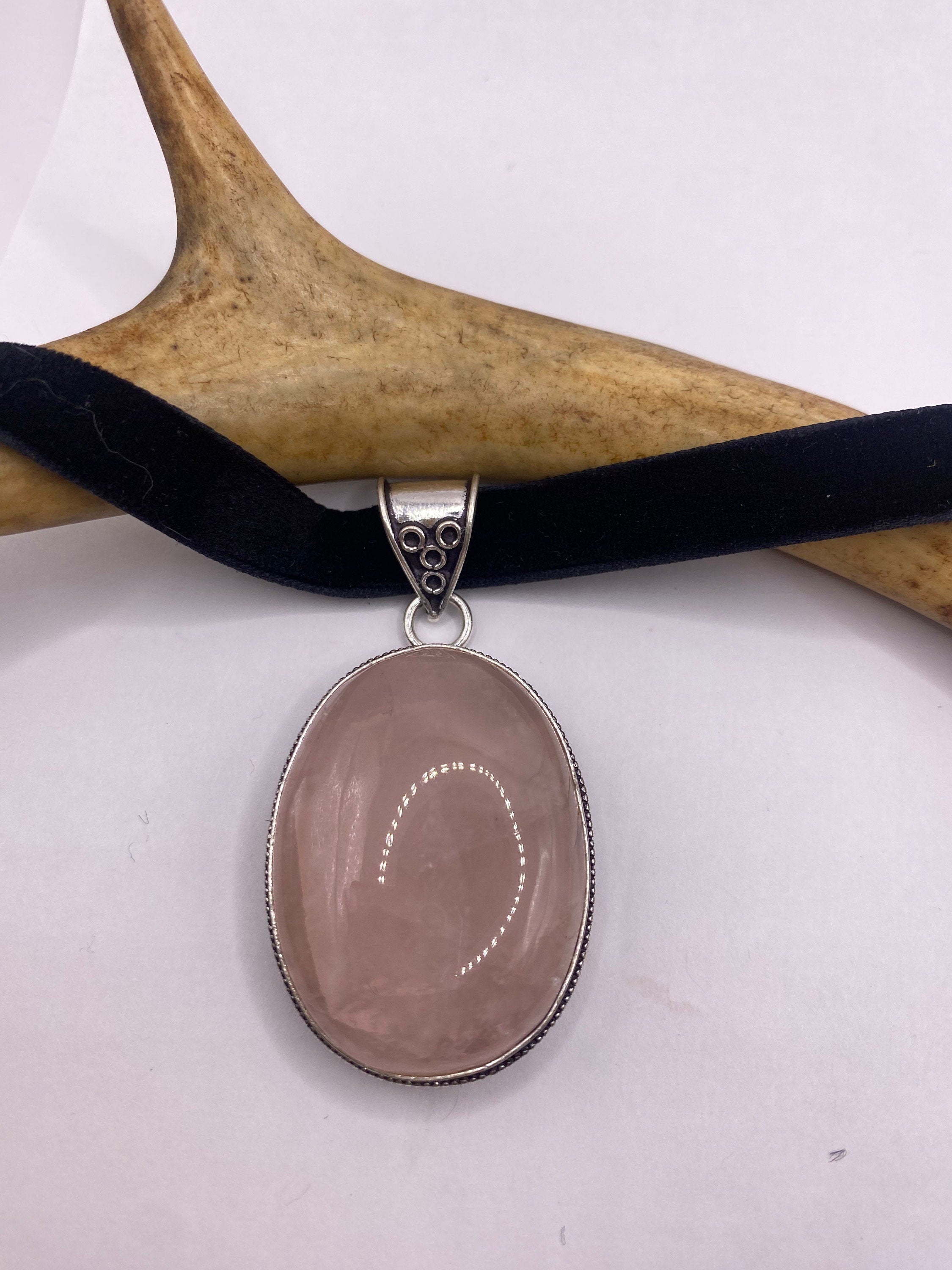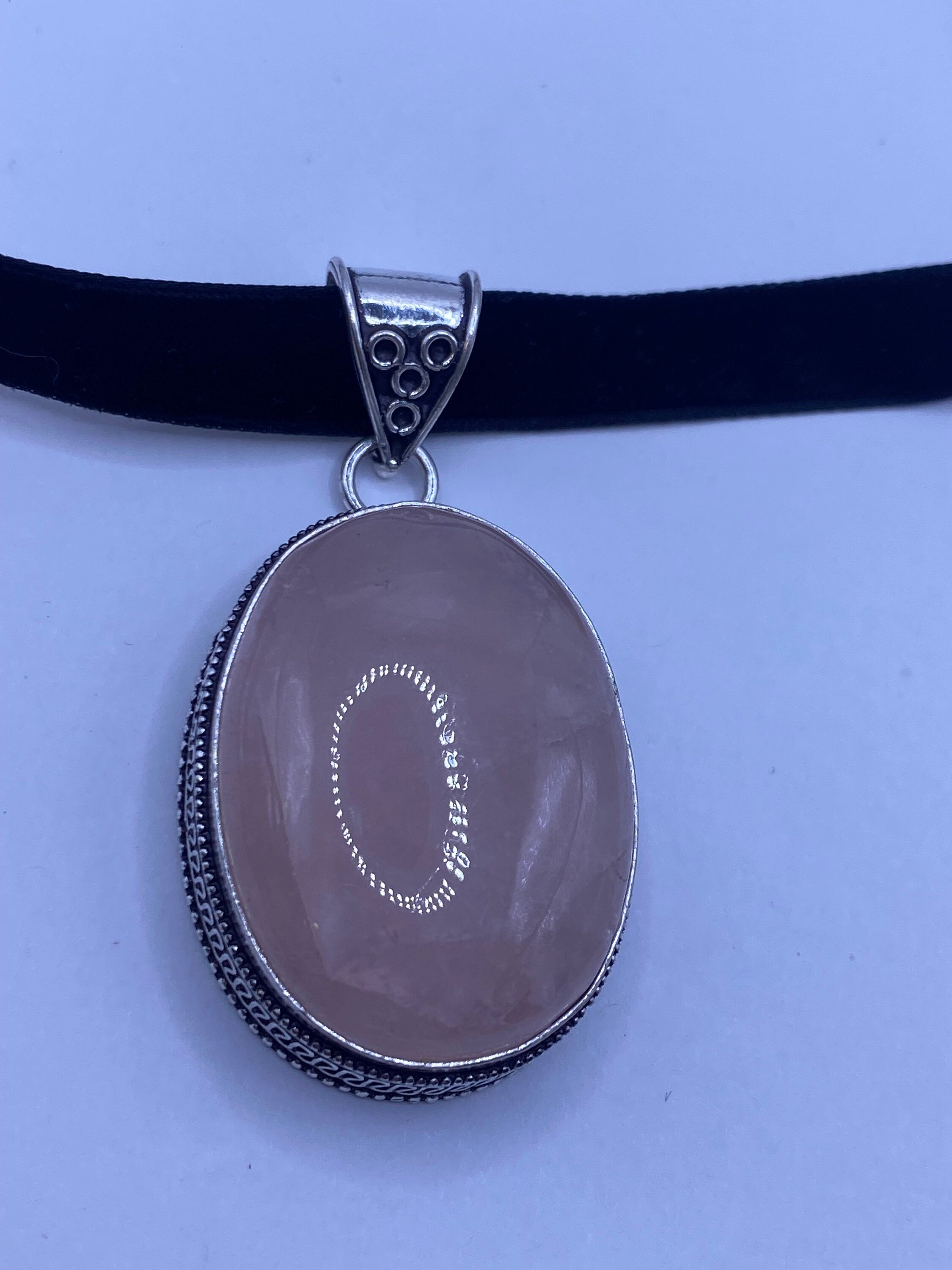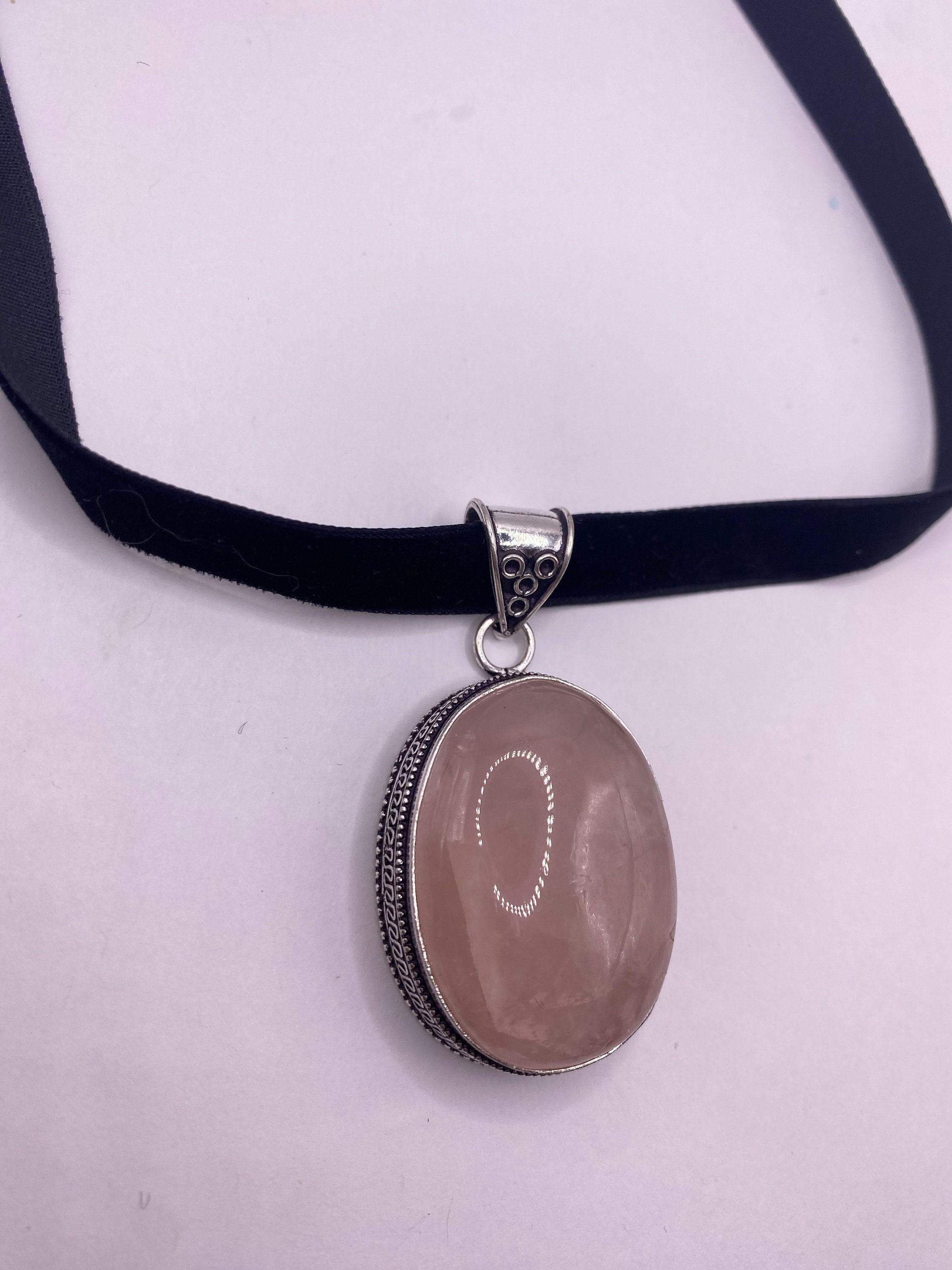 Vintage Pink Rose Quartz Boho Black Velvet Choker Silver Necklace - oval shape
