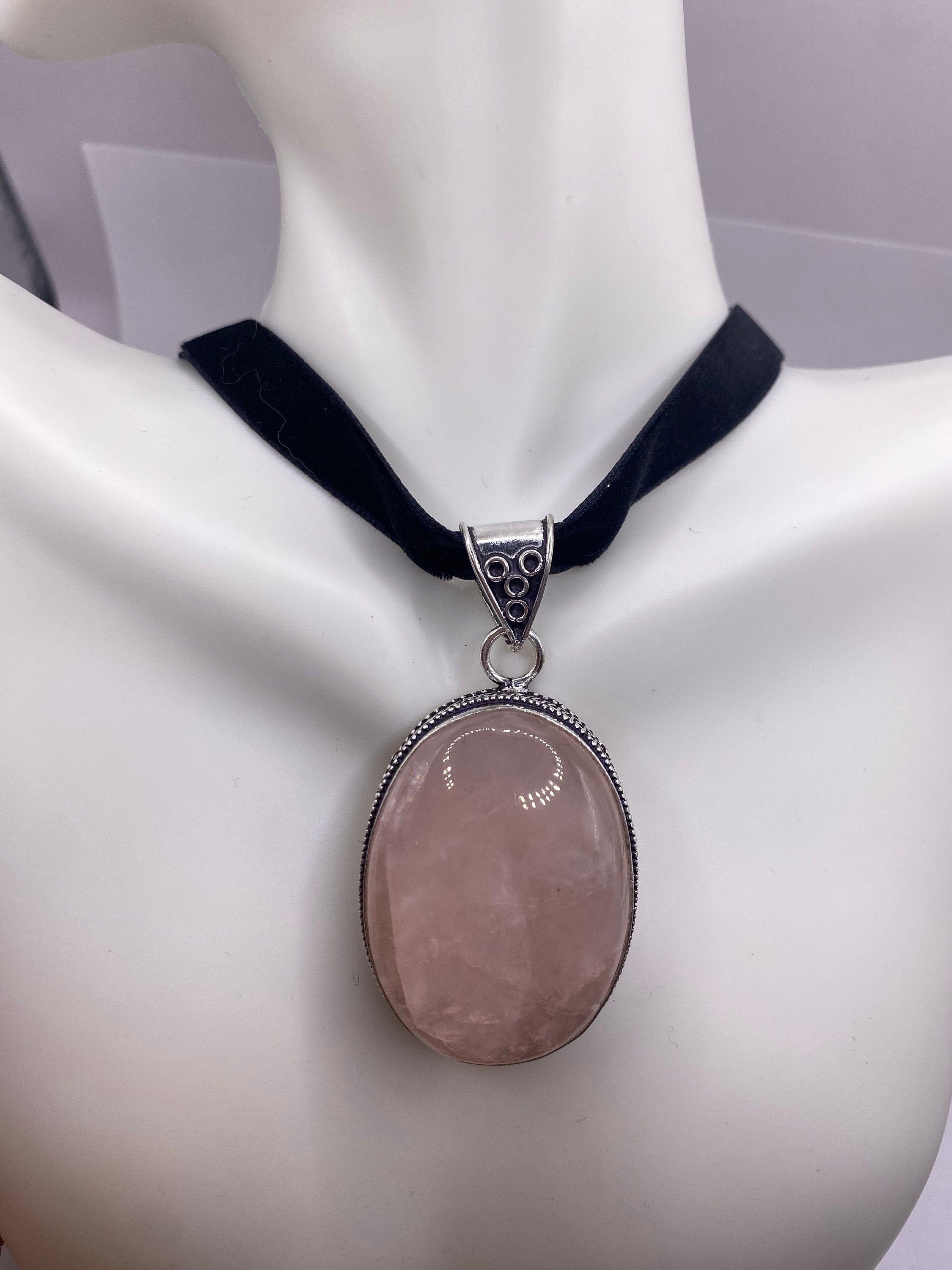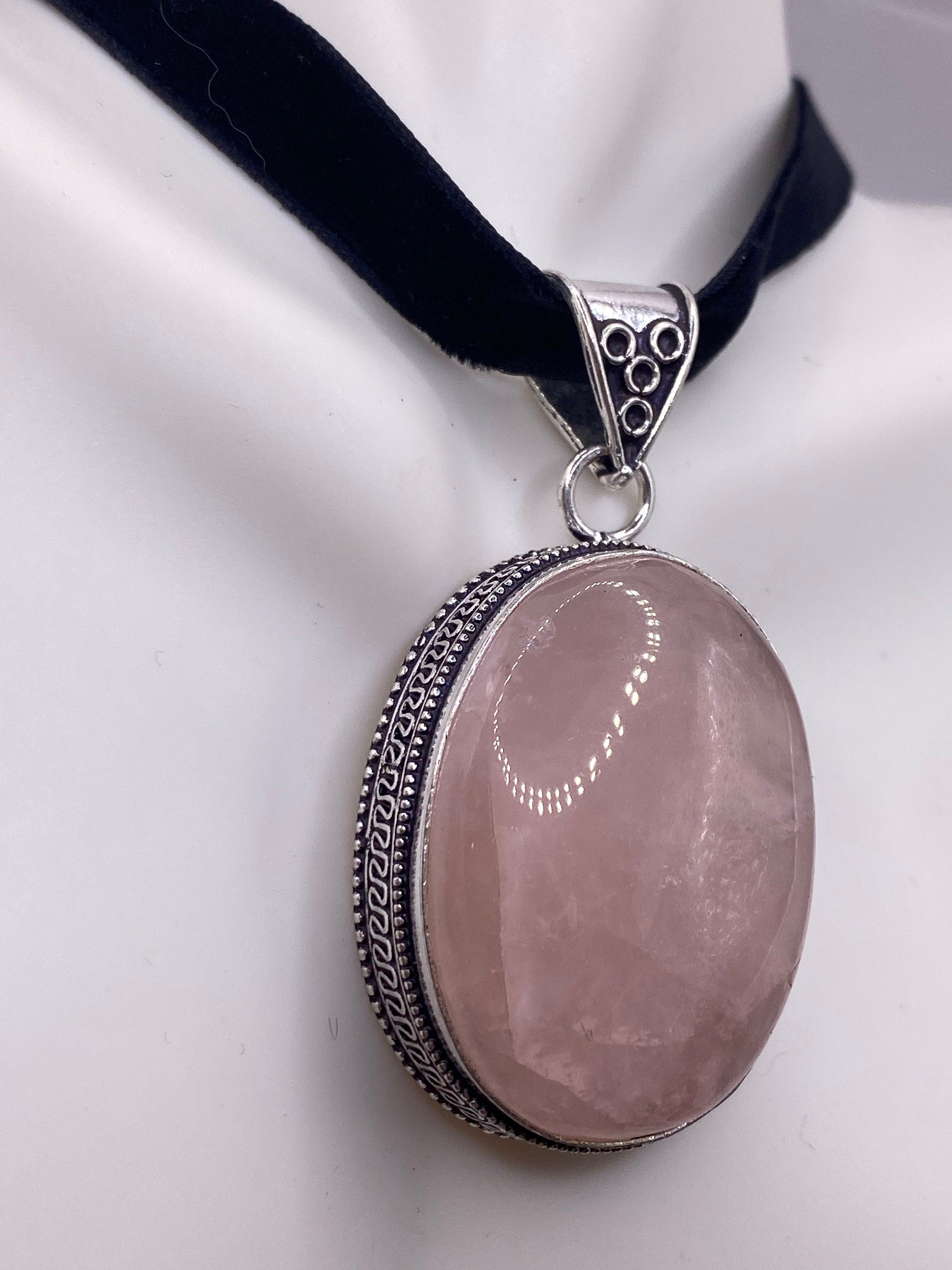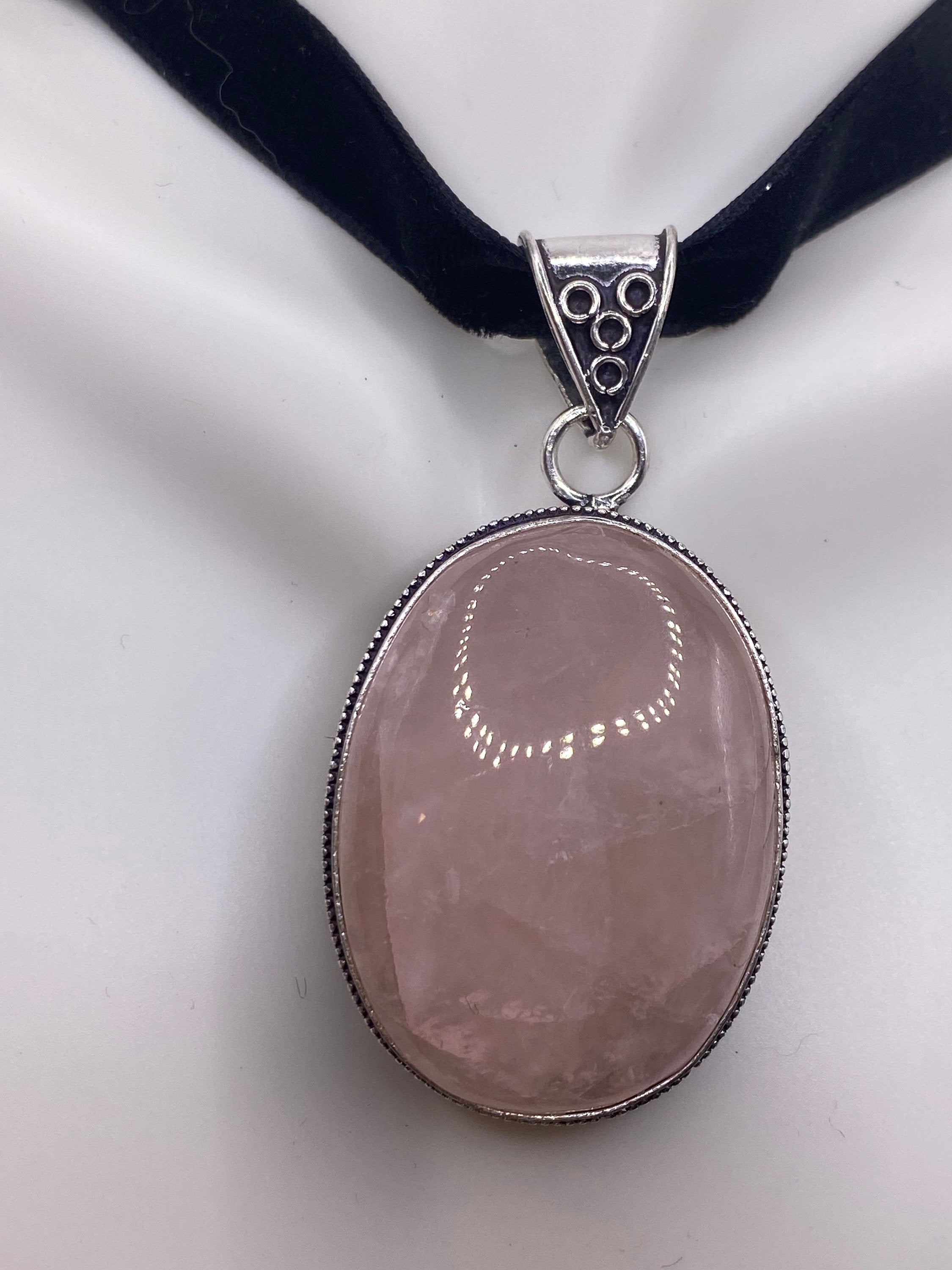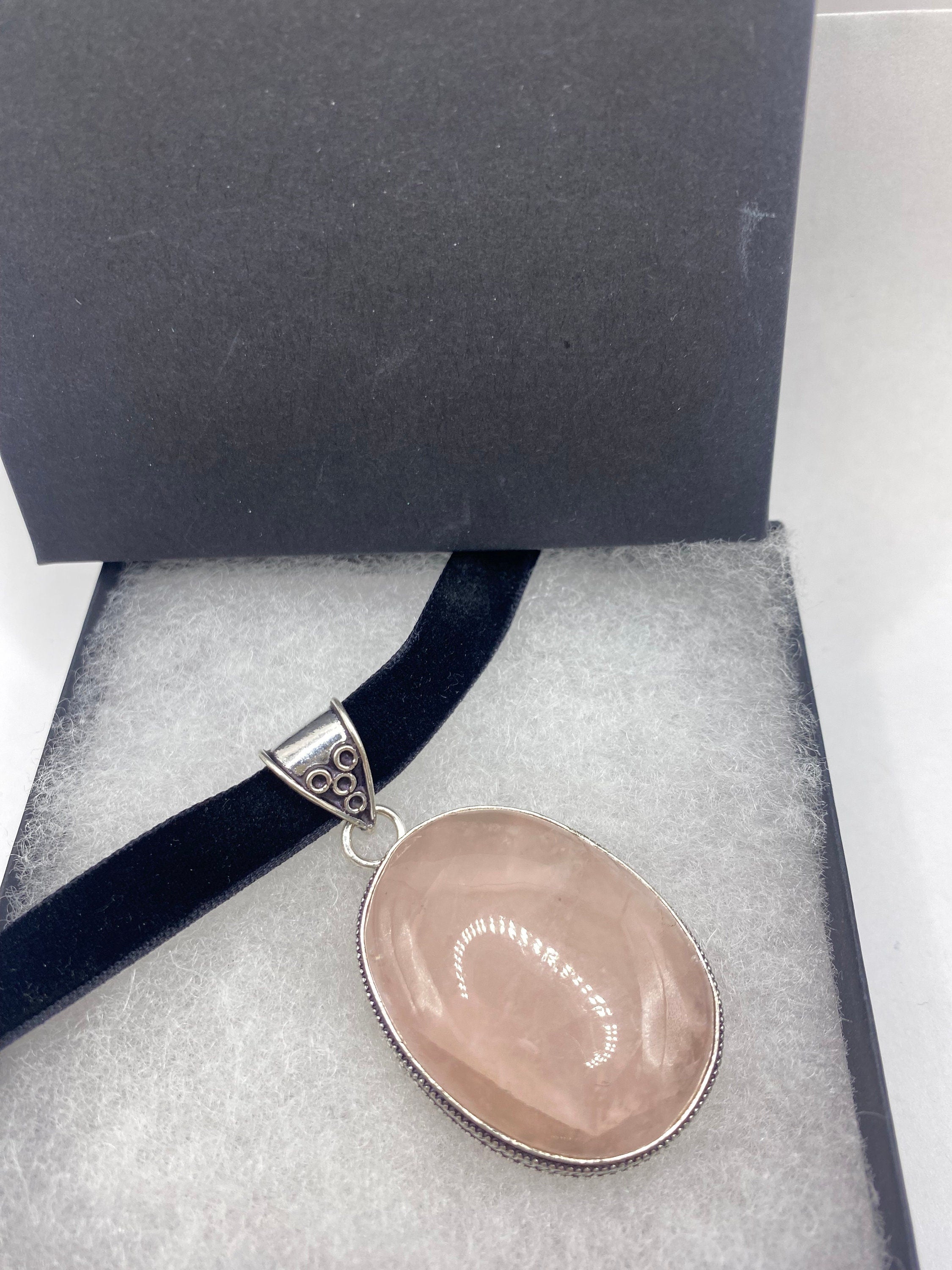 Vintage Pink Rose Quartz Boho Black Velvet Choker Silver Necklace - oval shape