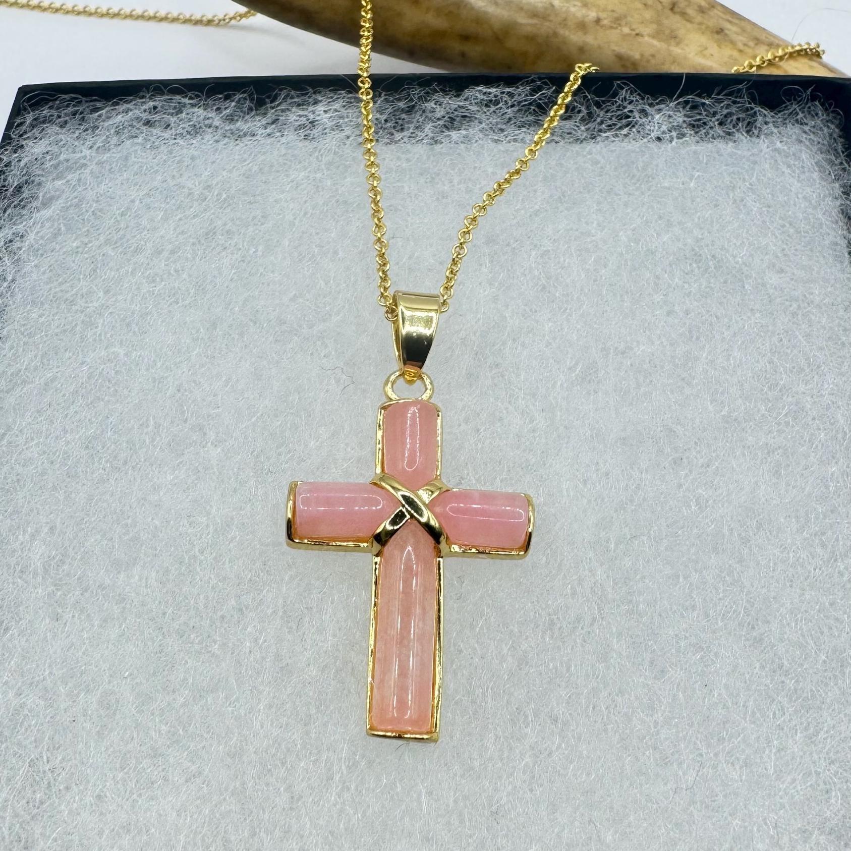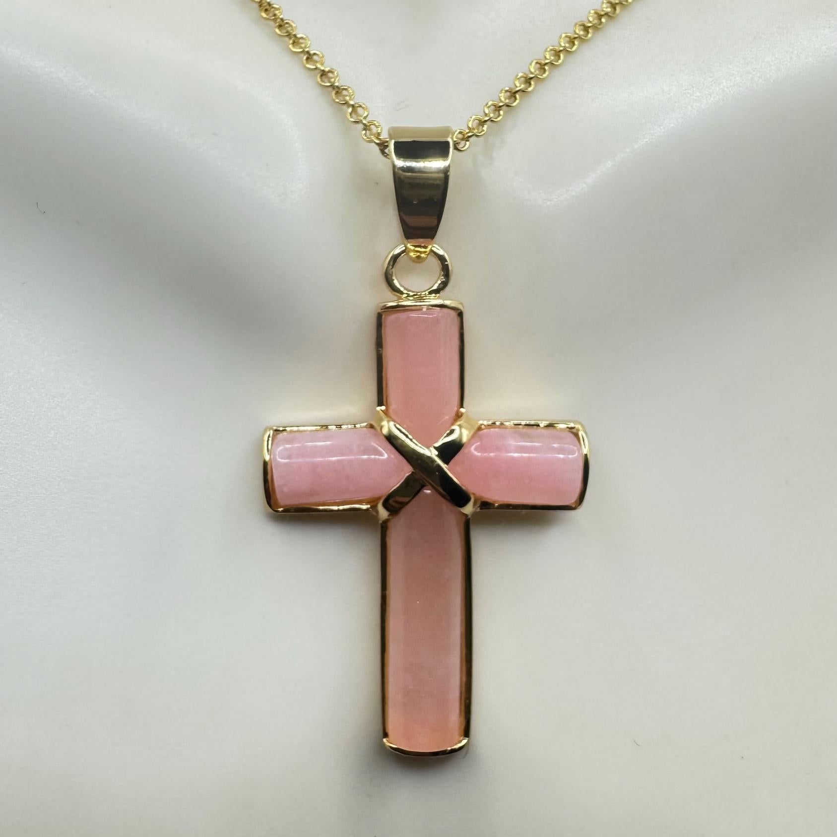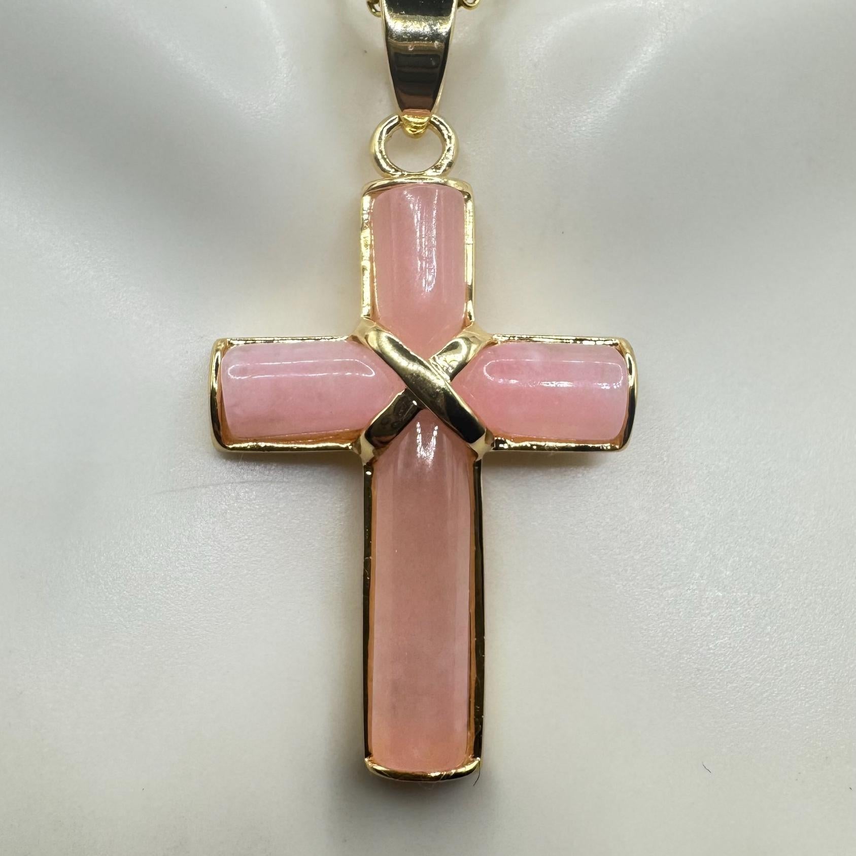 Vintage Pink Rose Quartz Cross Gold Filled Necklace