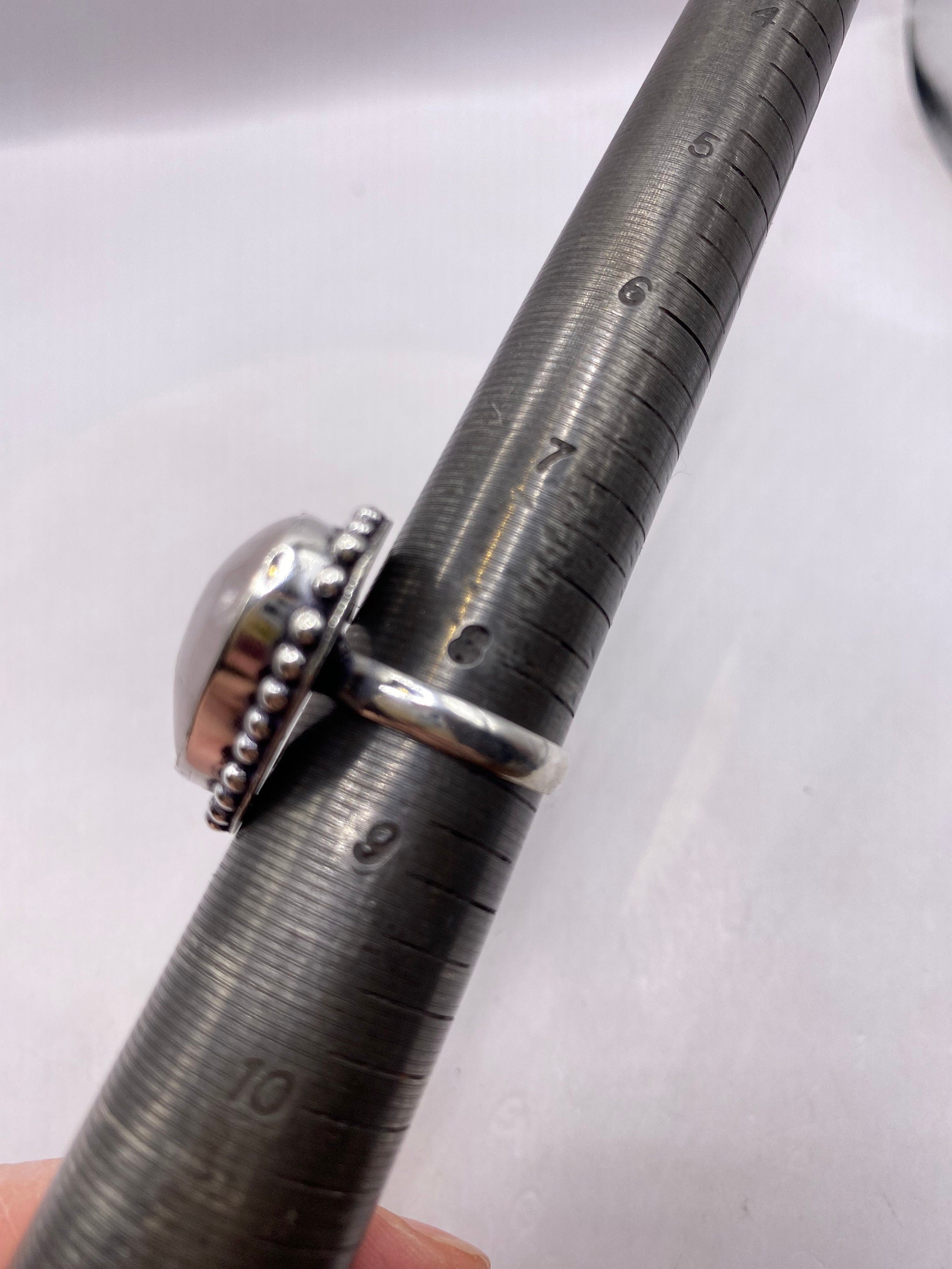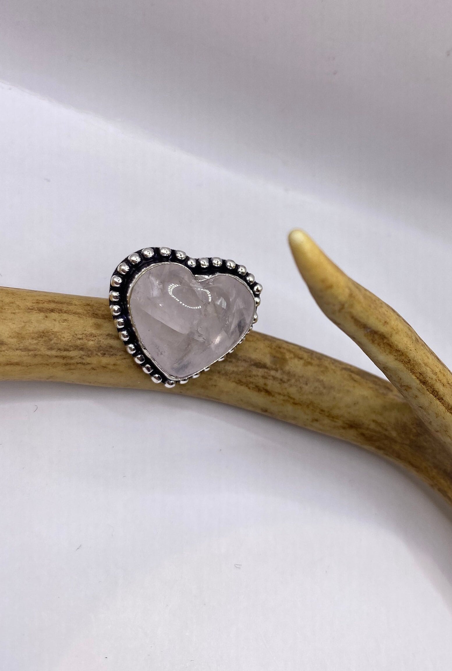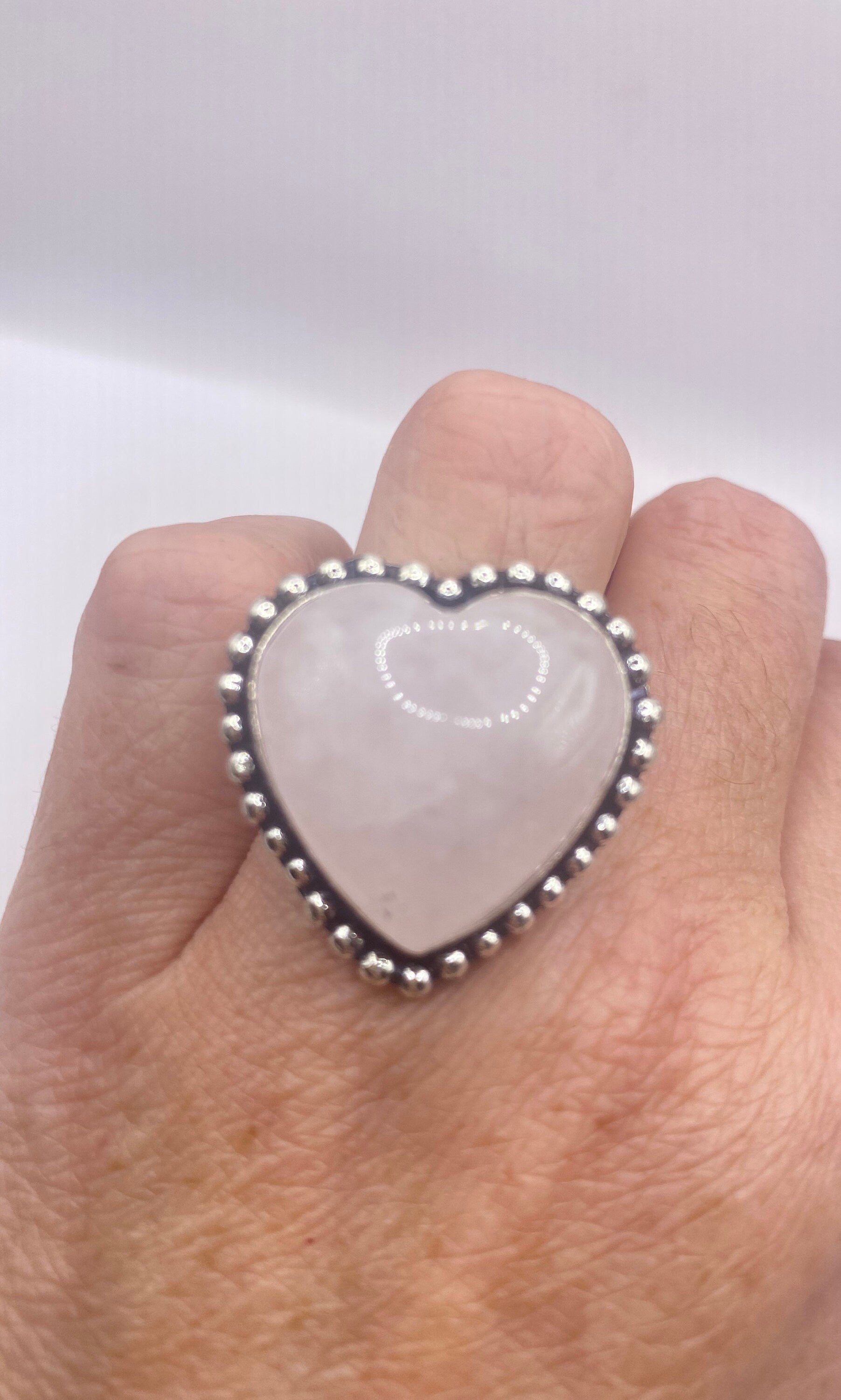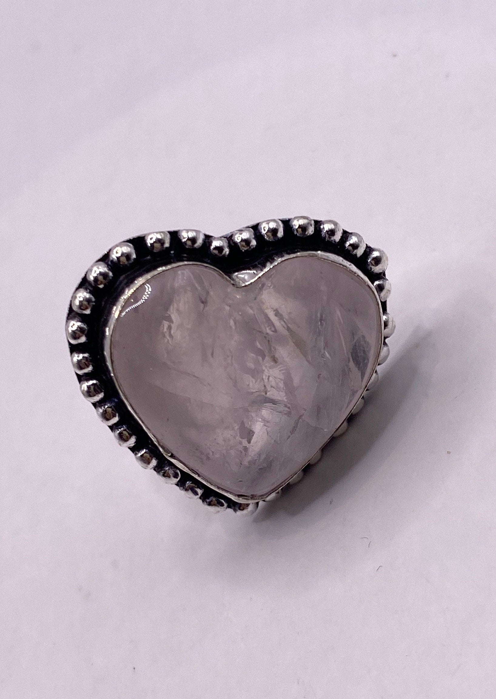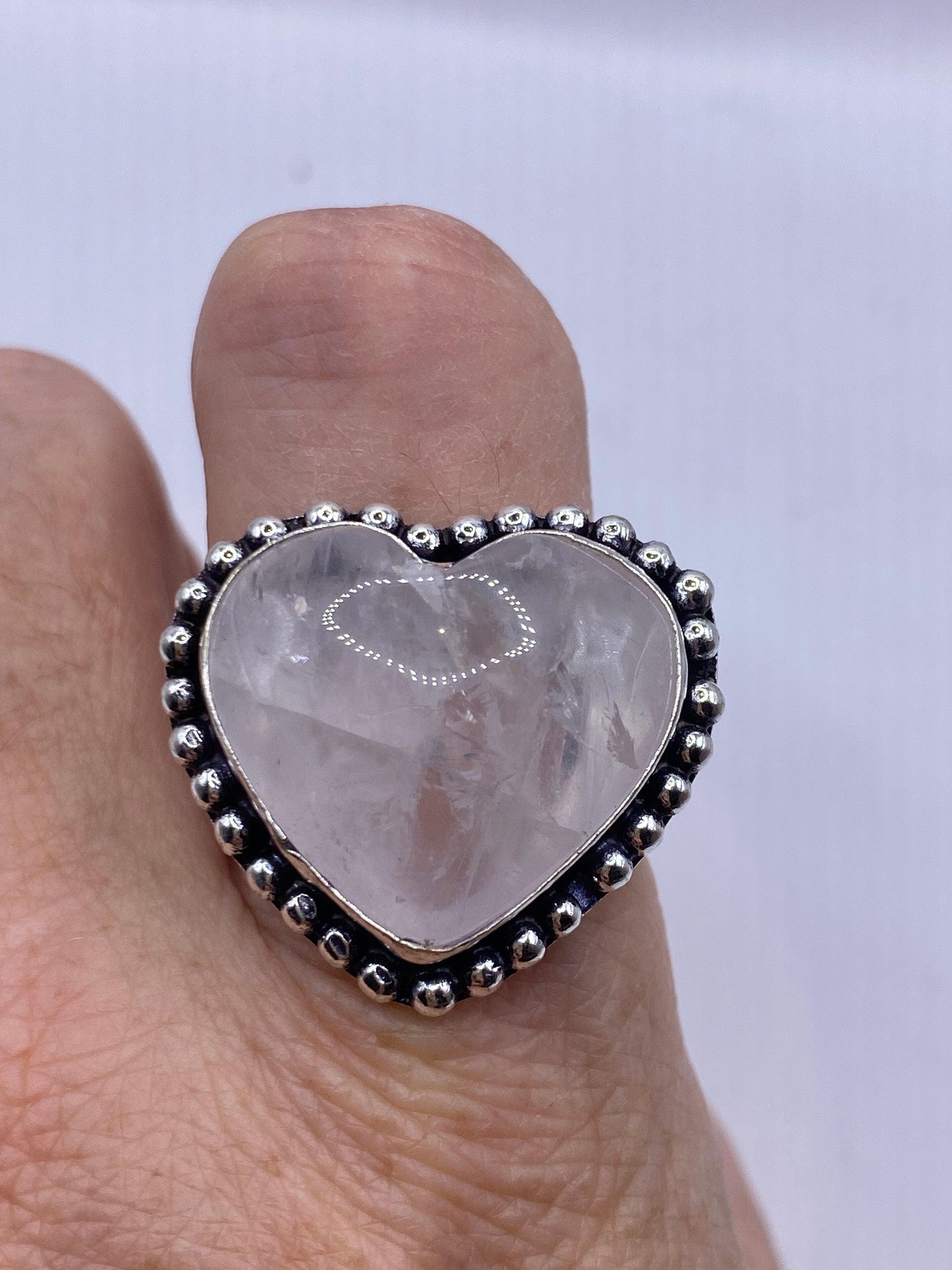 Vintage Pink Rose Quartz Heart Ring Silver Band