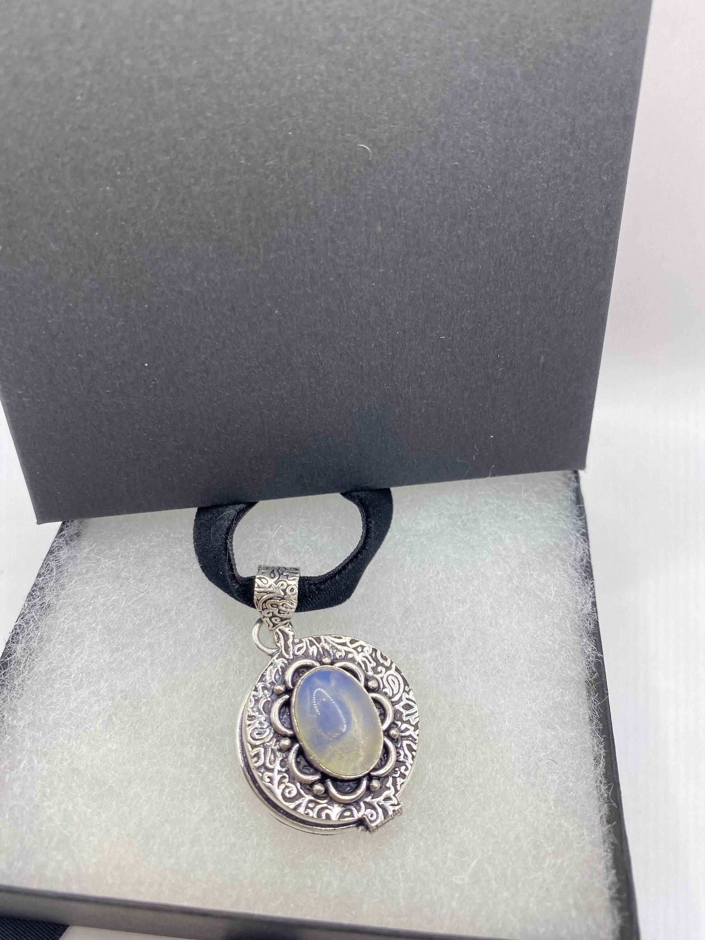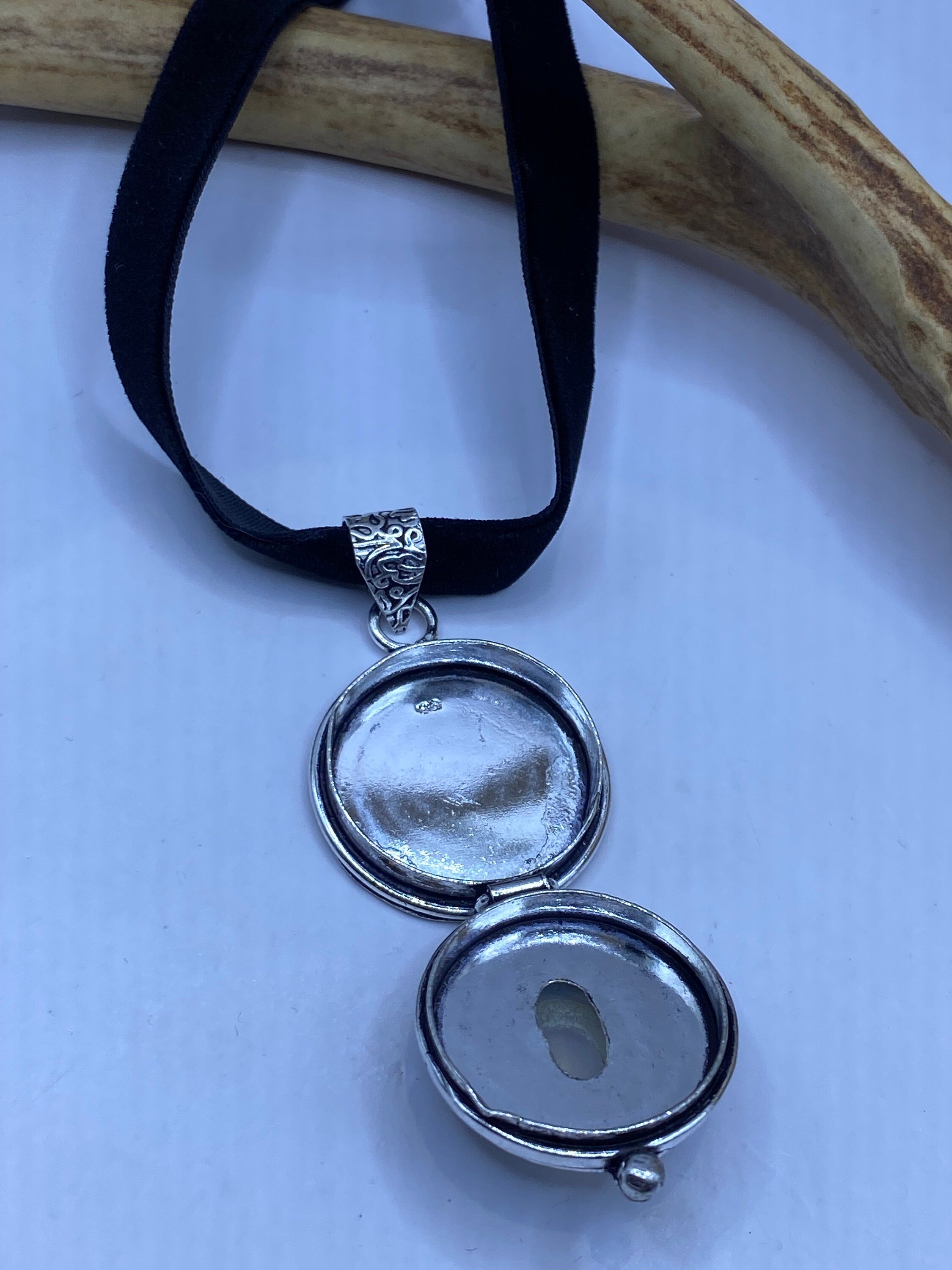 Vintage locket white bronze silver Poison pillbox choker with hand set milk glass Can hold a nice sized photo. Laminate... Read more