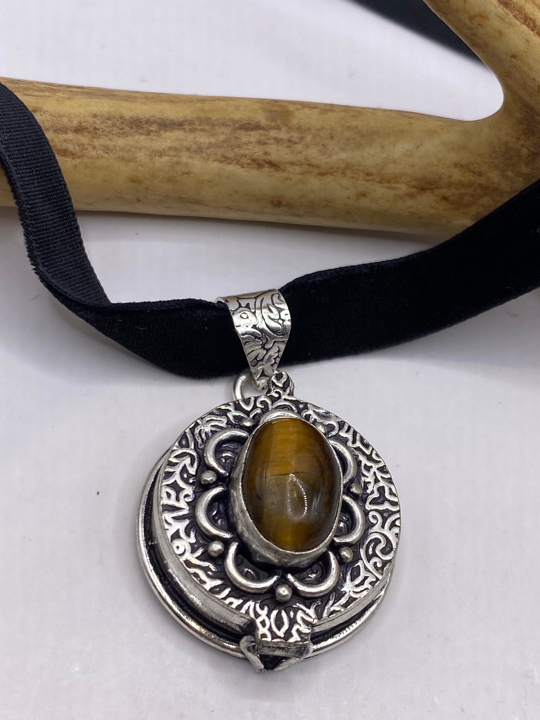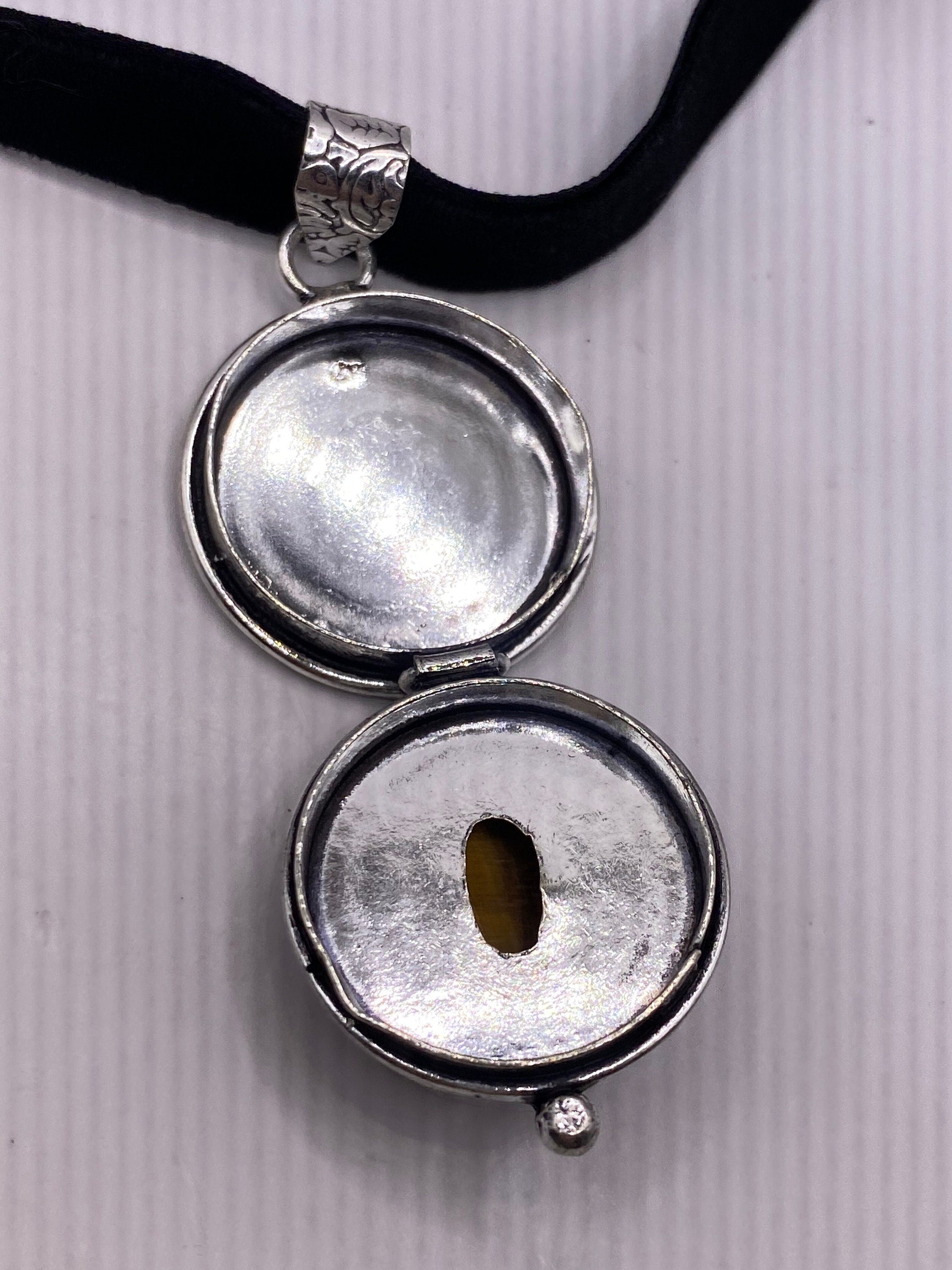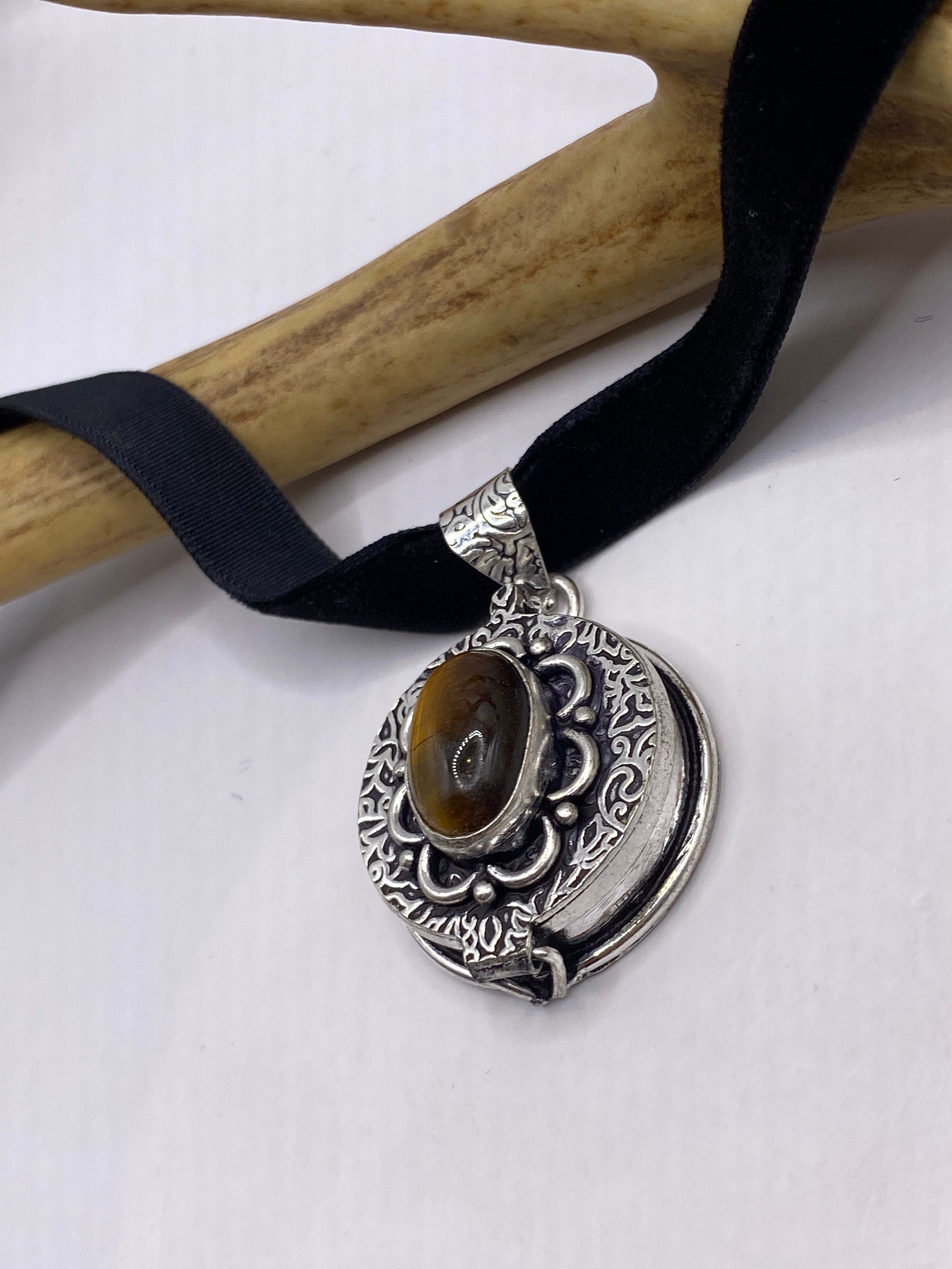 Vintage Poison Pillbox Velvet Choker Locket - Silver, White Bronze, Tigers Eye, Antique Design, Necklace
