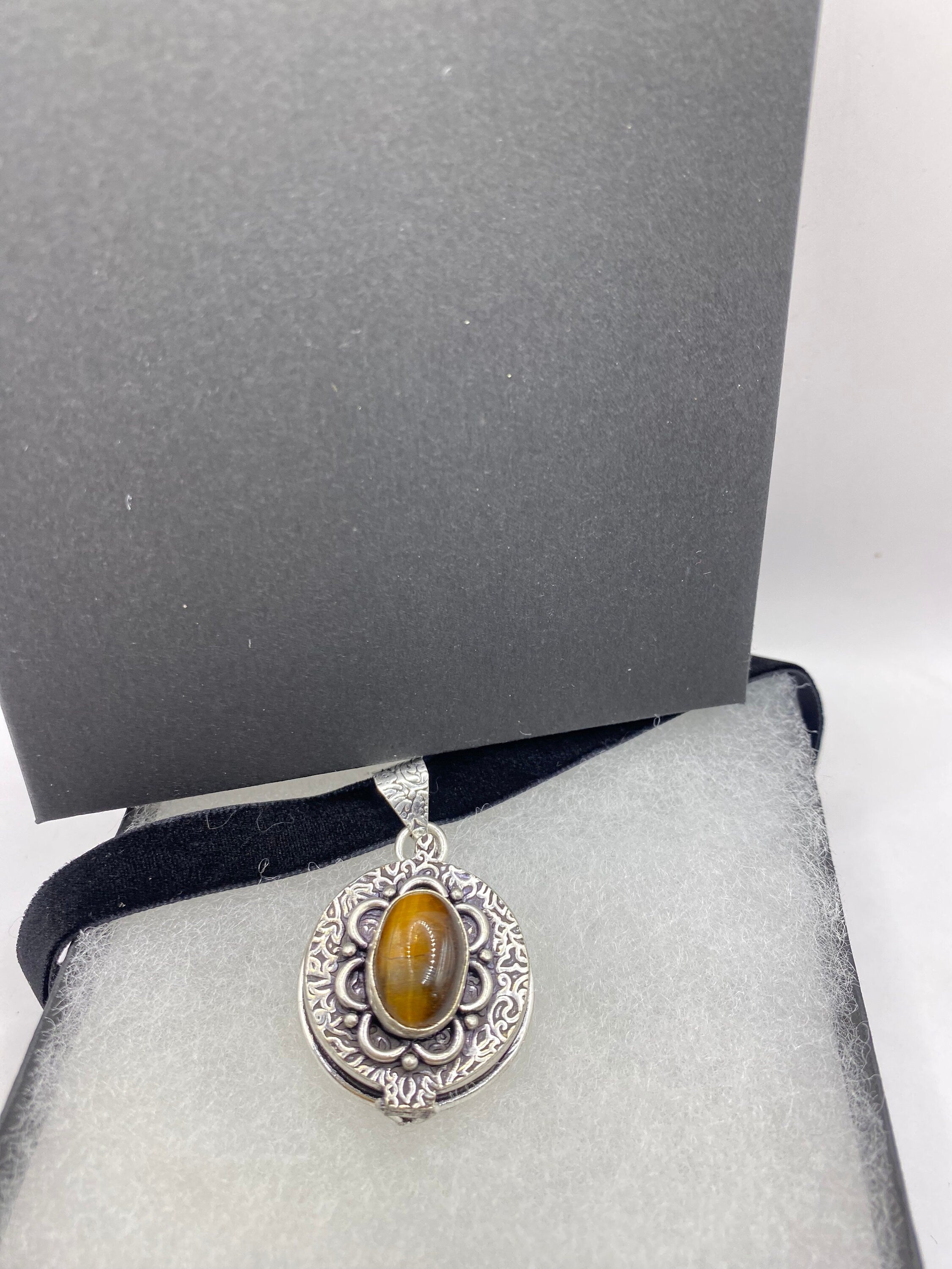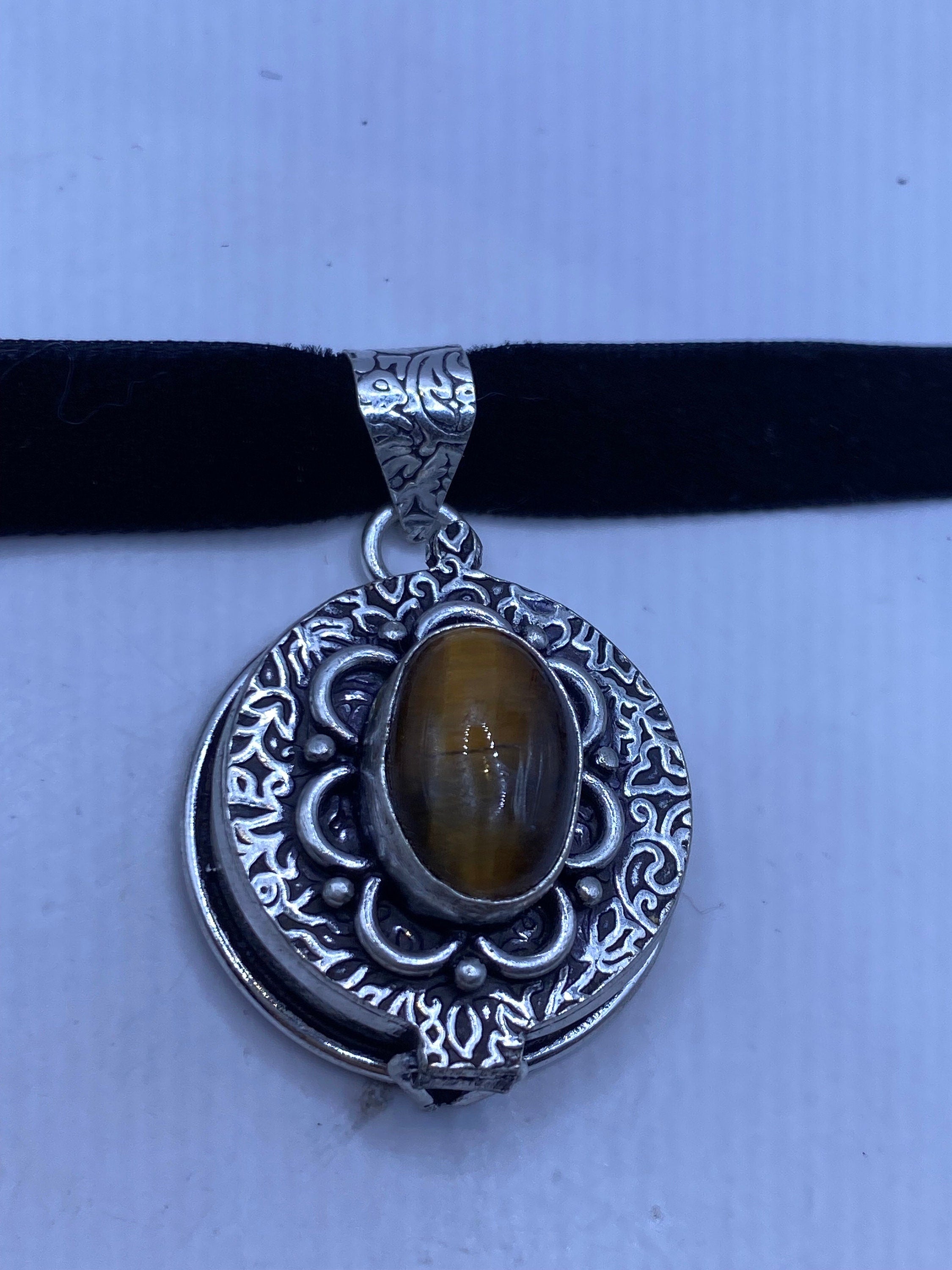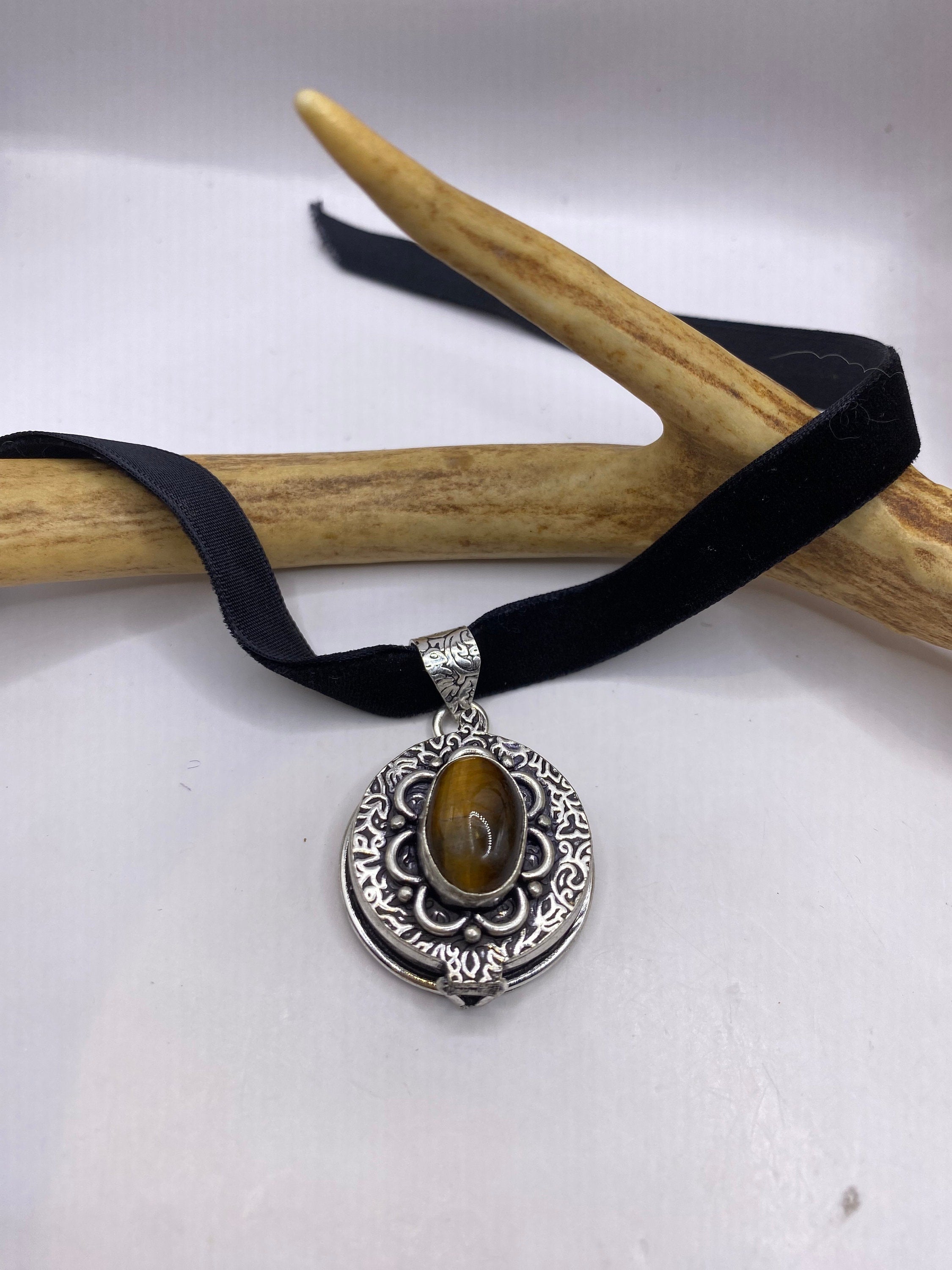 Vintage Poison Pillbox Velvet Choker Locket - Silver, White Bronze, Tigers Eye, Antique Design, Necklace