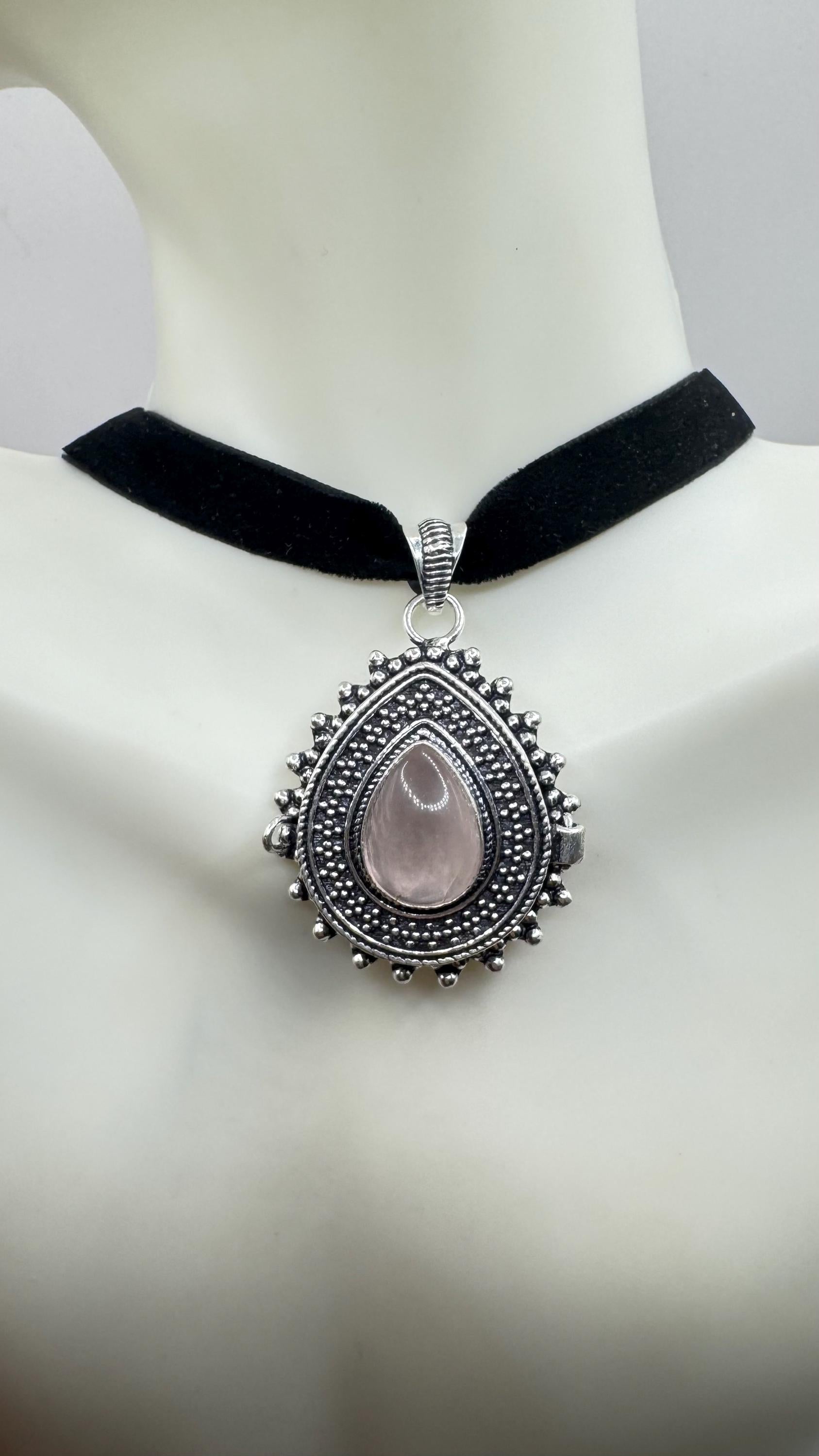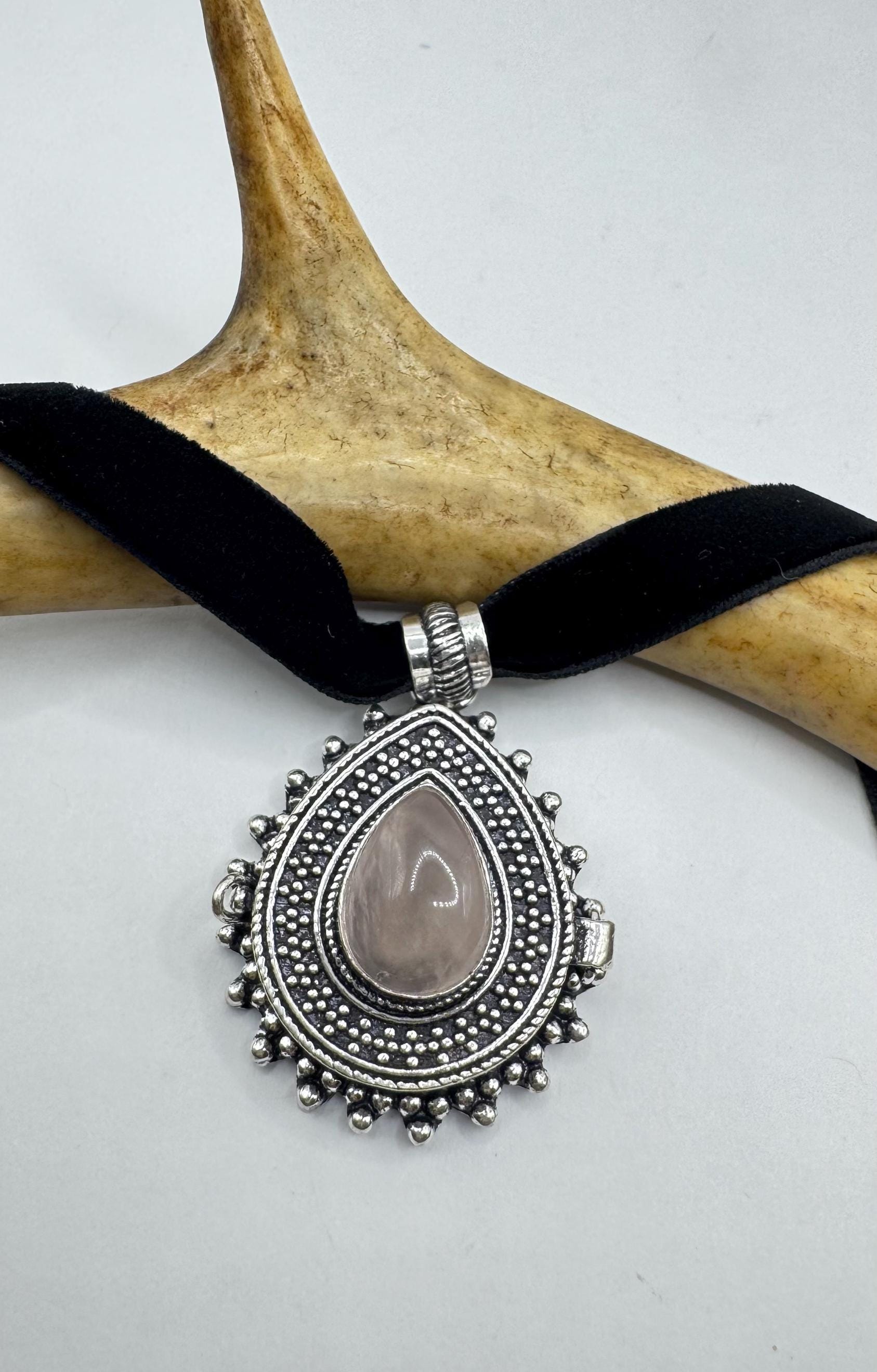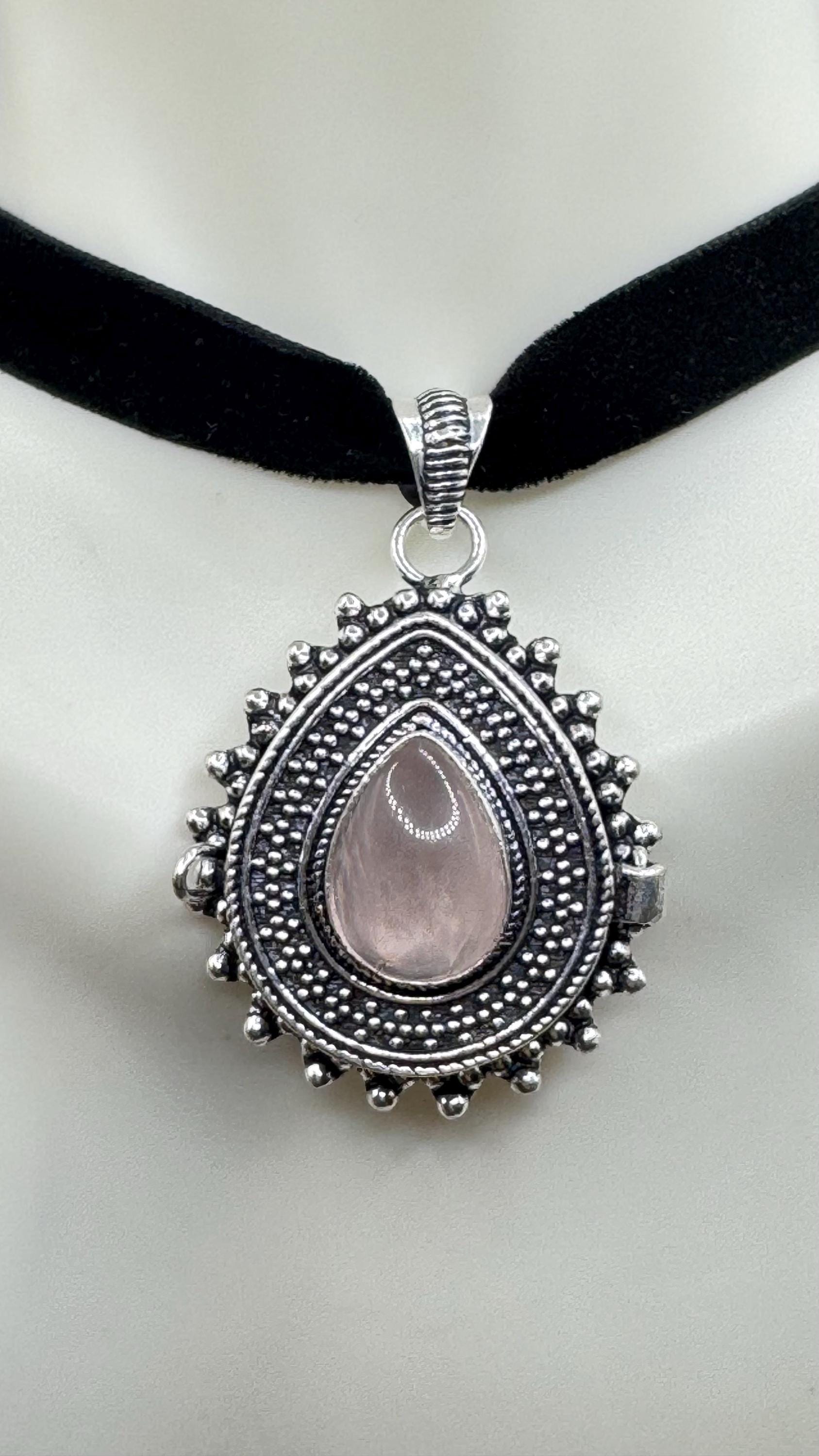 Vintage Poison Pillbox Velvet Choker with Photo Locket with Rose Quartz in Silver and White Bronze