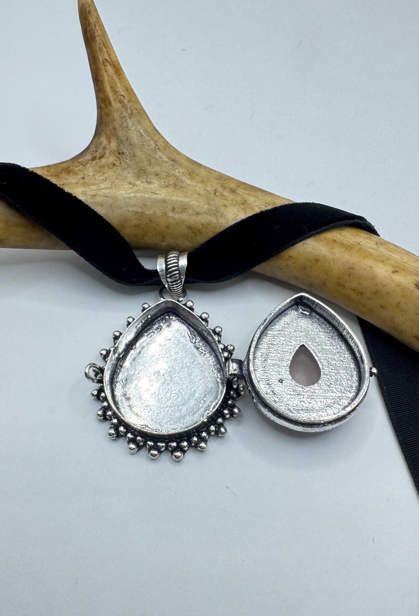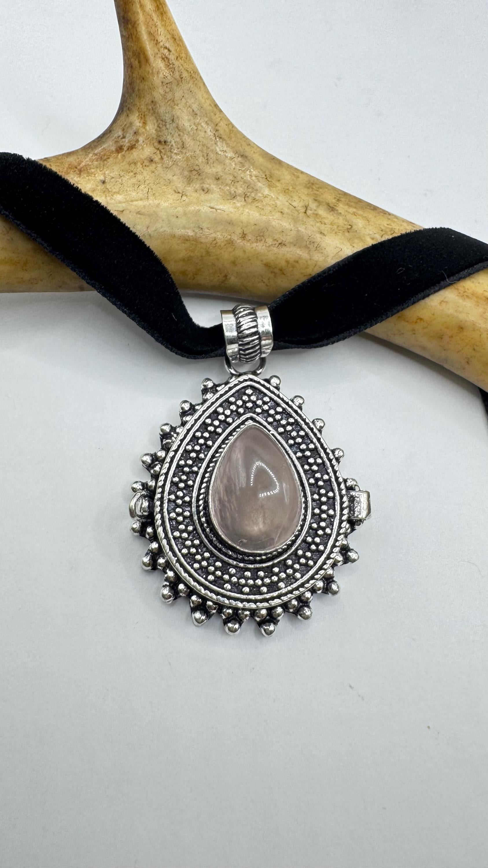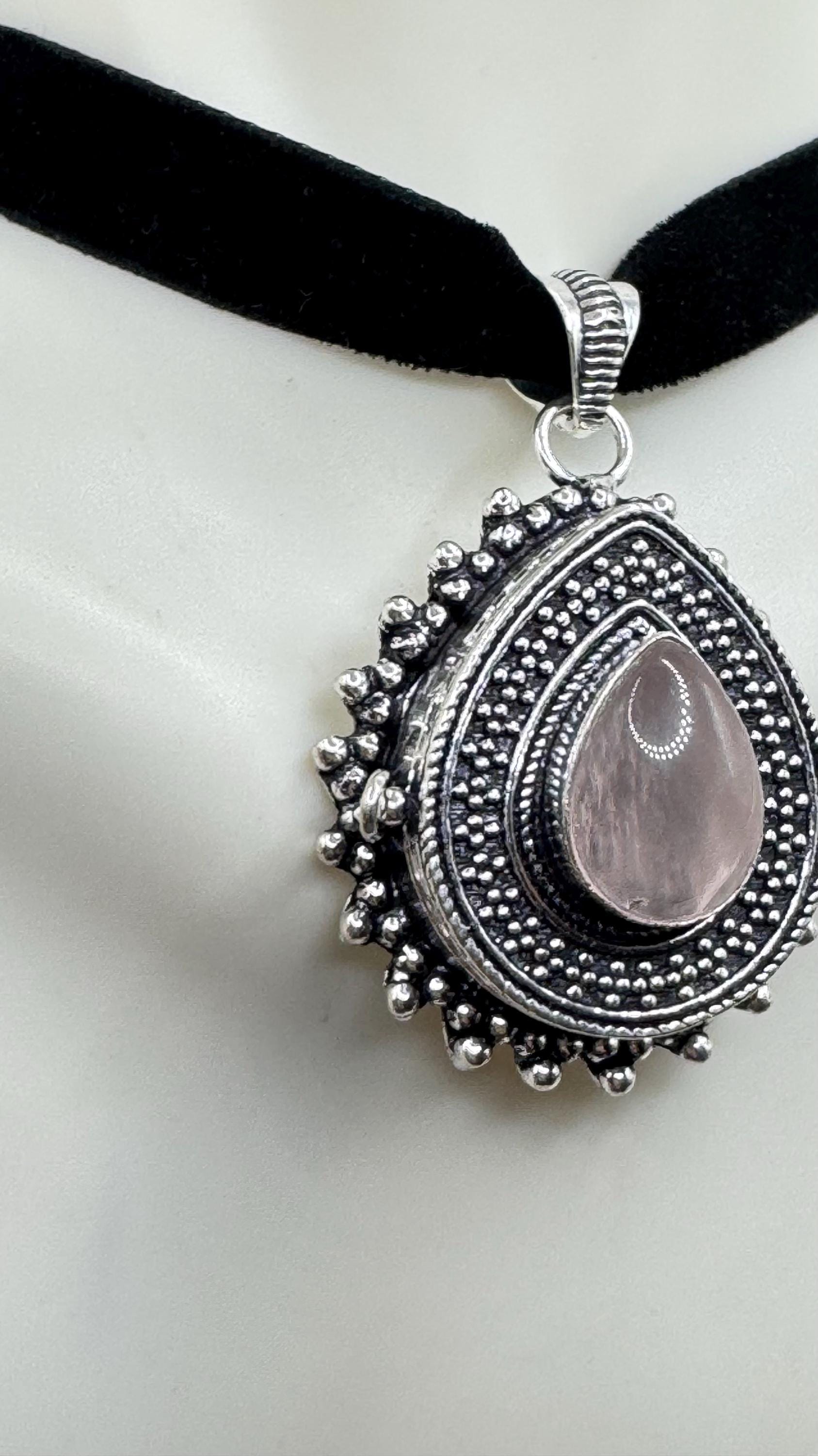 Vintage Poison Pillbox Velvet Choker with Photo Locket with Rose Quartz in Silver and White Bronze