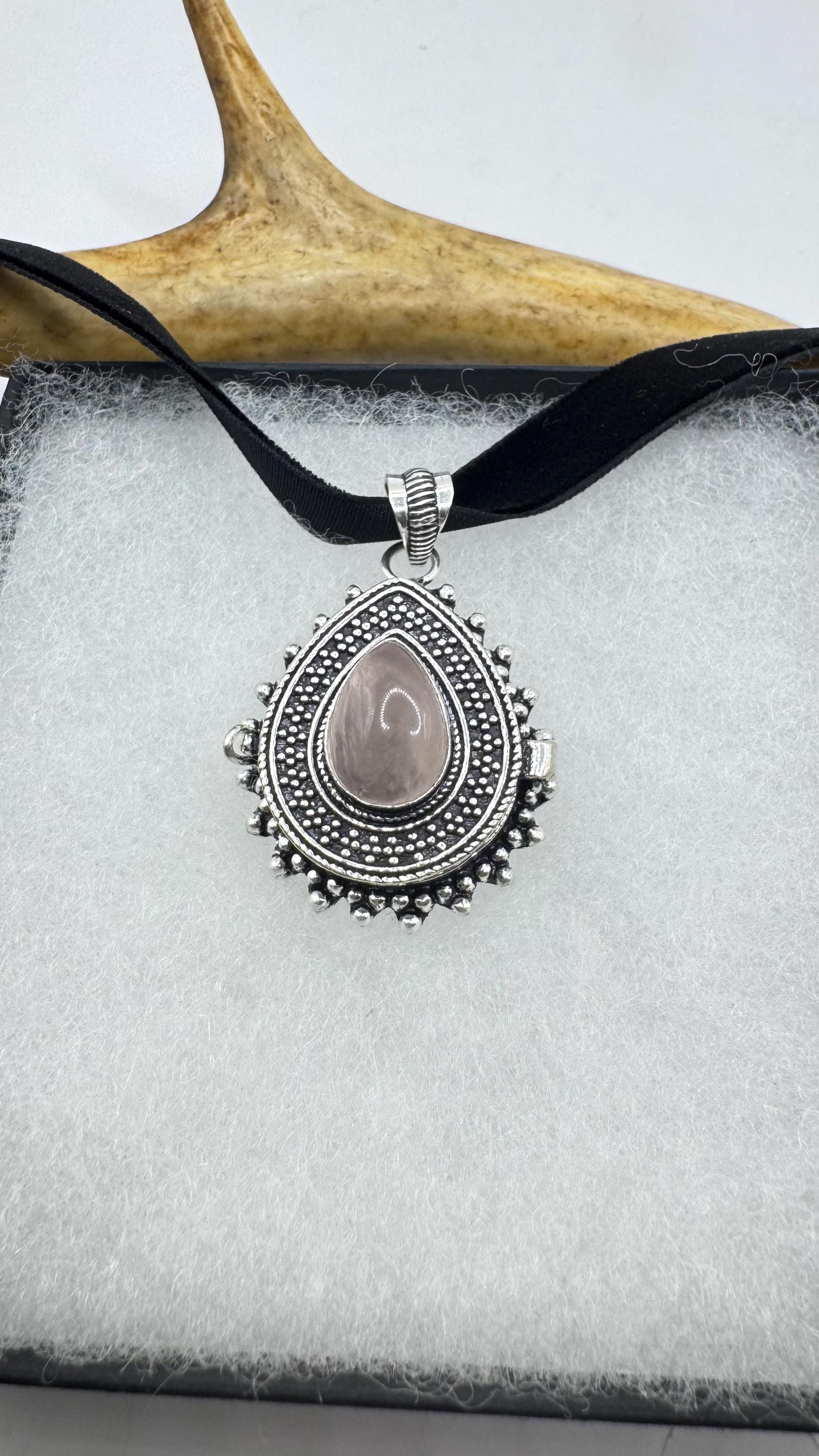 Vintage locket white bronze silver Poison pillbox choker with hand set pink rose quartz gemstone Can hold a nice sized... Read more