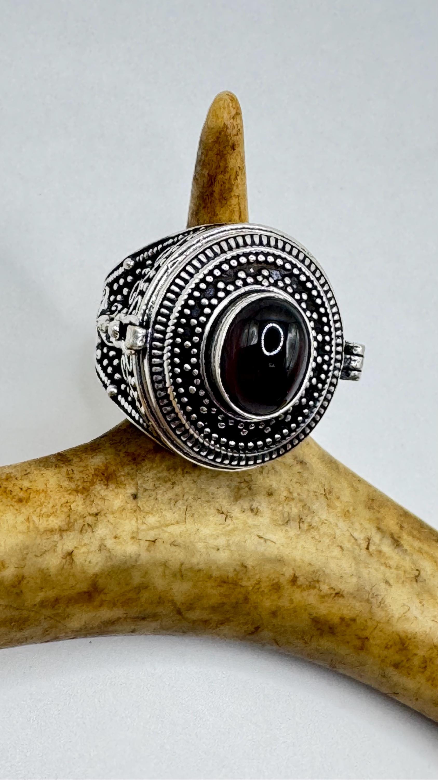 Vintage Poison Ring | Garnet Gemstone Set in Silver Bronze Pill Box Band | Unique Gift Statement Ring | Size 7 and 9
