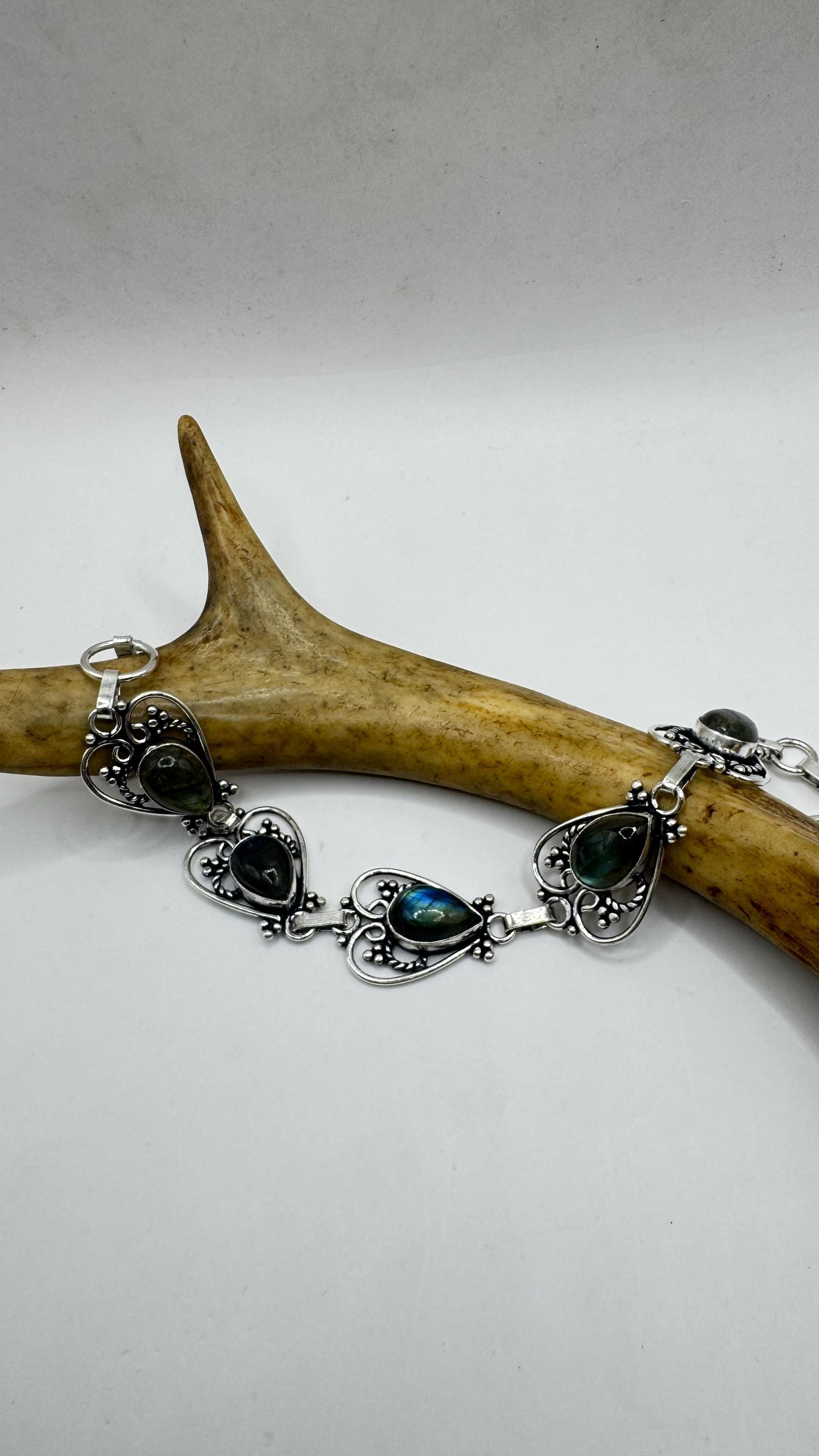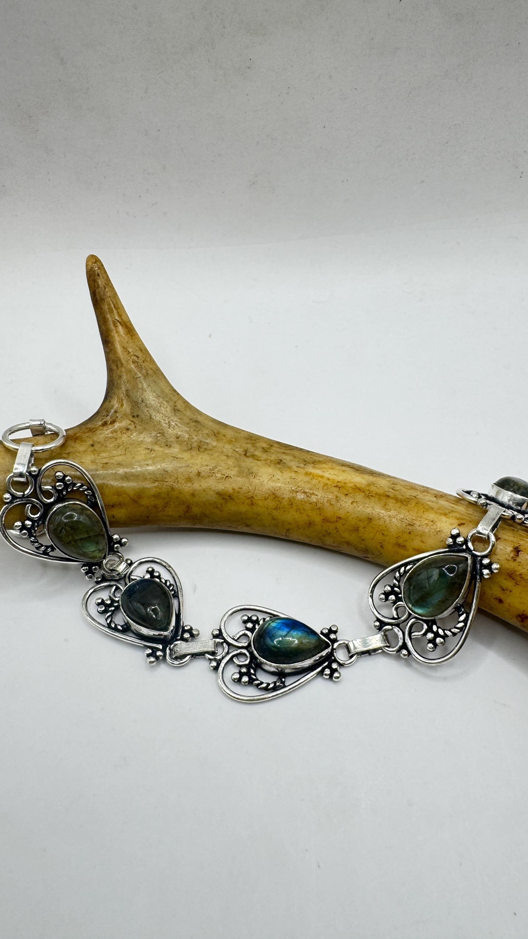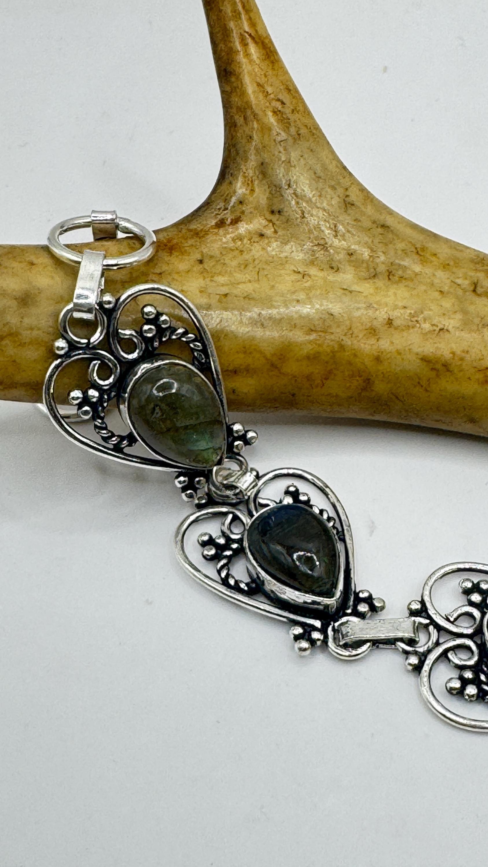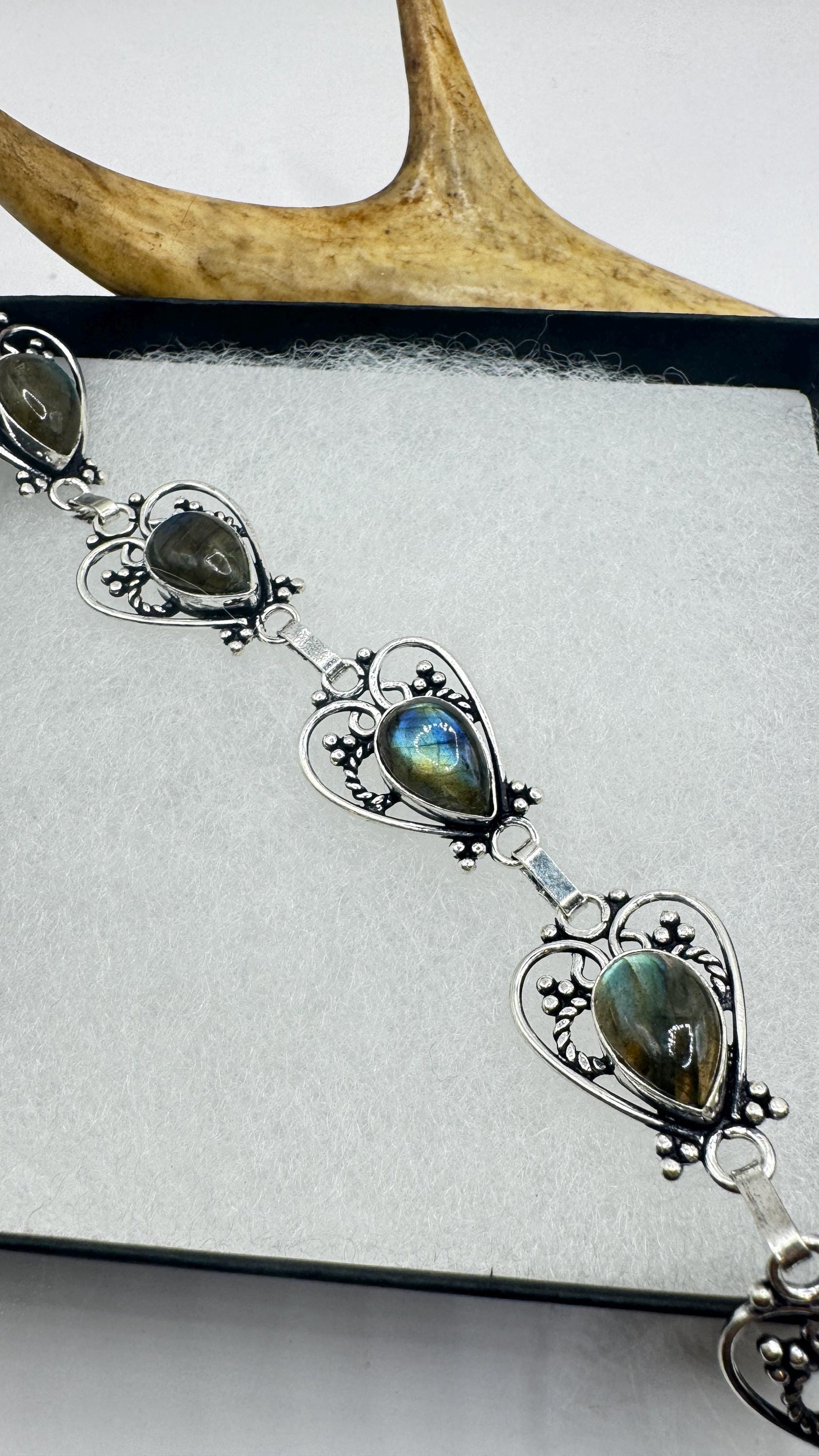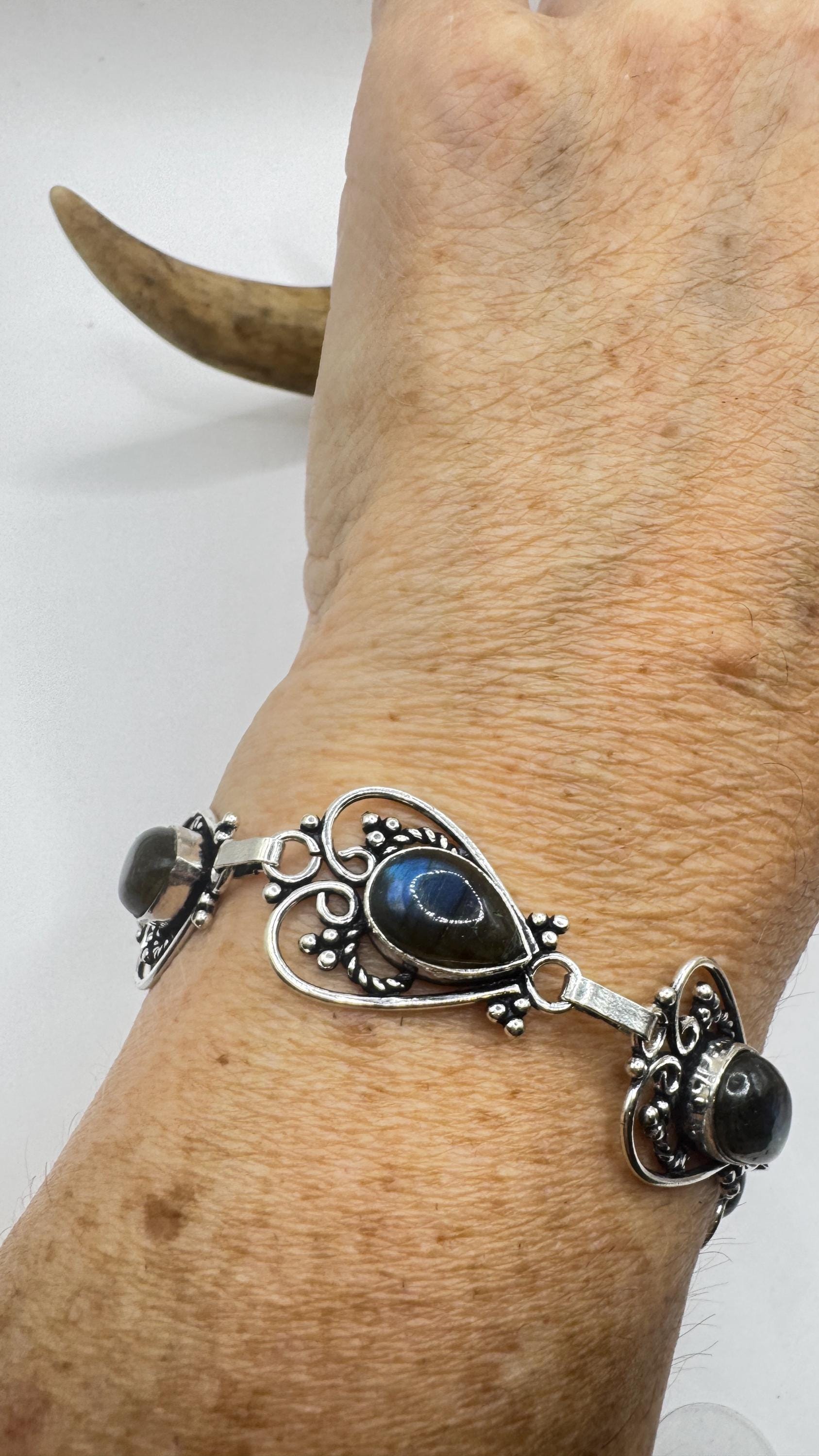 vintage chain bracelet Featuring antique green labradorite in silver bronze. marked 925 Sterling Silver but it is BRONZE Blackened with... Read more