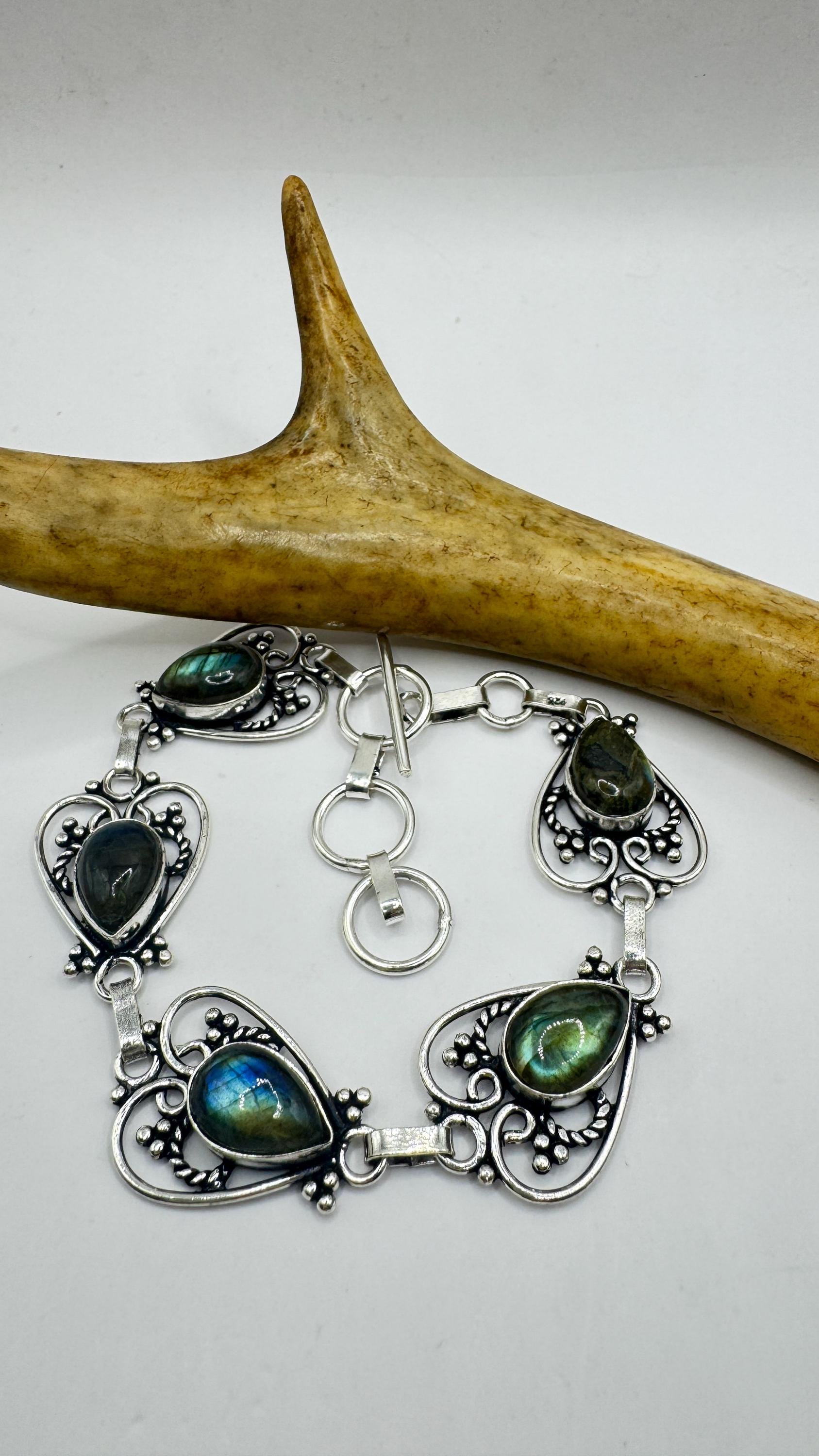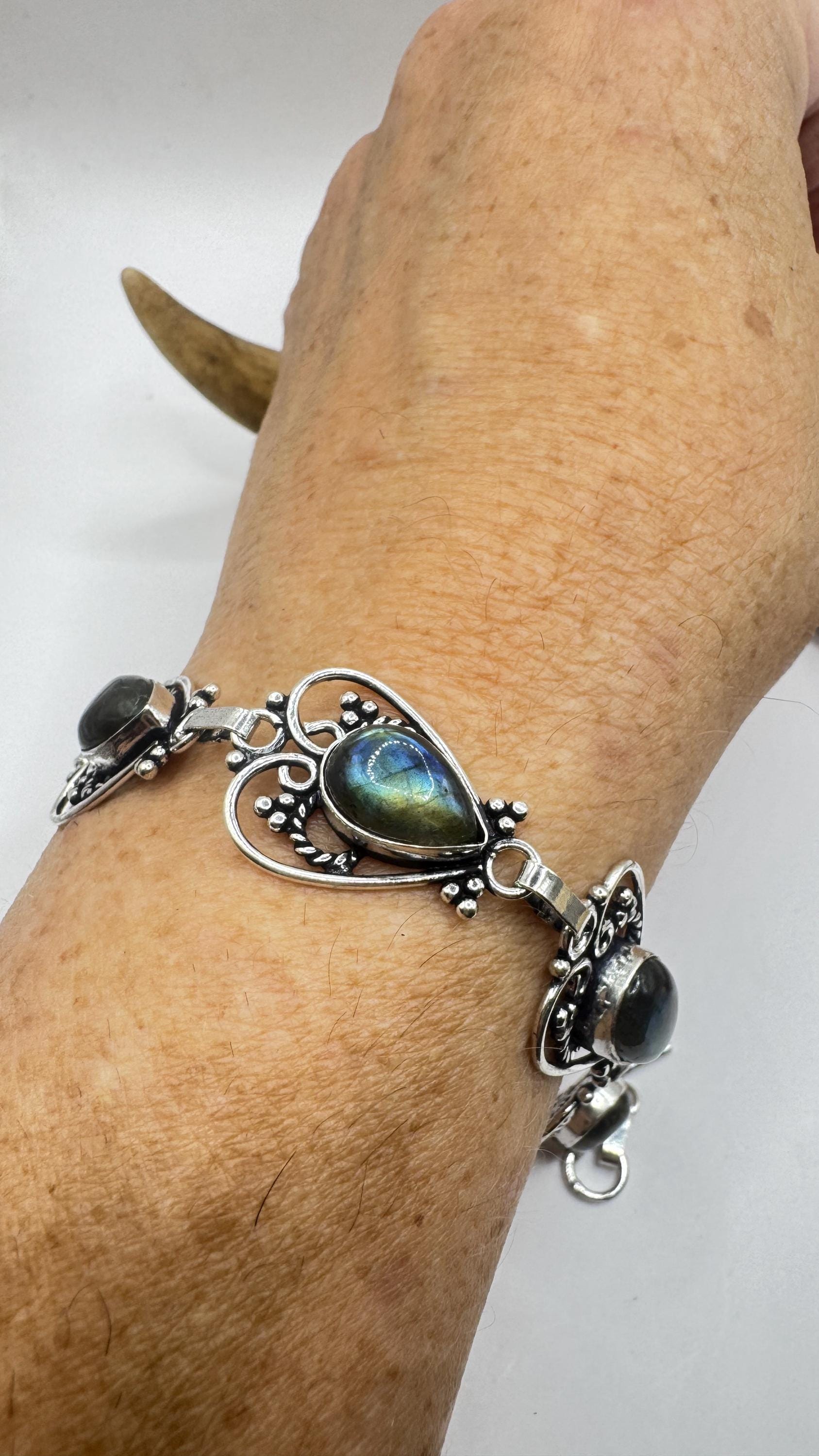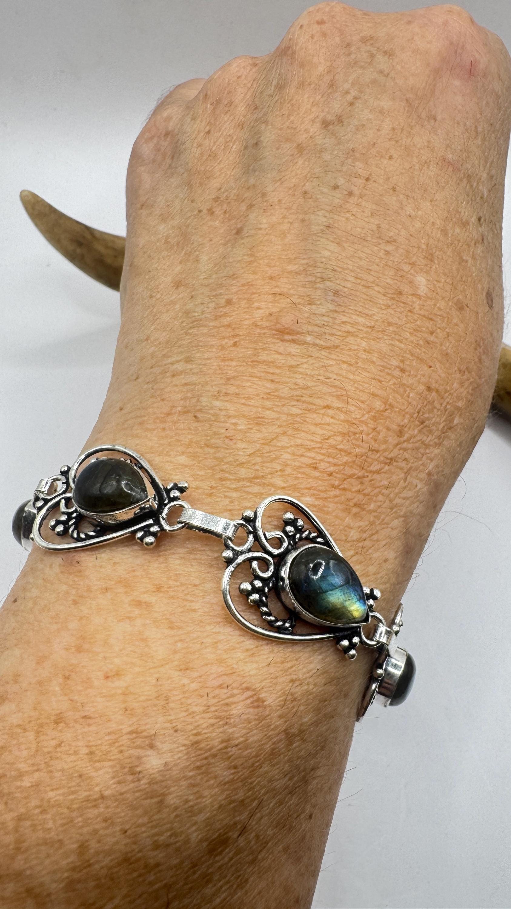Vintage Rainbow Green Labradorite Silver Bracelet Silver Bronze