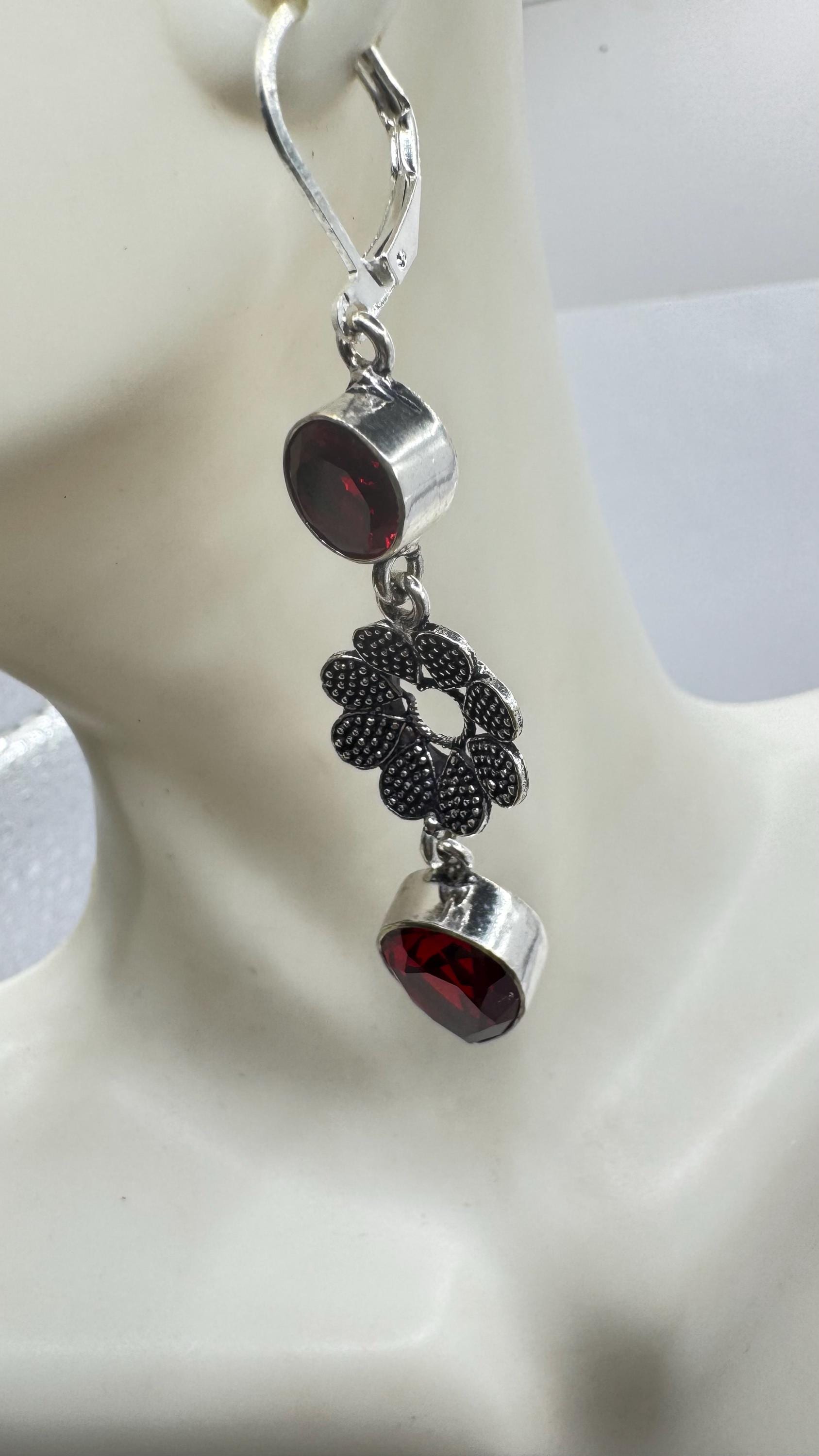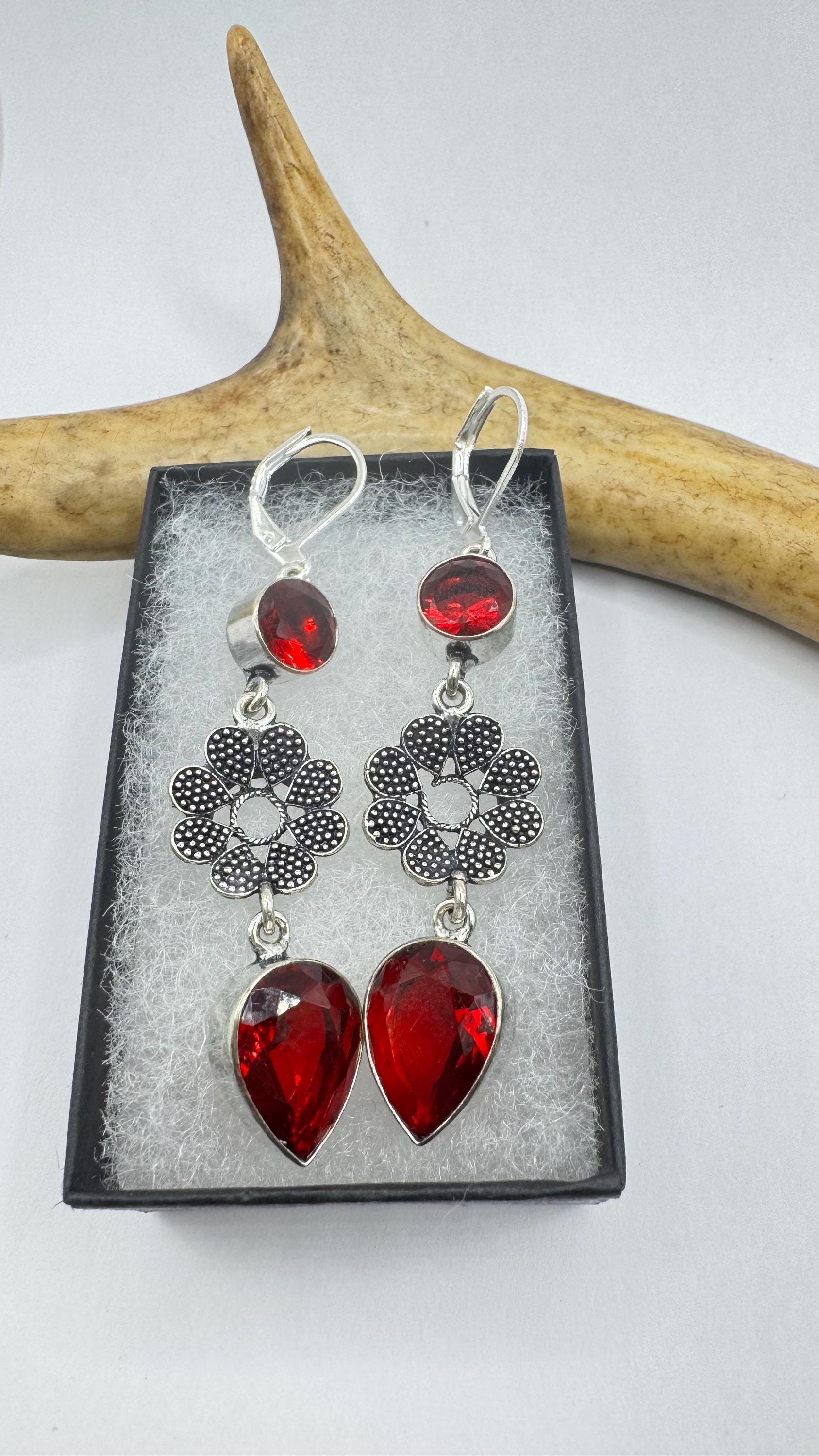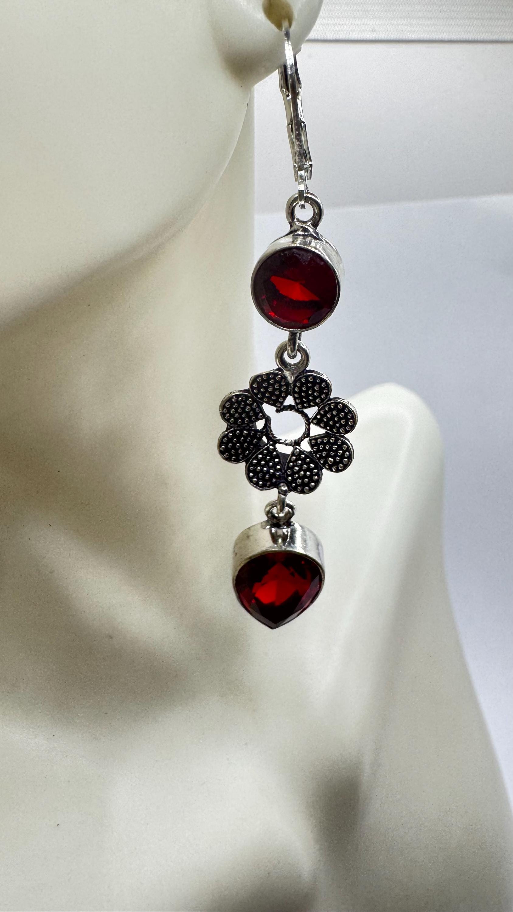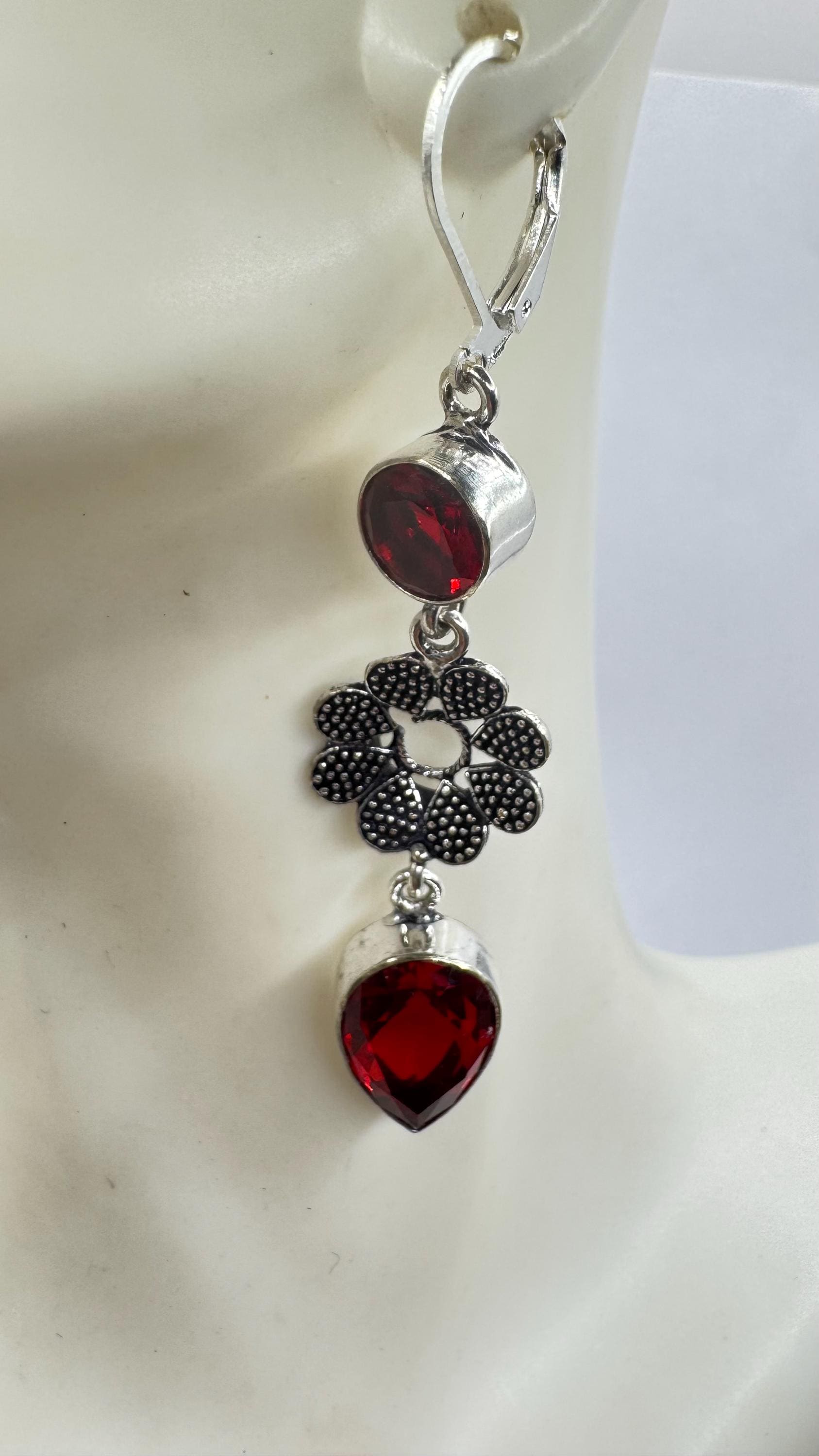 Vintage Red Ruby Glass Dangle Earrings Sterling Silver Design Statement Leverbacks