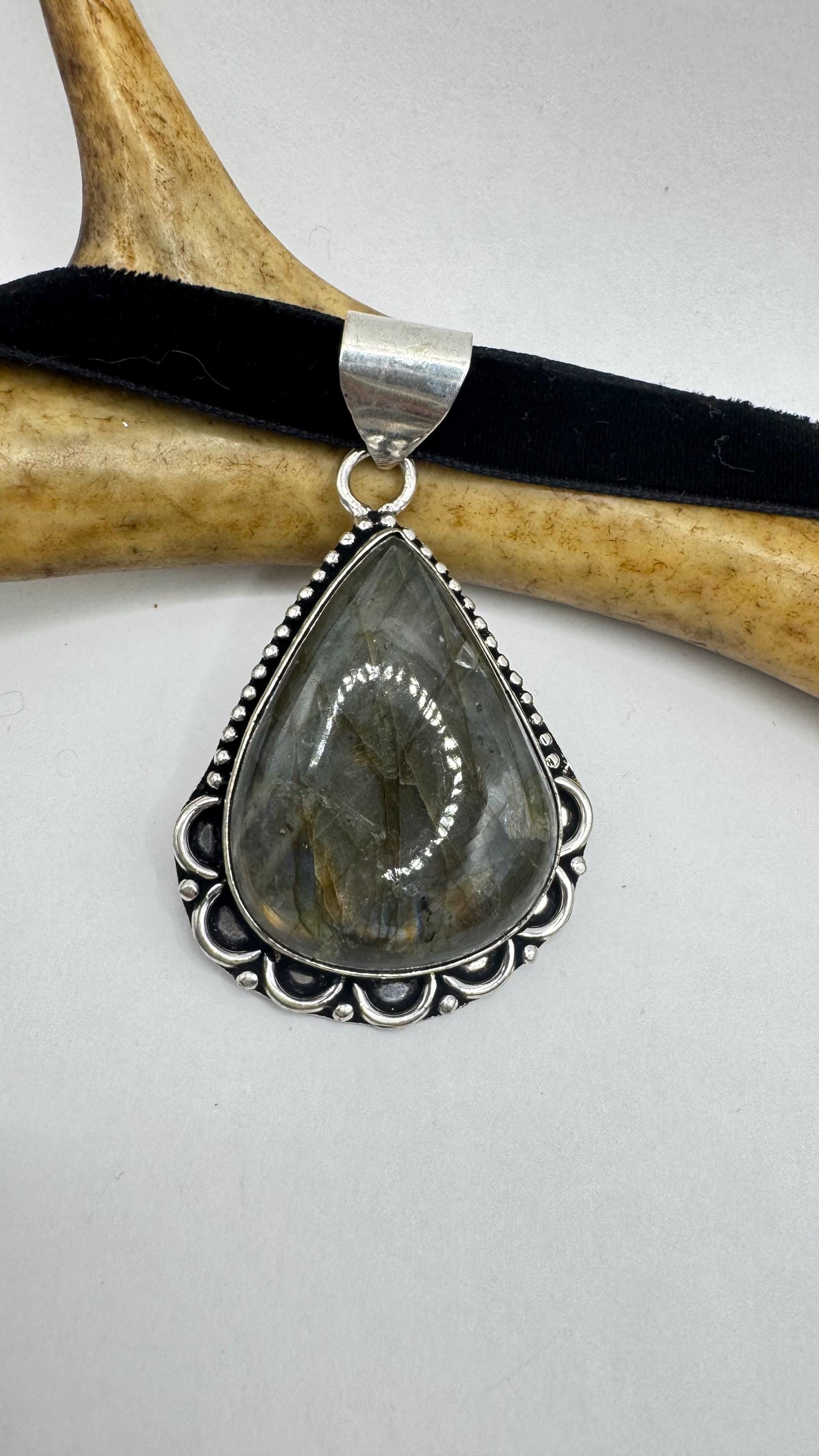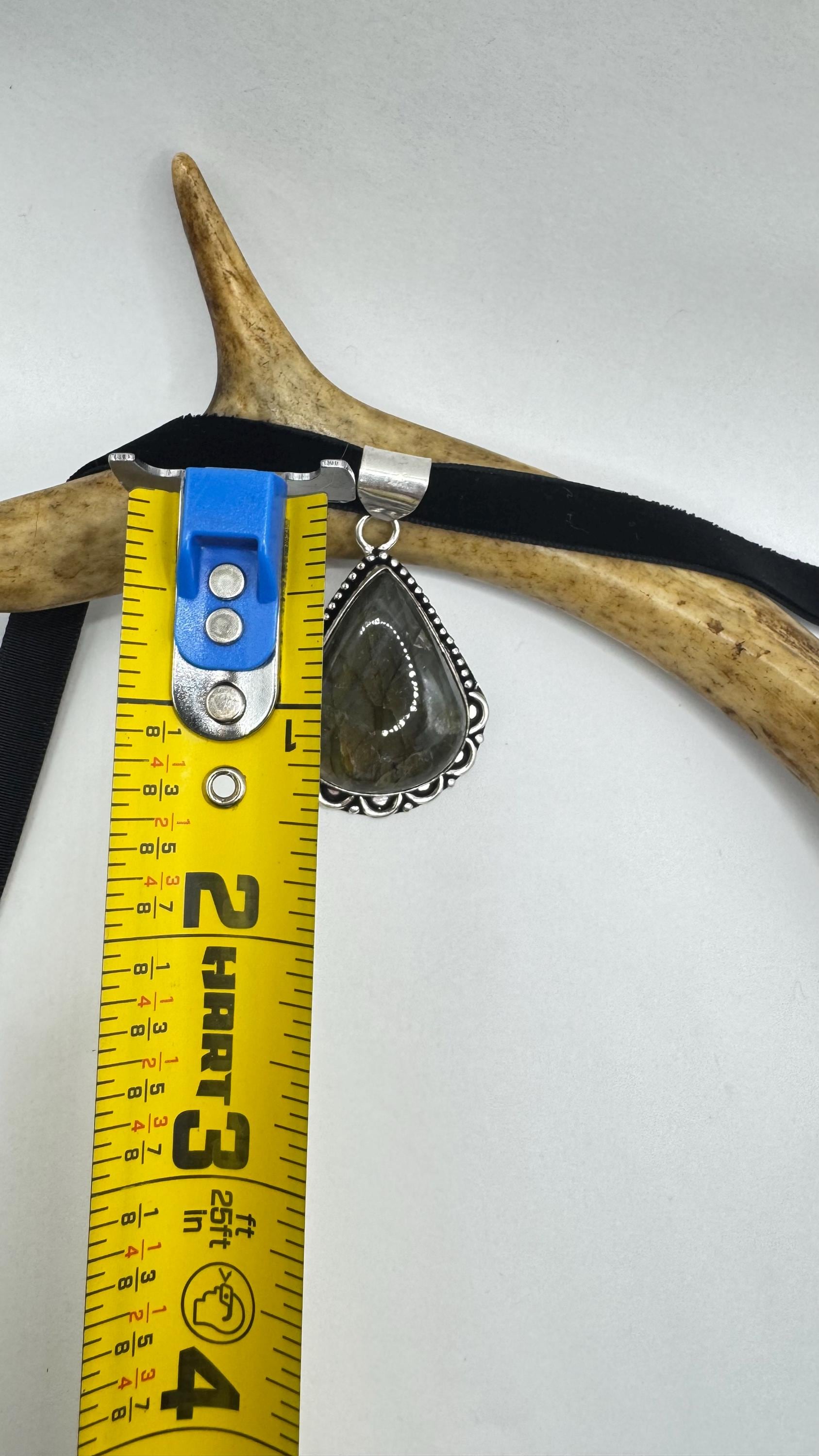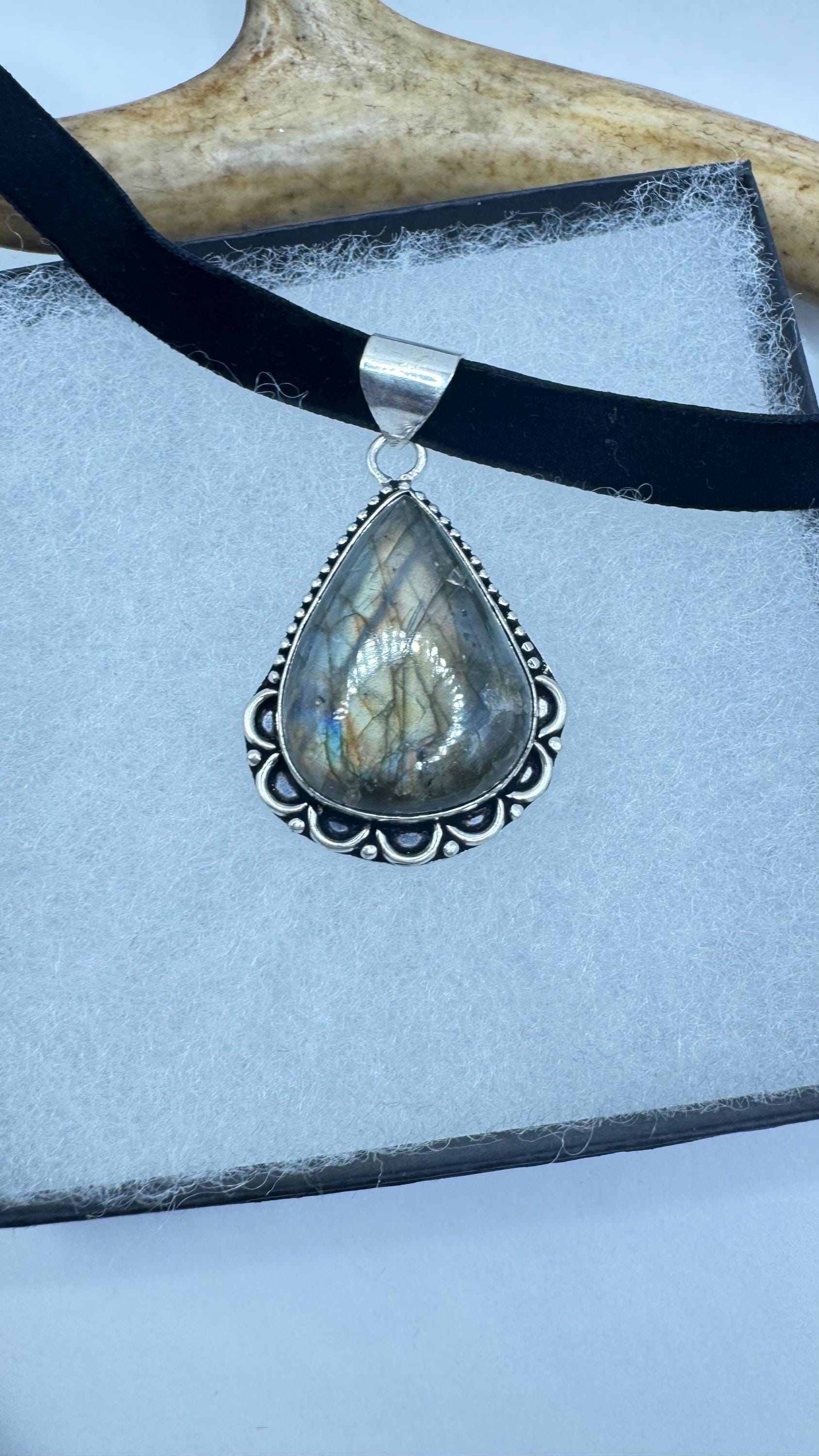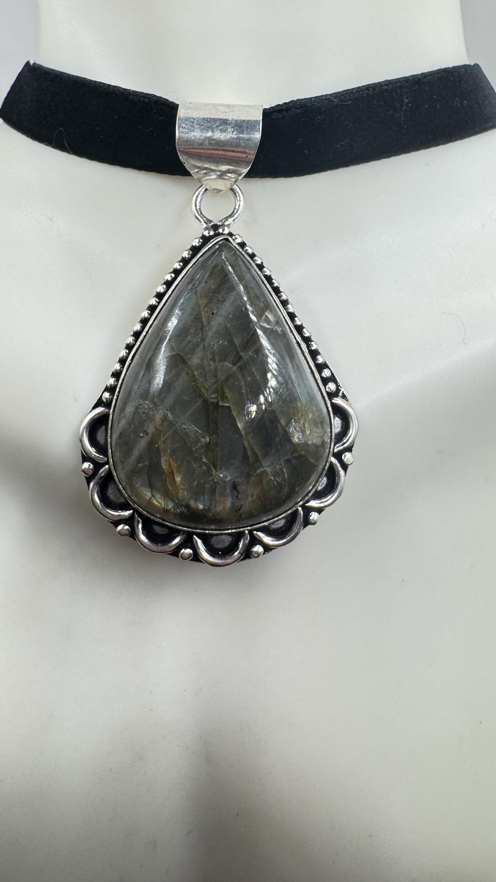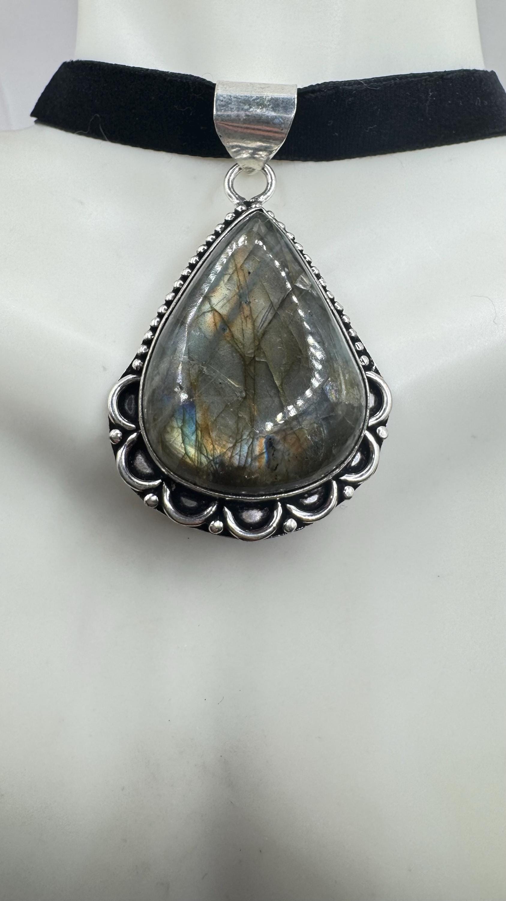 Vintage Silver Bronze Rainbow Labradorite Black Velvet Choker Pendant Necklace